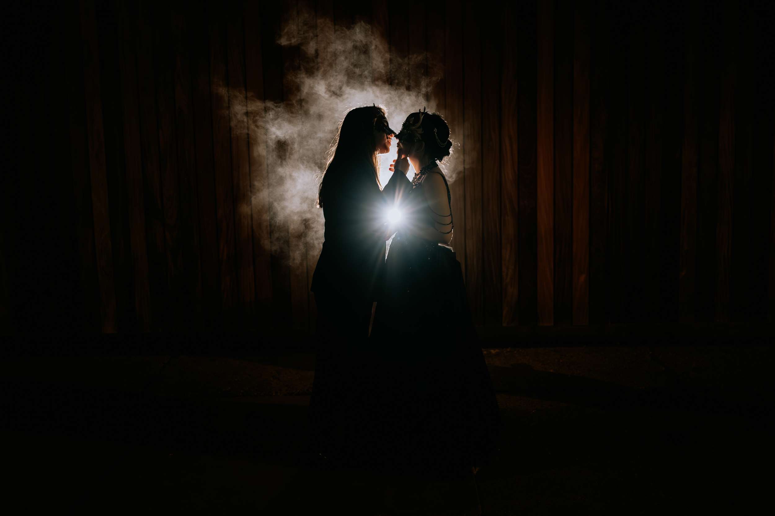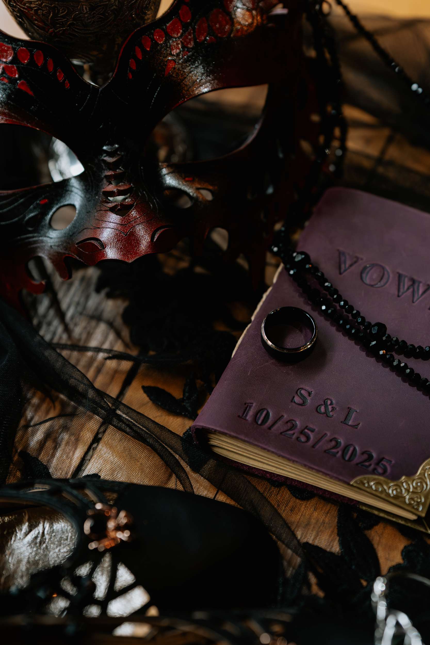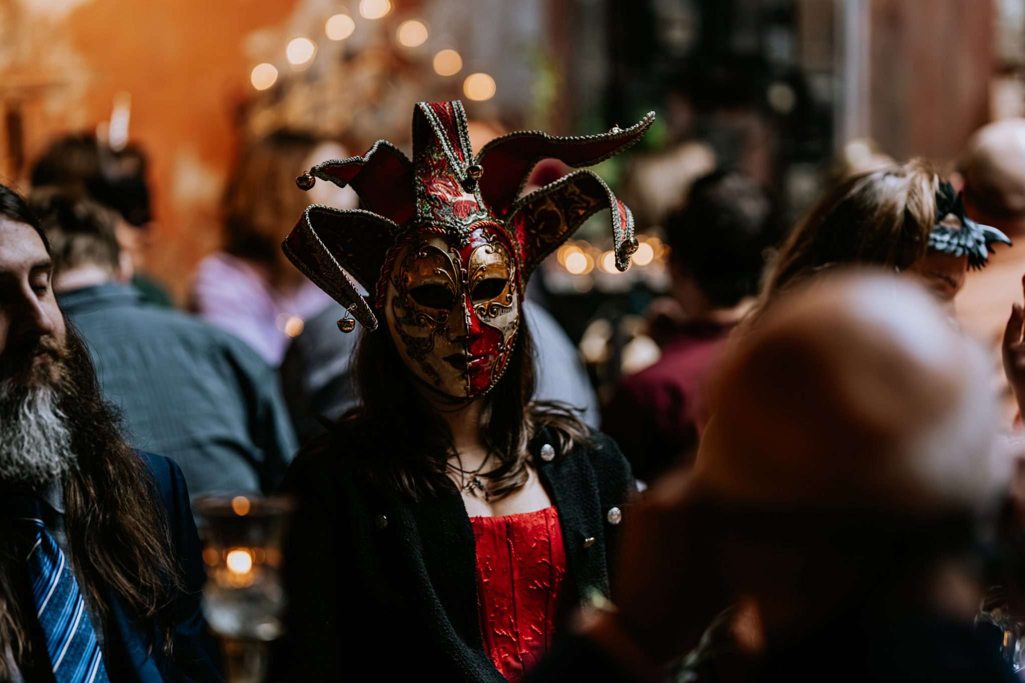 Masquerade masks were worn throughout the evening, with guests fully committing to the idea. There was an expectation that the masks might be a short-lived novelty, but people love them! Some guests even brought their own when they’d heard about the theme. The only DIY element was the easel and framed display for the masks the couple provided. It became a focal point without needing to be anything elaborate.