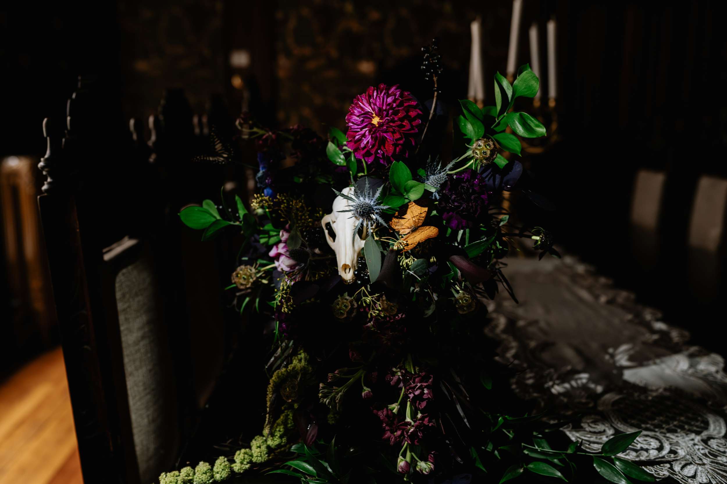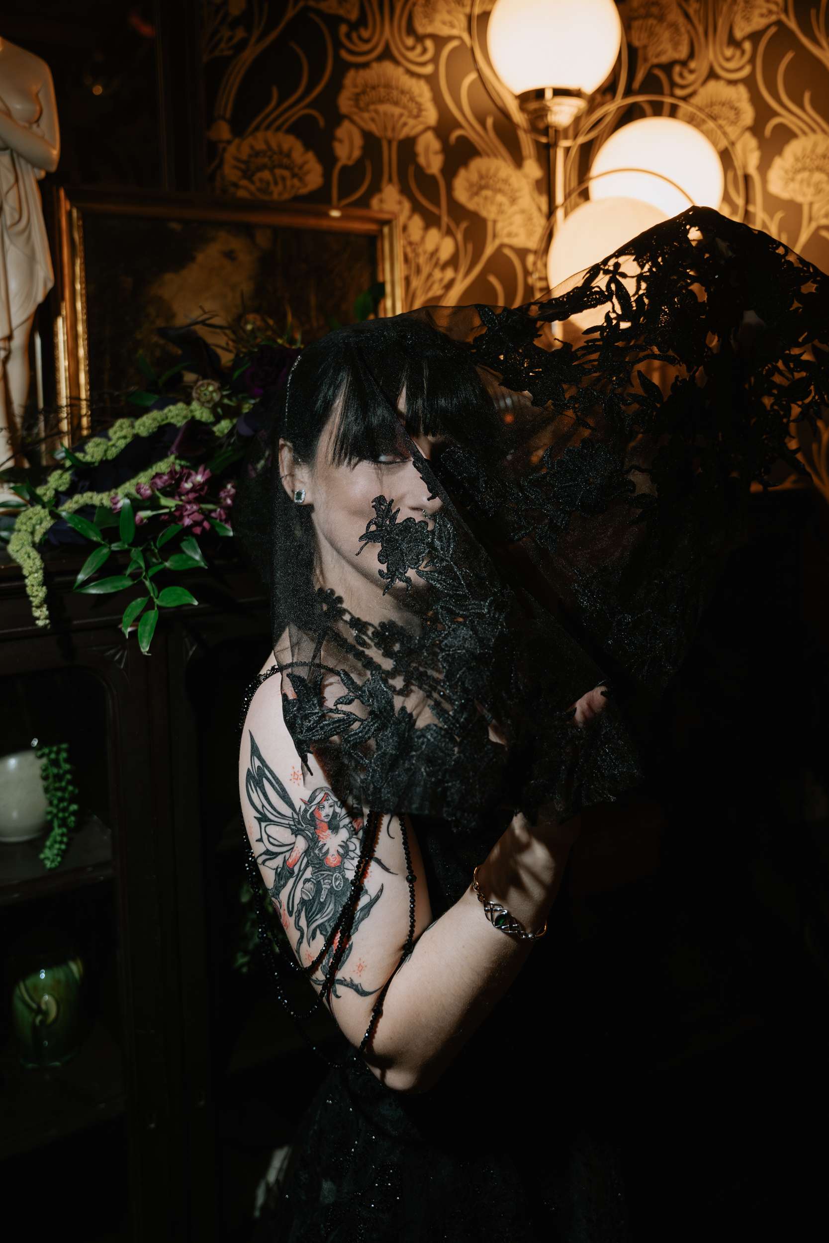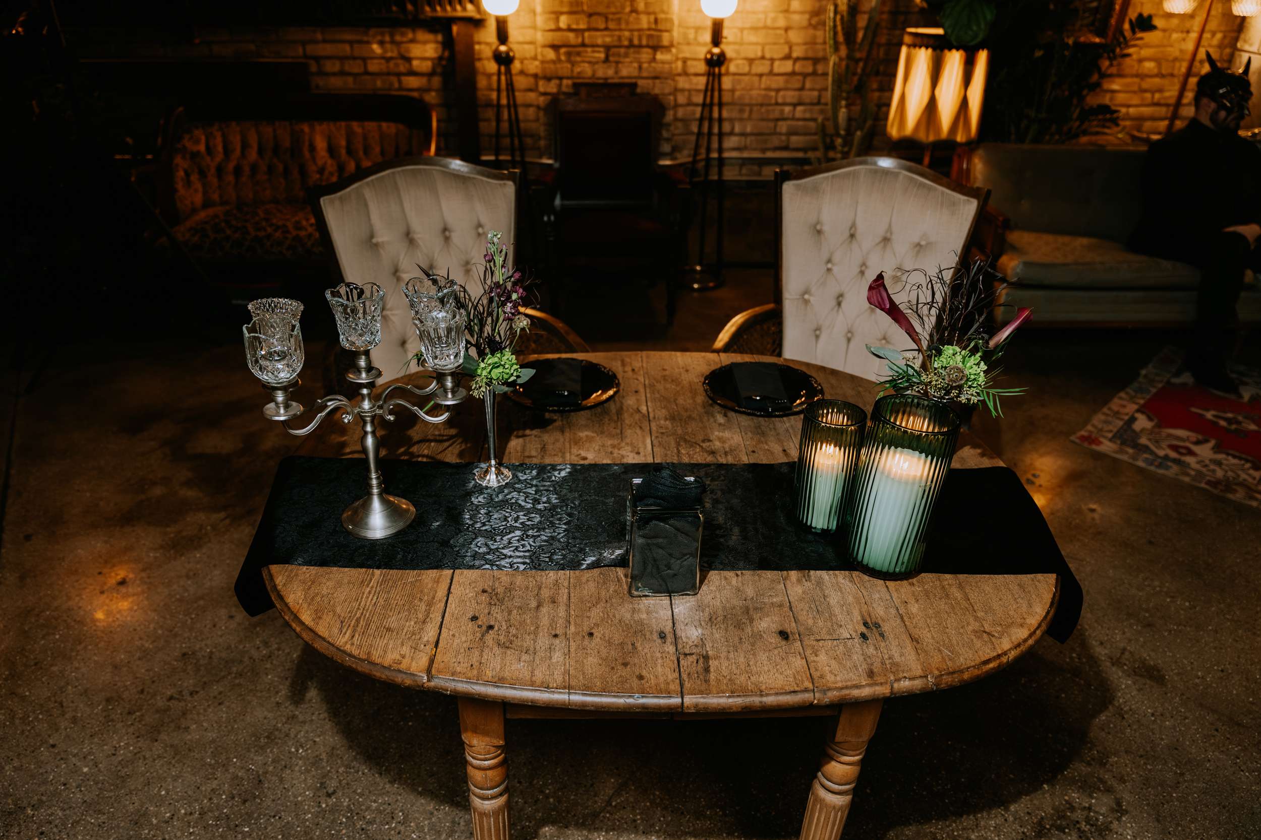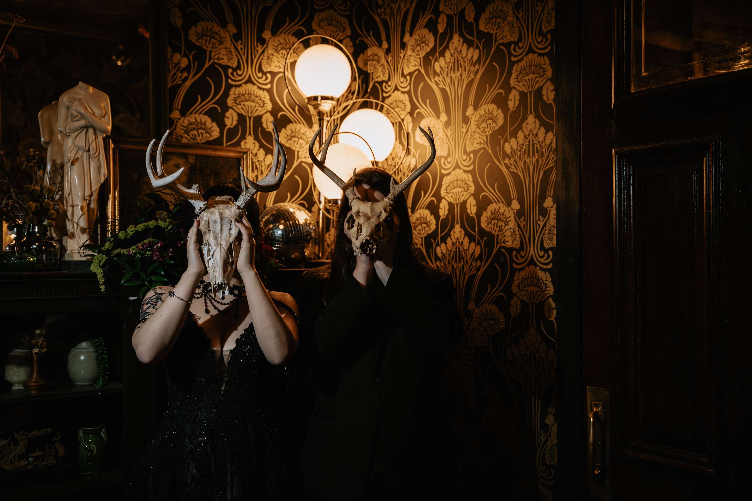 Sam had always wanted to attend a masquerade ball, so that, her a long-standing goth aesthetic and love for antiques, vintage furniture and trinkets were the main inspirations for her wedding to Liam. “It was like a moody gothic masquerade with antique eclecticism”, she said.