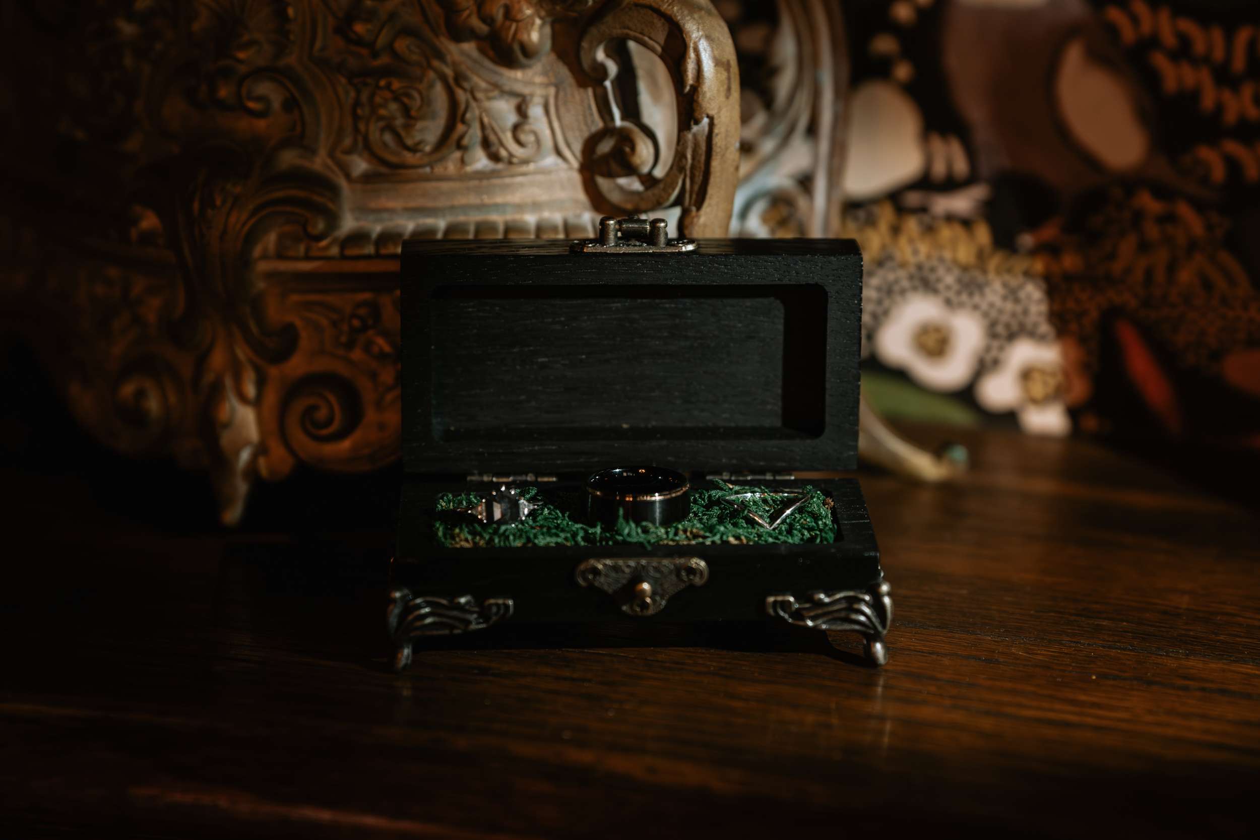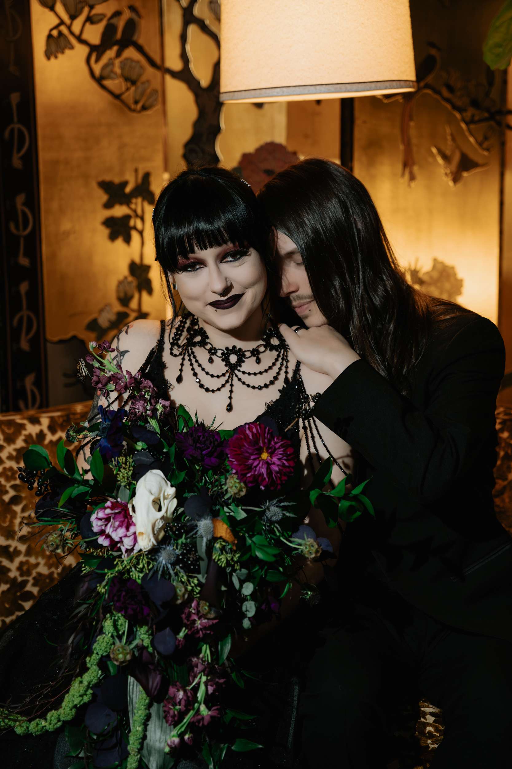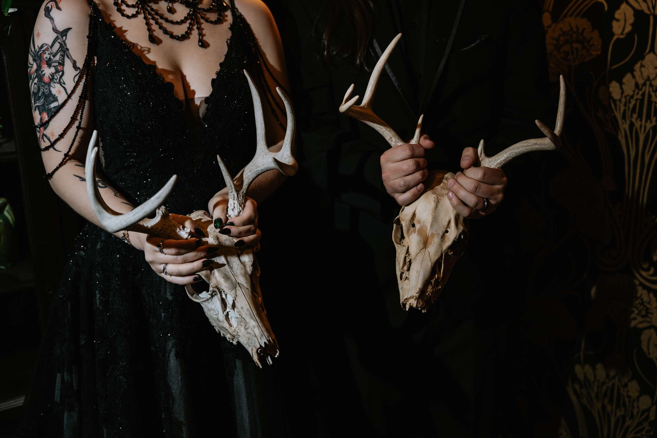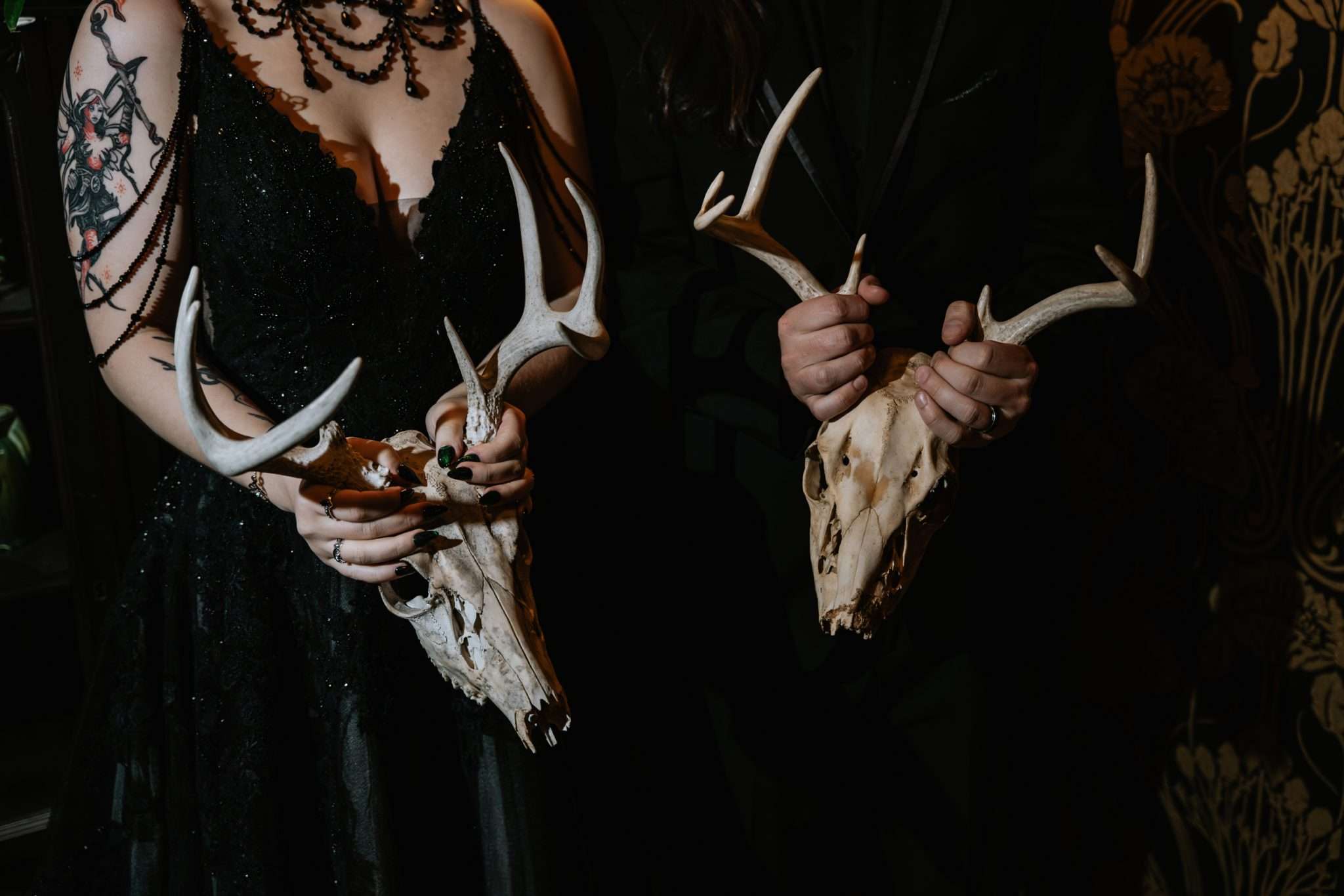 Sam had always wanted to attend a masquerade ball, so that, her a long-standing goth aesthetic and love for antiques, vintage furniture and trinkets were the main inspirations for her wedding to Liam. “It was like a moody gothic masquerade with antique eclecticism”, she said.