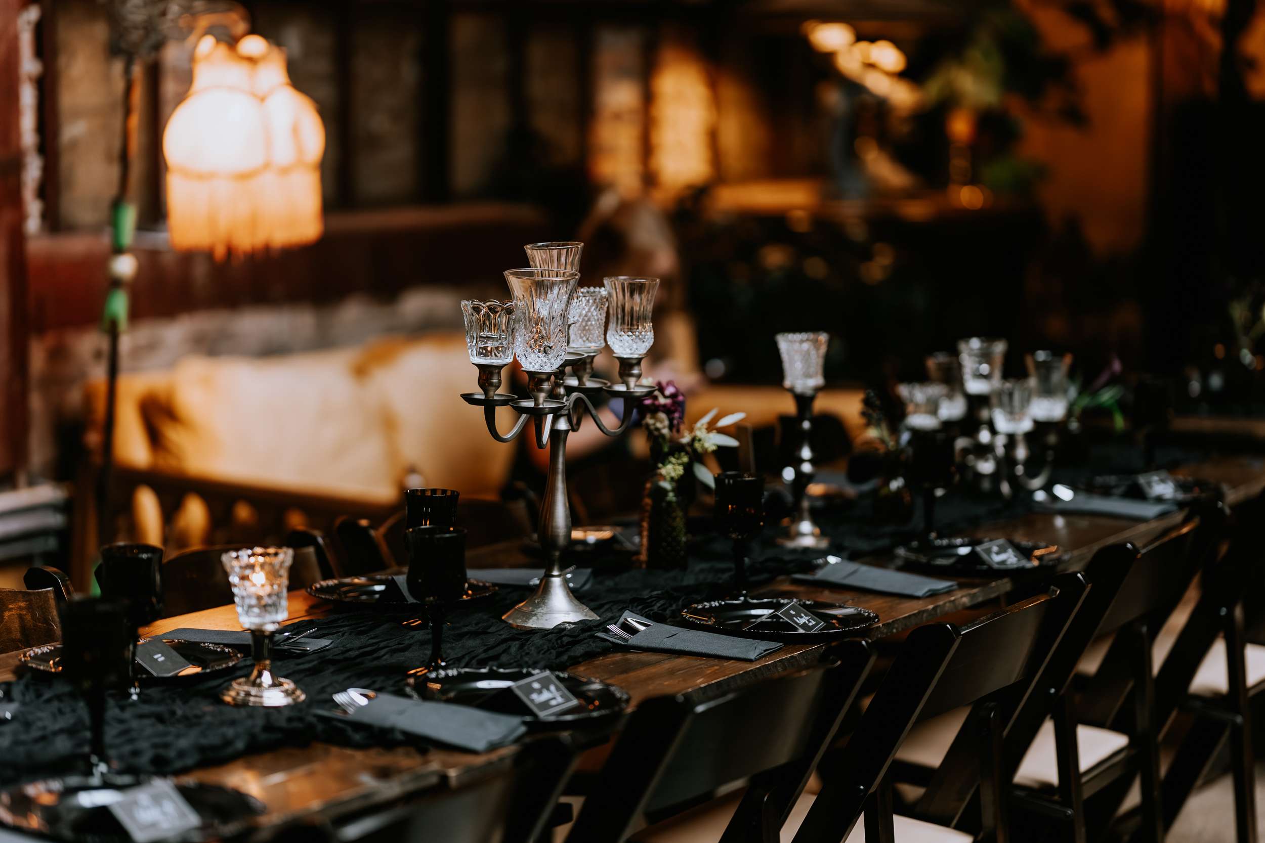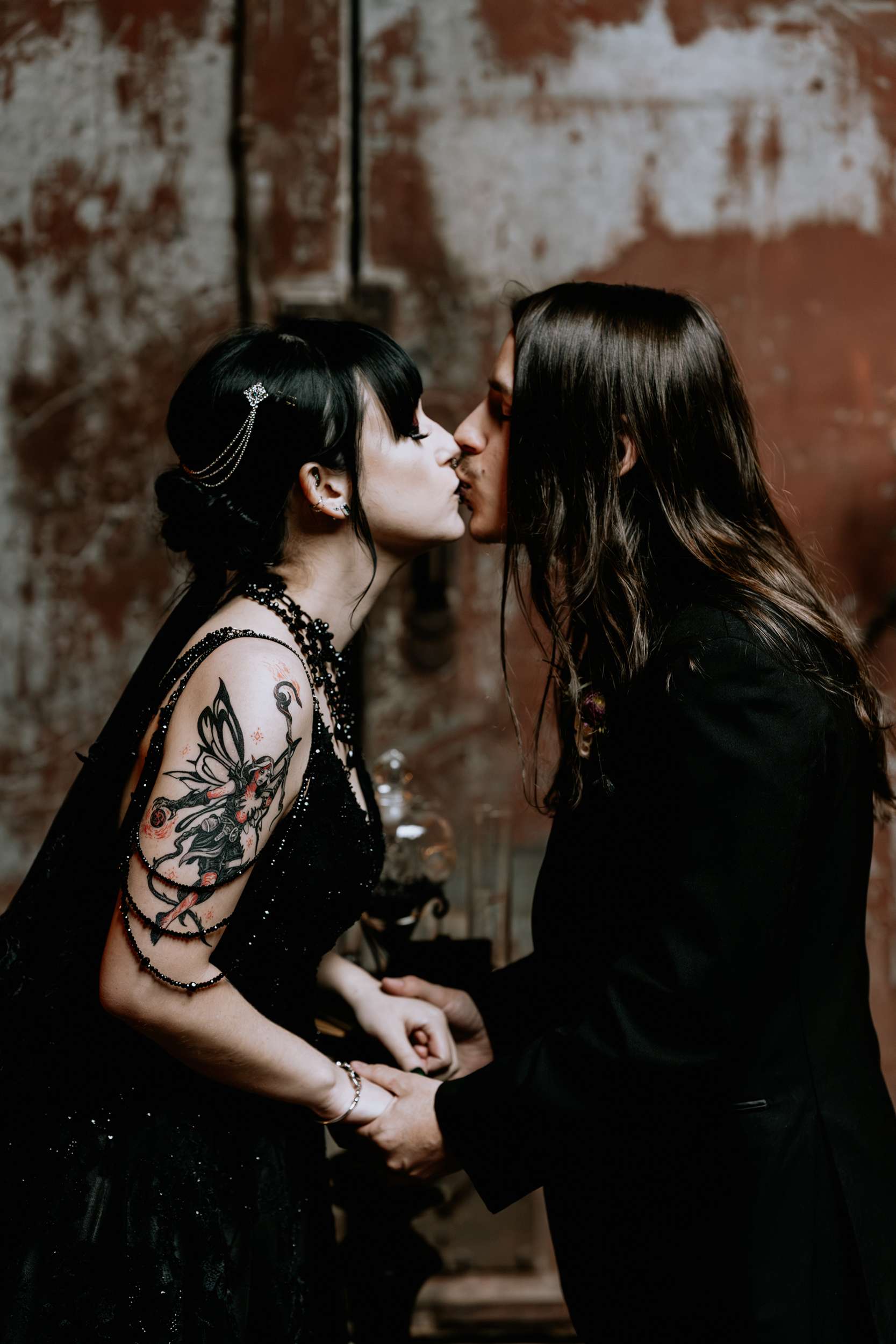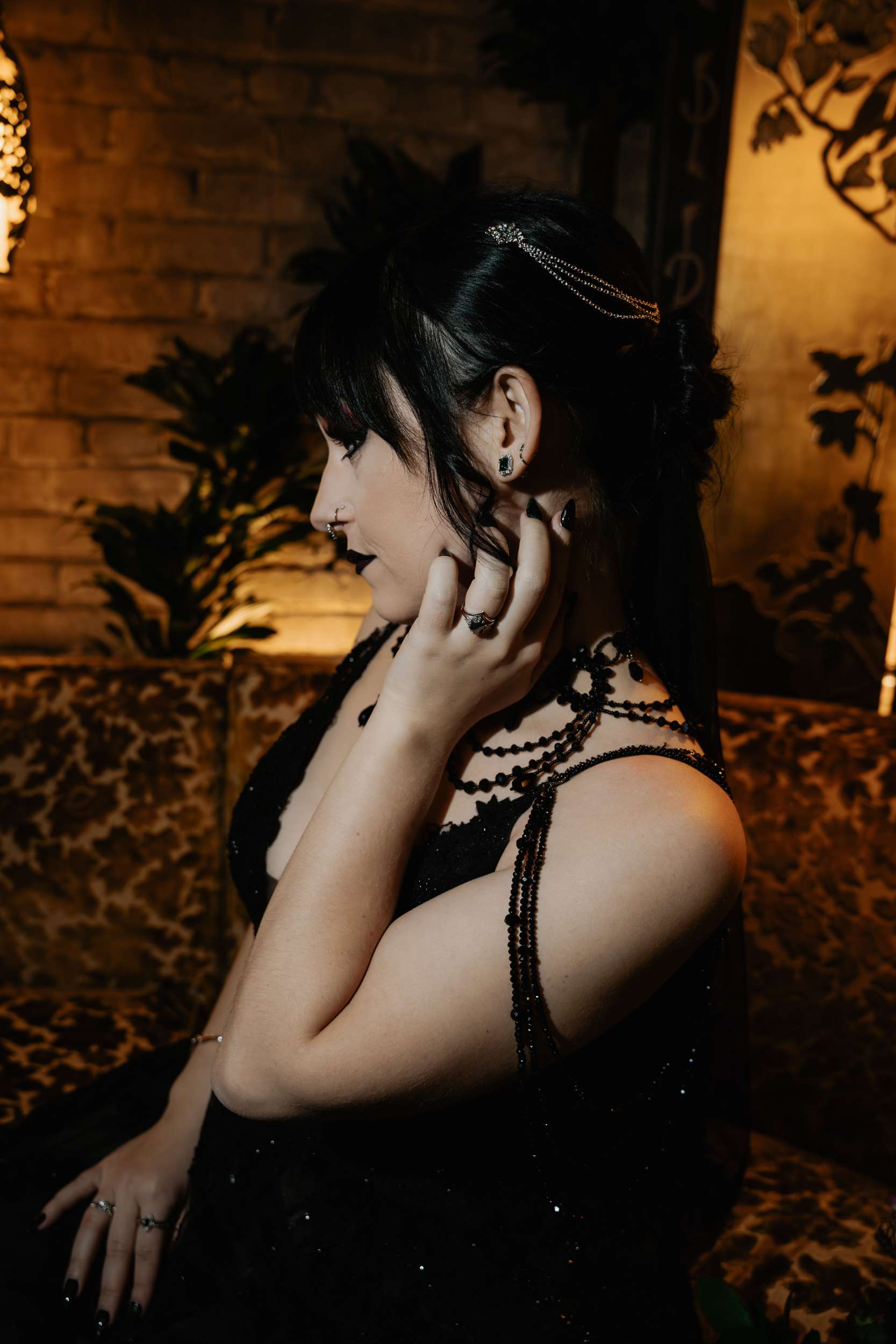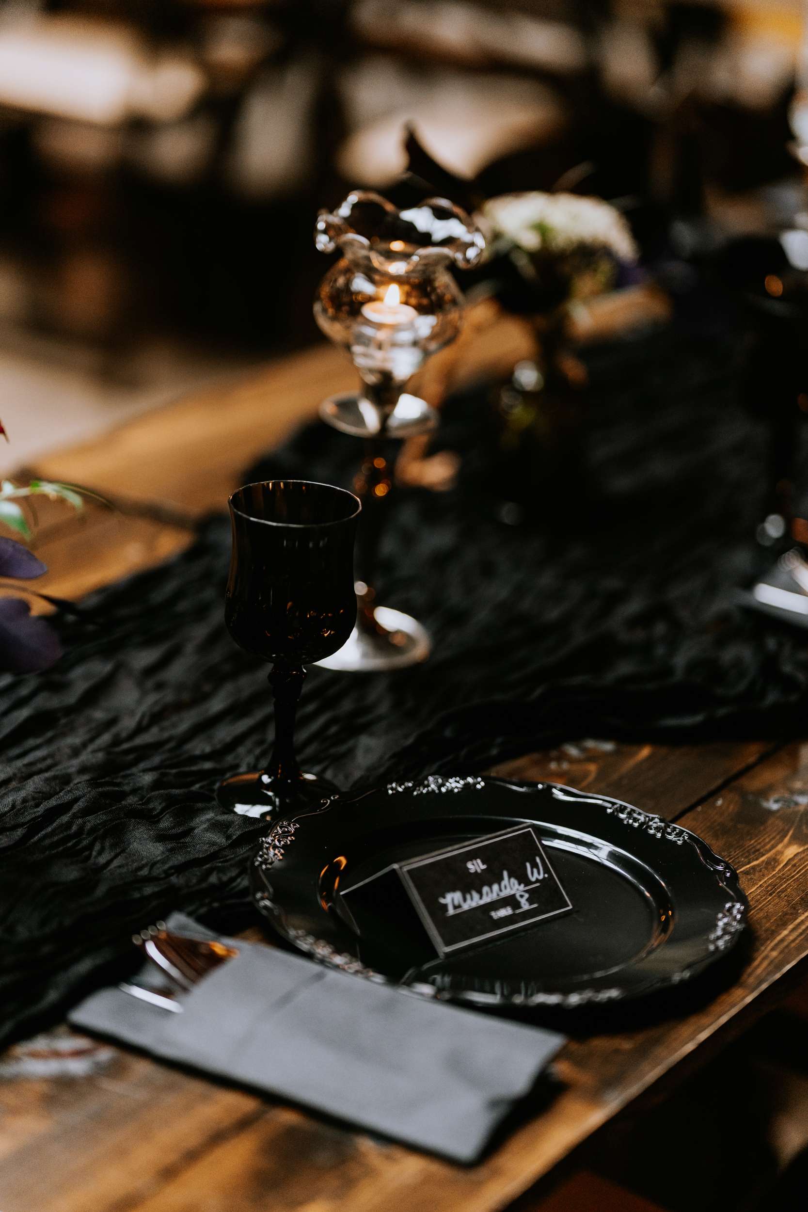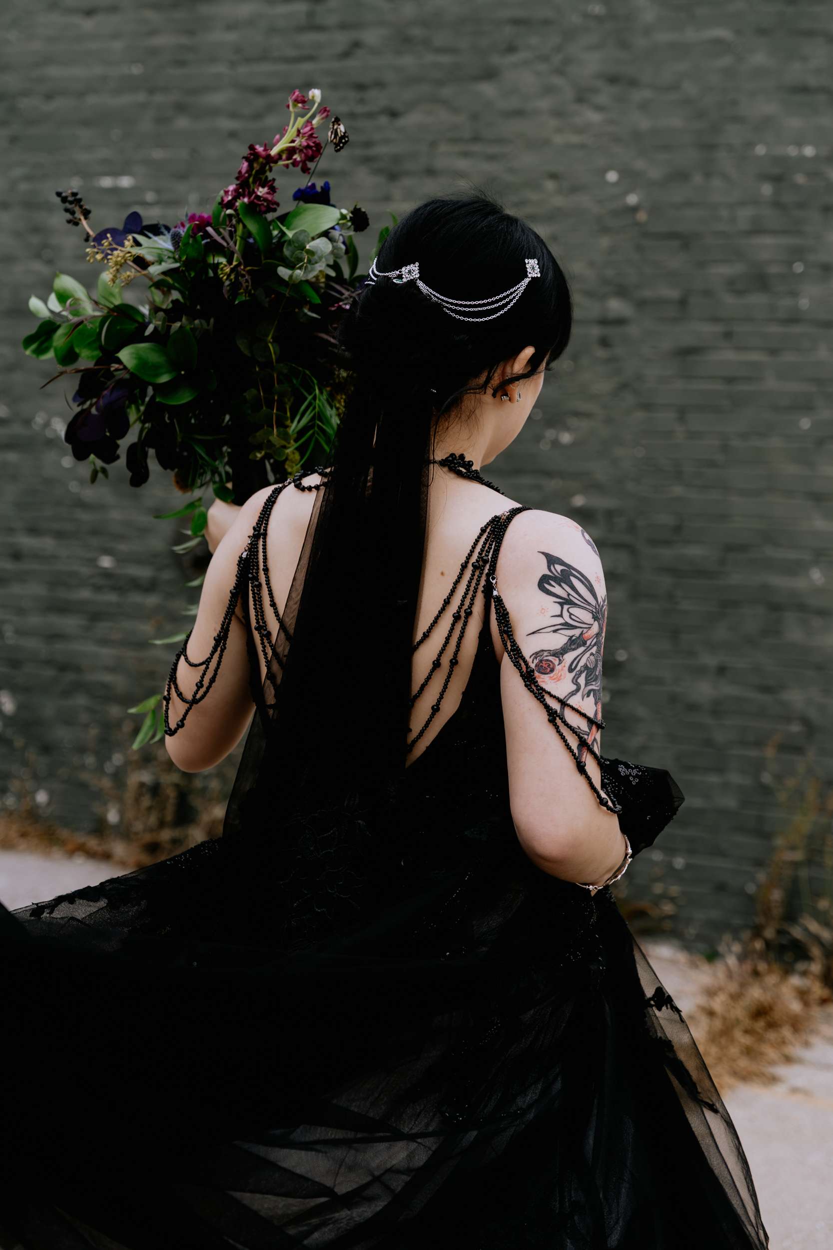 Sam had always wanted to attend a masquerade ball, so that, her a long-standing goth aesthetic and love for antiques, vintage furniture and trinkets were the main inspirations for her wedding to Liam. “It was like a moody gothic masquerade with antique eclecticism”, she said.
