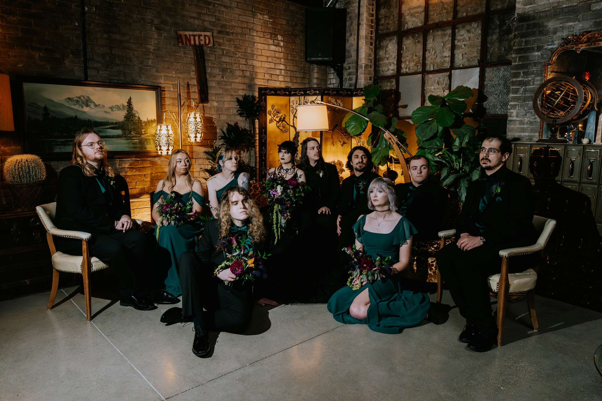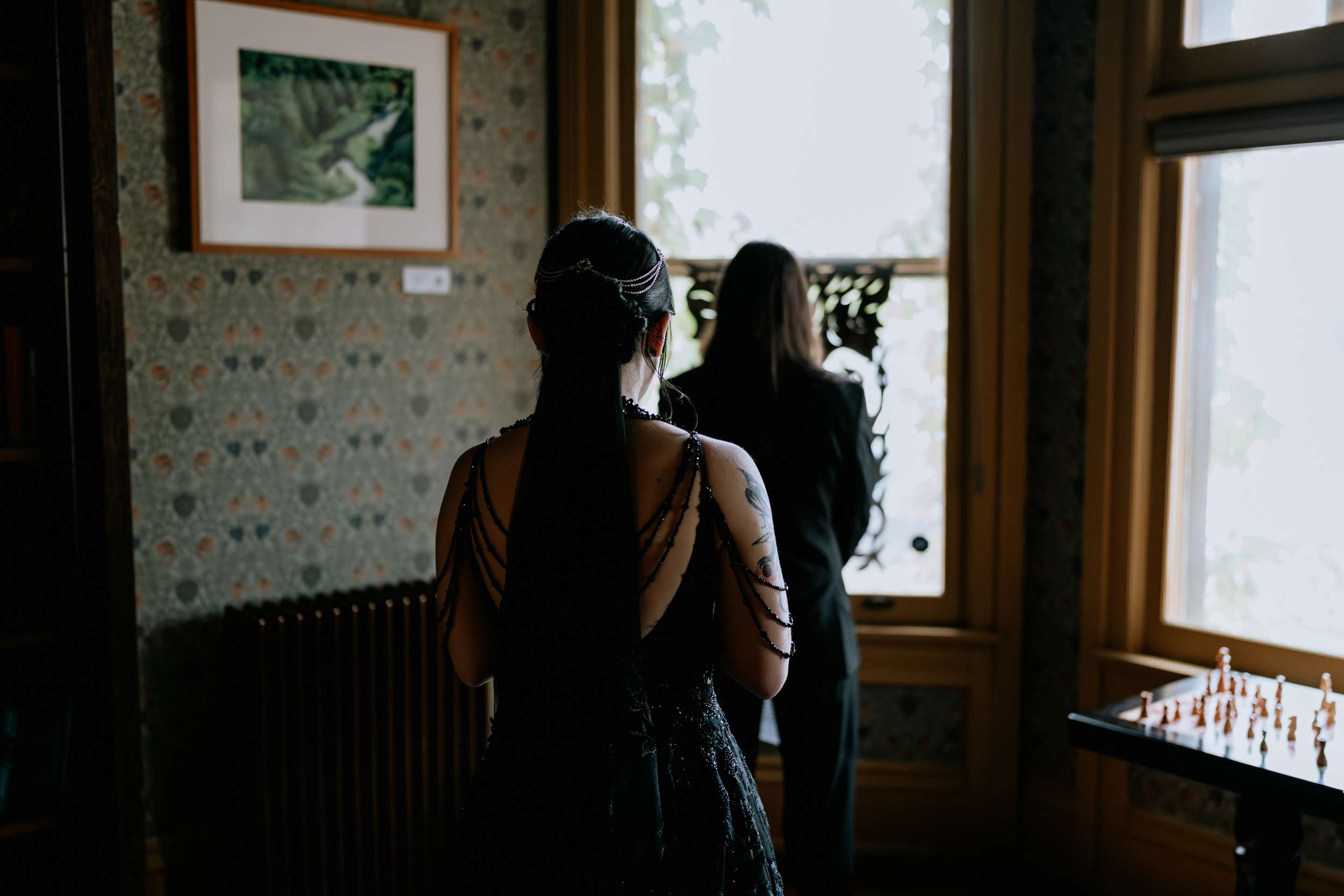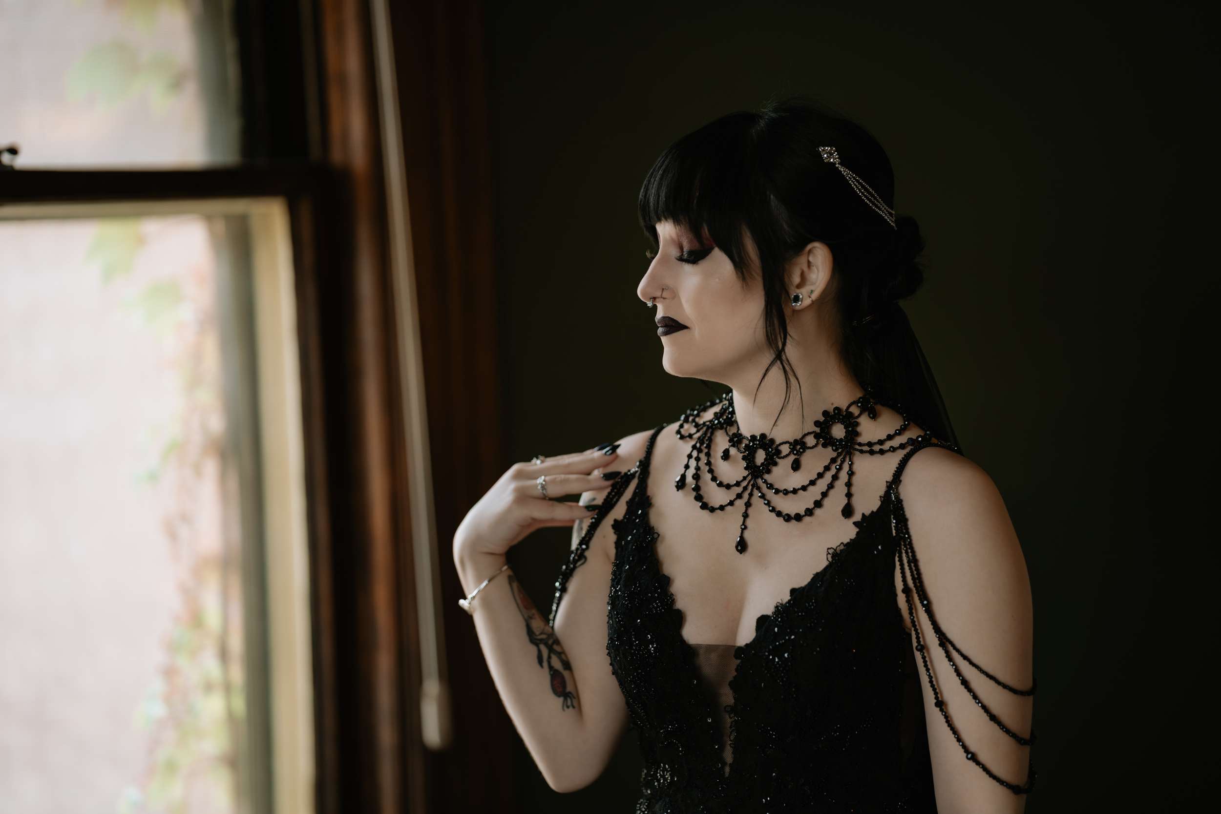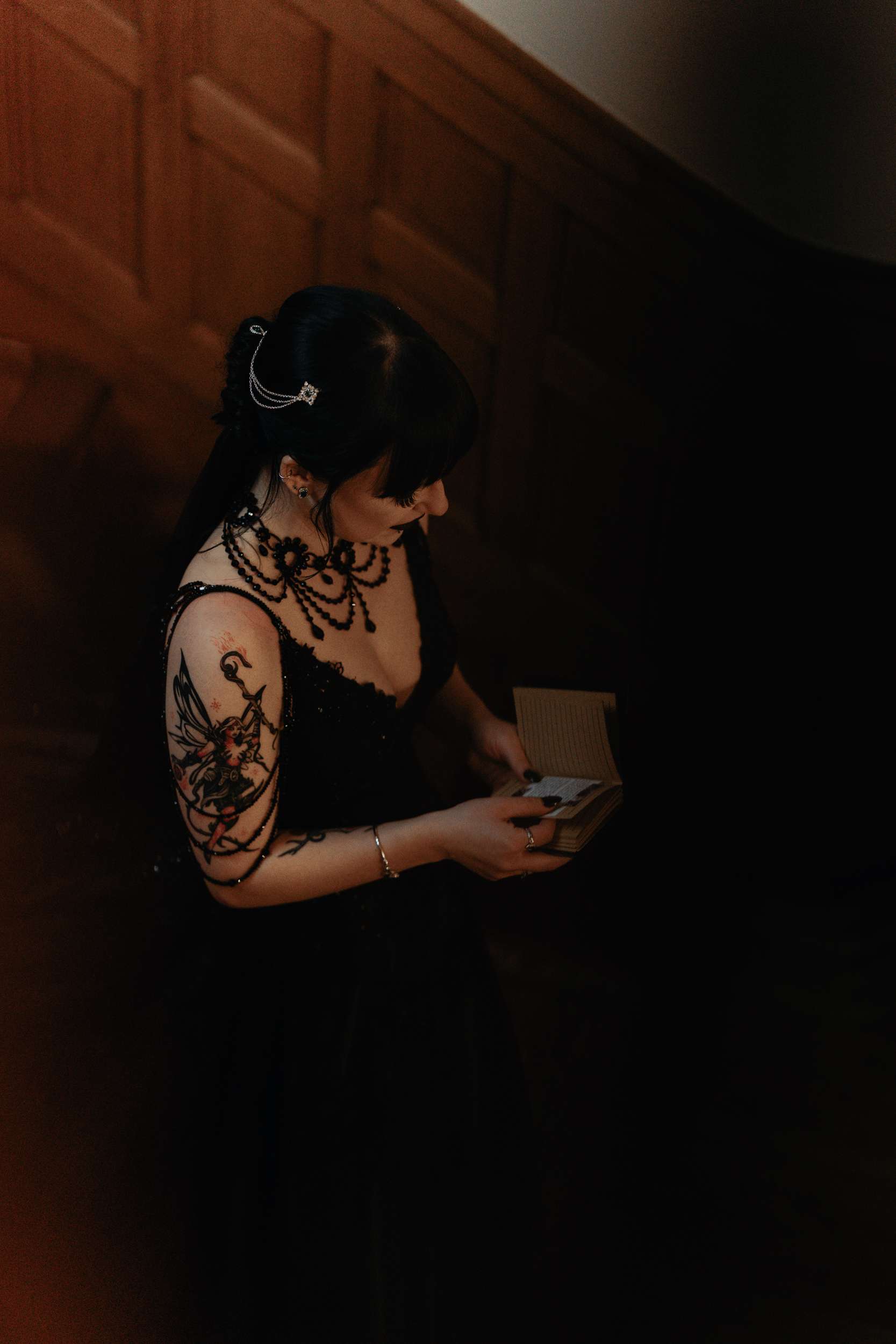 Sam had always wanted to attend a masquerade ball, so that, her a long-standing goth aesthetic and love for antiques, vintage furniture and trinkets were the main inspirations for her wedding to Liam. “It was like a moody gothic masquerade with antique eclecticism”, she said.
