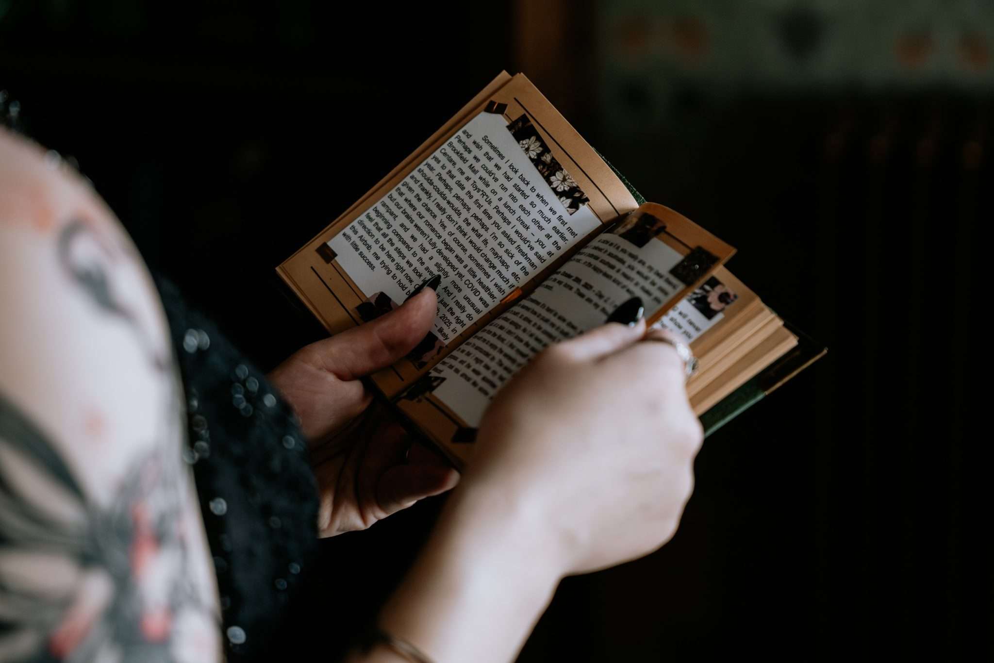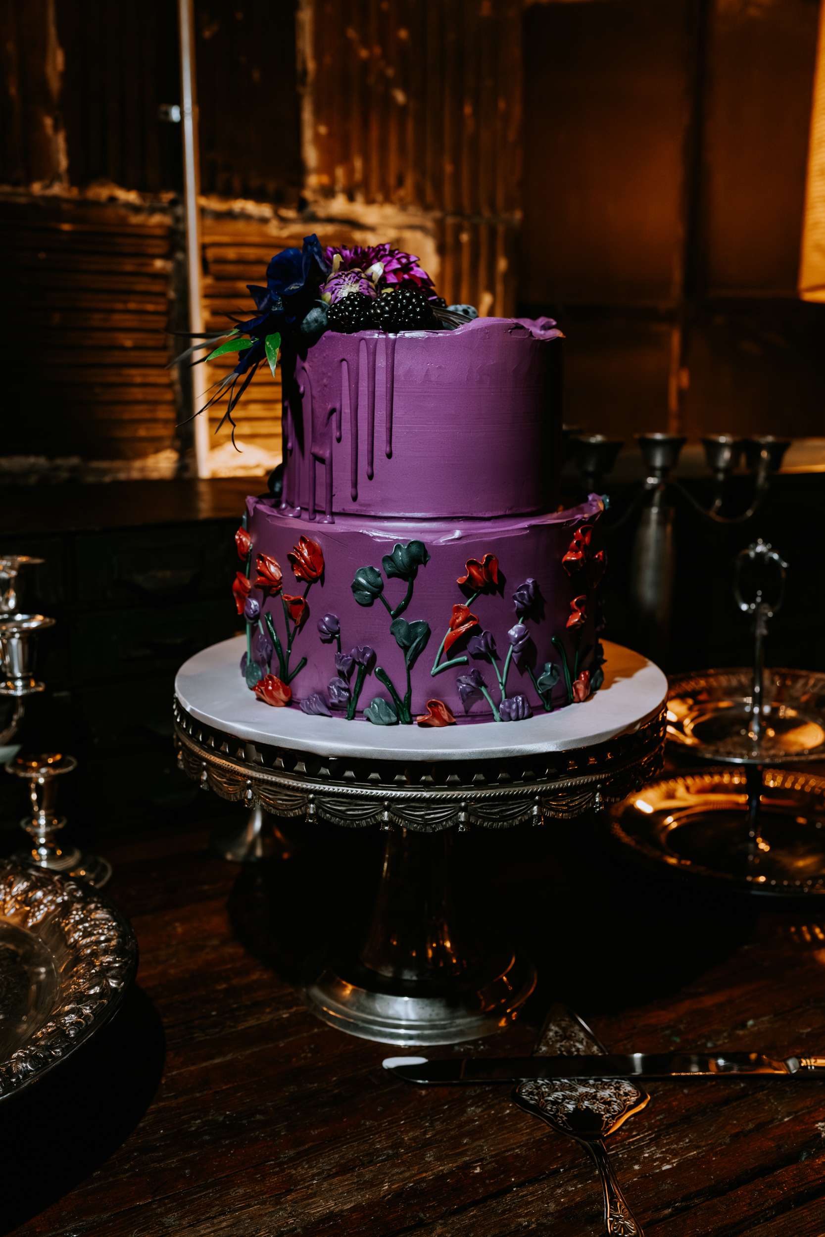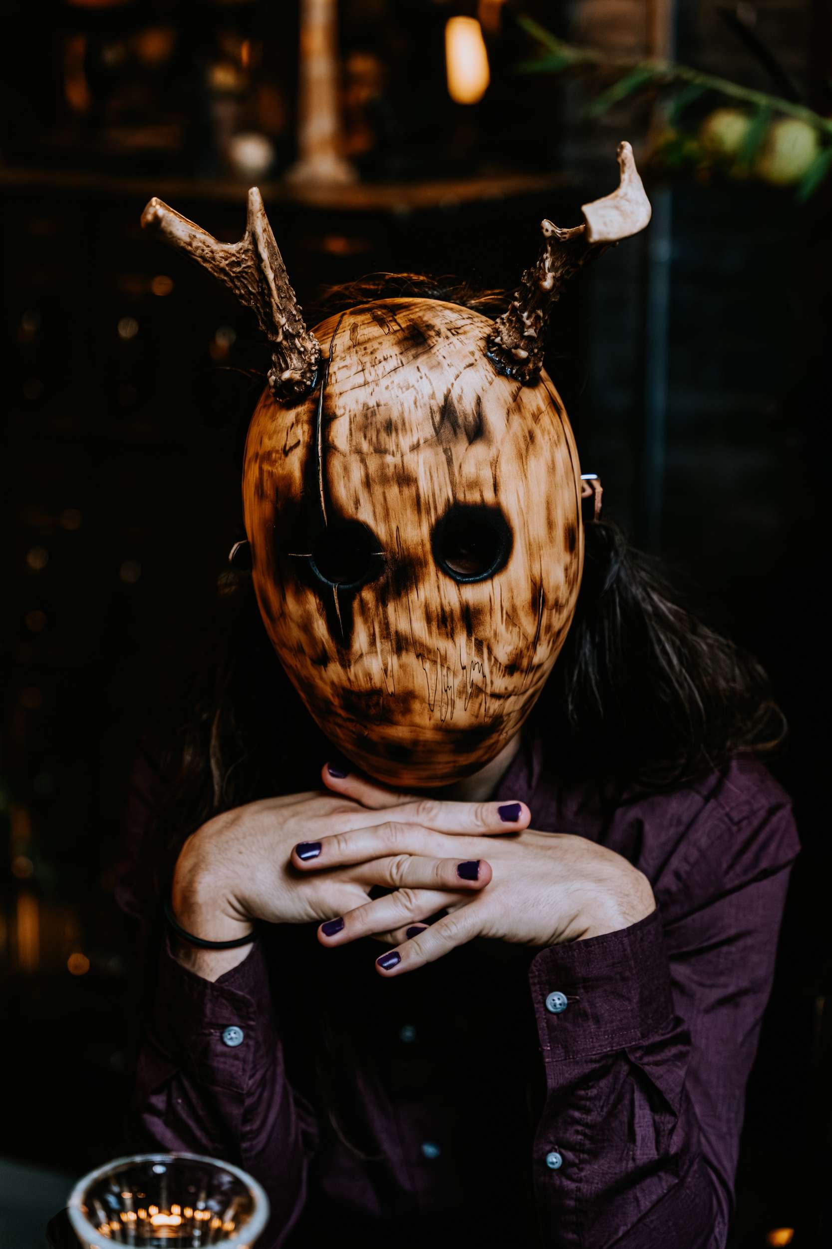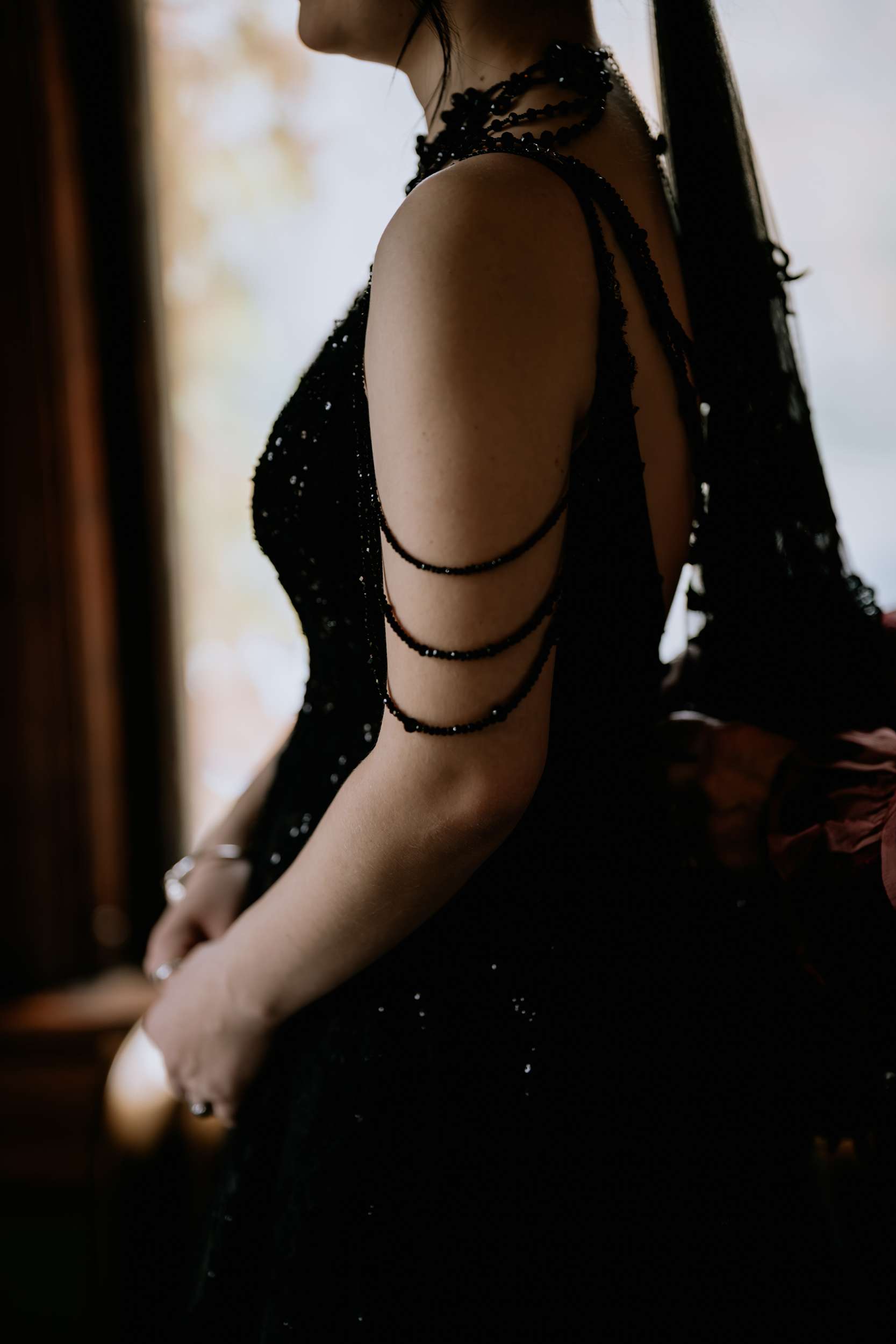 Sam had always wanted to attend a masquerade ball, so that, her a long-standing goth aesthetic and love for antiques, vintage furniture and trinkets were the main inspirations for her wedding to Liam. “It was like a moody gothic masquerade with antique eclecticism”, she said.