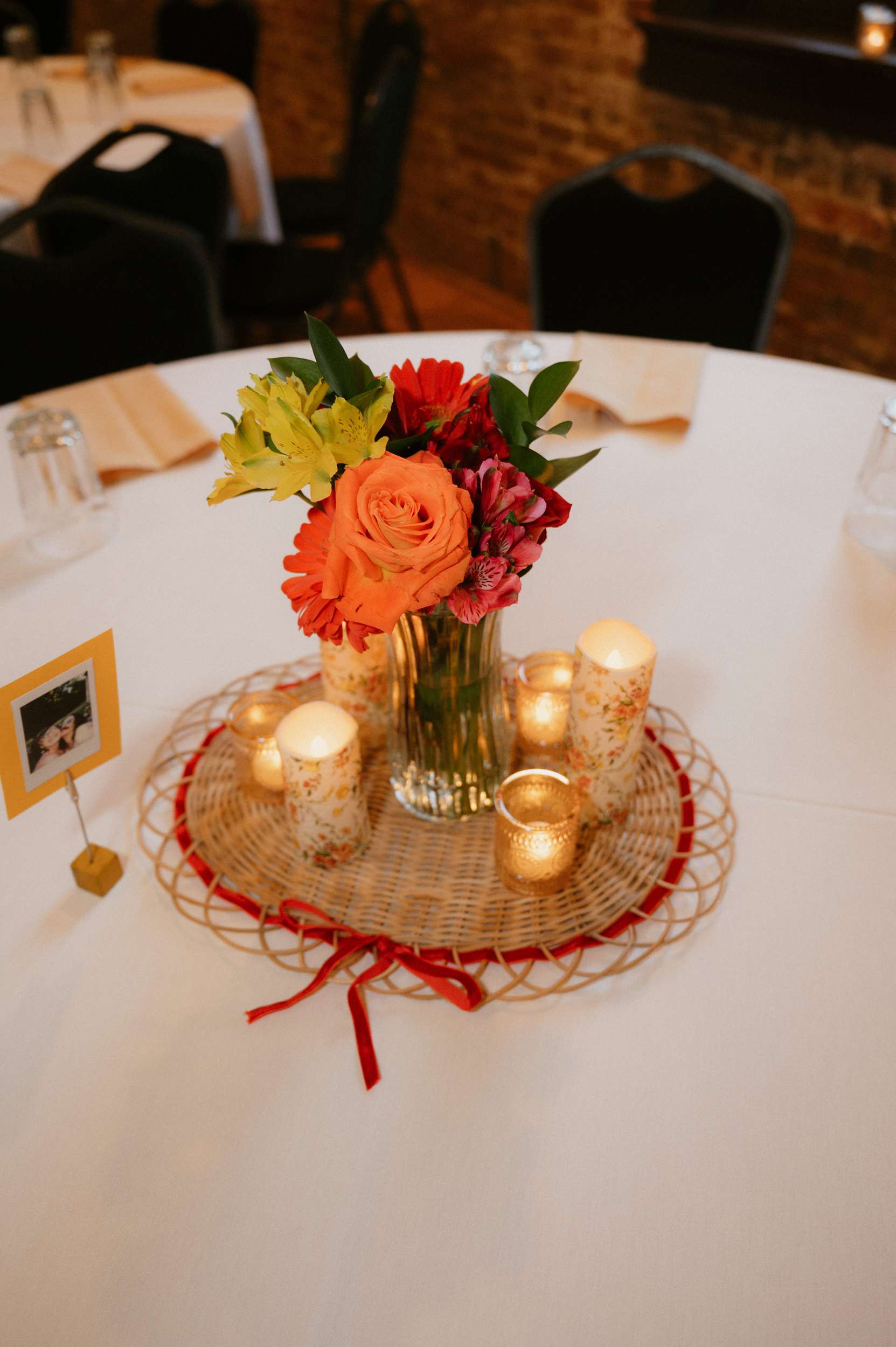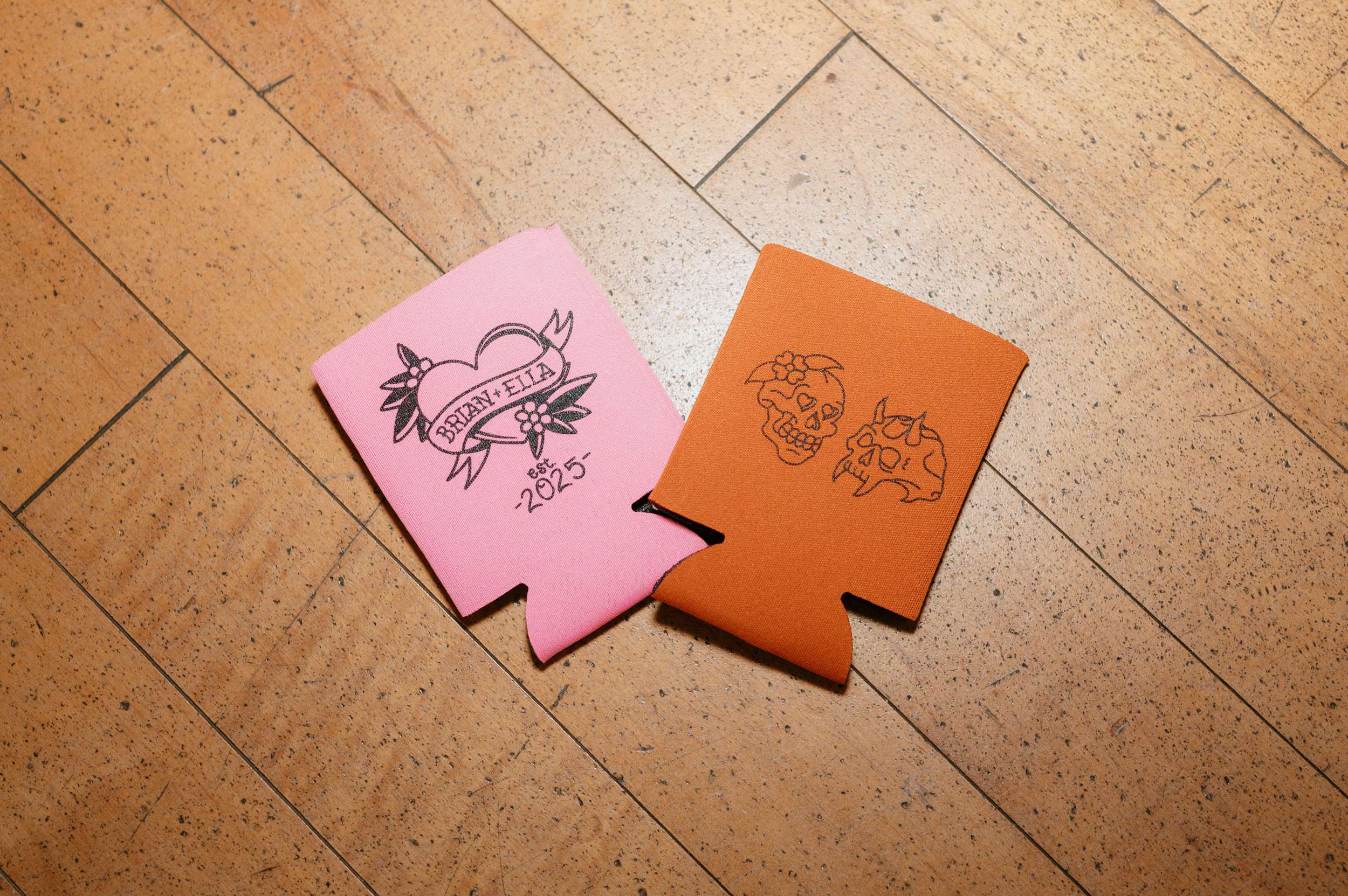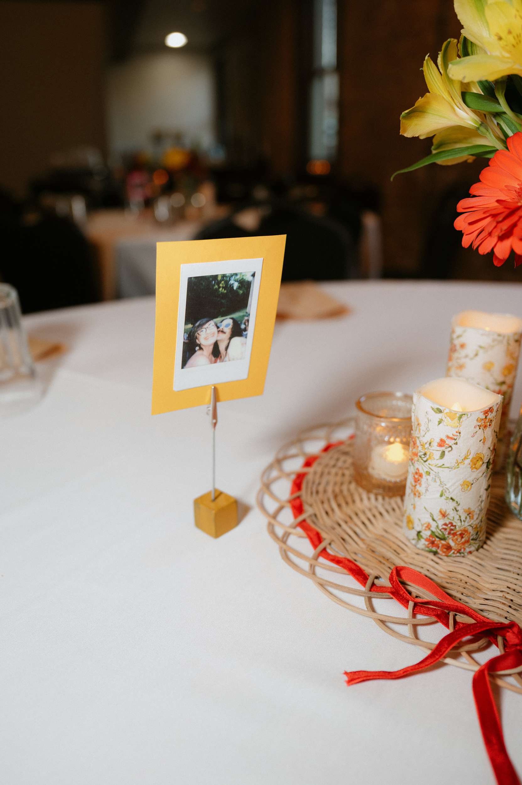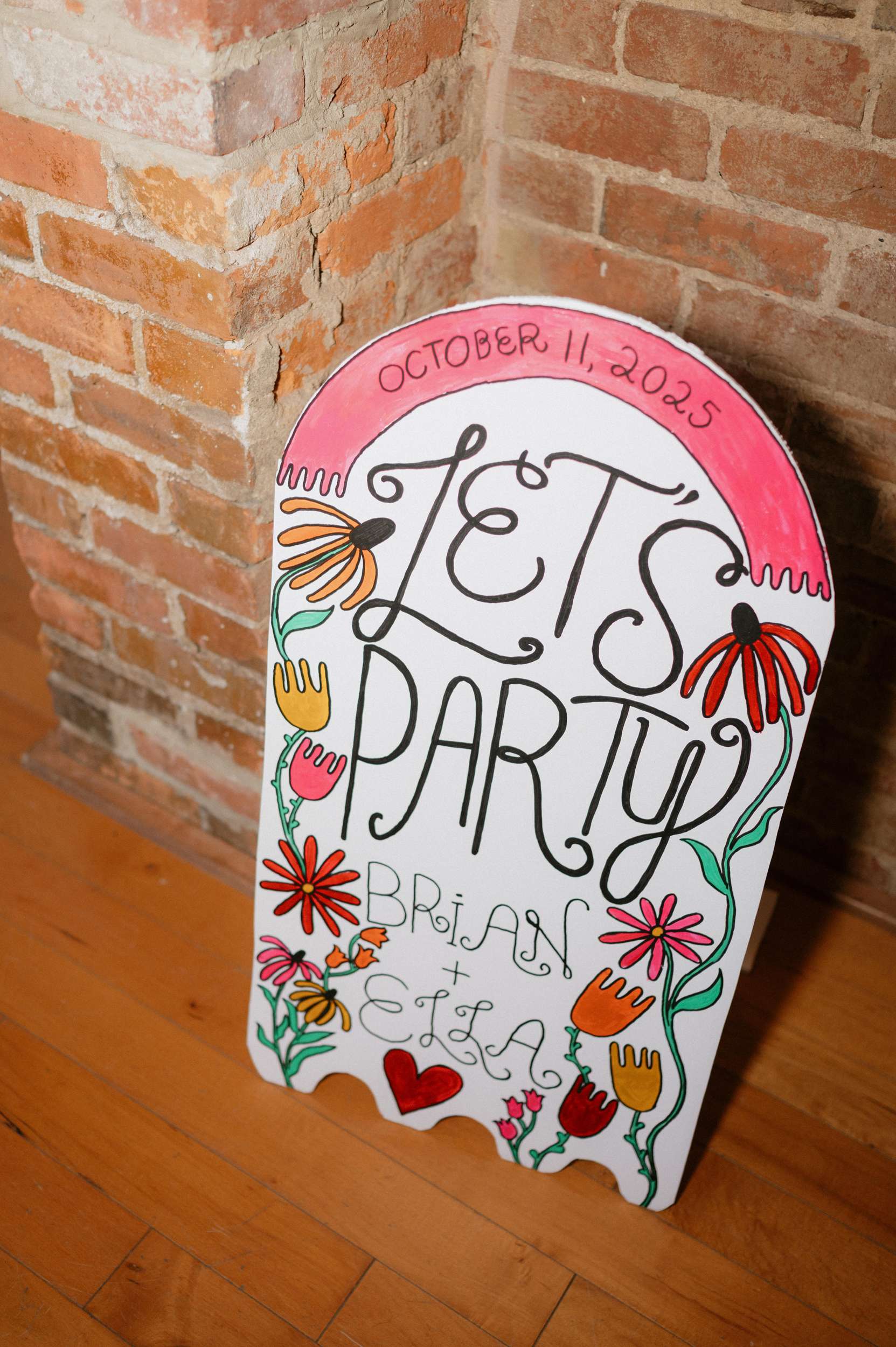 They leaned fully into the DIY process and built much of it themselves. Candles were wrapped in printed napkins and sealed with Mod Podge. Invitations were hand drawn in the style of a zine or comic book, copied at FedEx, then cut and folded at home. Table numbers were colour copies of Polaroids. Velvet ribbons were woven through IKEA placemats to create centrepieces. Flowers came from Costco and were arranged by hand. The ceremony arch décor was made by them. Ella designed and painted the welcome sign and seating chart.