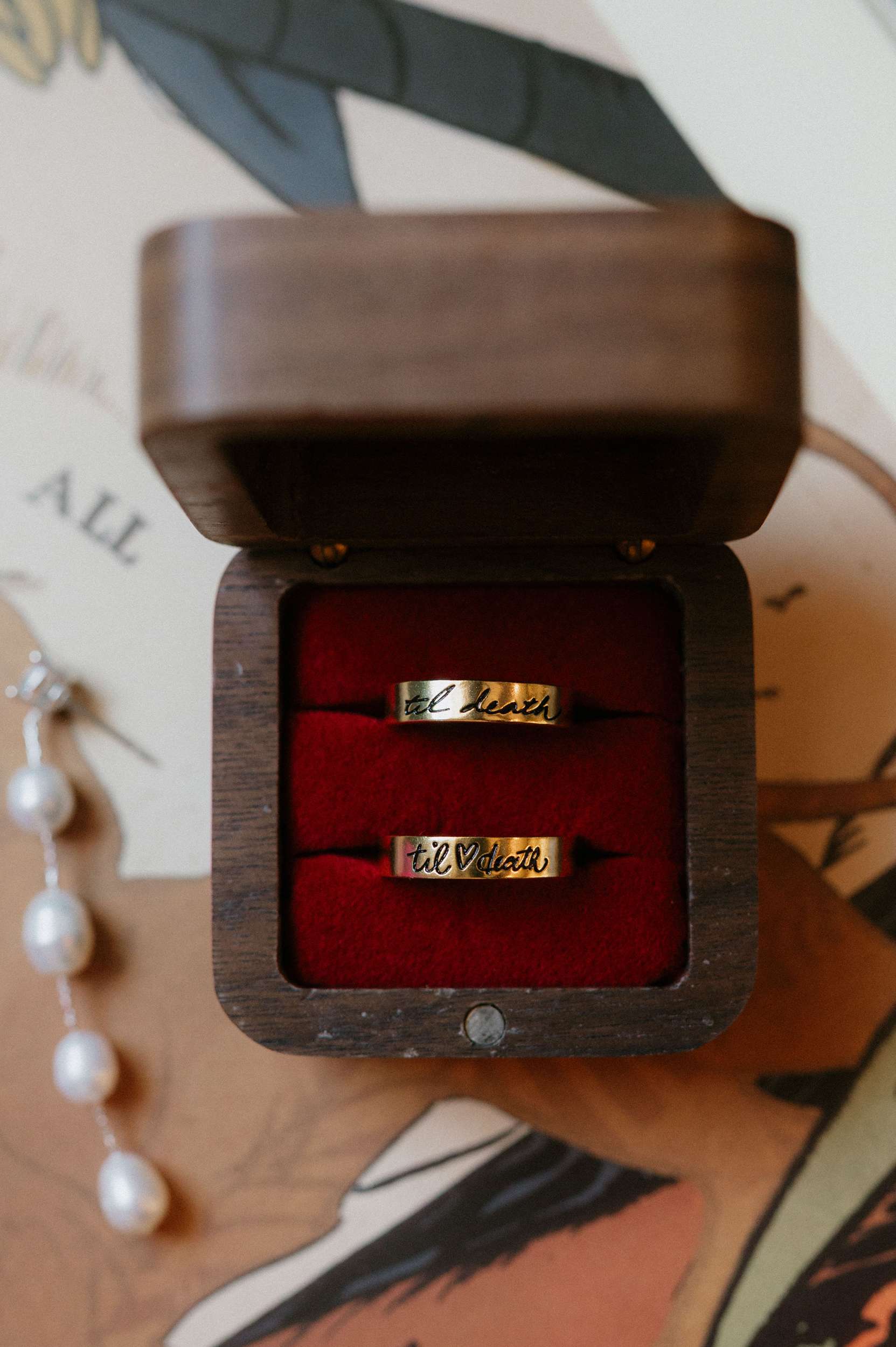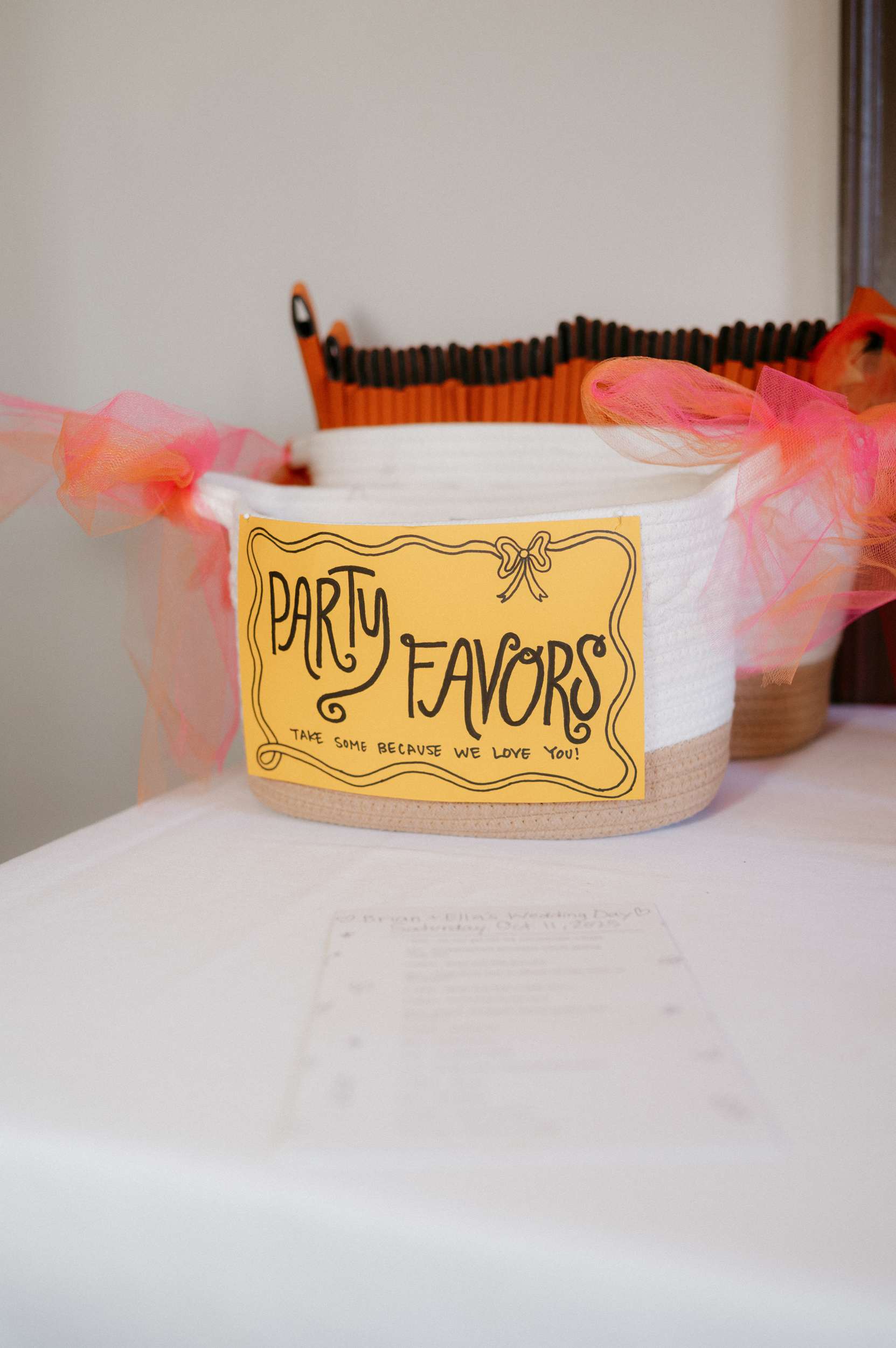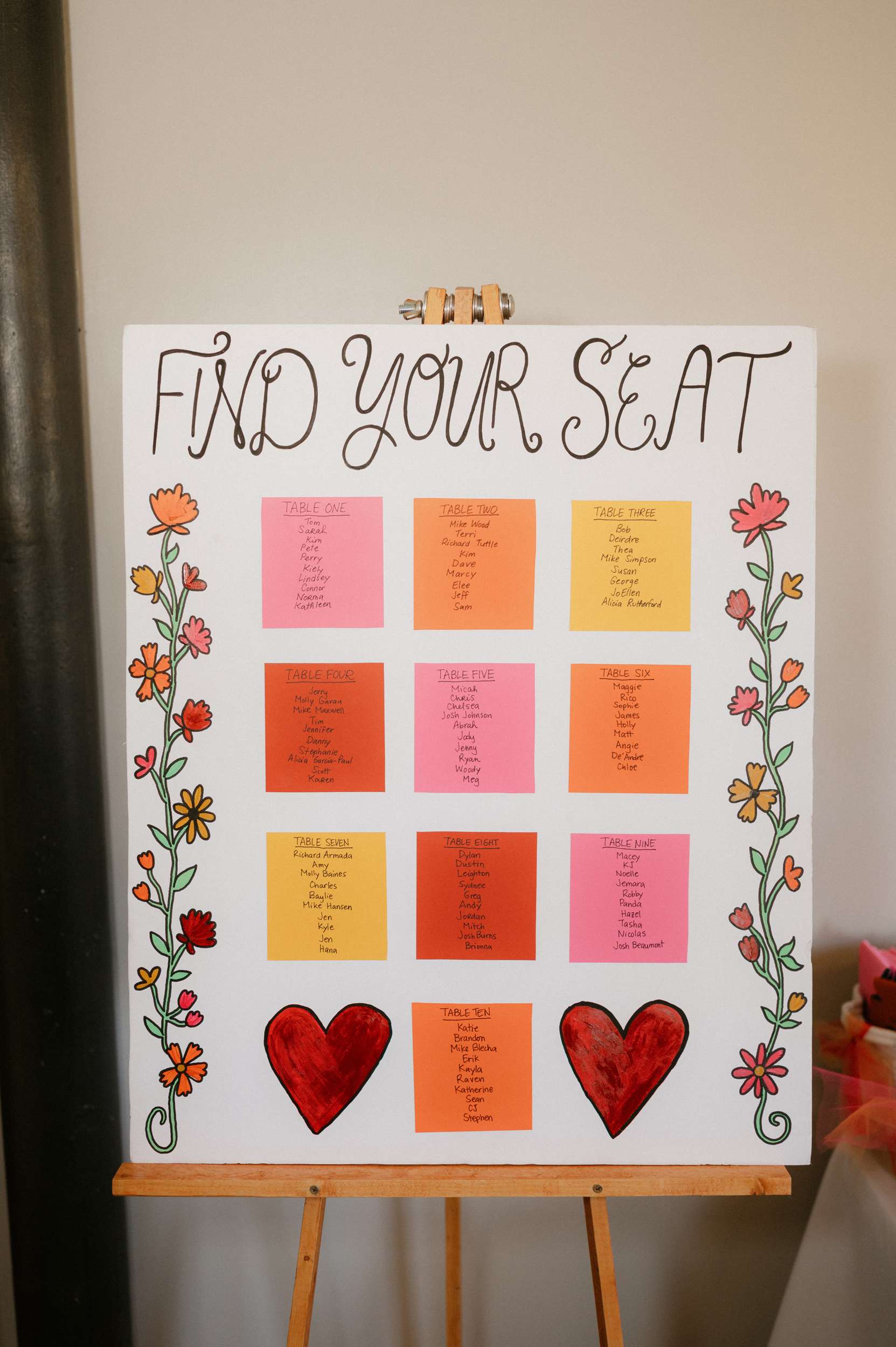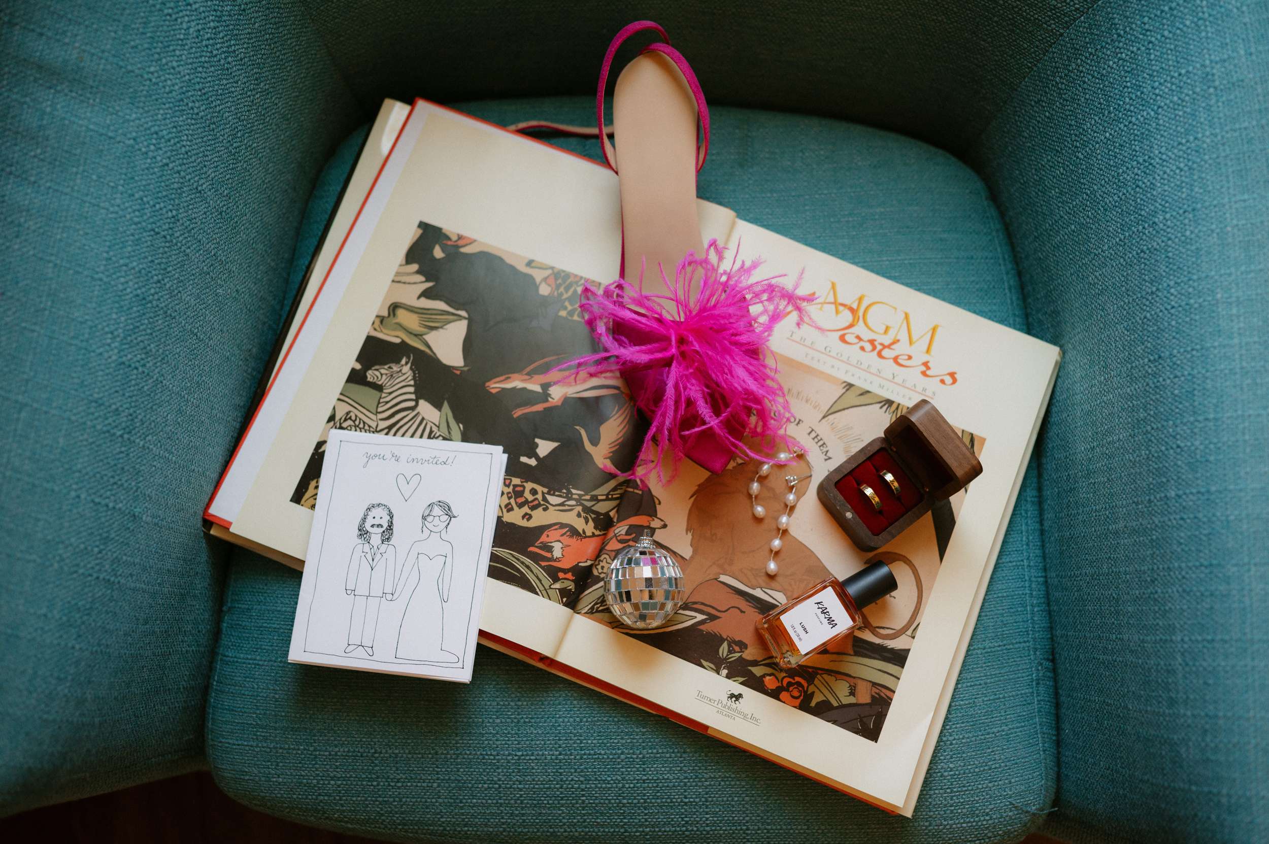They leaned fully into the DIY process and built much of it themselves. Candles were wrapped in printed napkins and sealed with Mod Podge. Invitations were hand drawn in the style of a zine or comic book, copied at FedEx, then cut and folded at home. Table numbers were colour copies of Polaroids. Velvet ribbons were woven through IKEA placemats to create centrepieces. Flowers came from Costco and were arranged by hand. The ceremony arch décor was made by them. Ella designed and painted the welcome sign and seating chart.