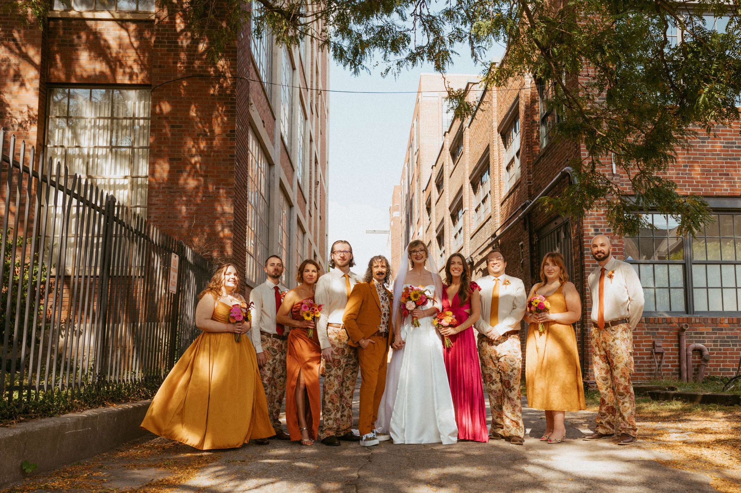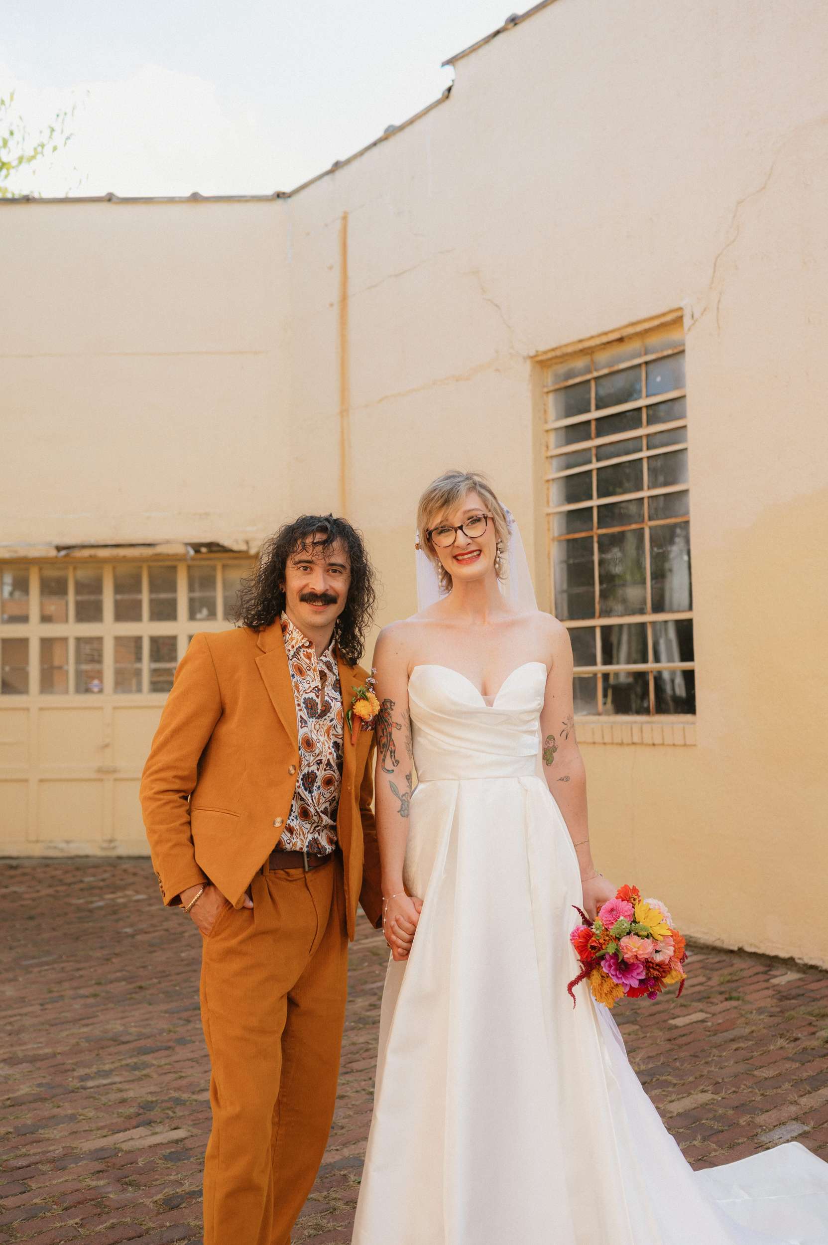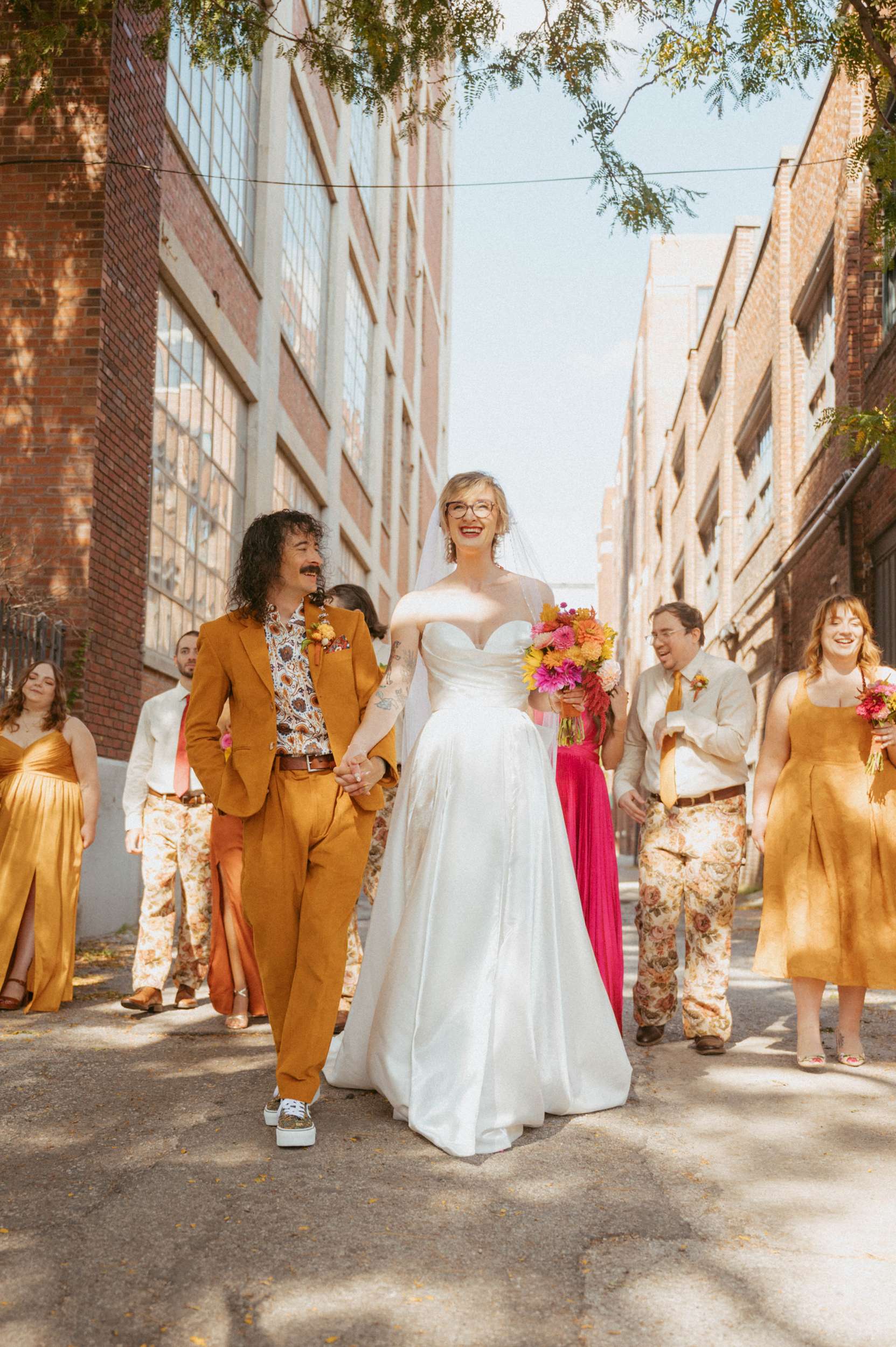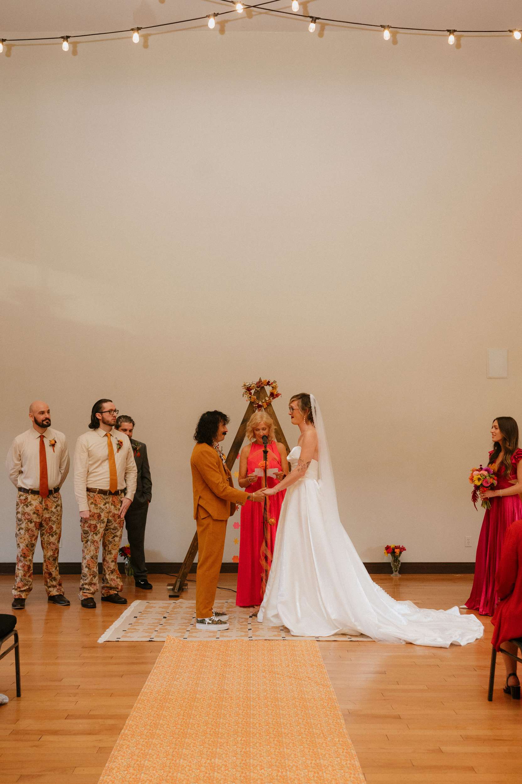 Ella and Brian pulled loosely from 70s motifs for their Indianapolis wedding, but mostly focused their planning on atmosphere they wanted to create. “Our biggest goal was to curate a vibe – fun, colourful, laid-back, open-hearted, and full of love”, Ella said. “We wanted our friends to become friends with our other friends they didn’t know yet. We wanted it to feel like a PARTY, not a stuffy event that you HAVE to go to. All the people there were people we WANTED to be there, and we wanted them to want to be there, too!!!”