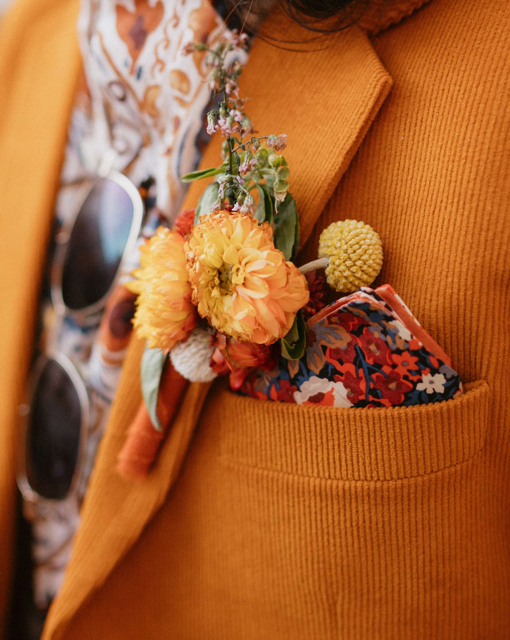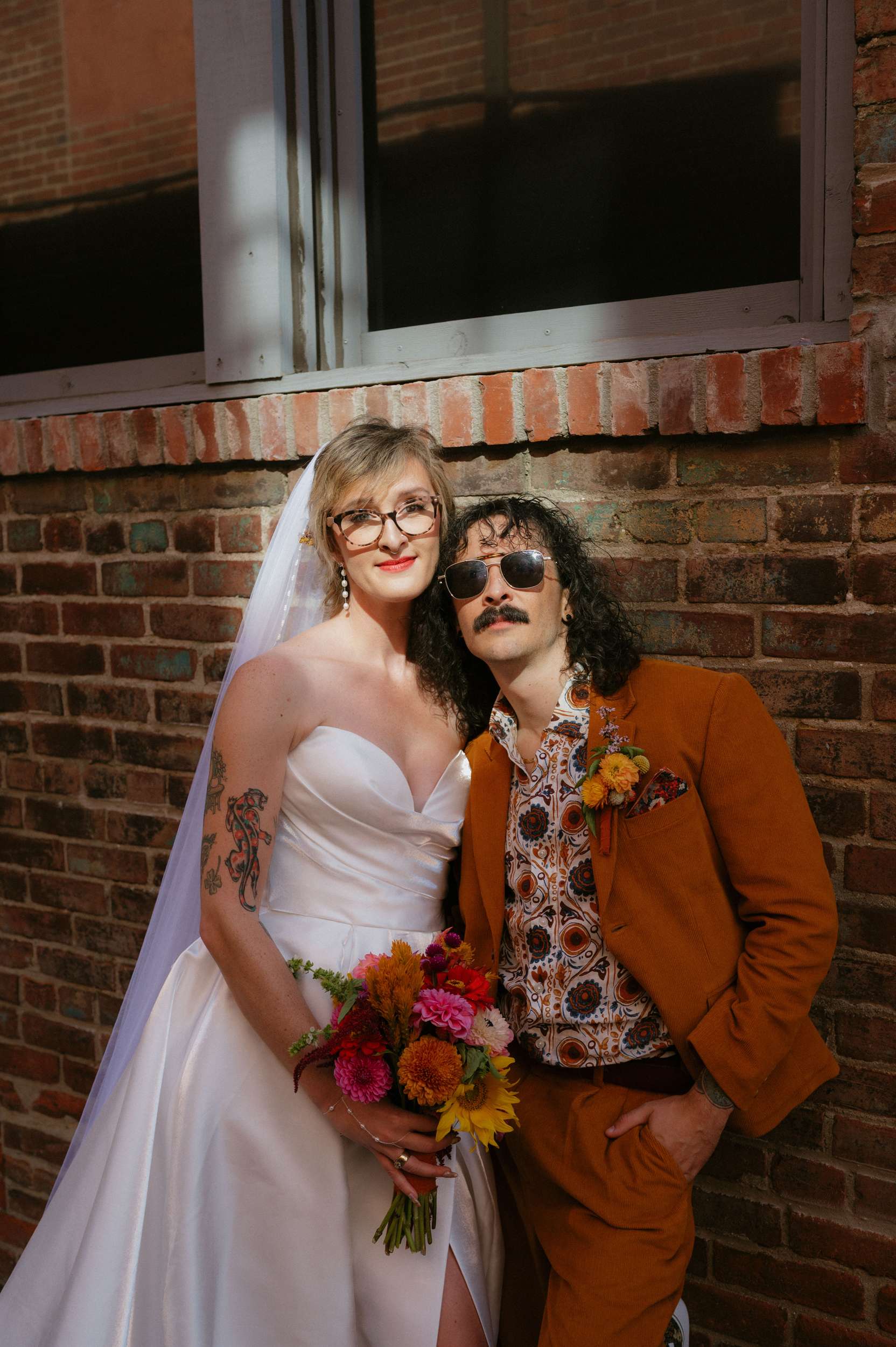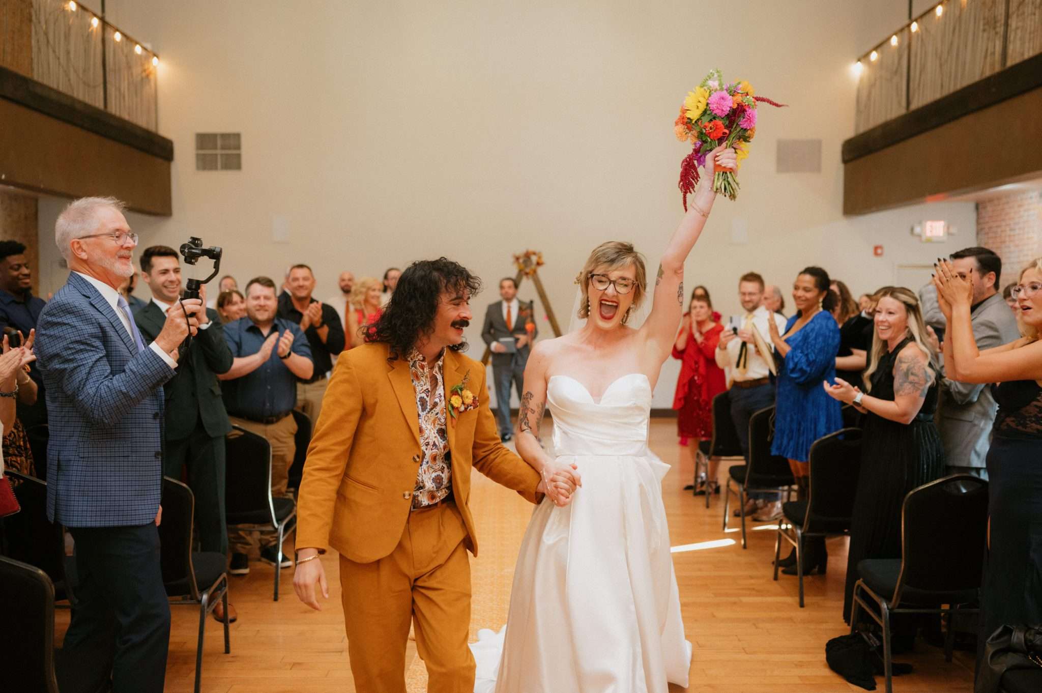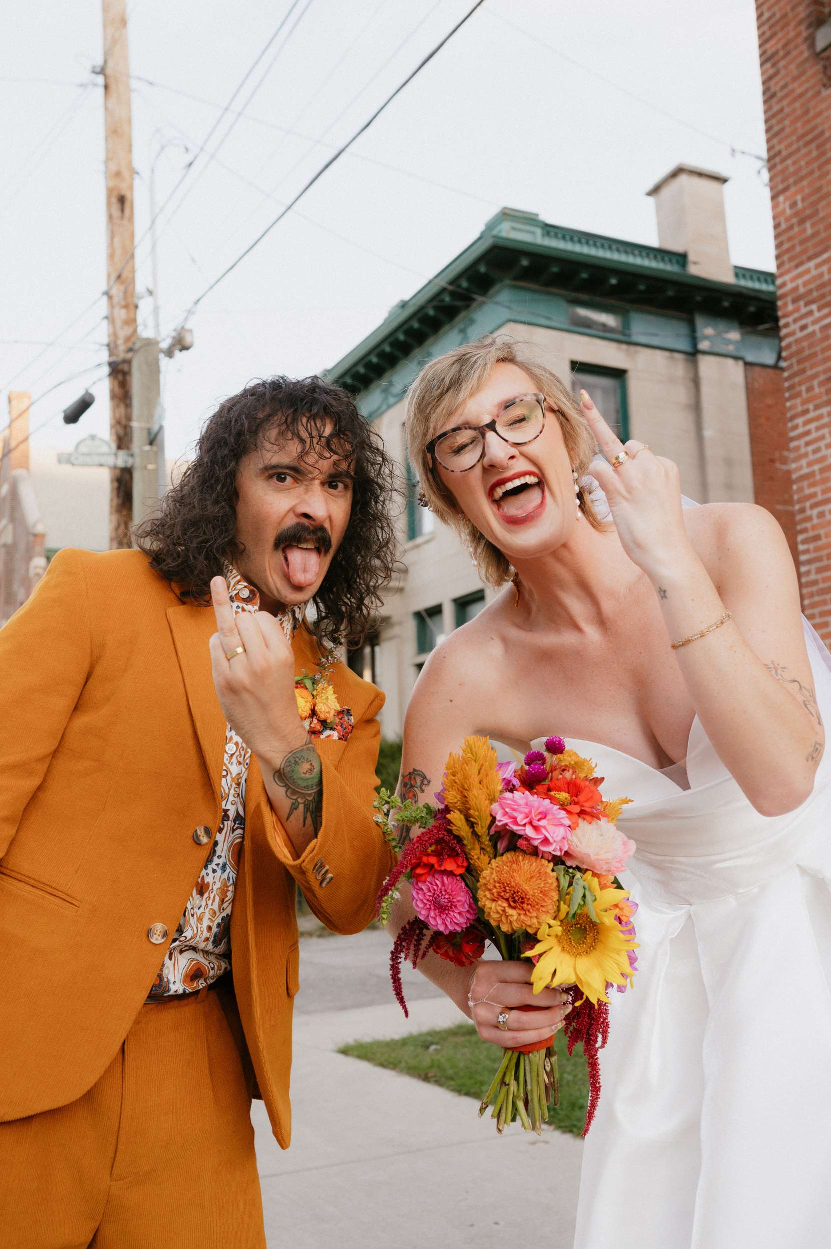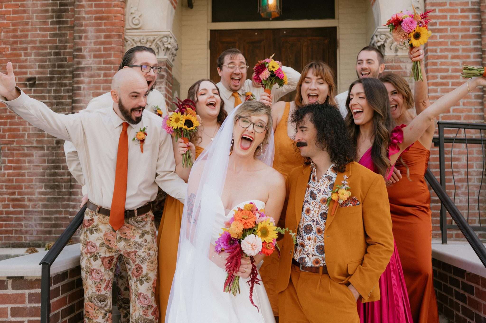 Ella and Brian pulled loosely from 70s motifs for their Indianapolis wedding, but mostly focused their planning on atmosphere they wanted to create. “Our biggest goal was to curate a vibe – fun, colourful, laid-back, open-hearted, and full of love”, Ella said. “We wanted our friends to become friends with our other friends they didn’t know yet. We wanted it to feel like a PARTY, not a stuffy event that you HAVE to go to. All the people there were people we WANTED to be there, and we wanted them to want to be there, too!!!”
