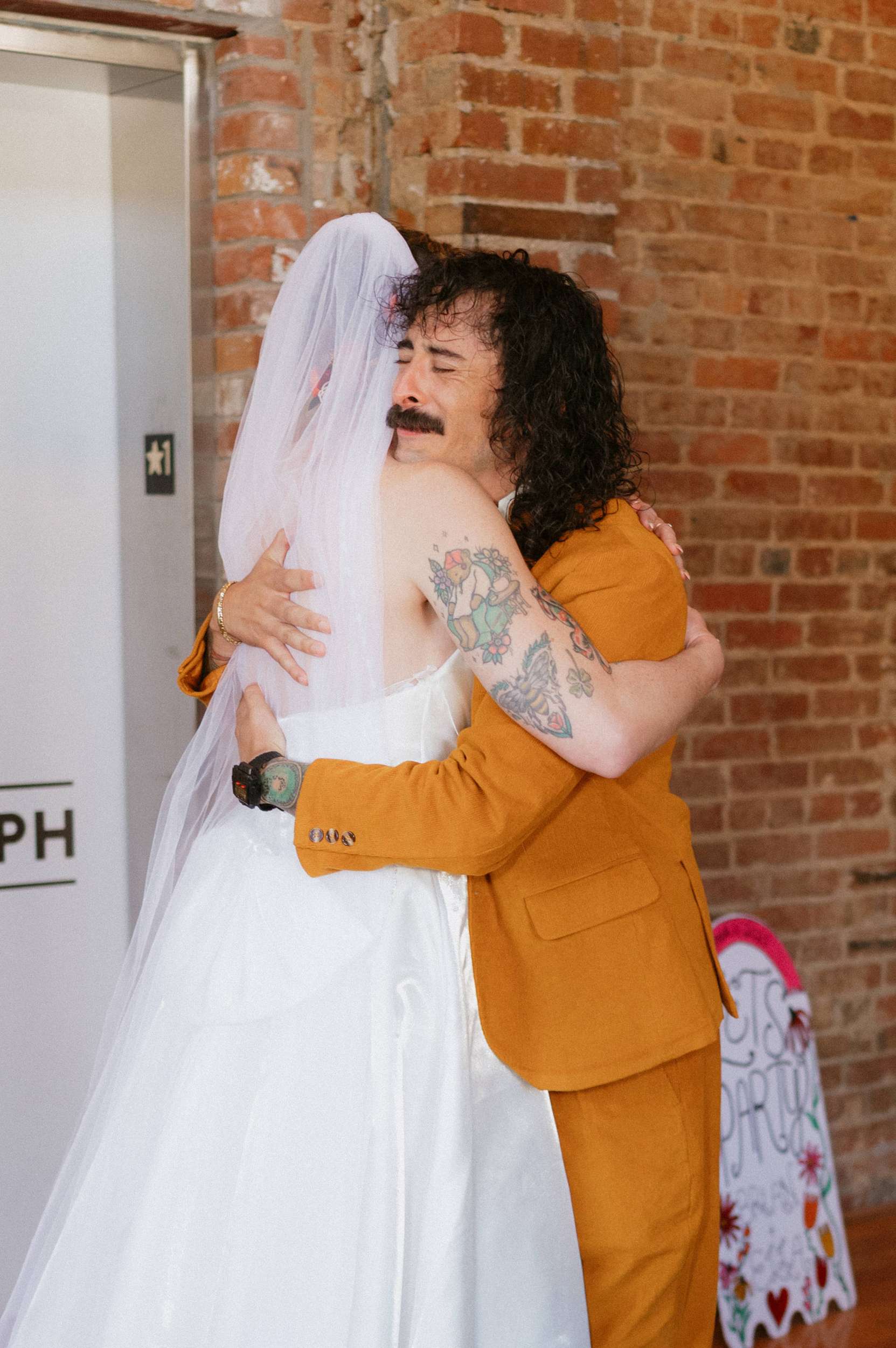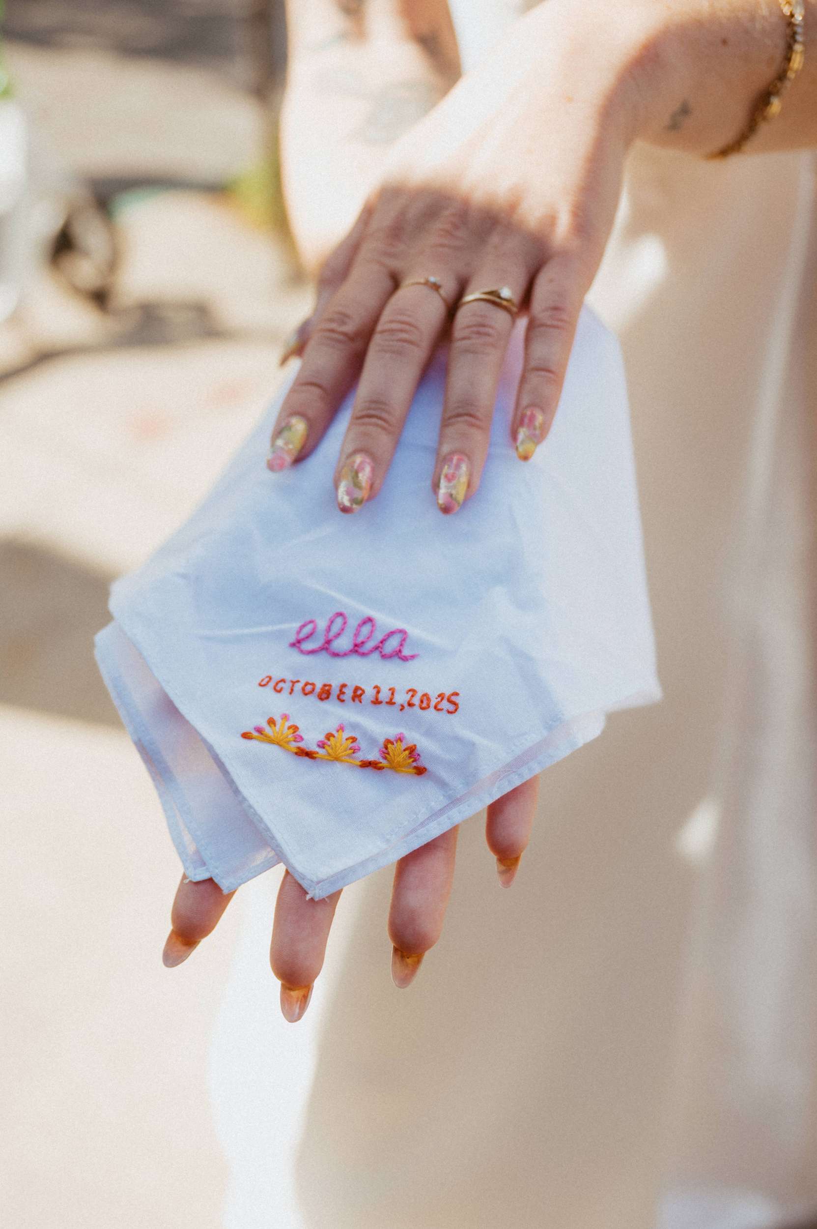 Ella walked down the aisle with both of her parents to a lived rendition of Here Comes the Sun. “Our incredibly talented friend Richard played the acoustic guitar for us”, she said. “Our vows were emotional – people laughed and cried! At one point during Brian’s vows, he started crying, and I pulled a handkerchief (beautifully embroidered by bridesmaid Abby) from my cleavage to wipe his tears.” The couple met on Tinder so in her vows Ella included the line, “You know I love to online shop, but my favourite thing I’ve ever found on the internet is you.”