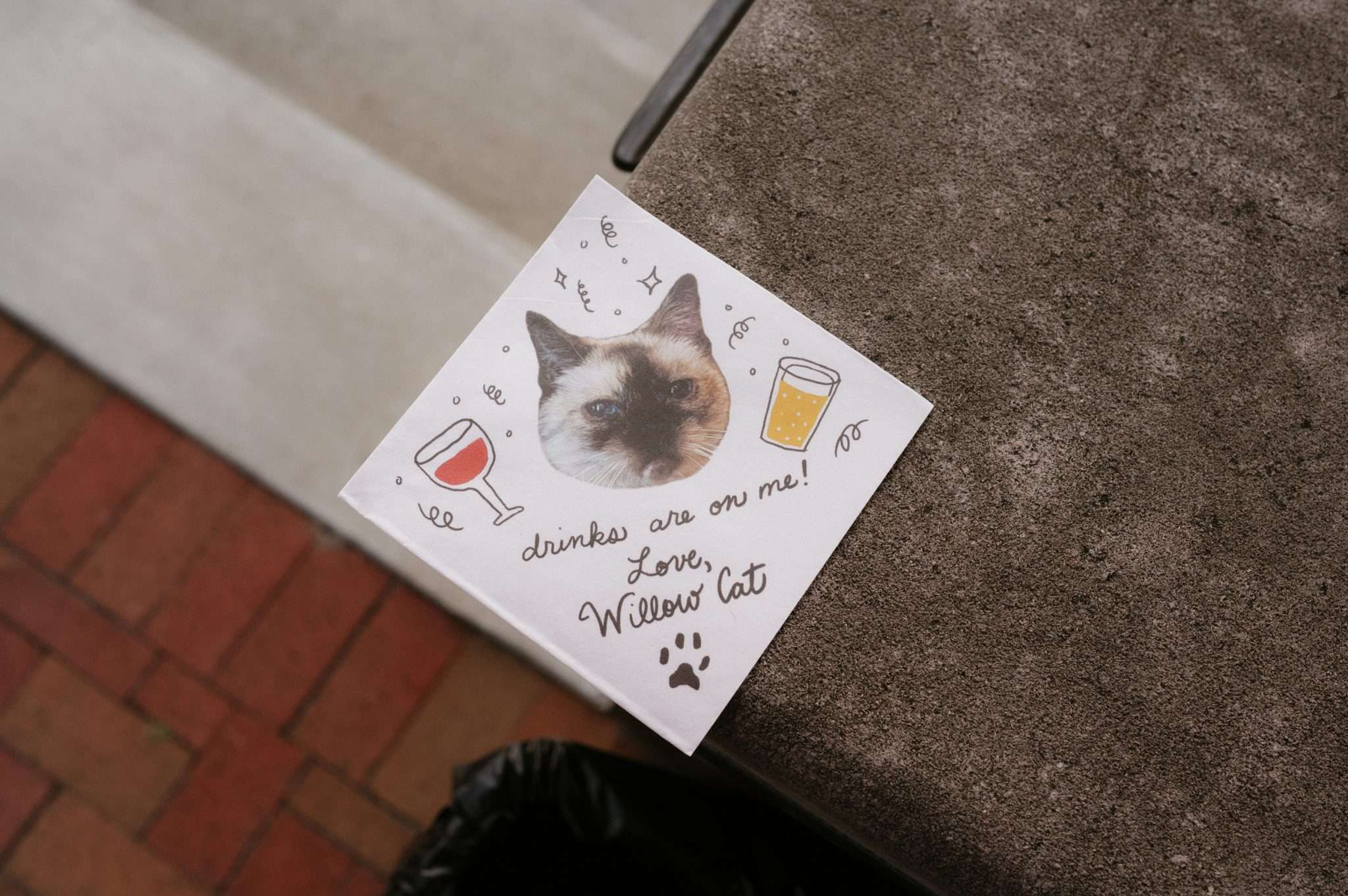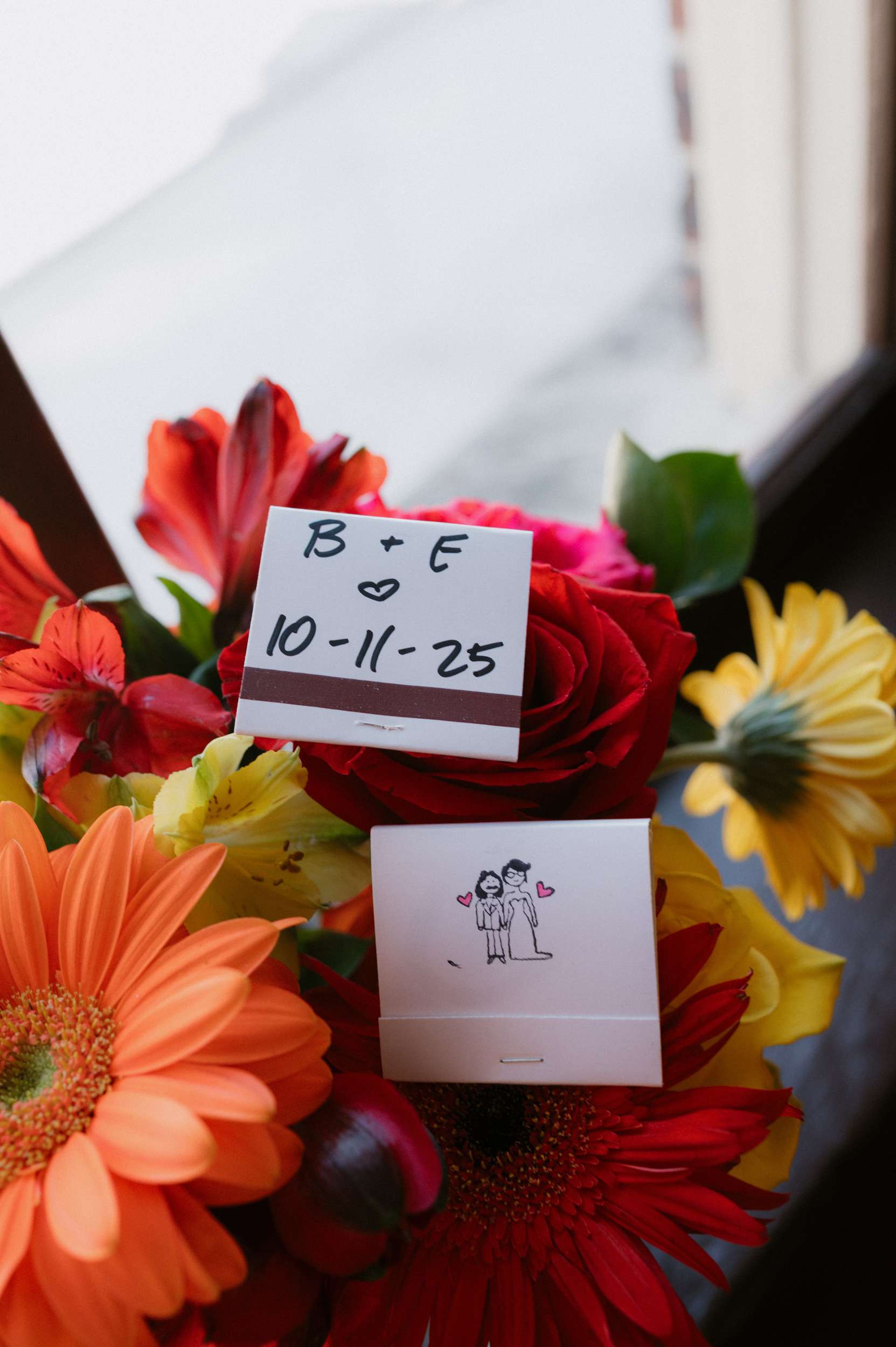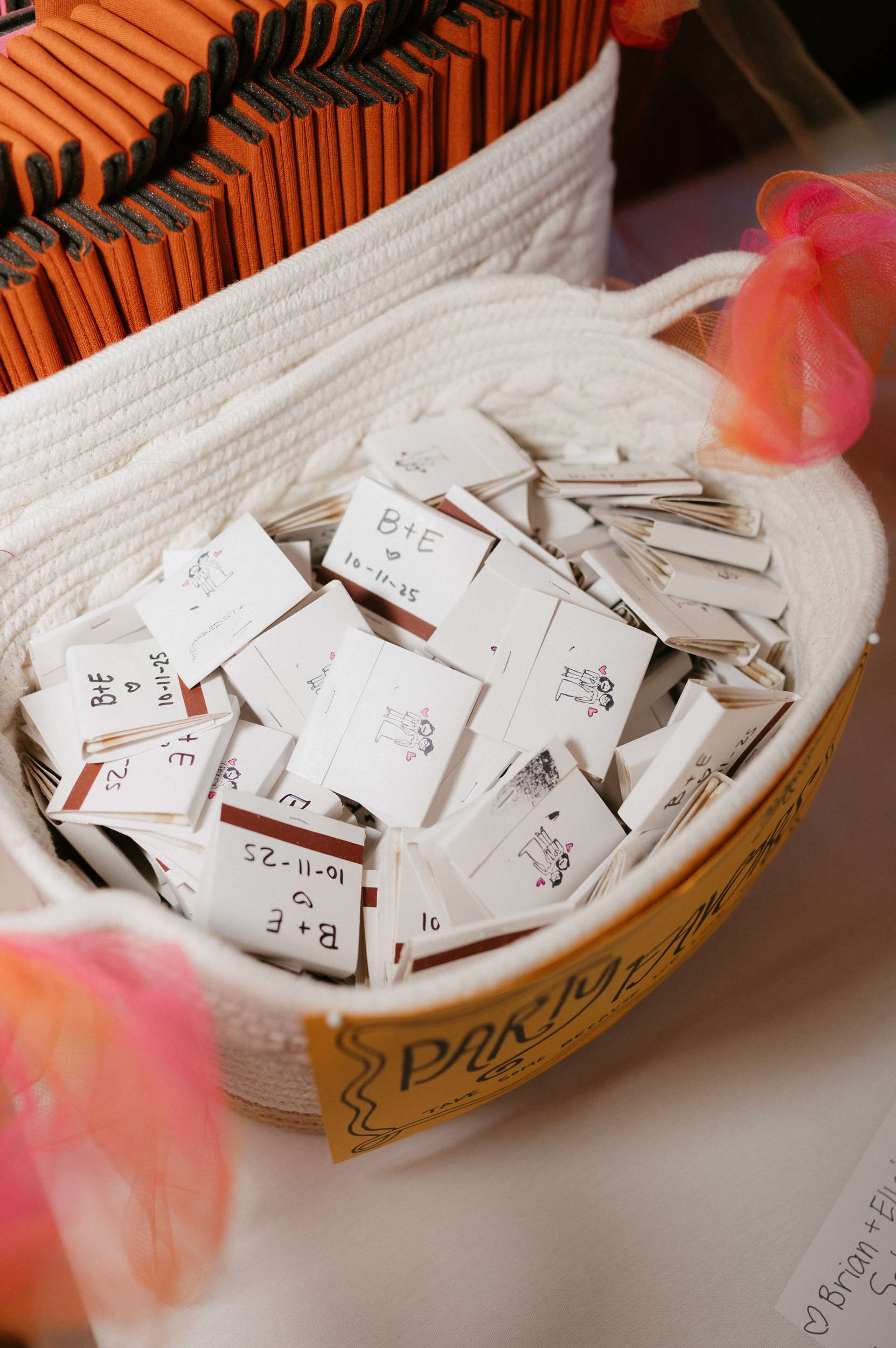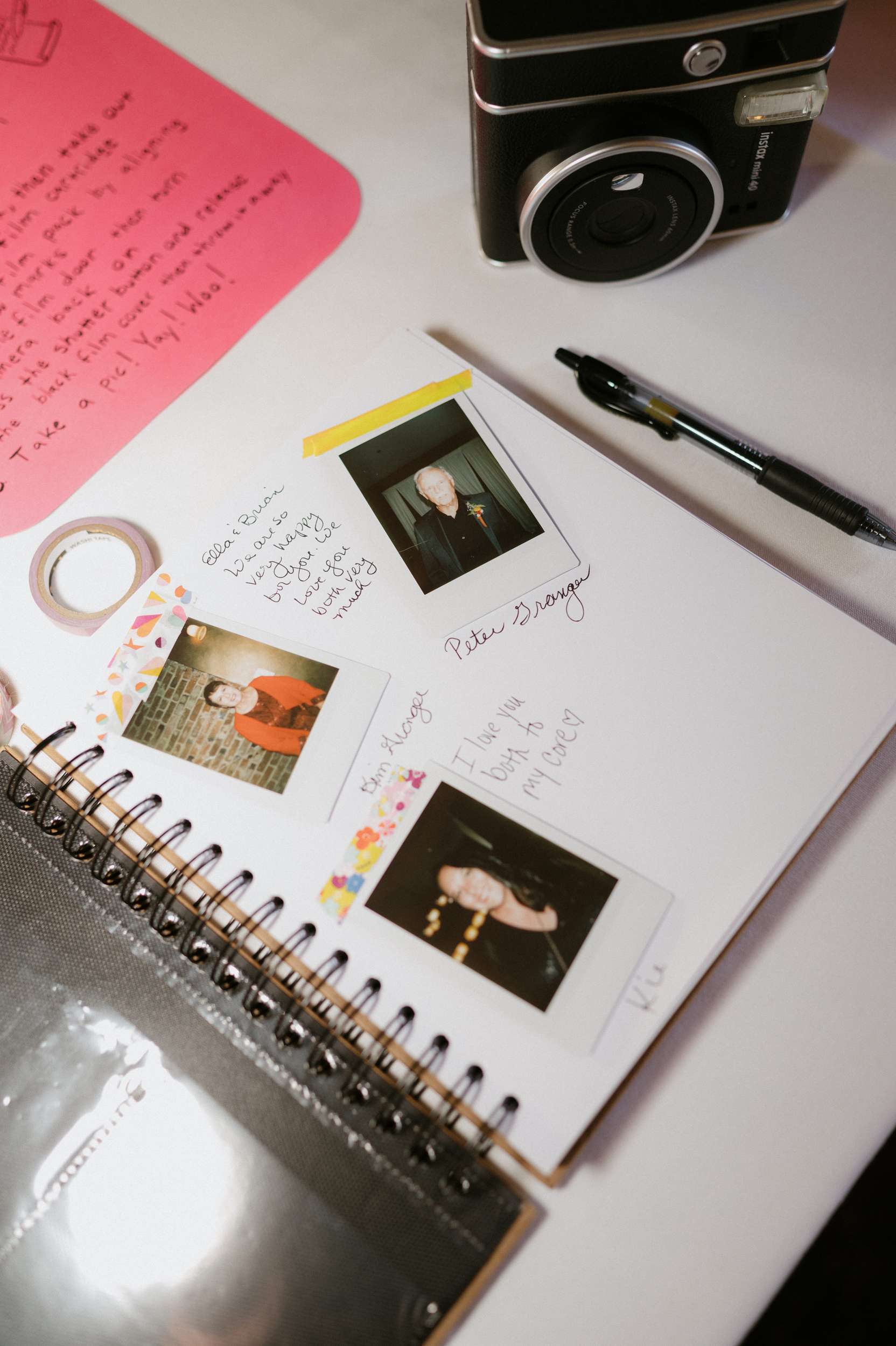 Even the guest book became an activity. A blank sketchbook sat beside a Polaroid camera, with colourful washi tape for guests to stick their photos in place. Matchbooks were stamped with a doodle of the couple, then initialled and dated in Sharpie as party favours. Their cat’s face appeared on the bar napkins.
