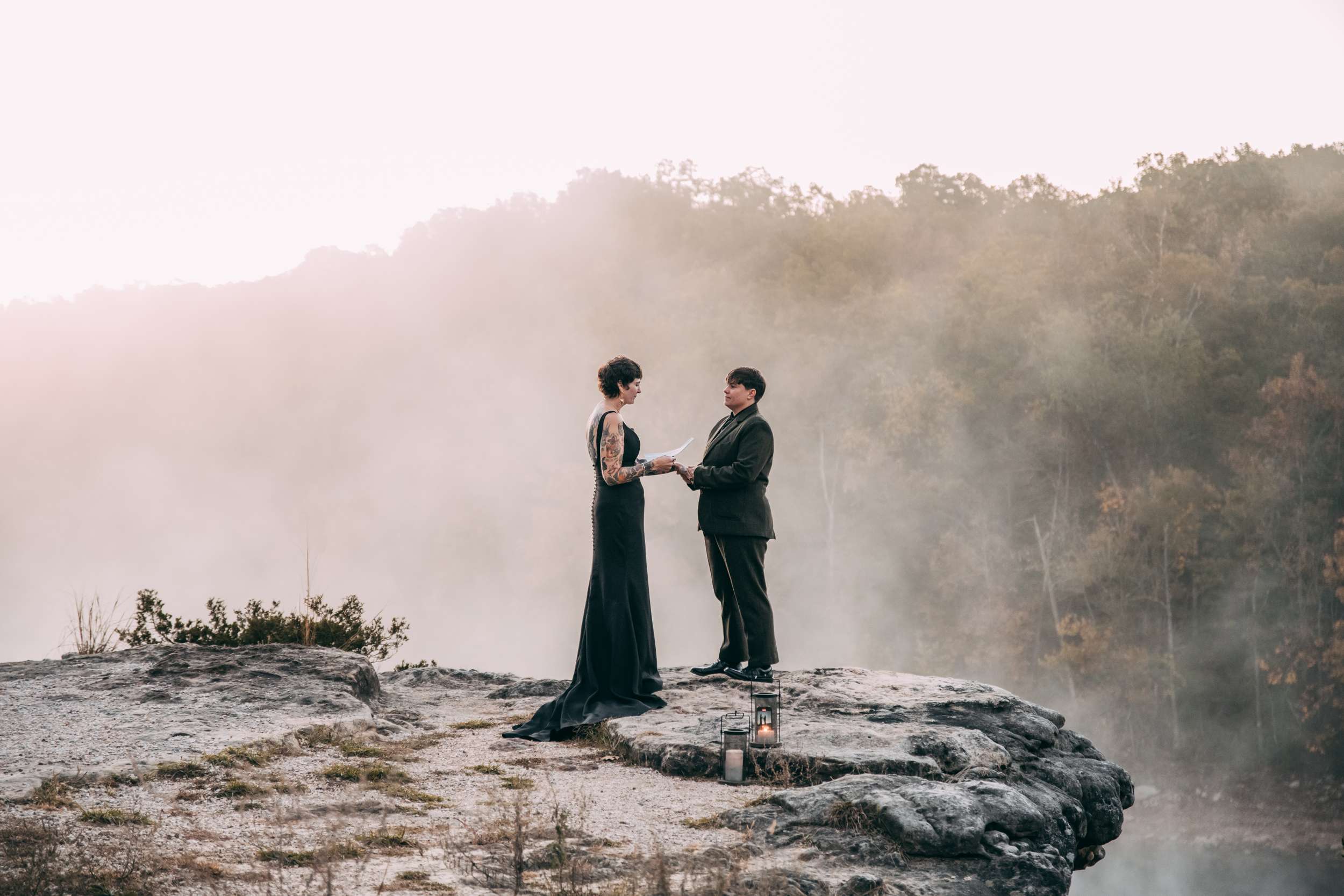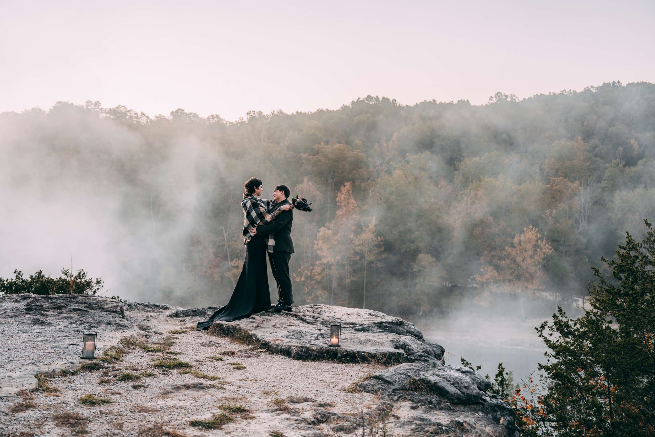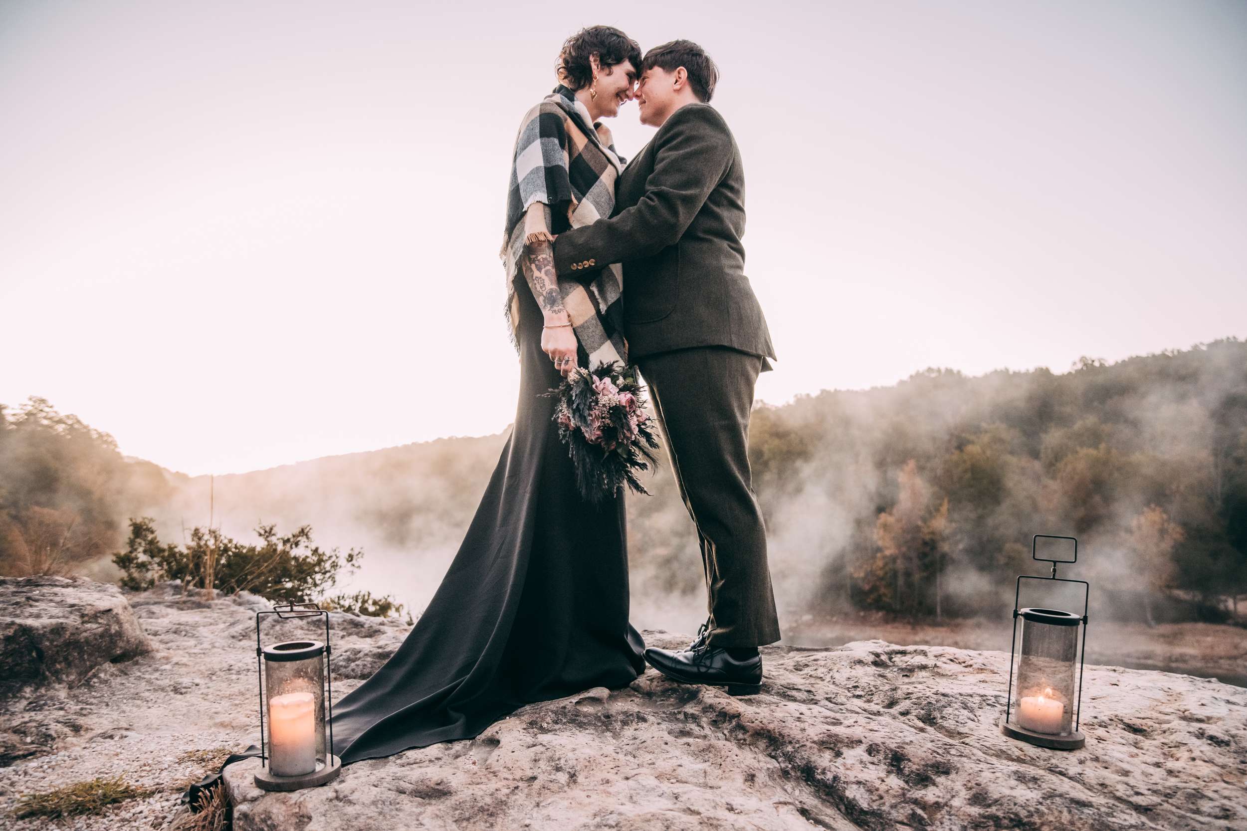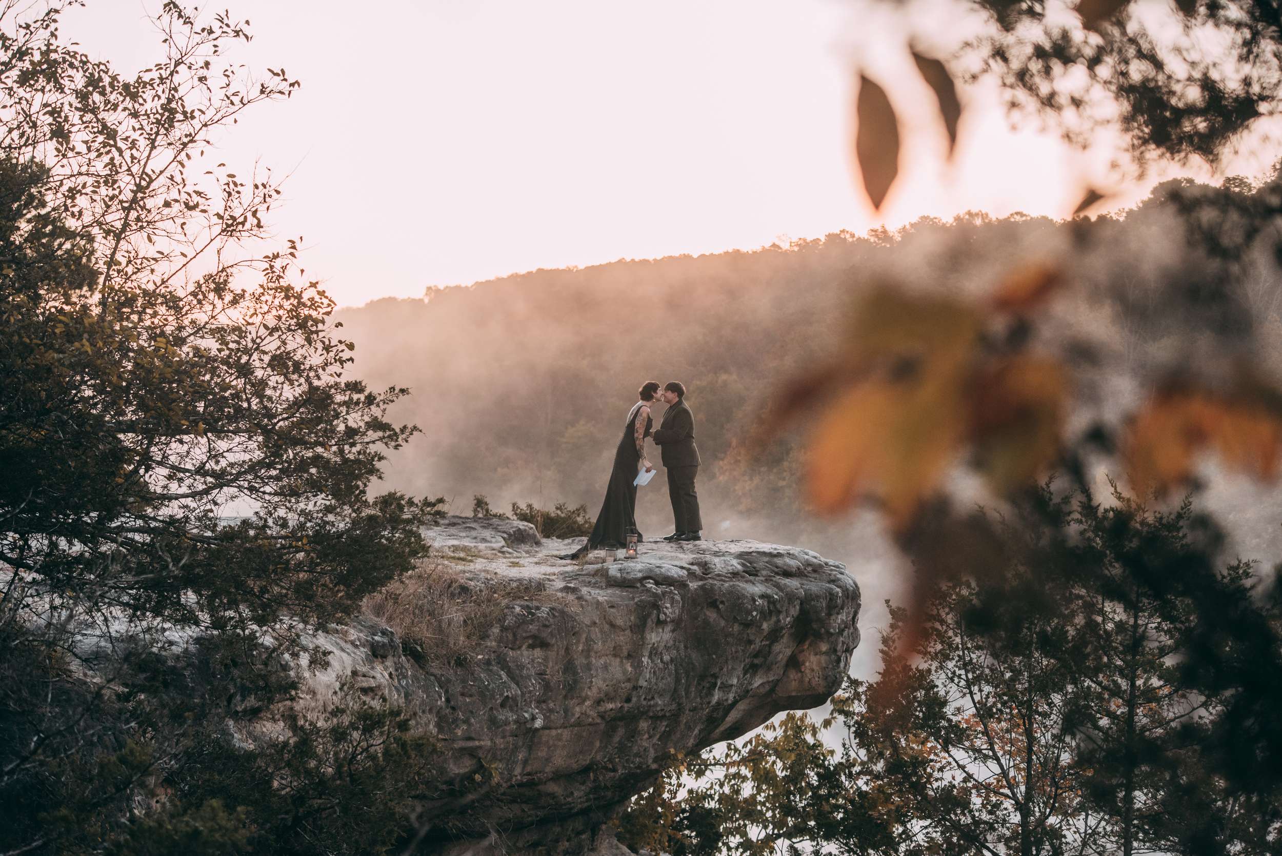 April and Brandy married twice, both in ways that made sense for them. In July, under a willow tree in the garden of their friend and photographer Courtney of Stag and Bird, the couple made it official. By autumn, they decided they wanted a second day that marked the marriage in a different way. So, in October they drove four hours south from where they live in Kansas City to Eureka Springs, Arkansas. Waiting for them were Courtney and her assistant Kendal, along with a loose plan to say some vows at sunrise at Lover’s Leap, a scenic overlook just outside the town.