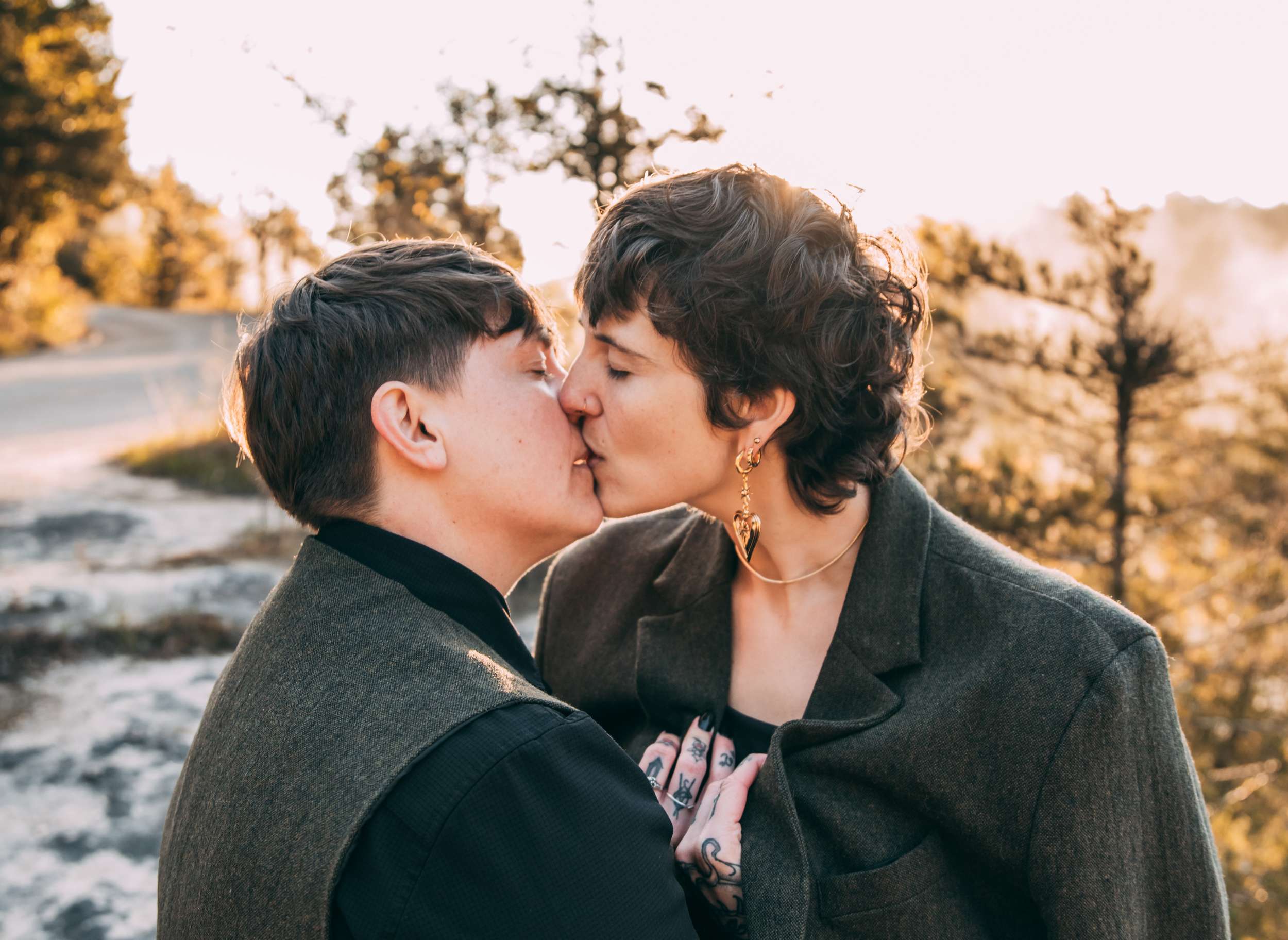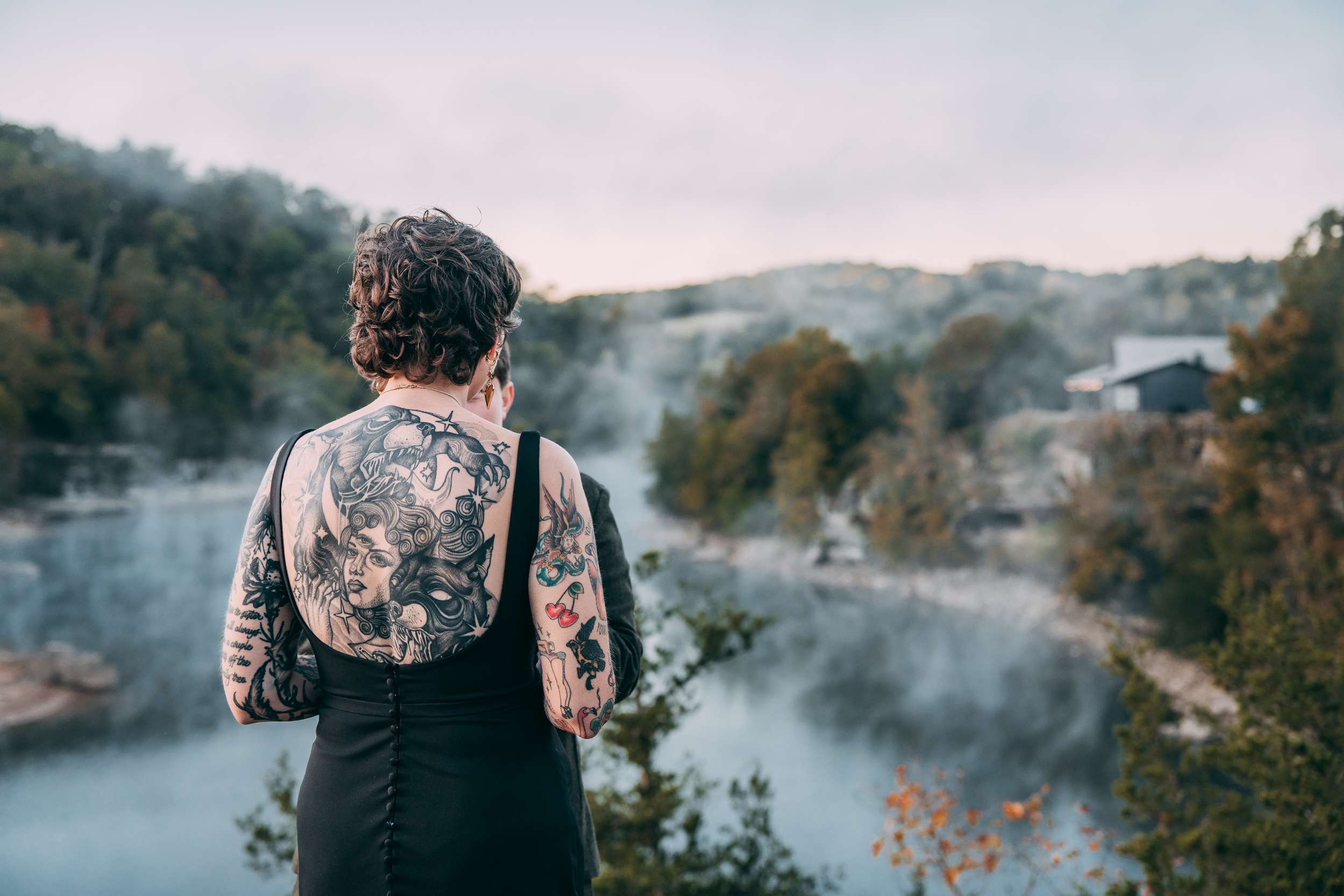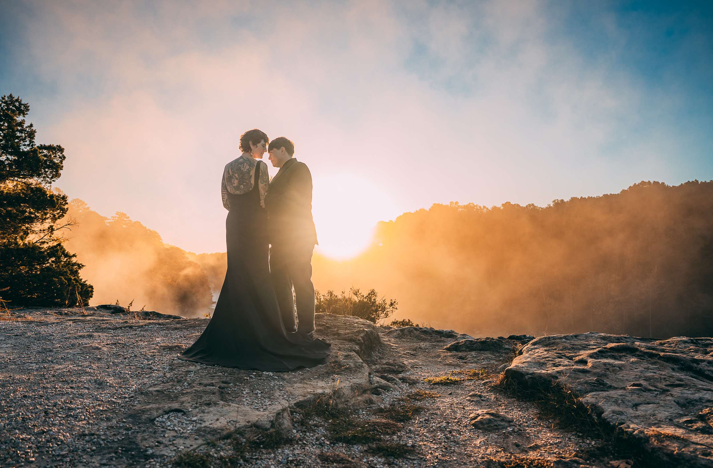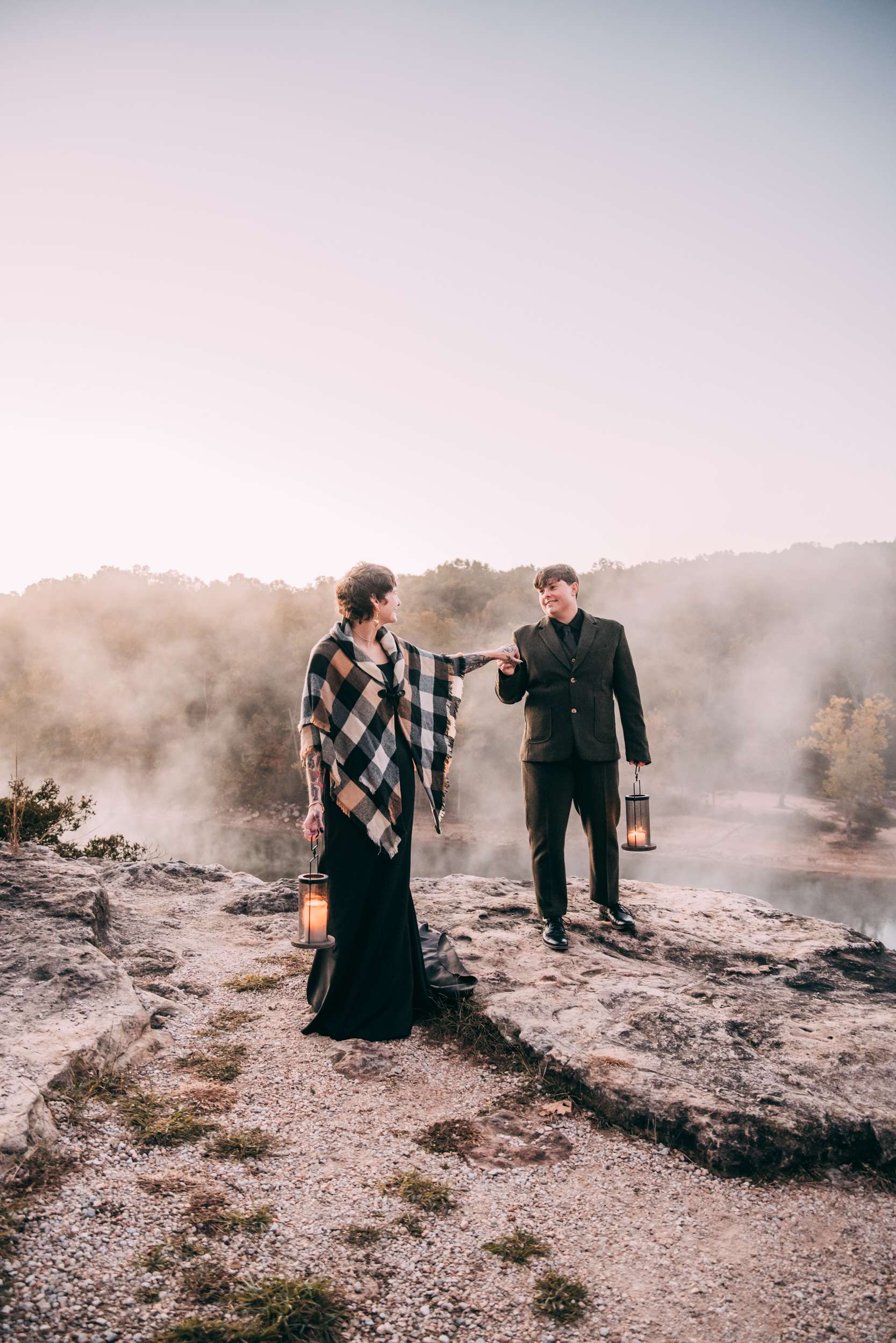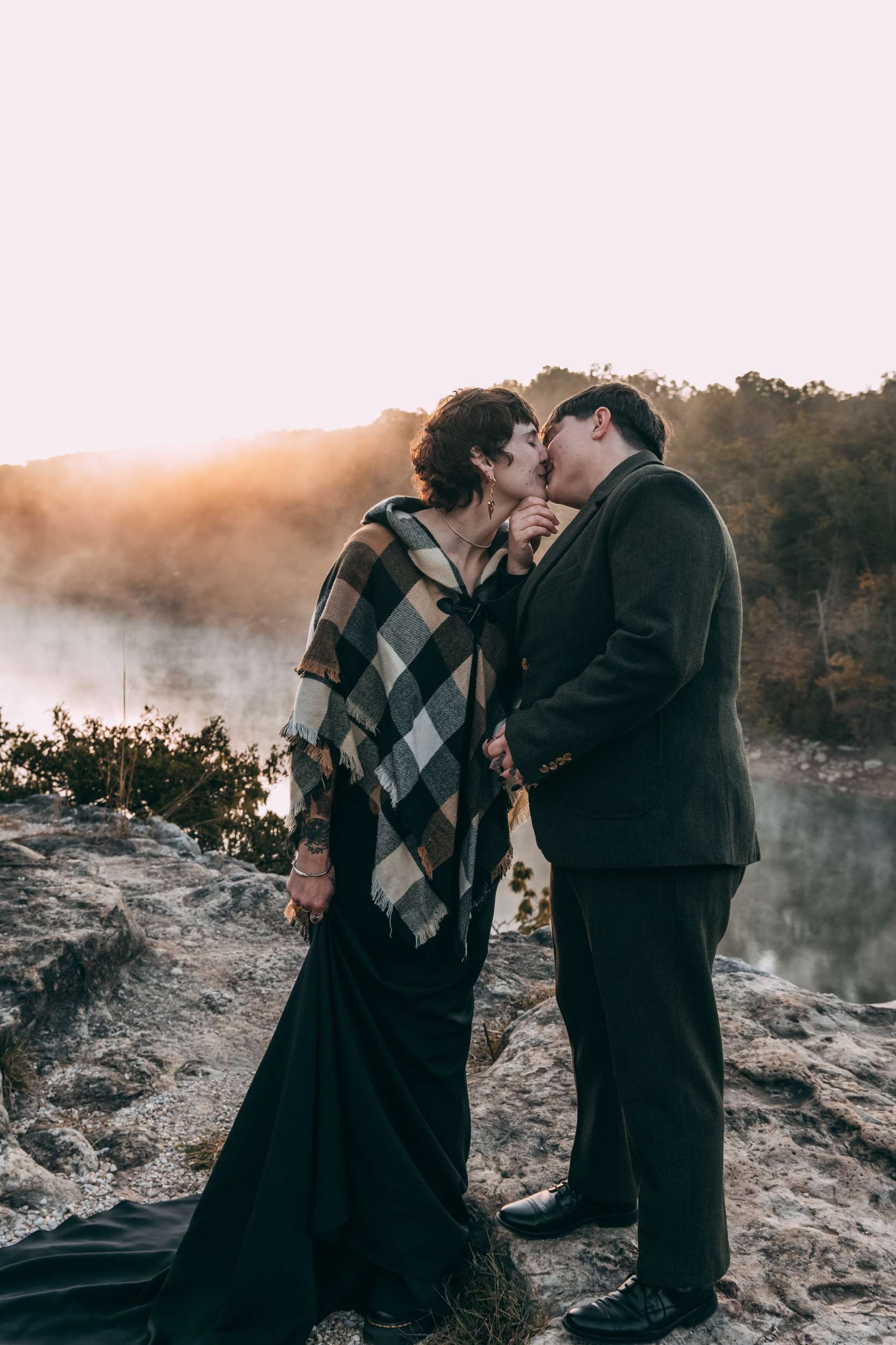 April and Brandy married twice, both in ways that made sense for them. In July, under a willow tree in the garden of their friend and photographer Courtney of Stag and Bird, the couple made it official. By autumn, they decided they wanted a second day that marked the marriage in a different way. So, in October they drove four hours south from where they live in Kansas City to Eureka Springs, Arkansas. Waiting for them were Courtney and her assistant Kendal, along with a loose plan to say some vows at sunrise at Lover’s Leap, a scenic overlook just outside the town.