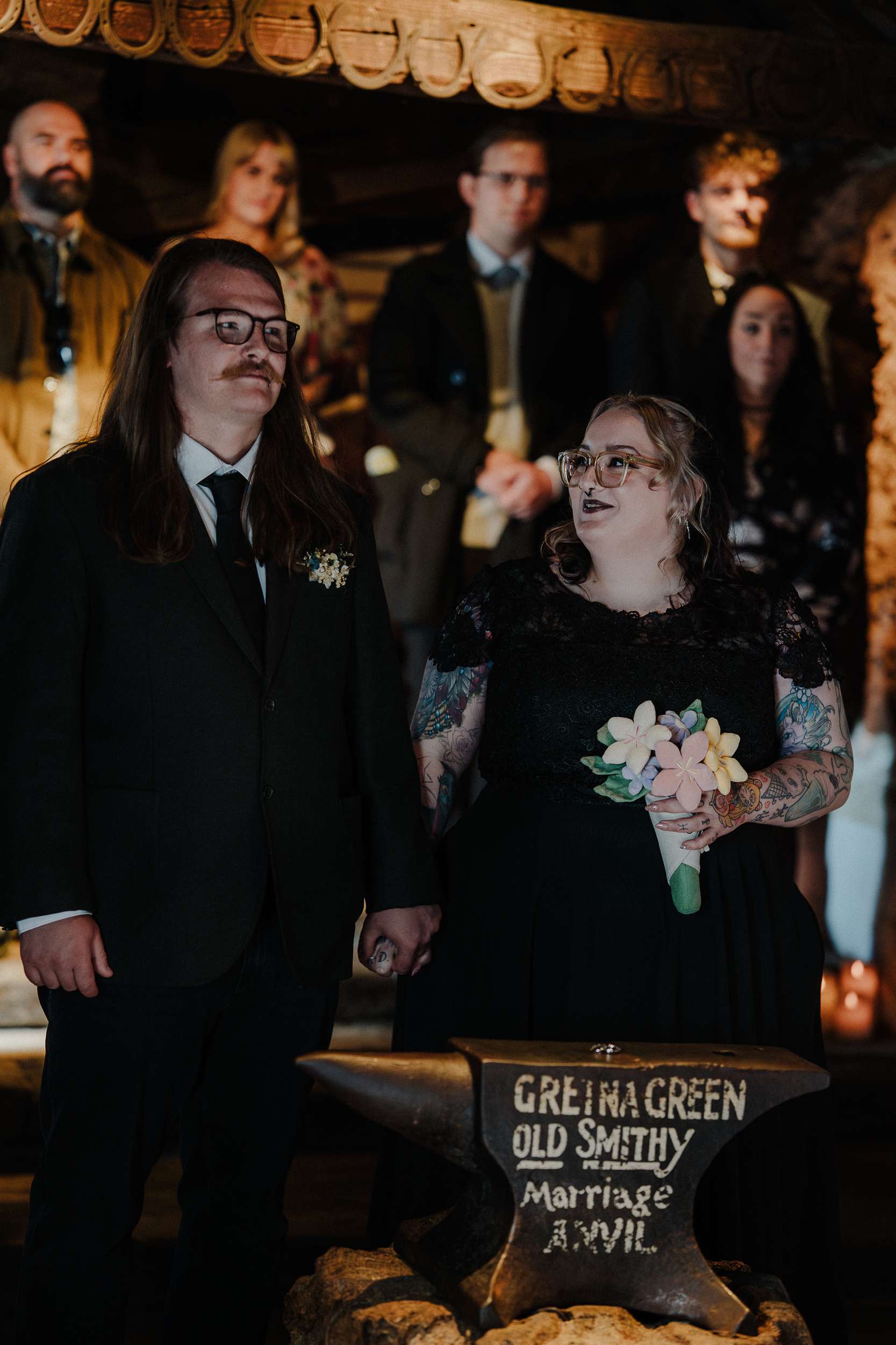 Laura and Jordon married in the original marriage room at Gretna Green with 13 people present, including themselves. The day was intentionally small. The couple got ready together and walked from our hotel to the venue hand in hand. They also walked to the anvil together. “Jordon struggles with anxiety at times so being with me helped reduce a lot of nerves for him”, Laura wrote. “We also only had 13 people including ourselves at the wedding and then wedding meal with no big evening do. We wanted the wedding to reflect our love and not put on a show.”