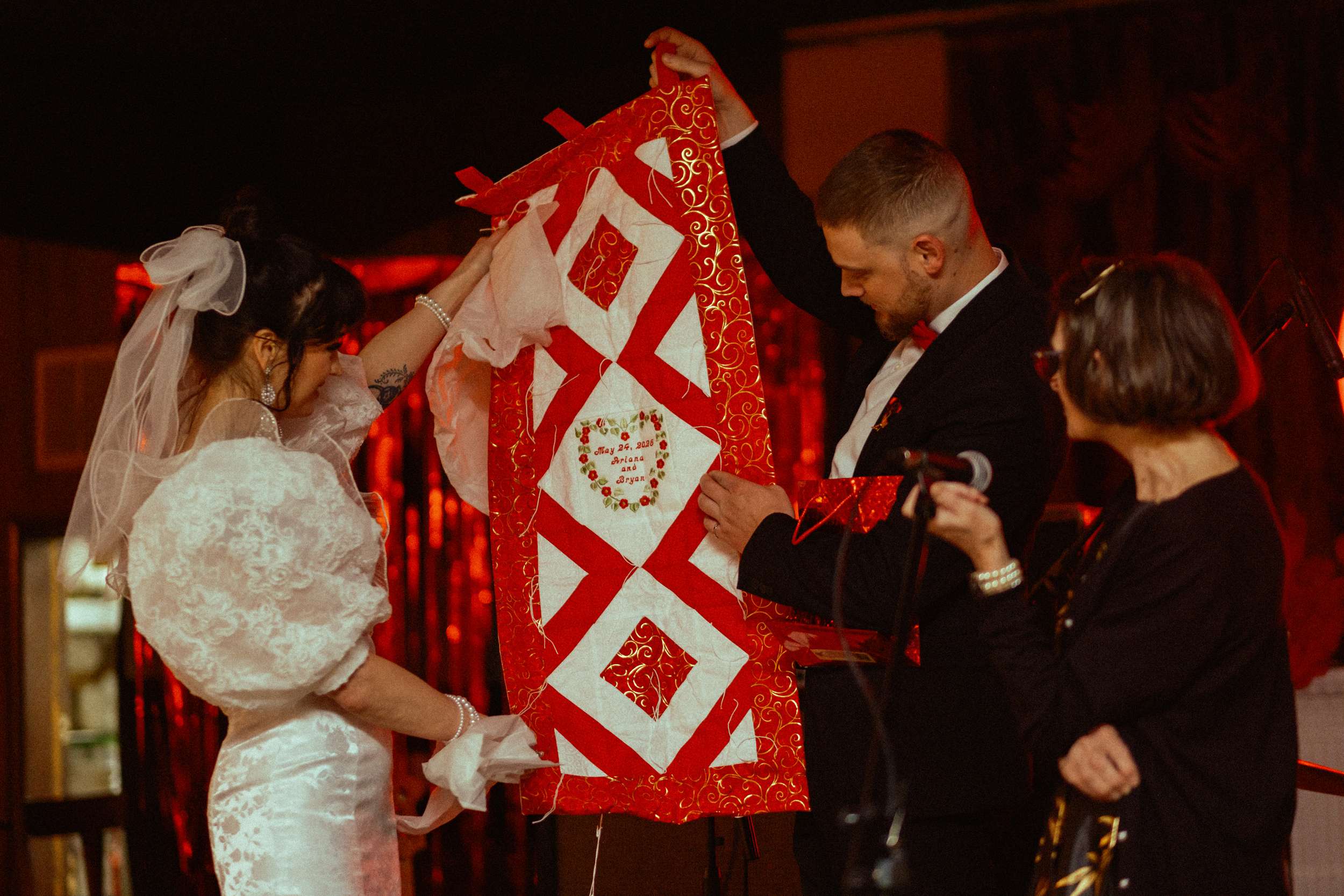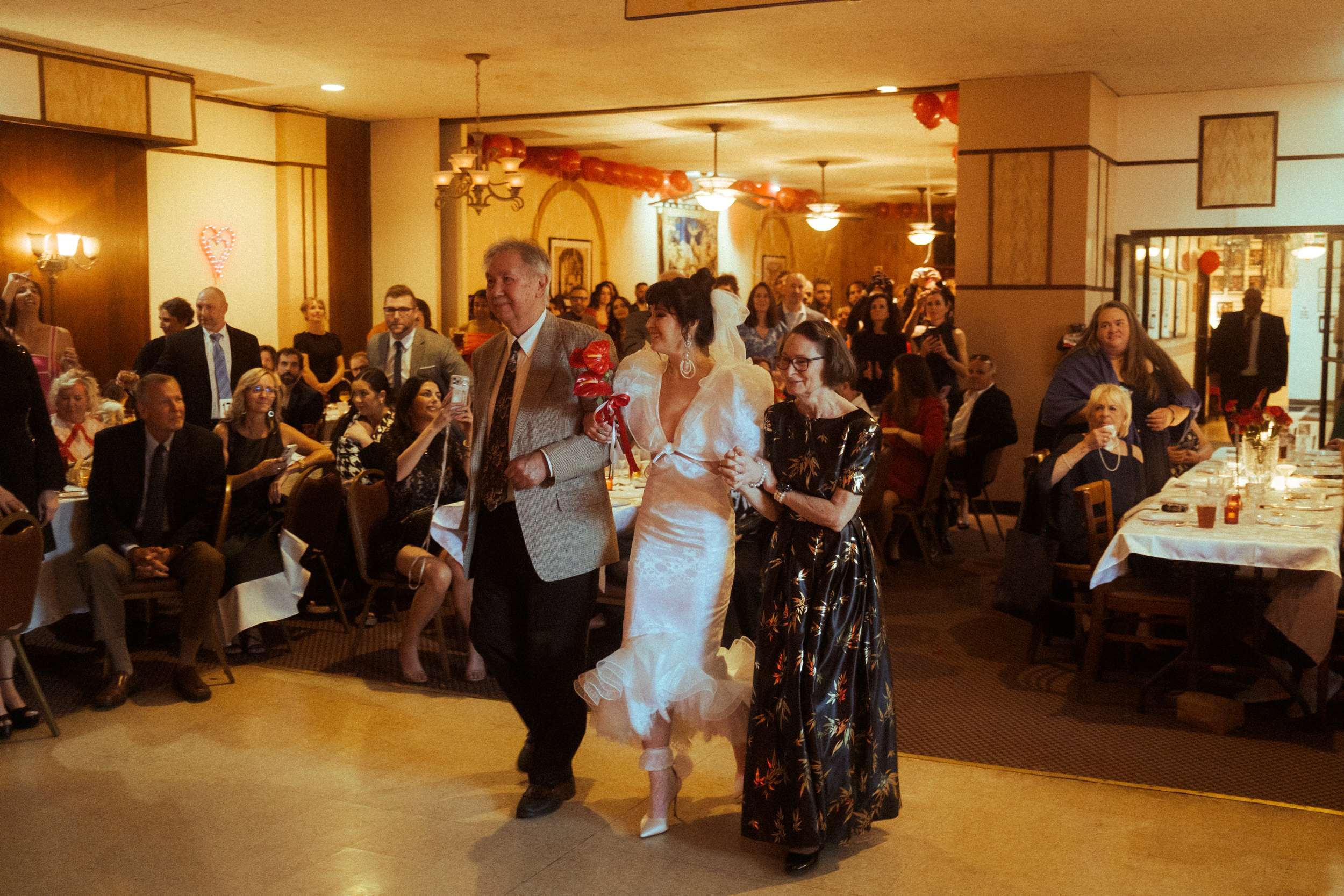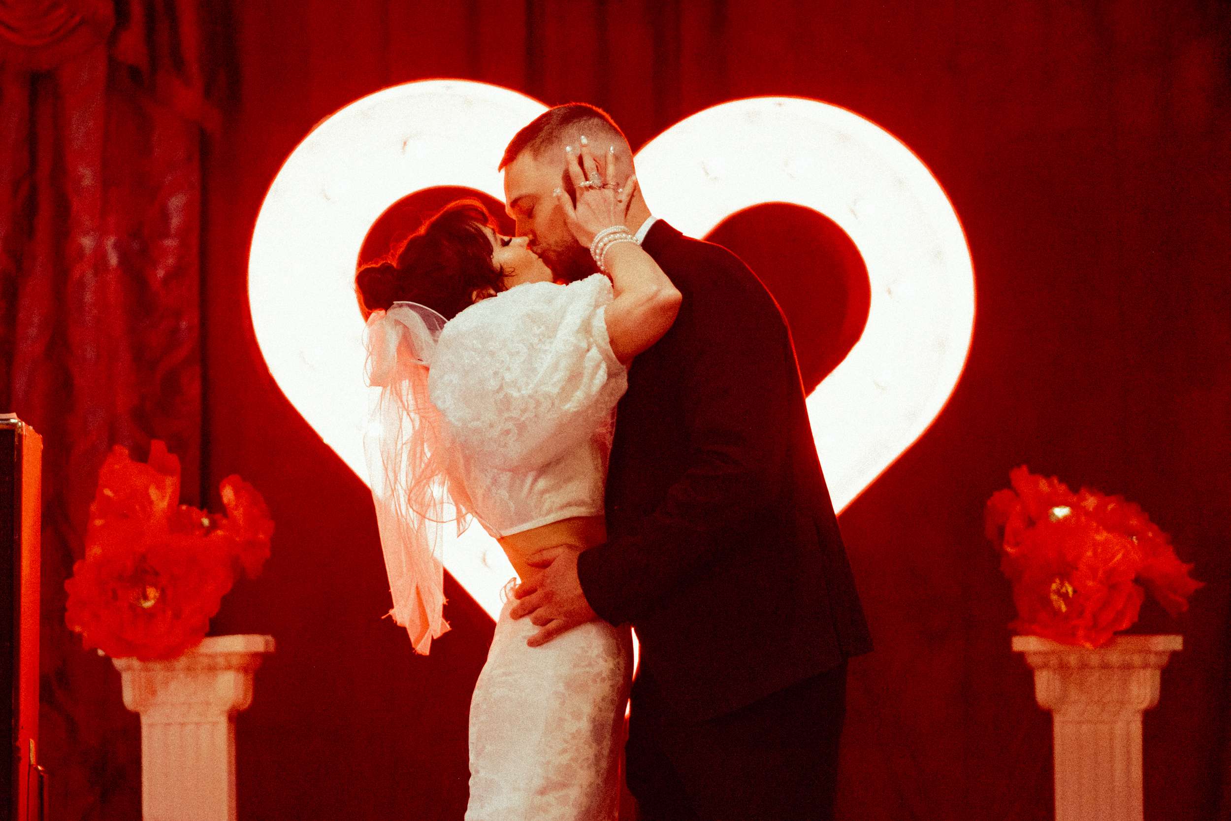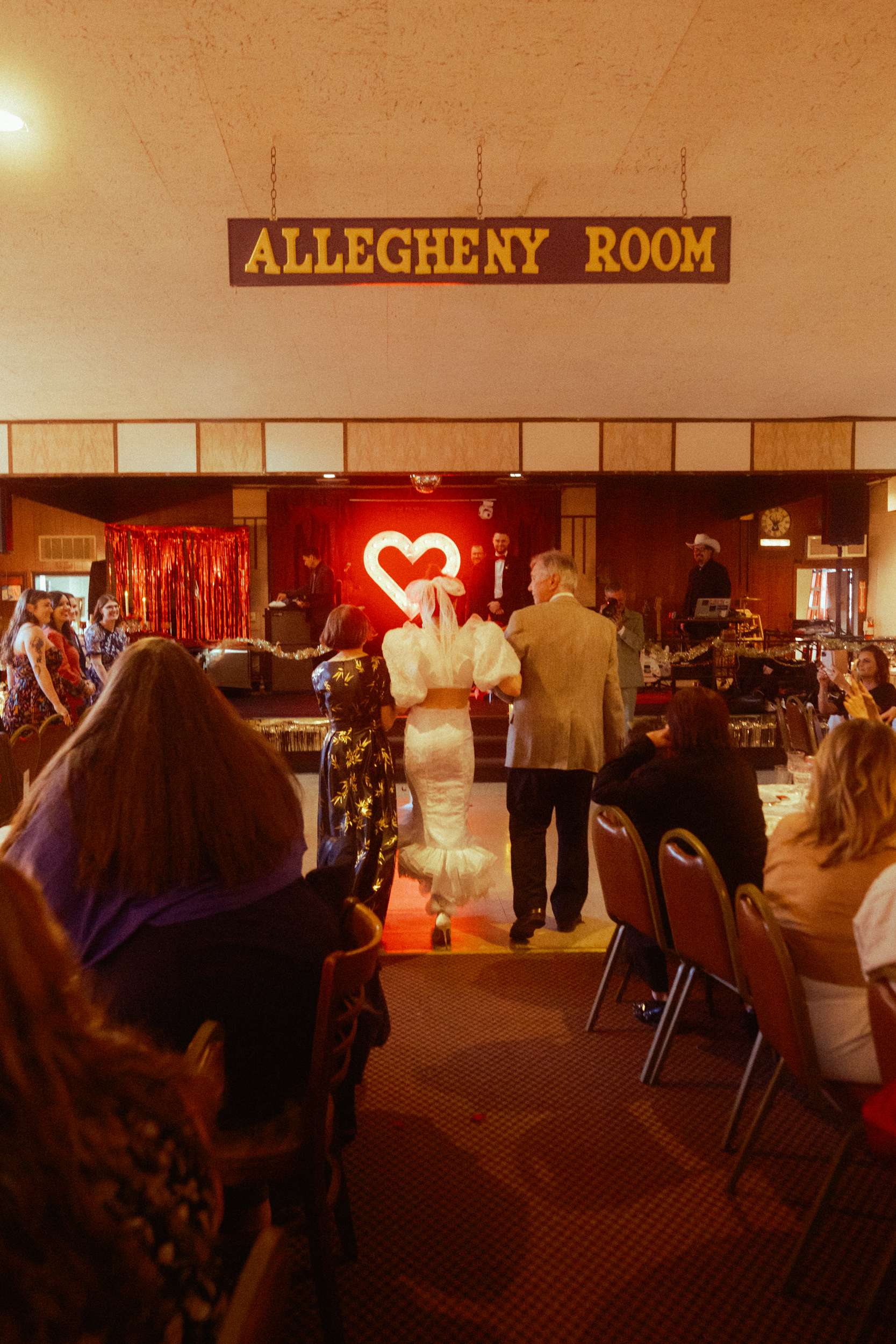 Ari and Bry designed their wedding with their people at the centre and everything else arranged around that. They chose the Allegheny Elks Lodge #339, a working-class Pittsburgh hall, as their location then added all their own décor to make it on-theme. “The theme was classic Pittsburgh hall wedding collides with Vegas kitsch and a hint of the Deer Hunter!” Ari told us. The result was a day that felt retro, in 80s Vegas chapel type way, meets a community party where everyone pitched in.