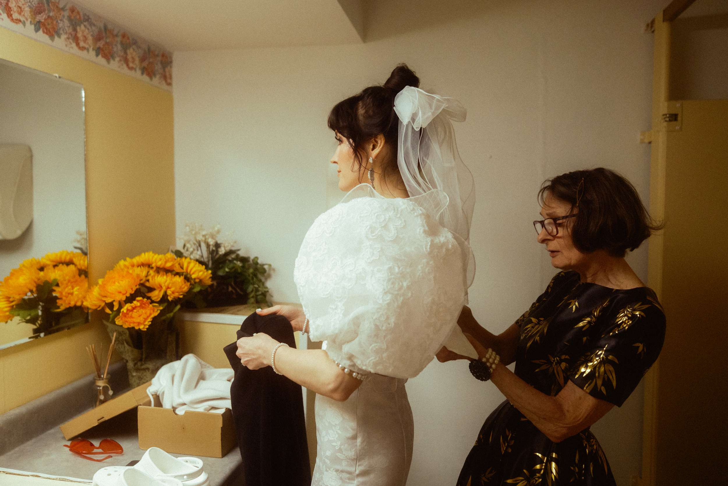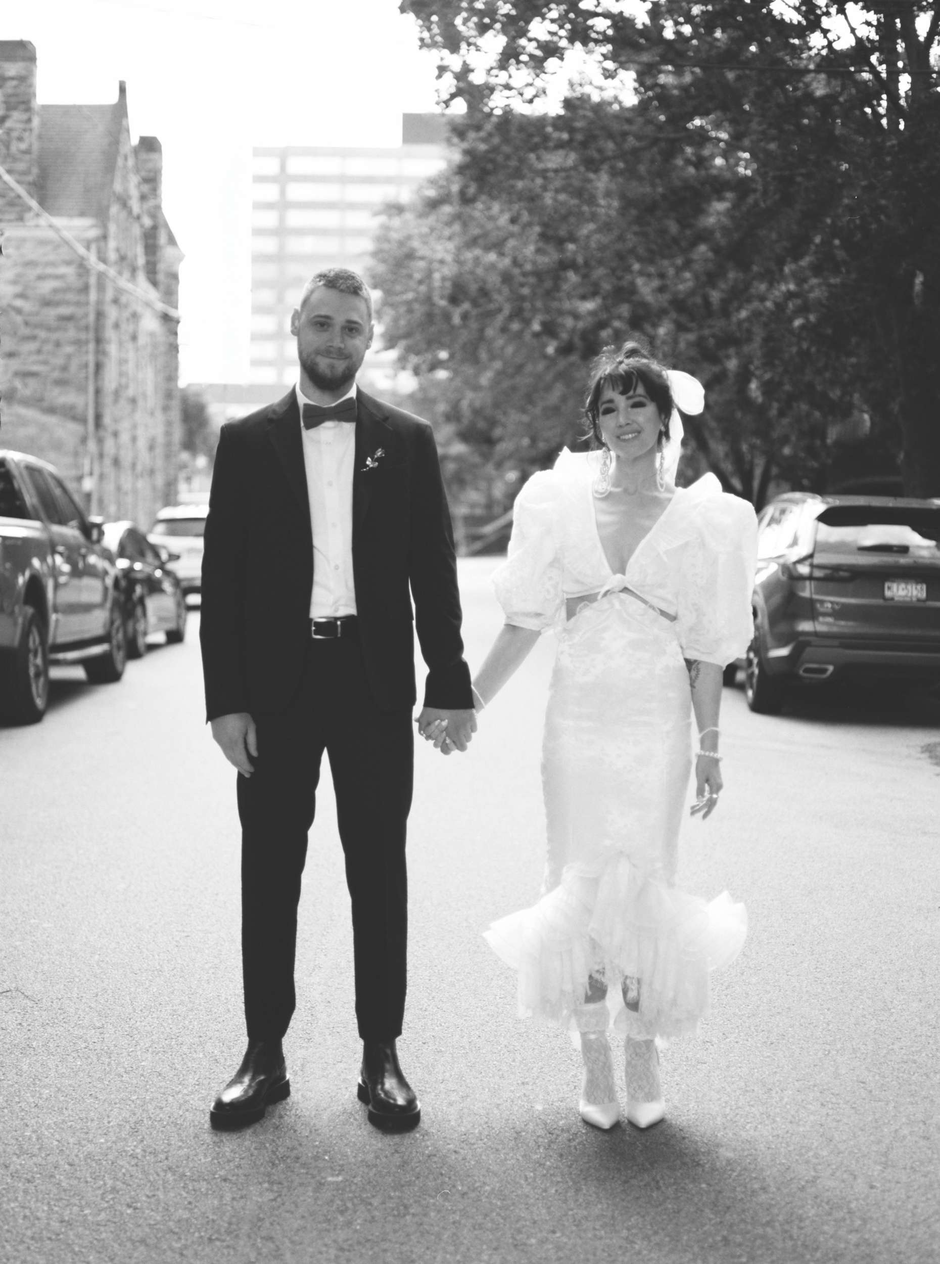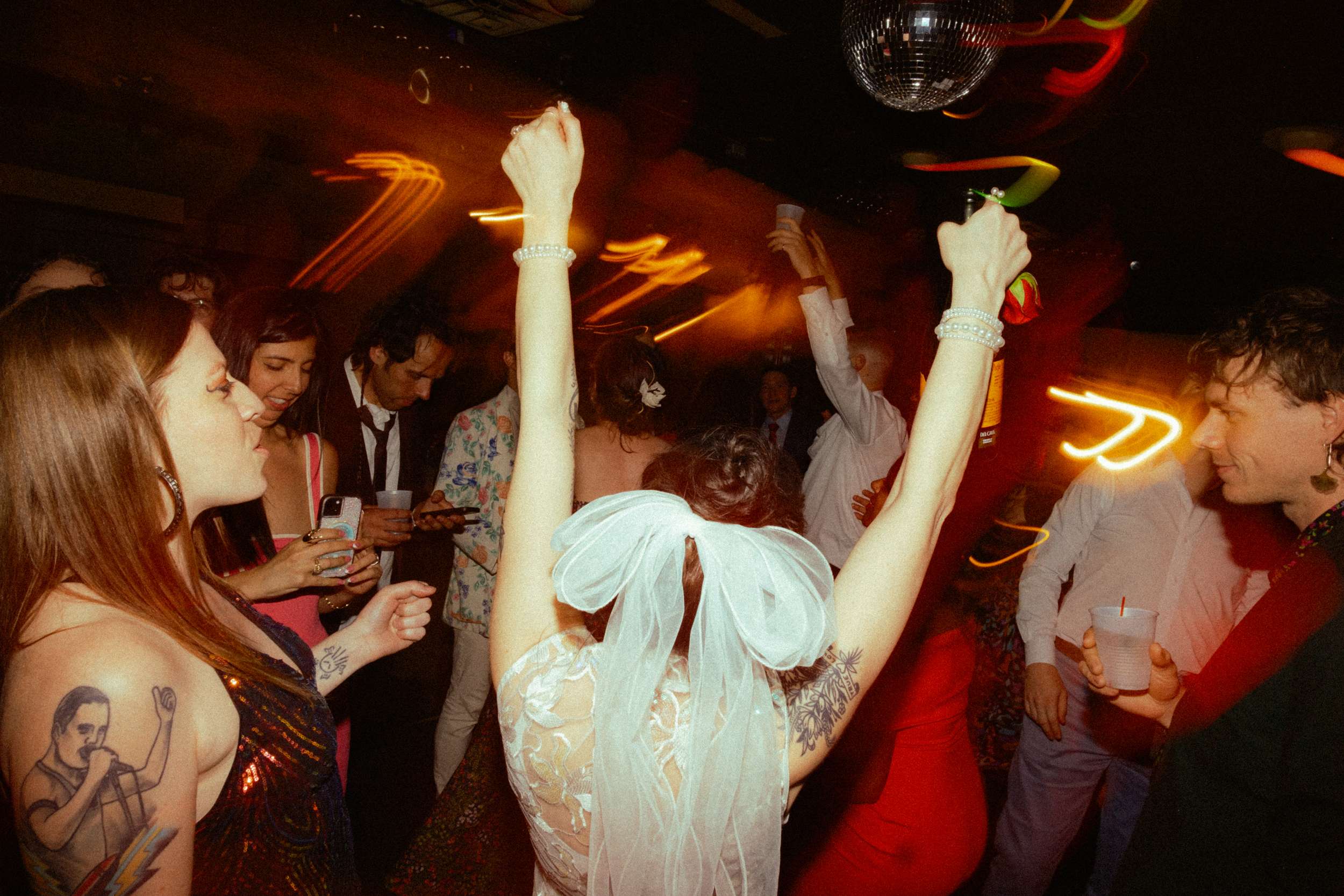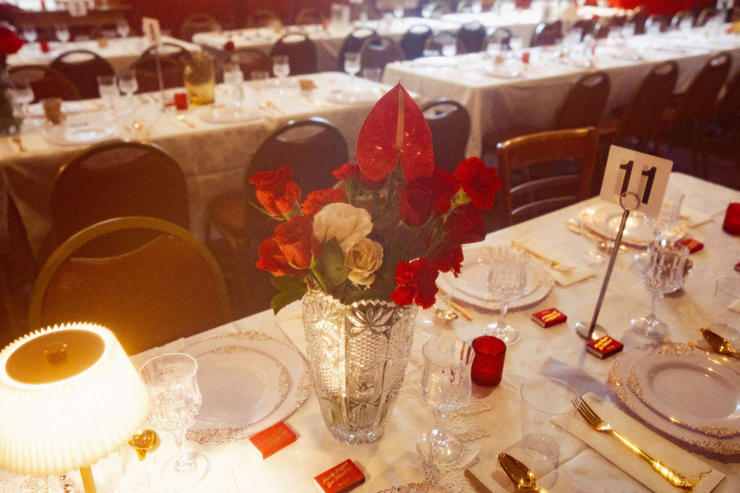 Ari and Bry designed their wedding with their people at the centre and everything else arranged around that. They chose the Allegheny Elks Lodge #339, a working-class Pittsburgh hall, as their location then added all their own décor to make it on-theme. “The theme was classic Pittsburgh hall wedding collides with Vegas kitsch and a hint of the Deer Hunter!” Ari told us. The result was a day that felt retro, in 80s Vegas chapel type way, meets a community party where everyone pitched in.