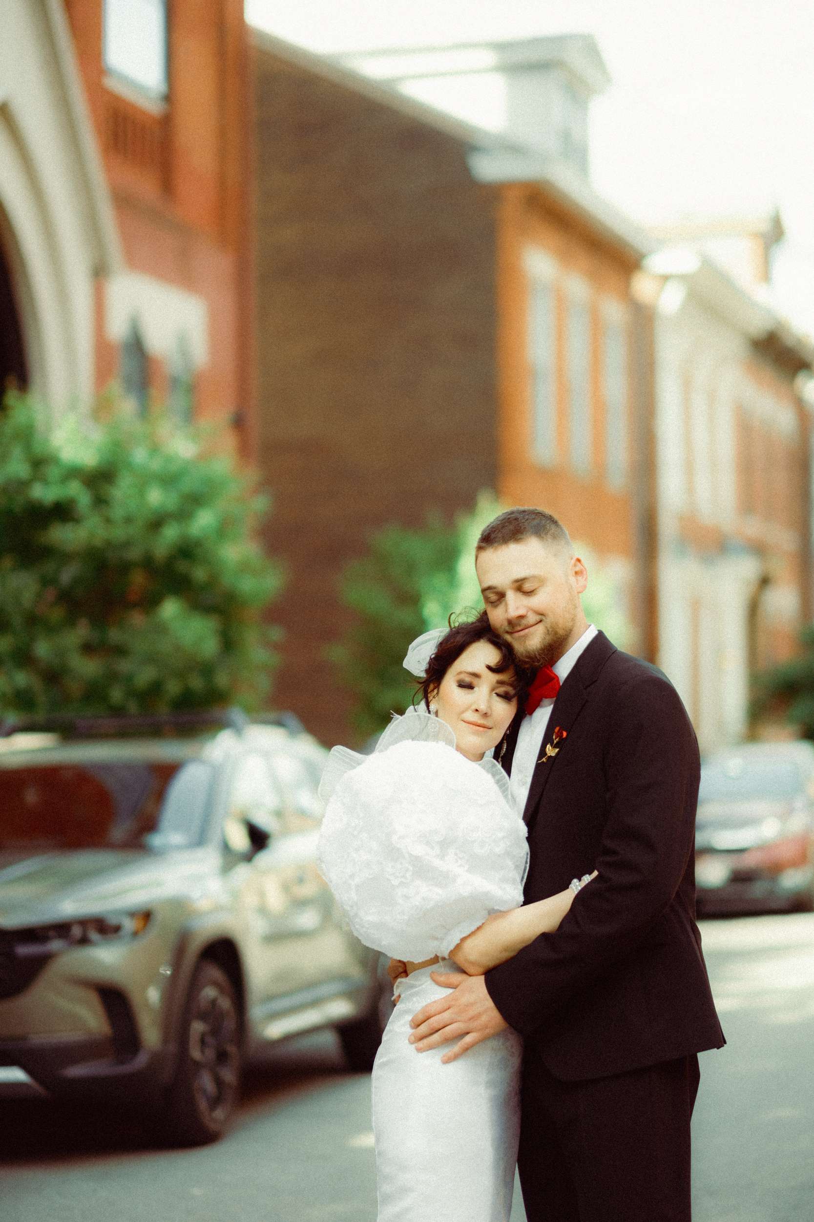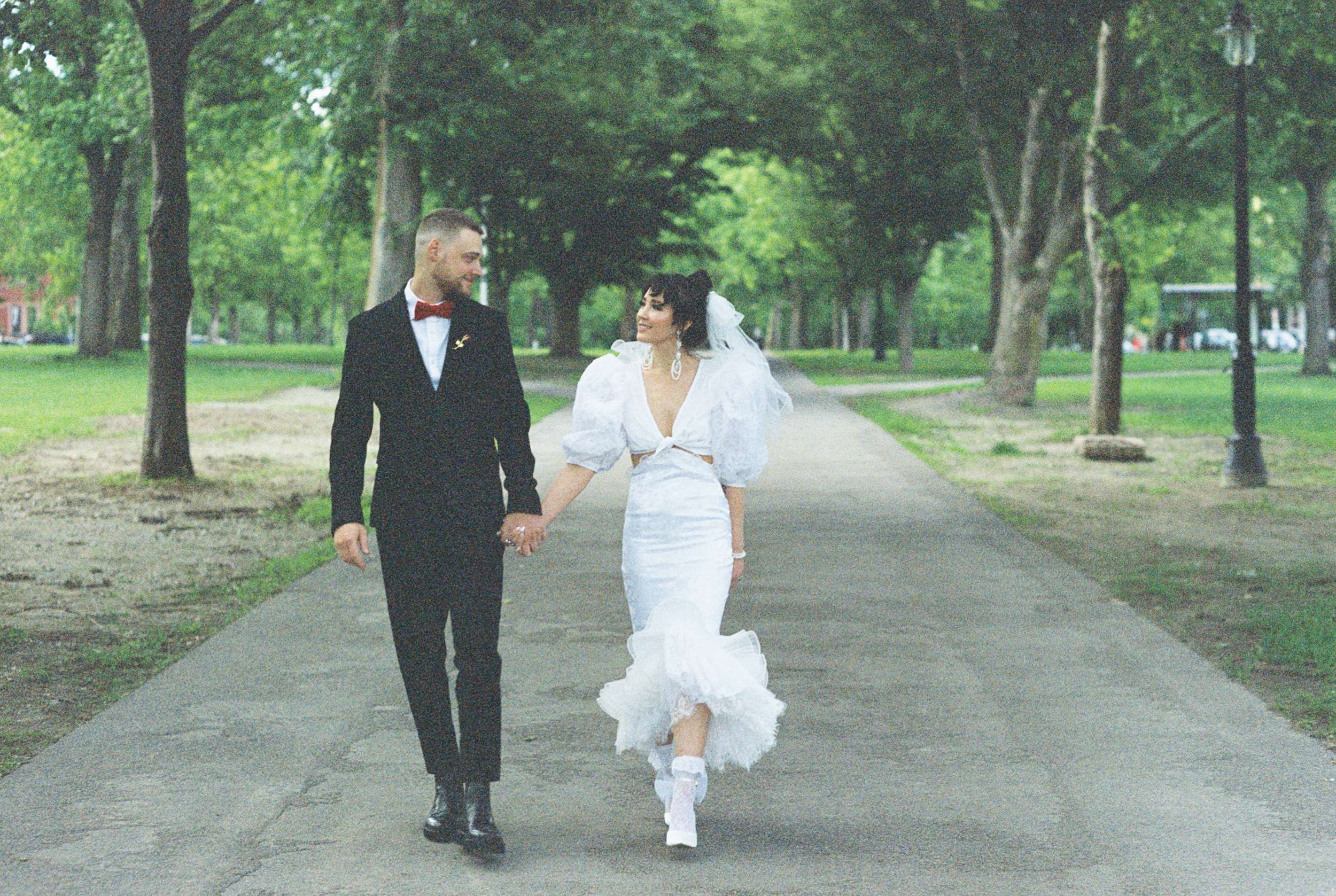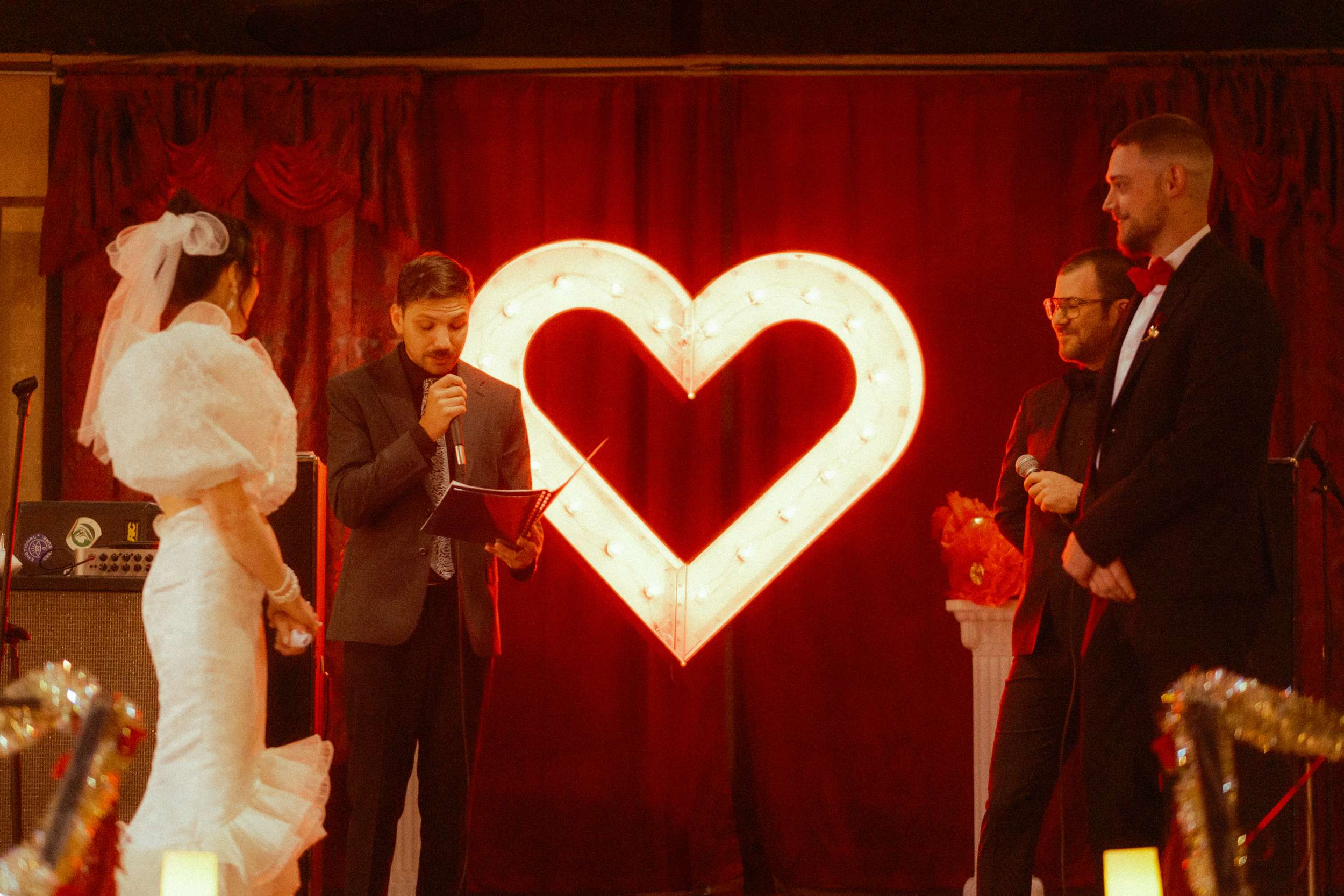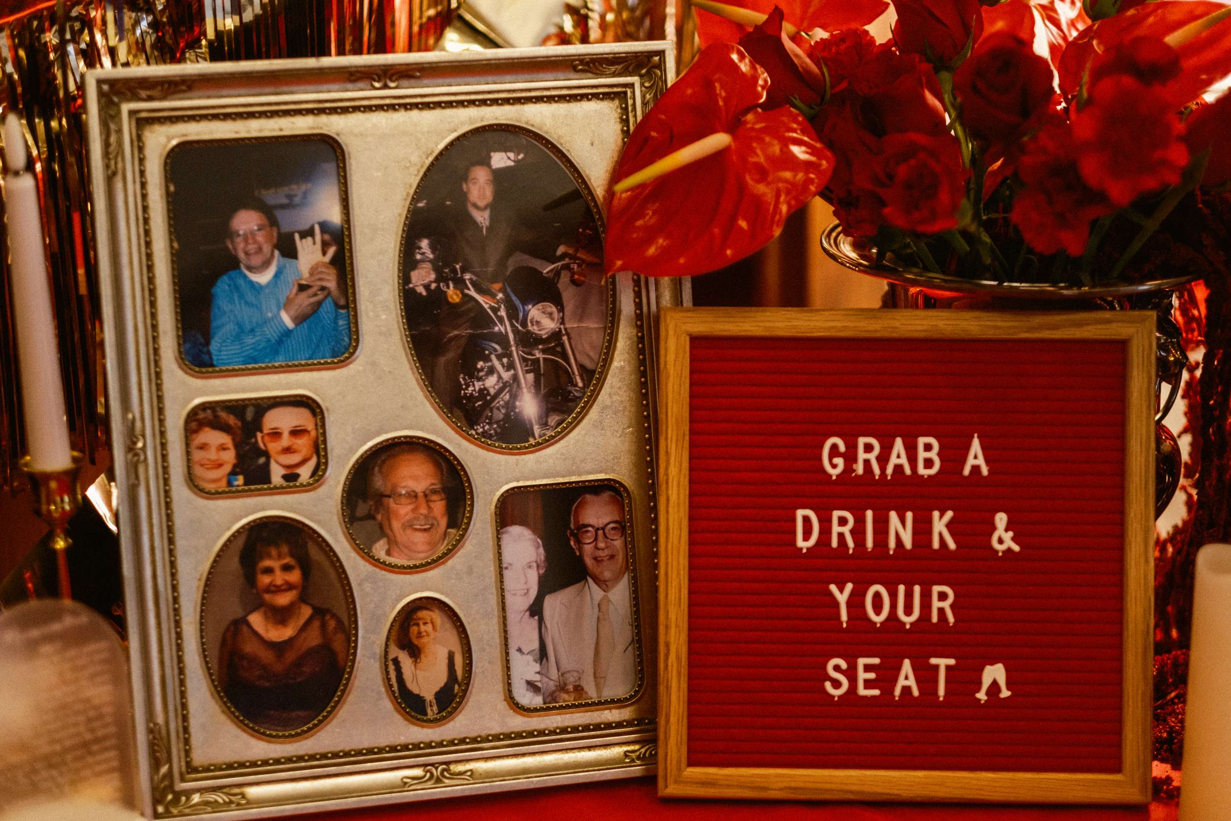 Ari and Bry designed their wedding with their people at the centre and everything else arranged around that. They chose the Allegheny Elks Lodge #339, a working-class Pittsburgh hall, as their location then added all their own décor to make it on-theme. “The theme was classic Pittsburgh hall wedding collides with Vegas kitsch and a hint of the Deer Hunter!” Ari told us. The result was a day that felt retro, in 80s Vegas chapel type way, meets a community party where everyone pitched in.