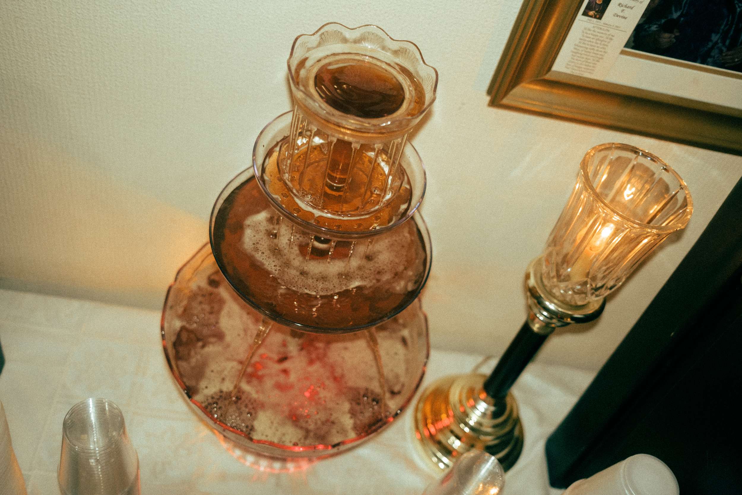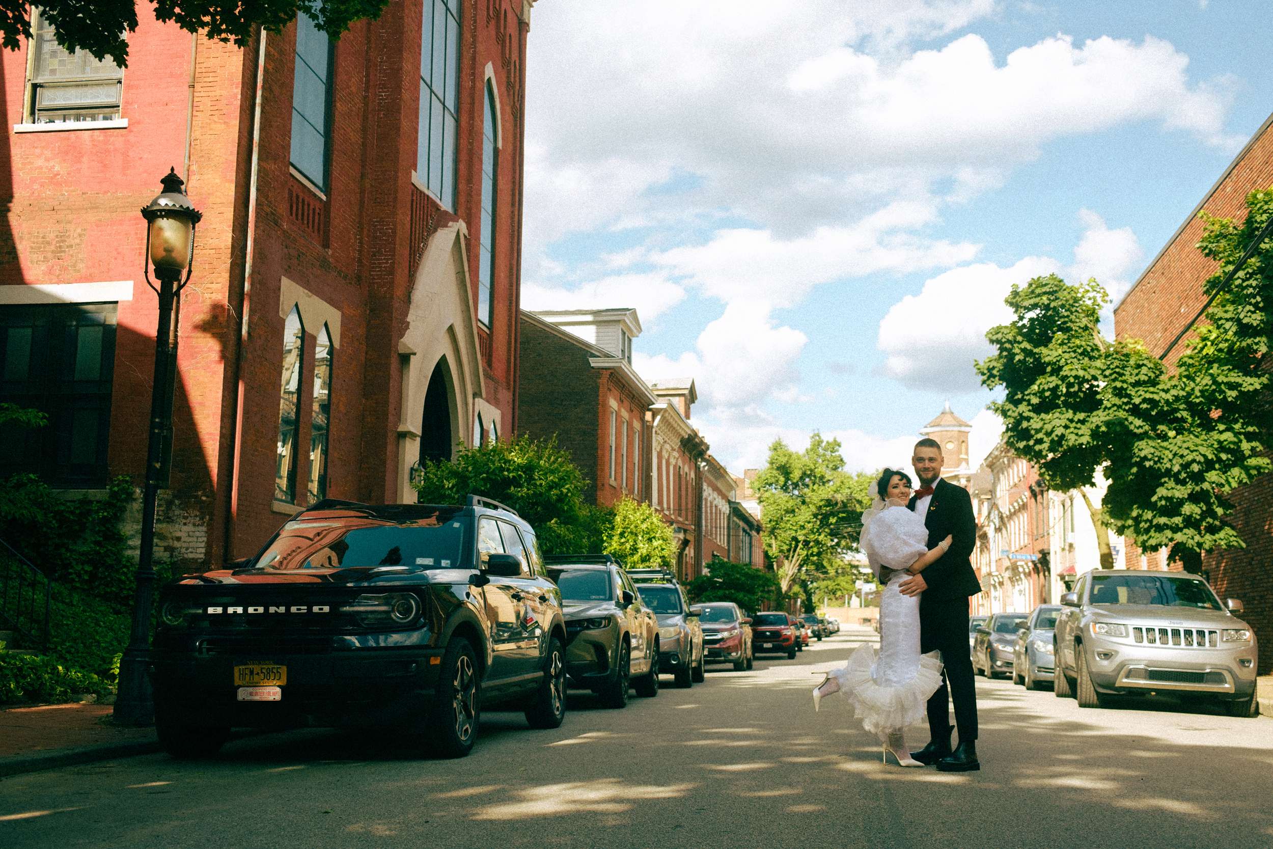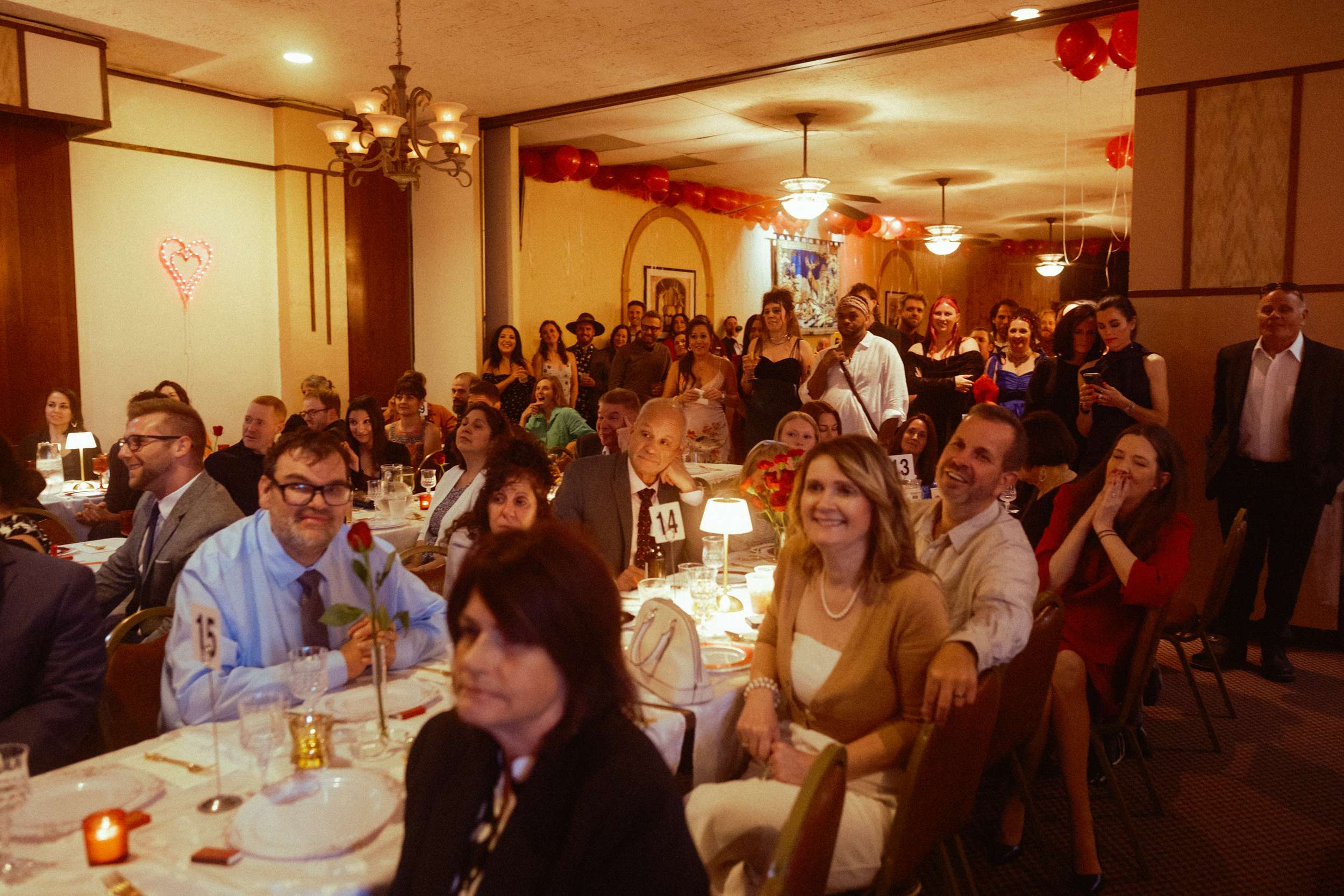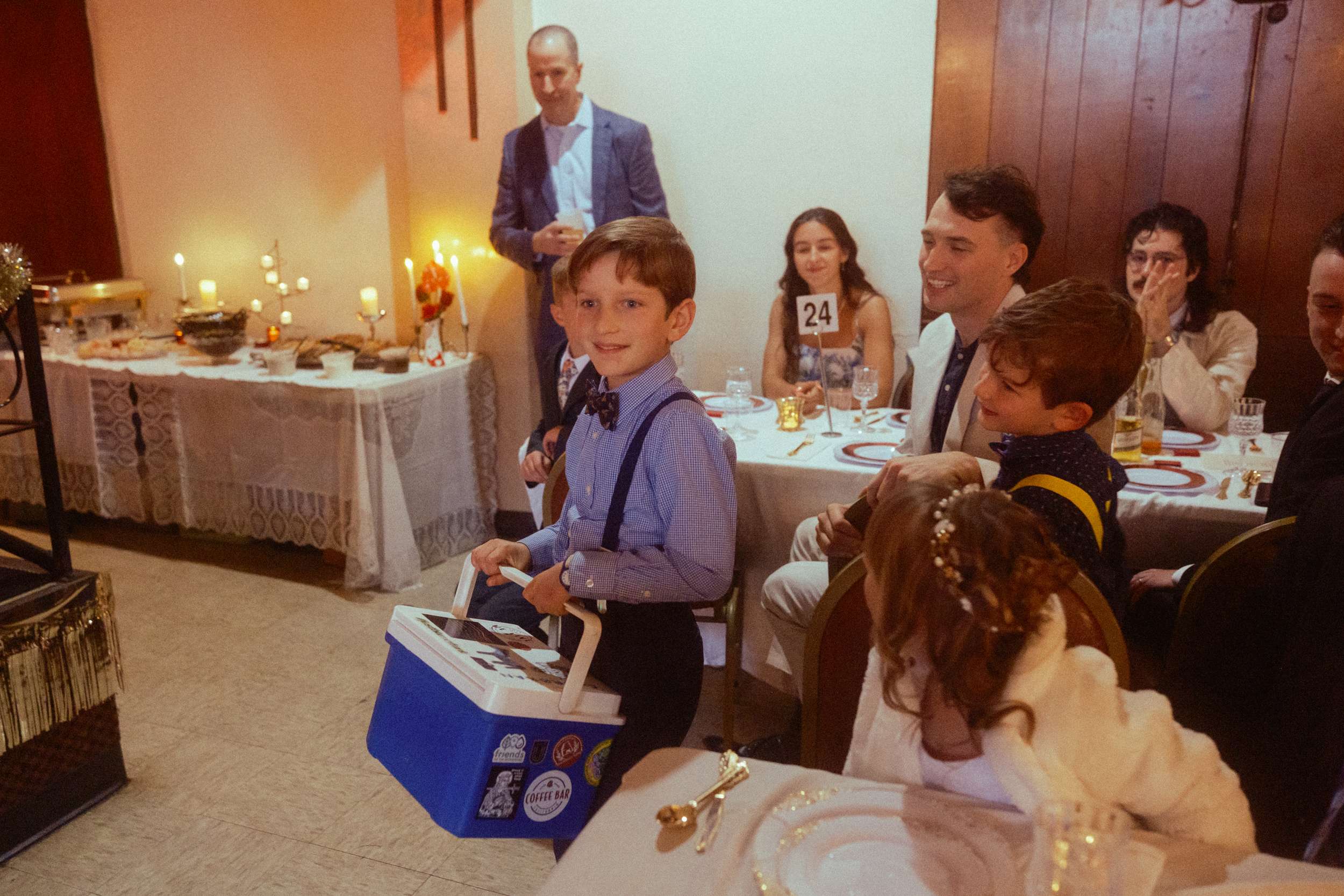 Ari and Bry designed their wedding with their people at the centre and everything else arranged around that. They chose the Allegheny Elks Lodge #339, a working-class Pittsburgh hall, as their location then added all their own décor to make it on-theme. “The theme was classic Pittsburgh hall wedding collides with Vegas kitsch and a hint of the Deer Hunter!” Ari told us. The result was a day that felt retro, in 80s Vegas chapel type way, meets a community party where everyone pitched in.