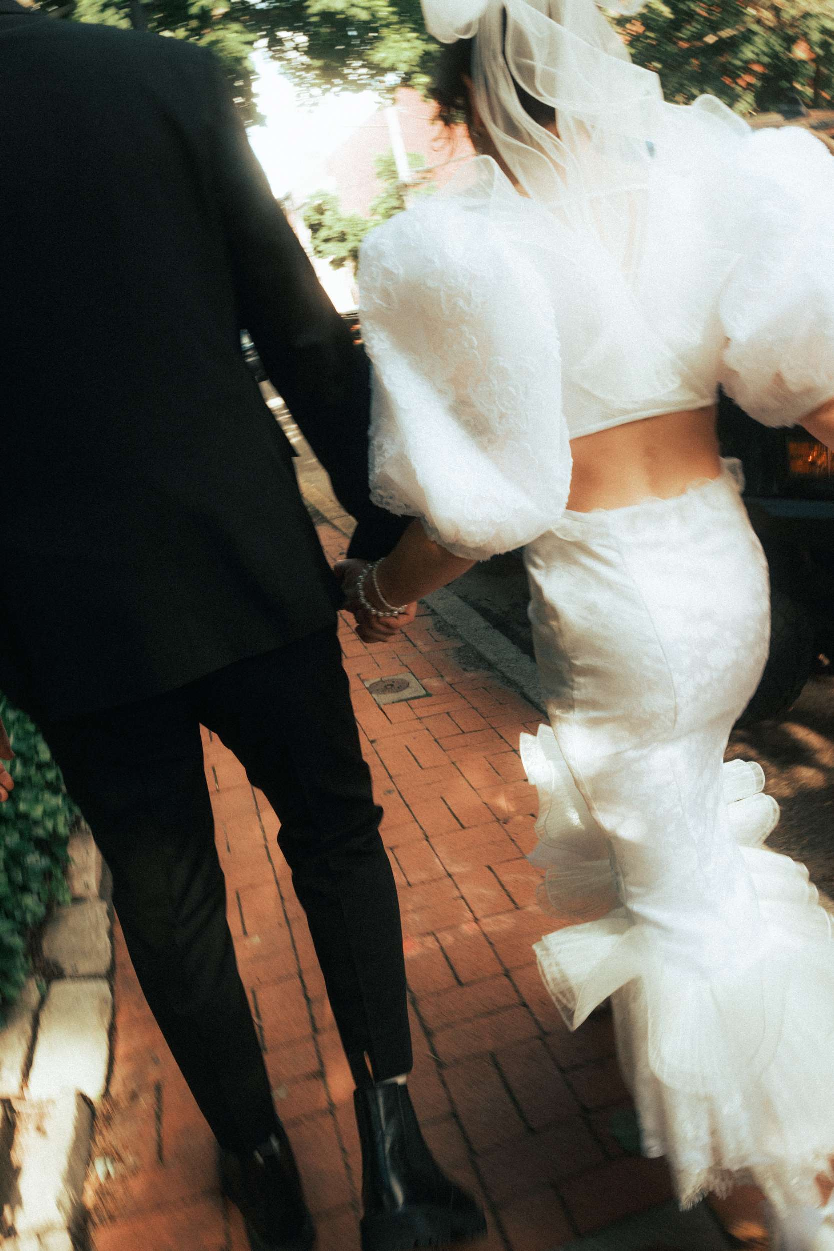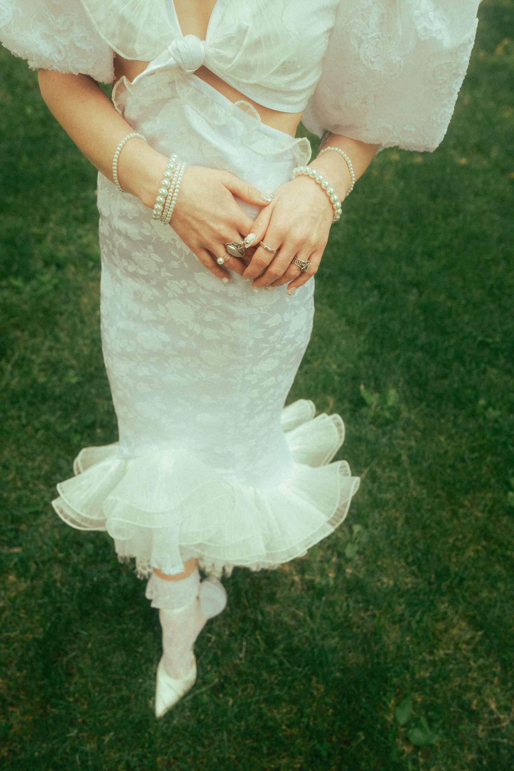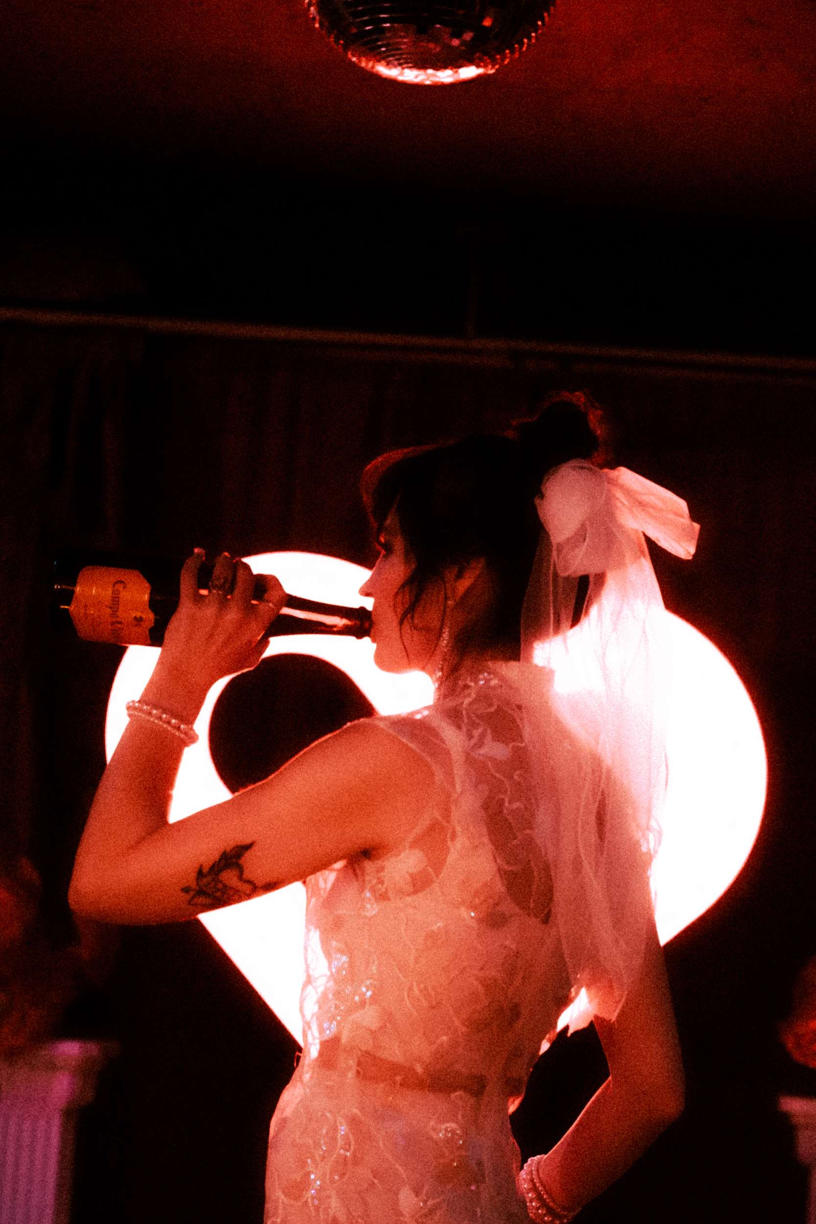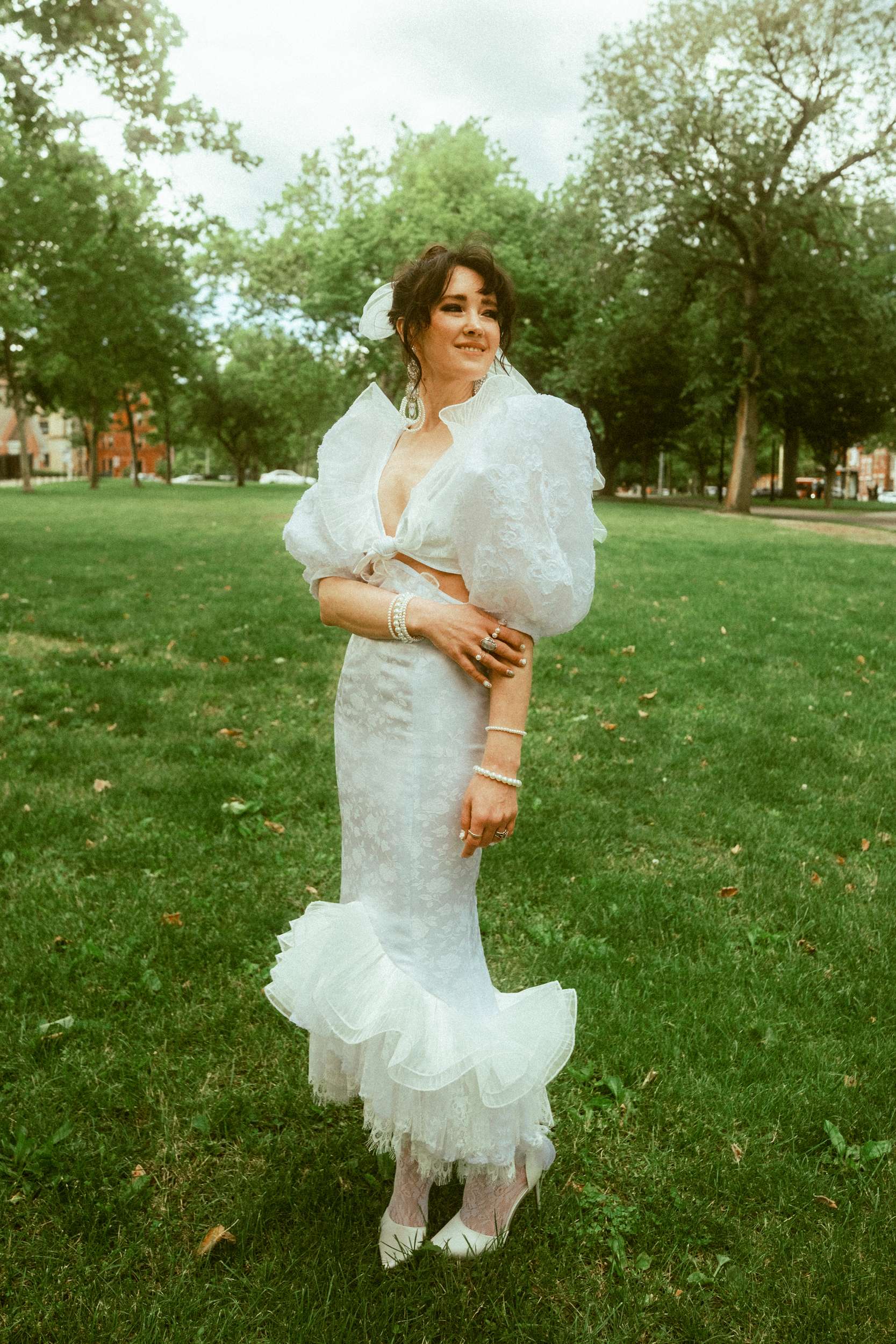 Ari started by designing her own dress, working Pale Blue Thread to bring it to life. Later she switched into a second look for the reception. Their décor was all Ari’s vision too, and made and set up with the help of their friends and family. Almost every element came from within their friend group – hair, make-up, cake, flowers, décor, stationery.