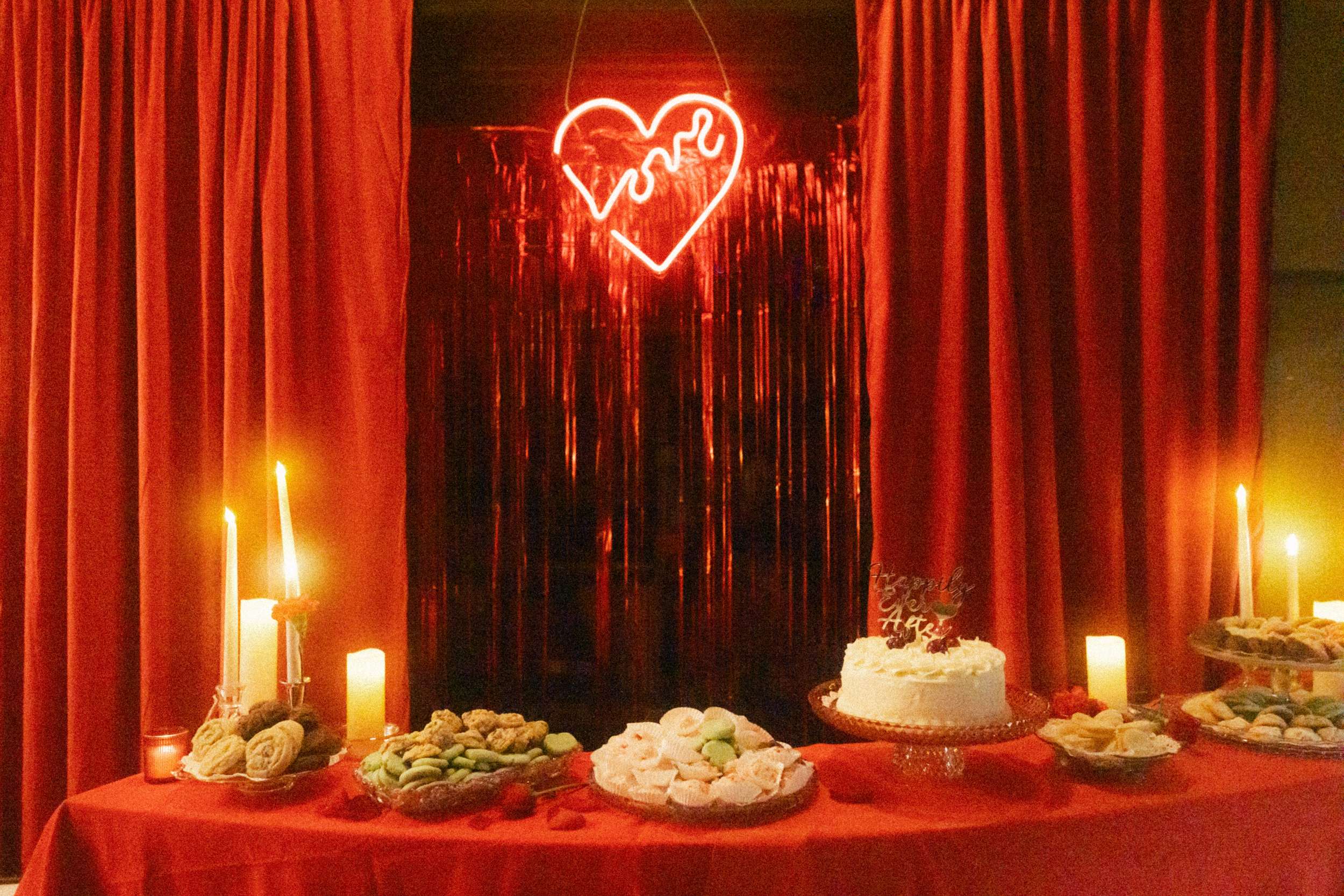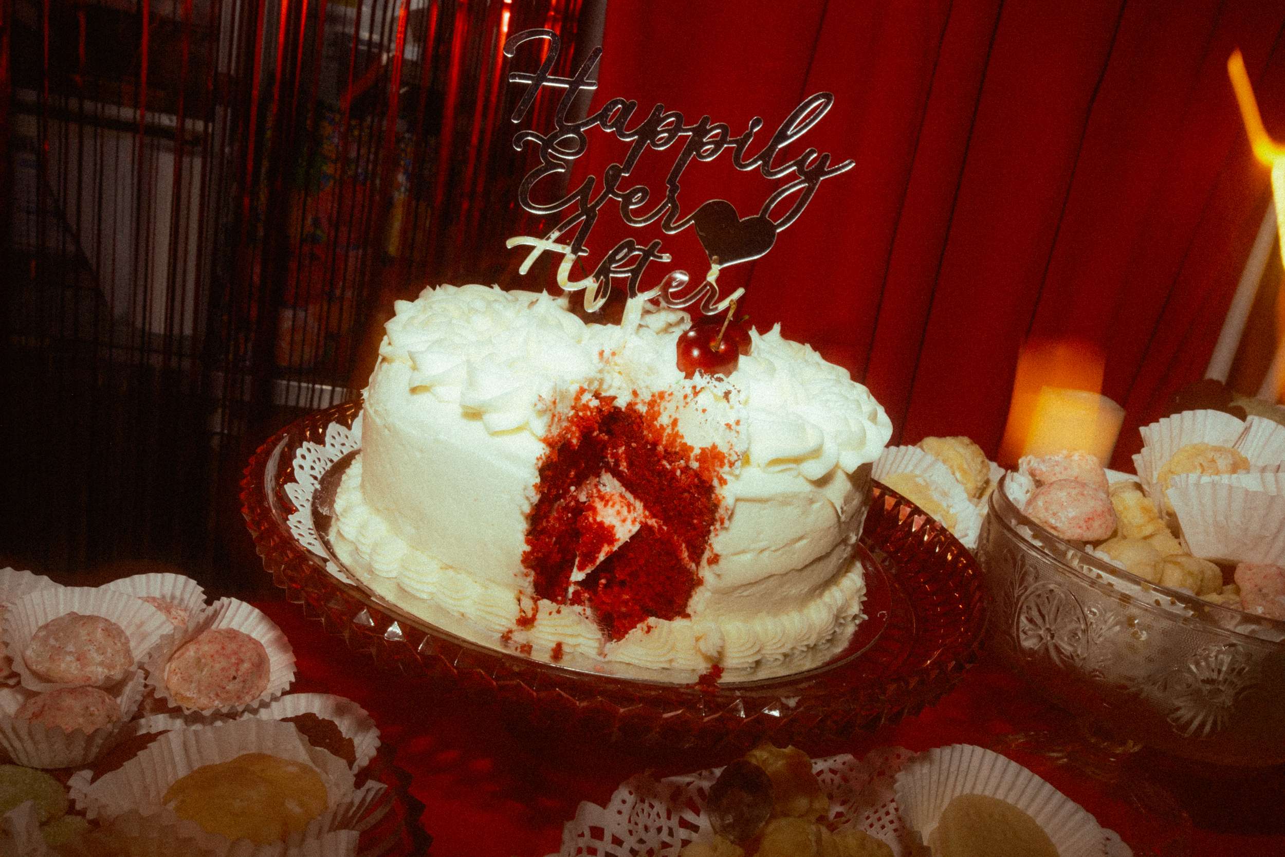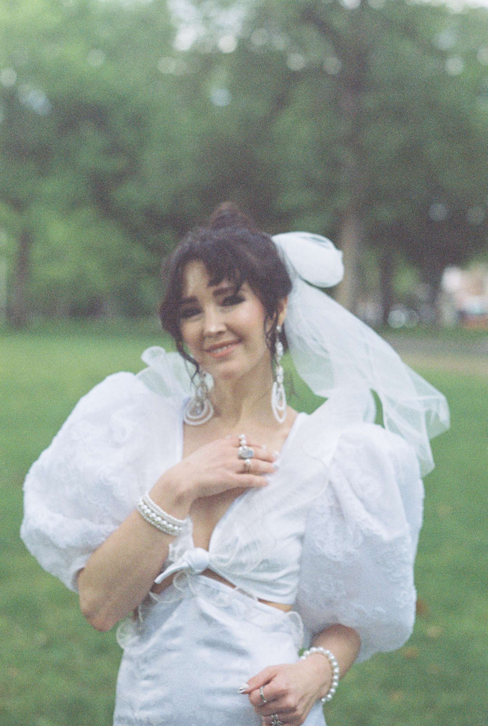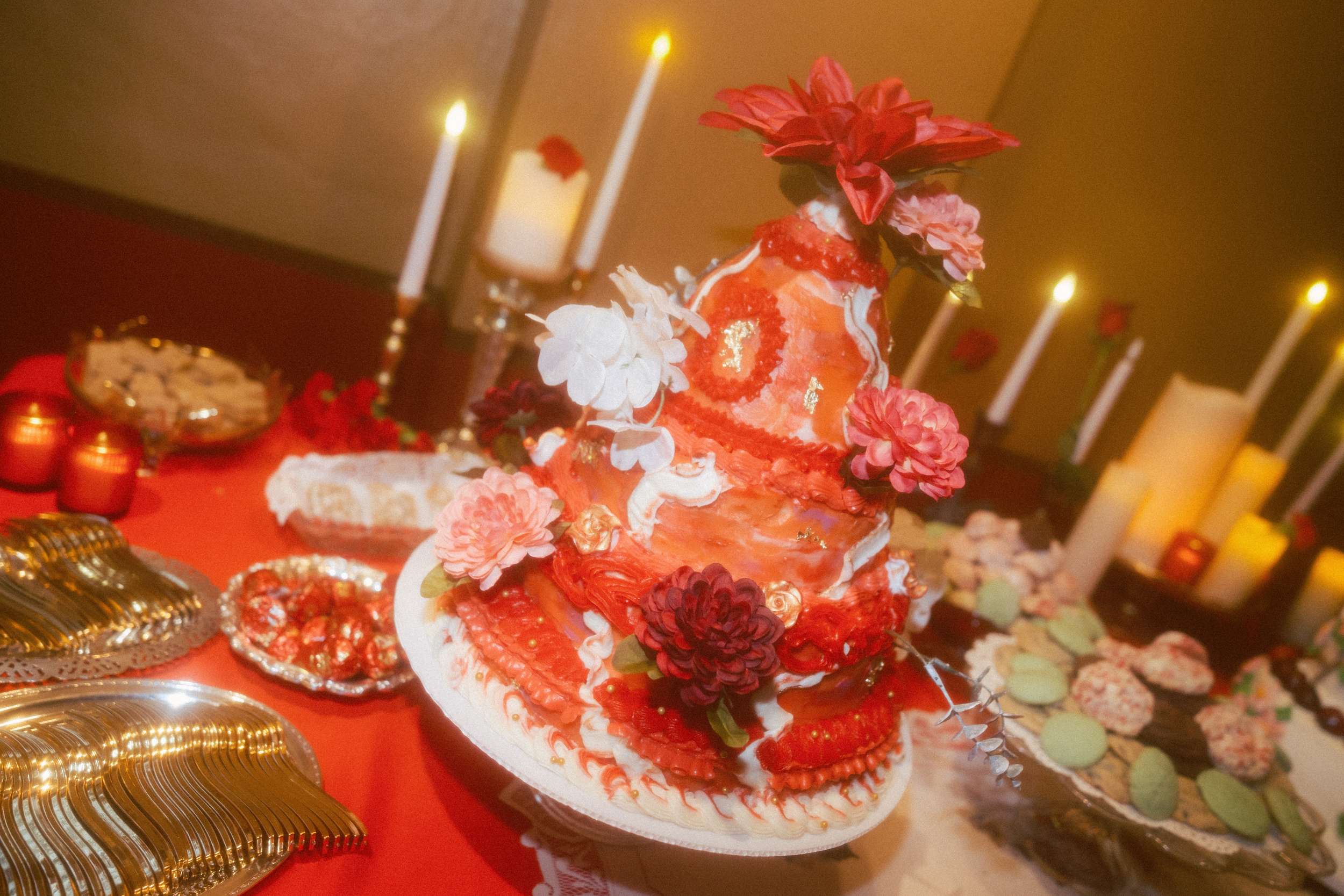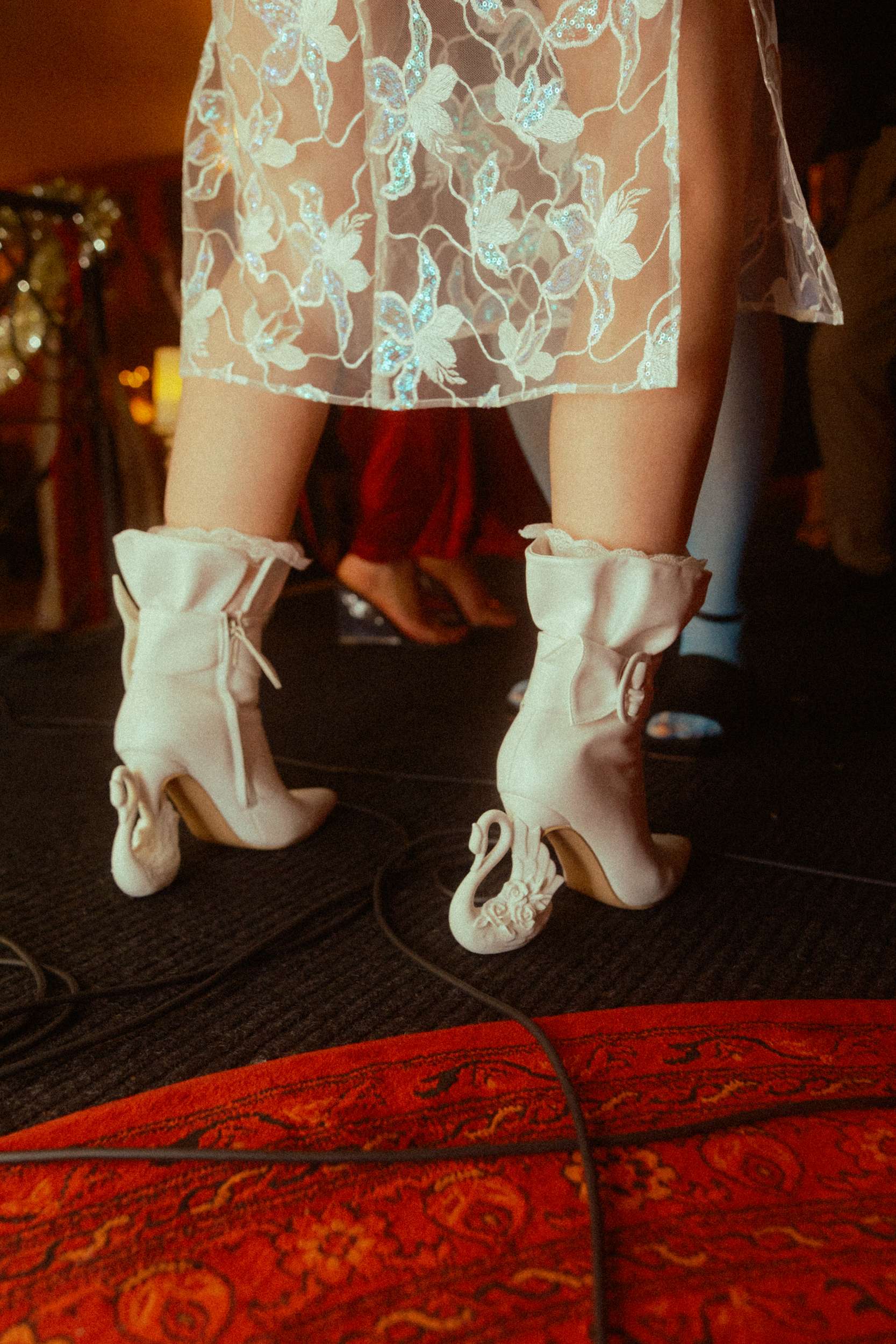 Ari started by designing her own dress, working Pale Blue Thread to bring it to life. Later she switched into a second look for the reception. Their décor was all Ari’s vision too, and made and set up with the help of their friends and family. Almost every element came from within their friend group – hair, make-up, cake, flowers, décor, stationery.