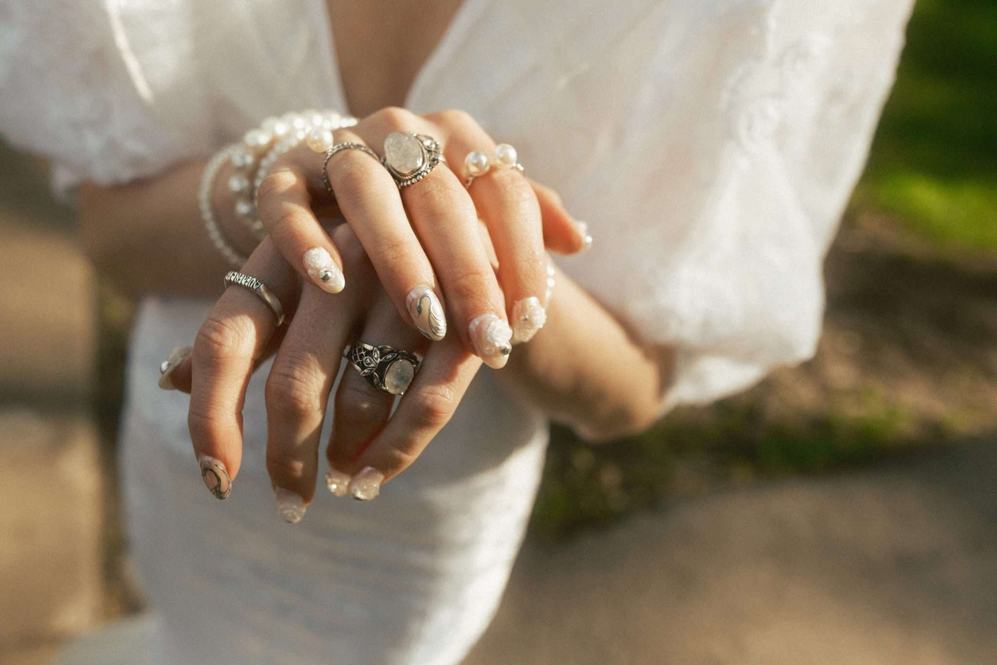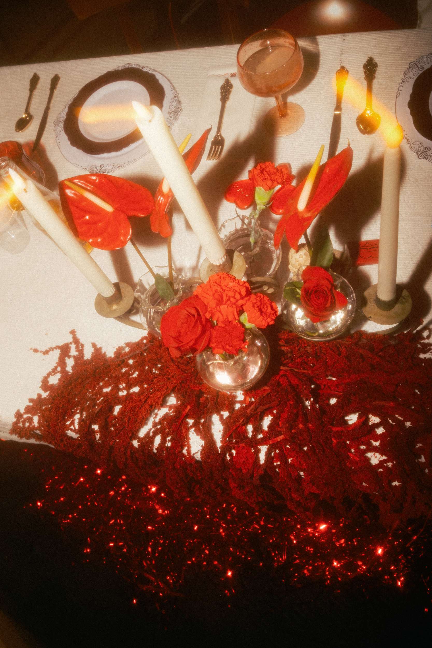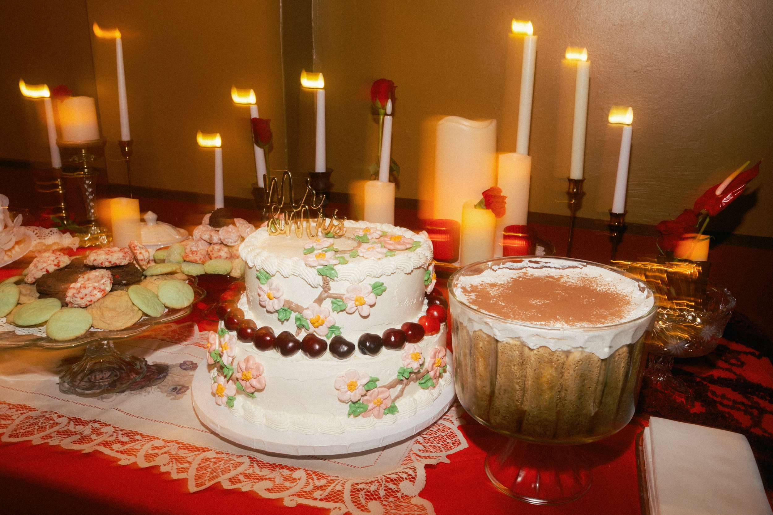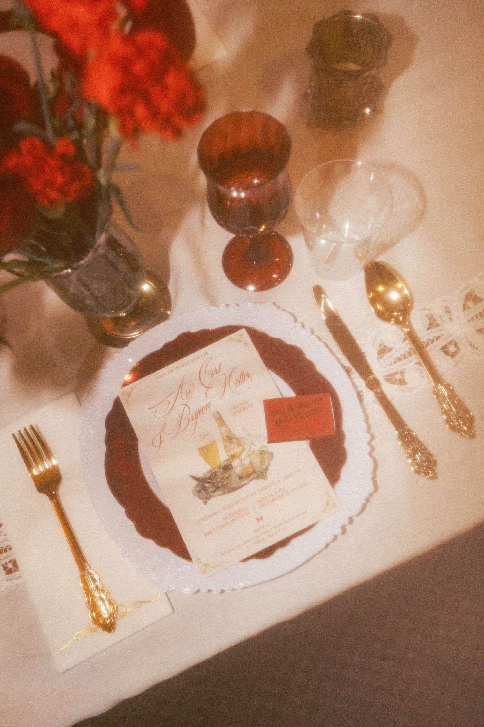 Ari started by designing her own dress, working Pale Blue Thread to bring it to life. Later she switched into a second look for the reception. Their décor was all Ari’s vision too, and made and set up with the help of their friends and family. Almost every element came from within their friend group – hair, make-up, cake, flowers, décor, stationery.
