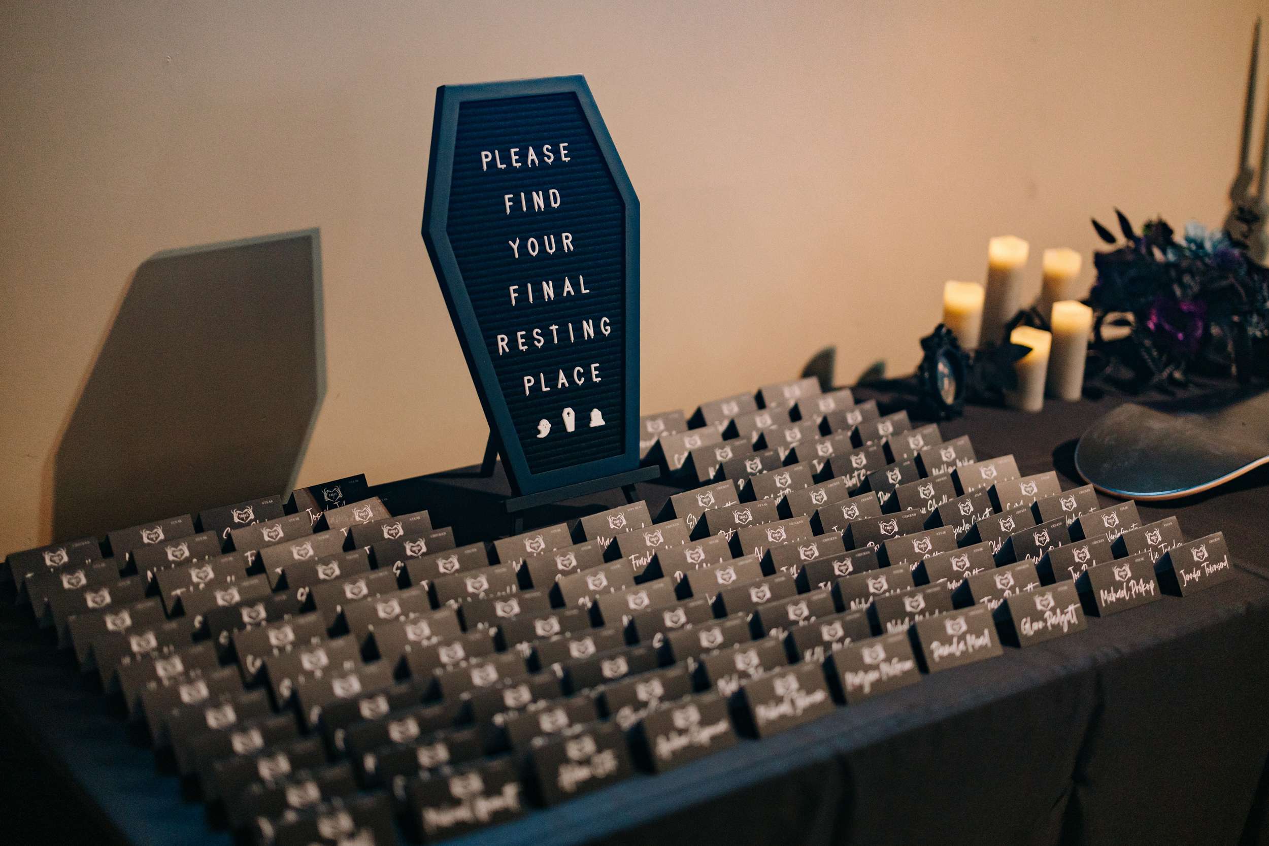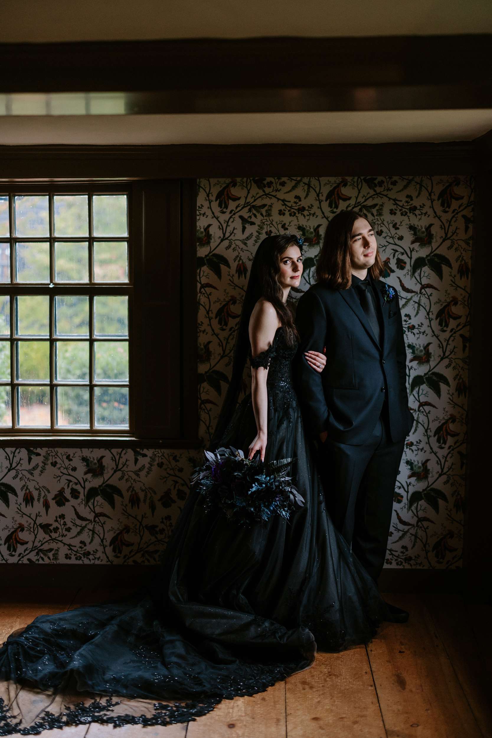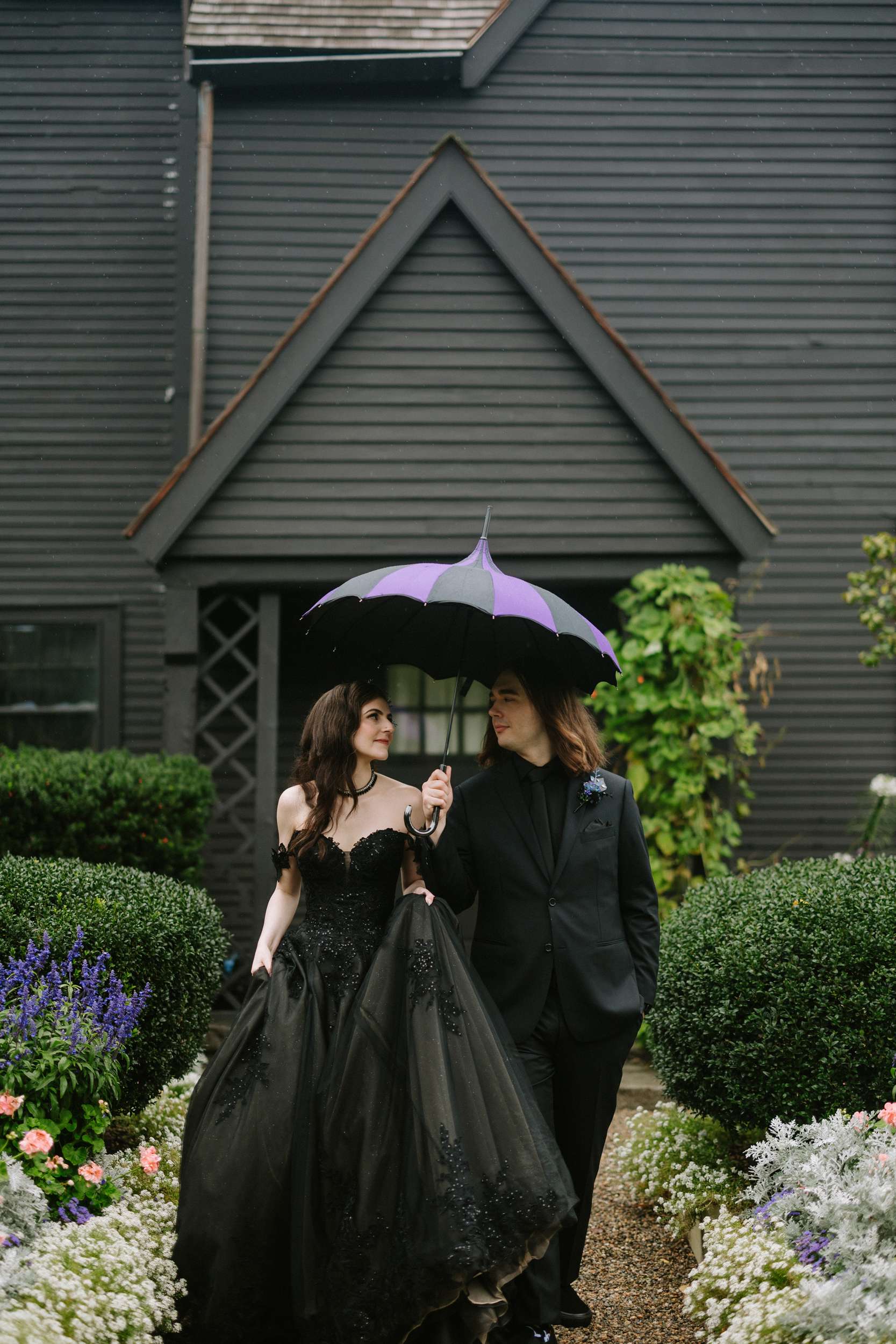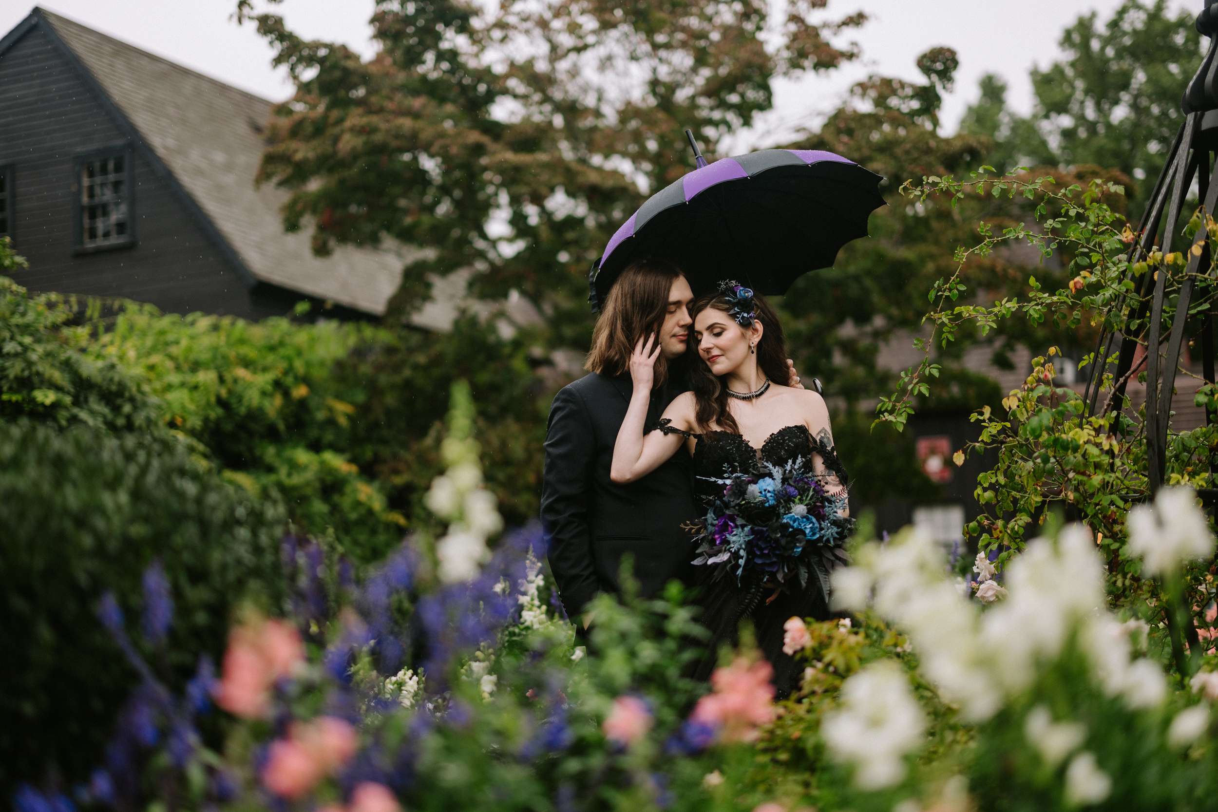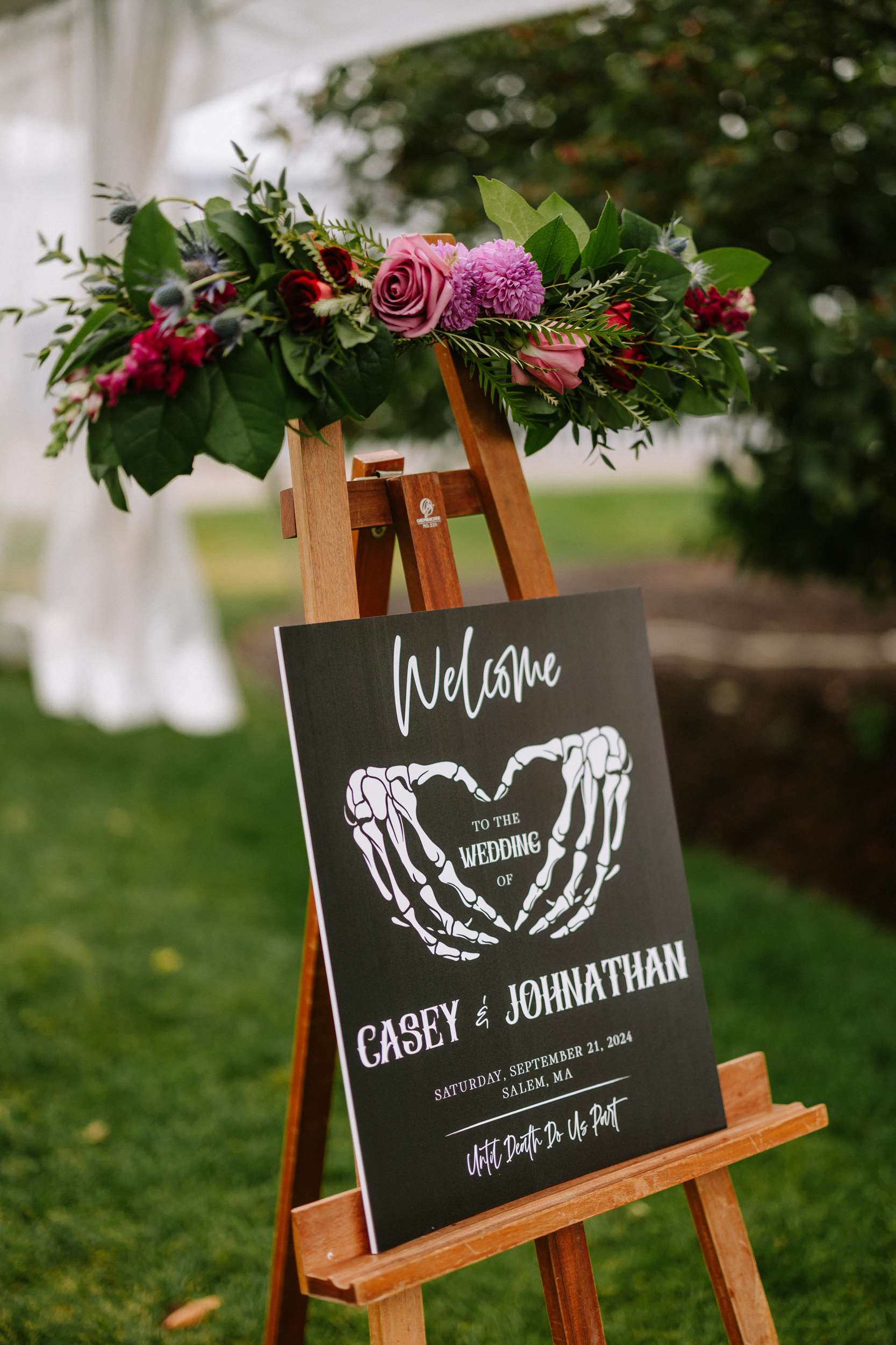 “Our wedding theme was a mixture of moody, eerie, spooky, and dark romance with an alternative music twist”, Casey said. “Being in Salem with The House of the Seven Gables as the ceremony backdrop really helped us lean into our theme. We chose to have our reception at Colonial Hall. It was a costume party because we wanted an element of silliness and lightness that our day to balance everything out. We never take ourselves too seriously and we didn’t want our big day to feel ‘serious’ in that sense either.”