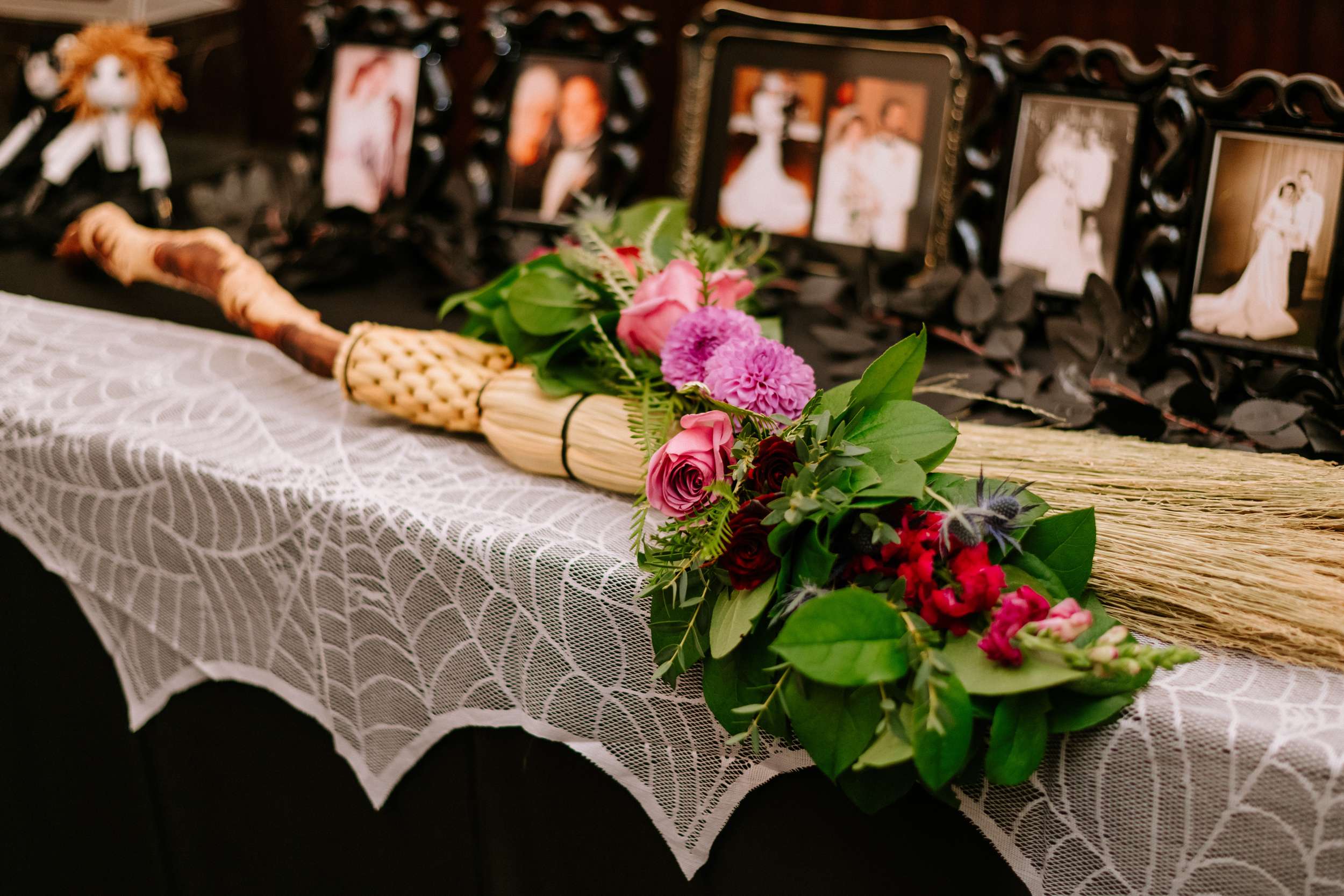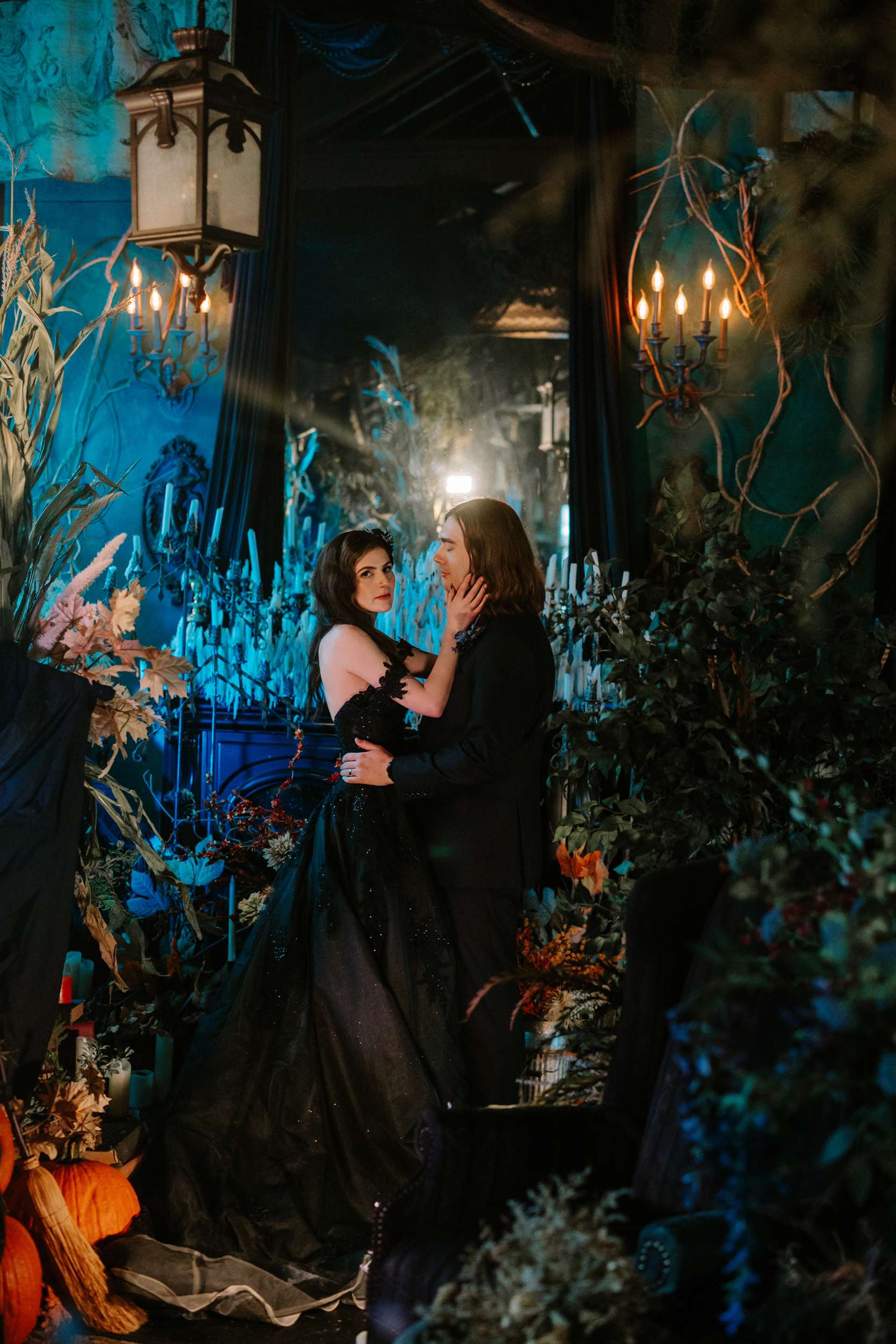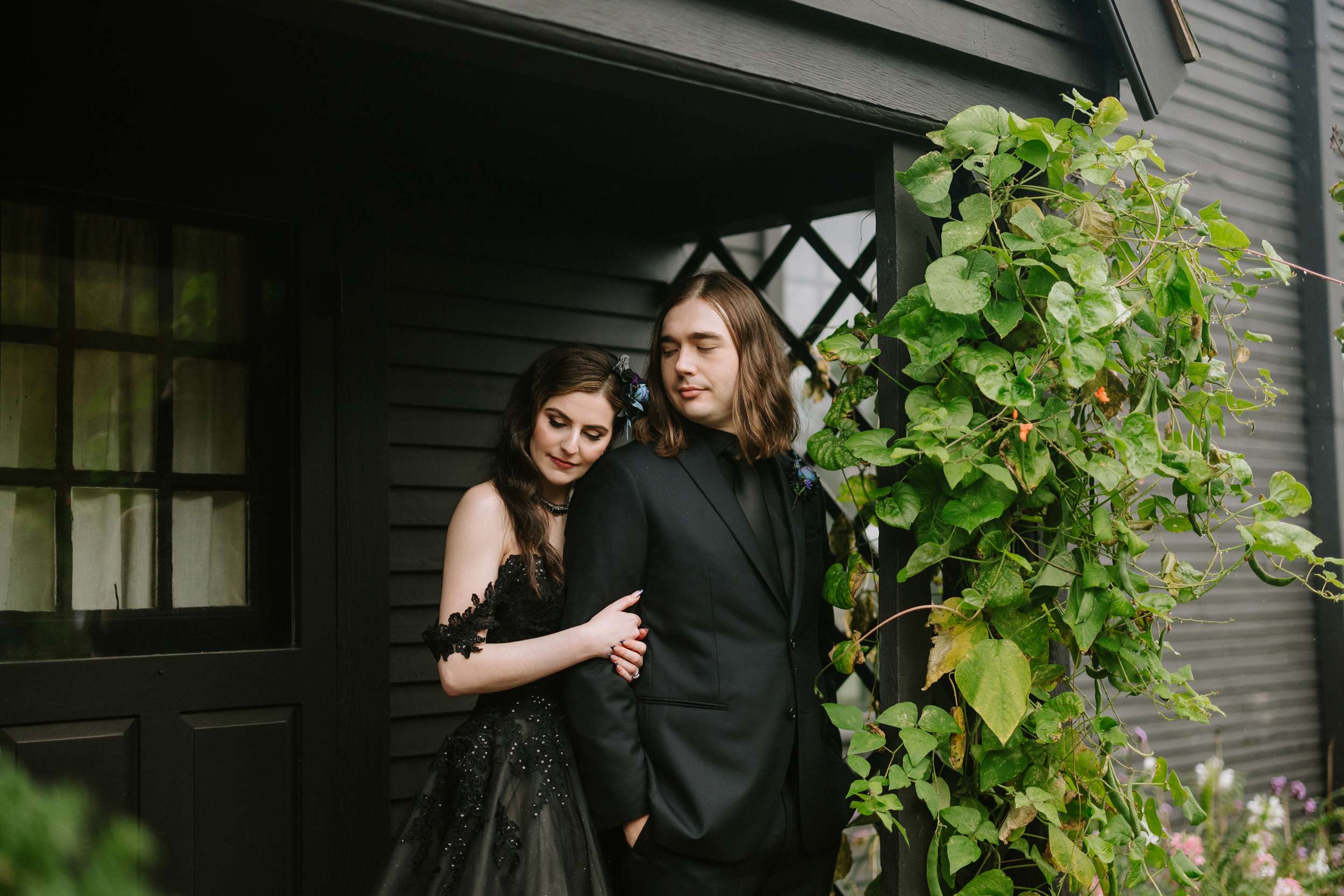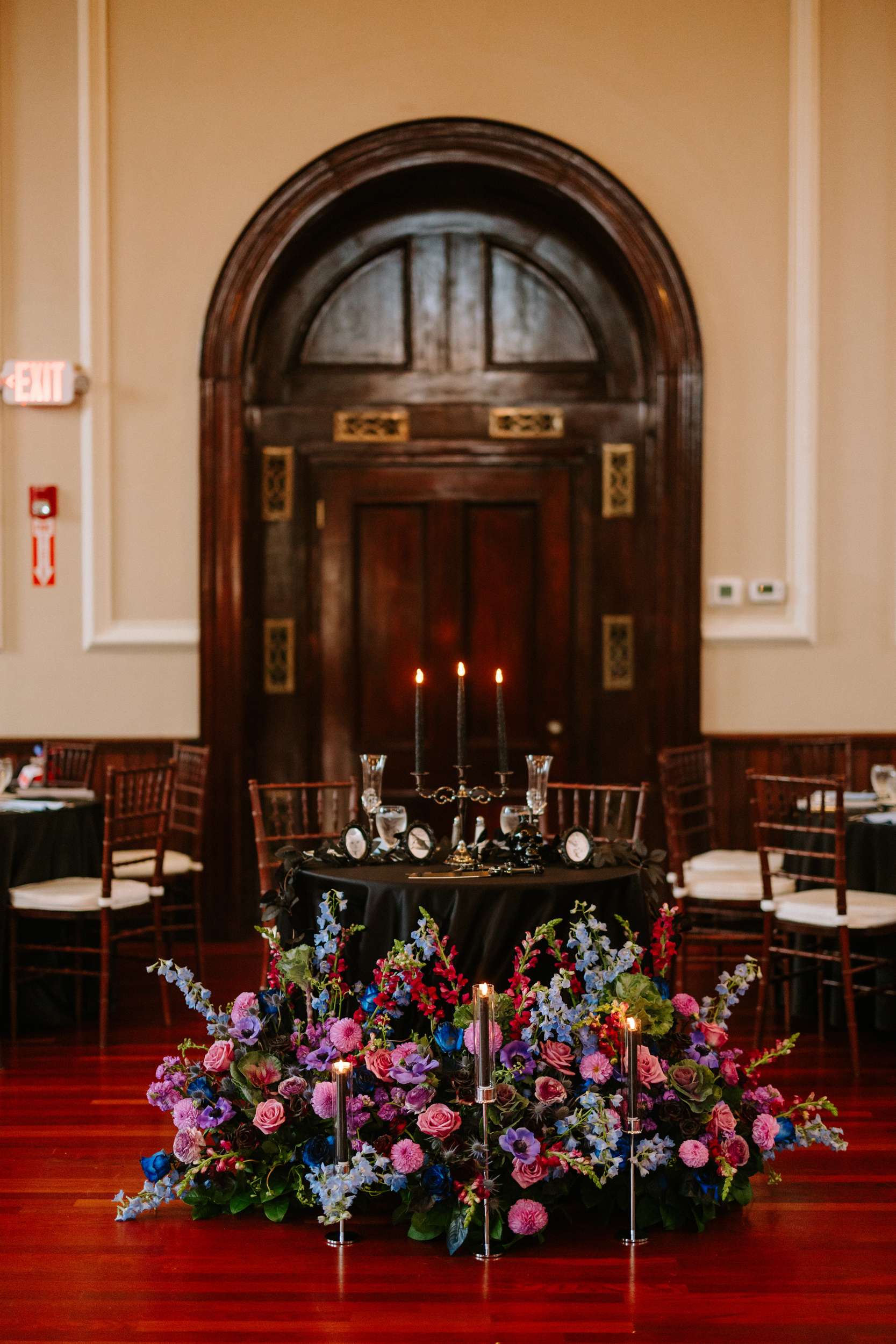“Our wedding theme was a mixture of moody, eerie, spooky, and dark romance with an alternative music twist”, Casey said. “Being in Salem with The House of the Seven Gables as the ceremony backdrop really helped us lean into our theme. We chose to have our reception at Colonial Hall. It was a costume party because we wanted an element of silliness and lightness that our day to balance everything out. We never take ourselves too seriously and we didn’t want our big day to feel ‘serious’ in that sense either.”