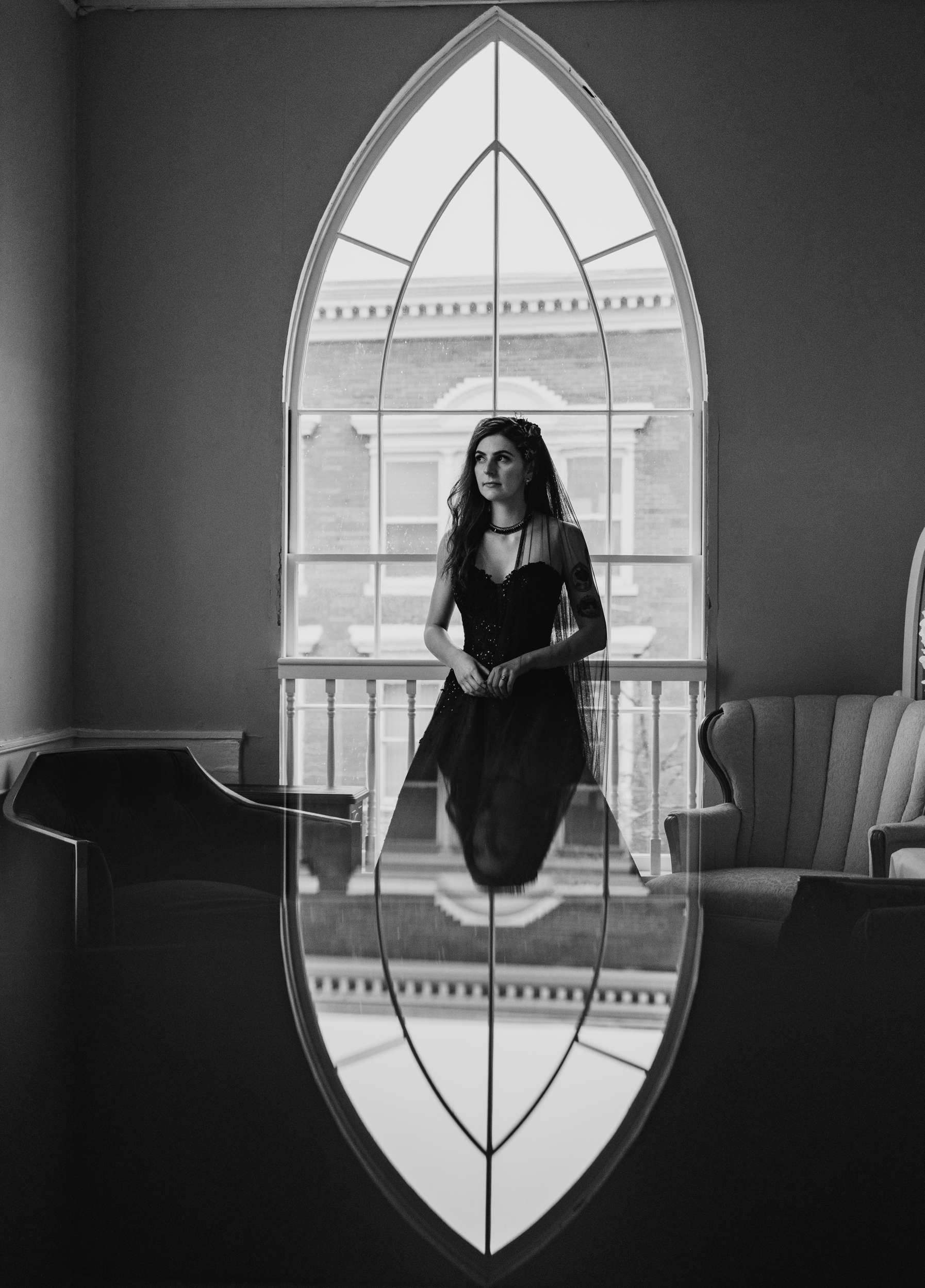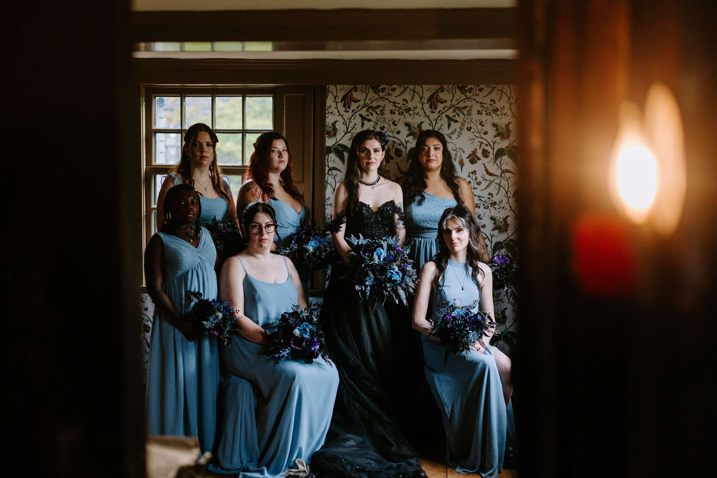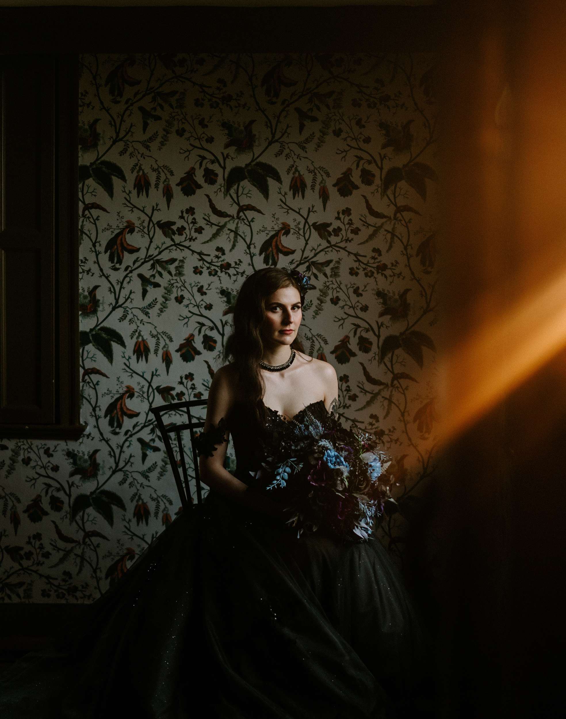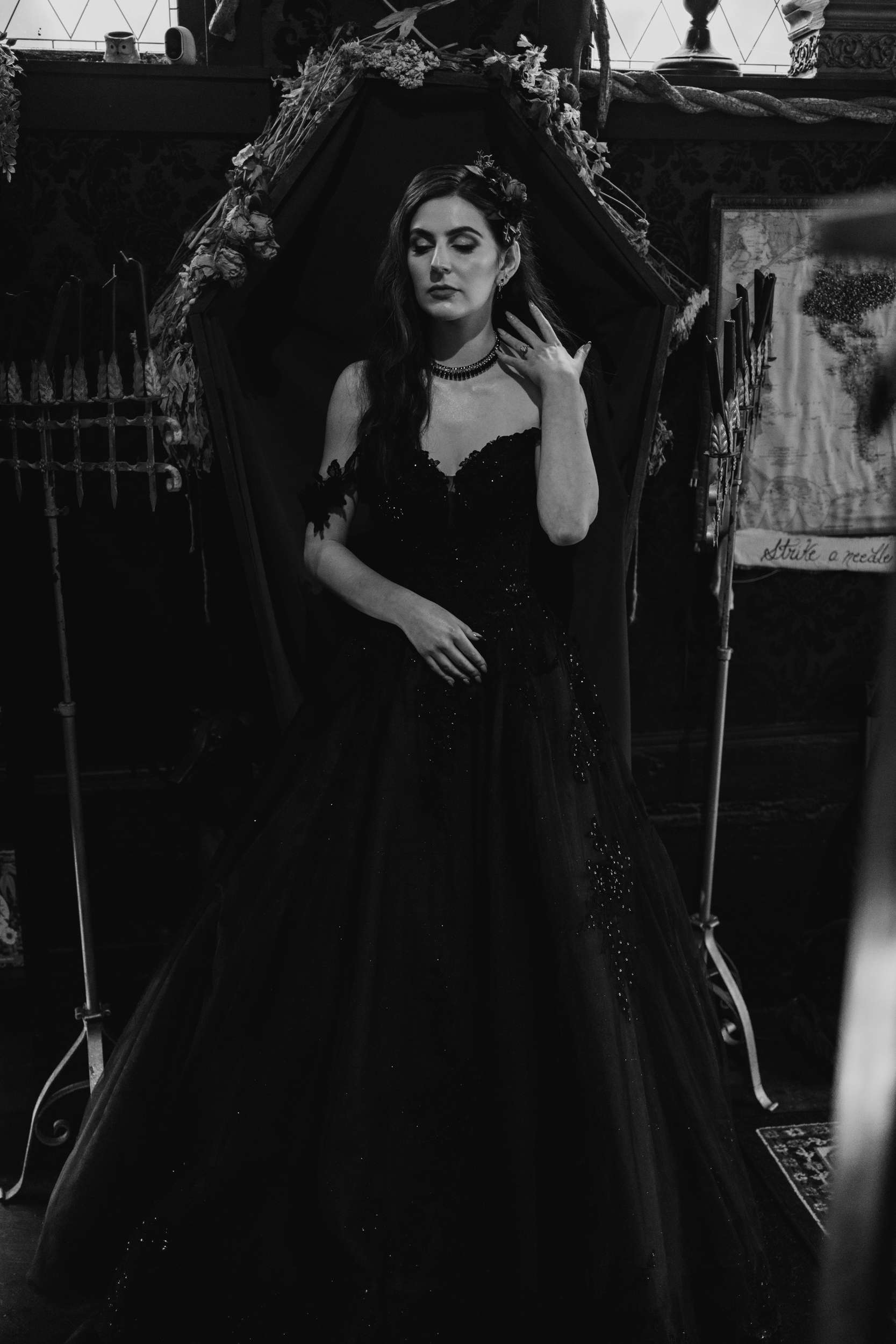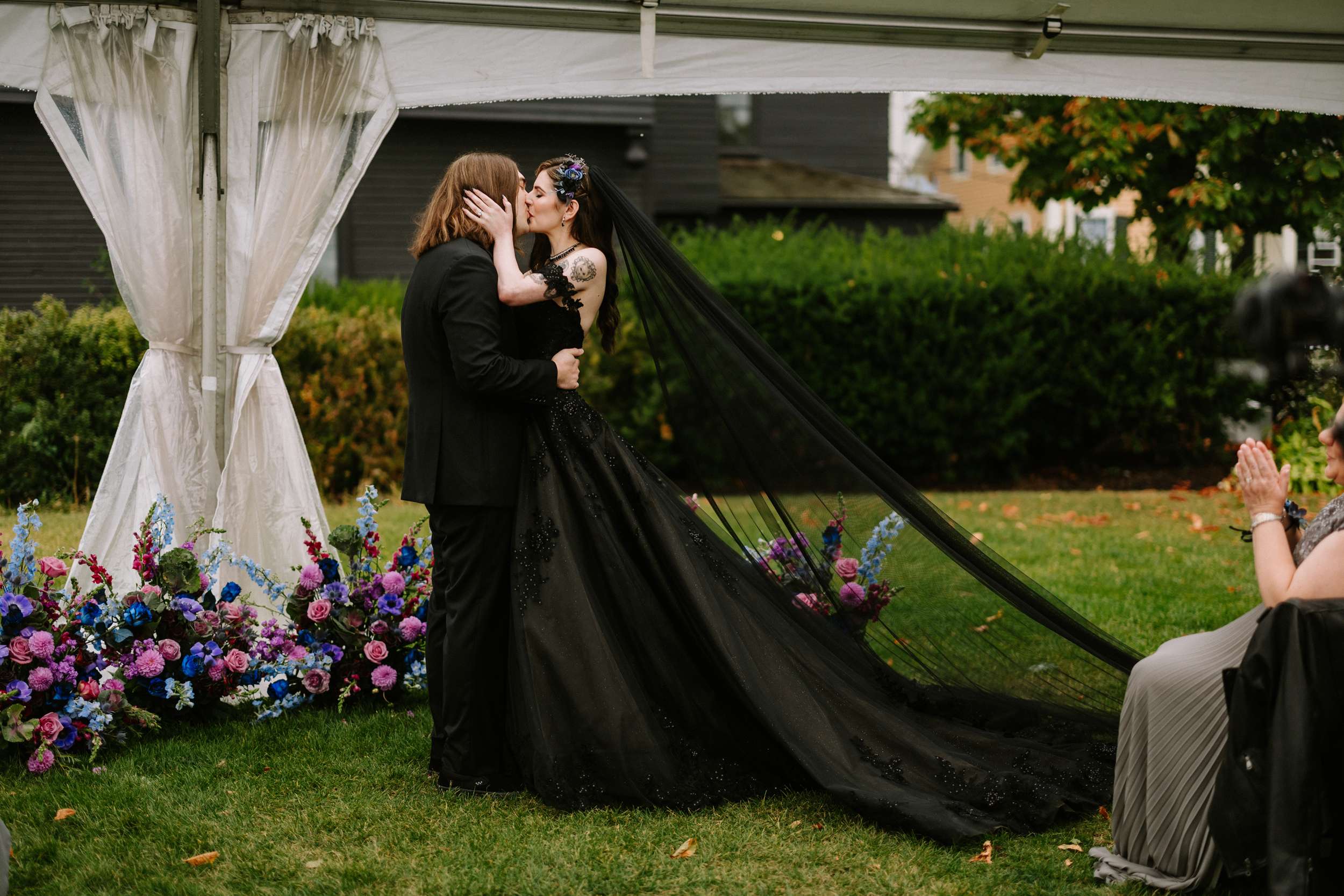 “Our wedding theme was a mixture of moody, eerie, spooky, and dark romance with an alternative music twist”, Casey said. “Being in Salem with The House of the Seven Gables as the ceremony backdrop really helped us lean into our theme. We chose to have our reception at Colonial Hall. It was a costume party because we wanted an element of silliness and lightness that our day to balance everything out. We never take ourselves too seriously and we didn’t want our big day to feel ‘serious’ in that sense either.”