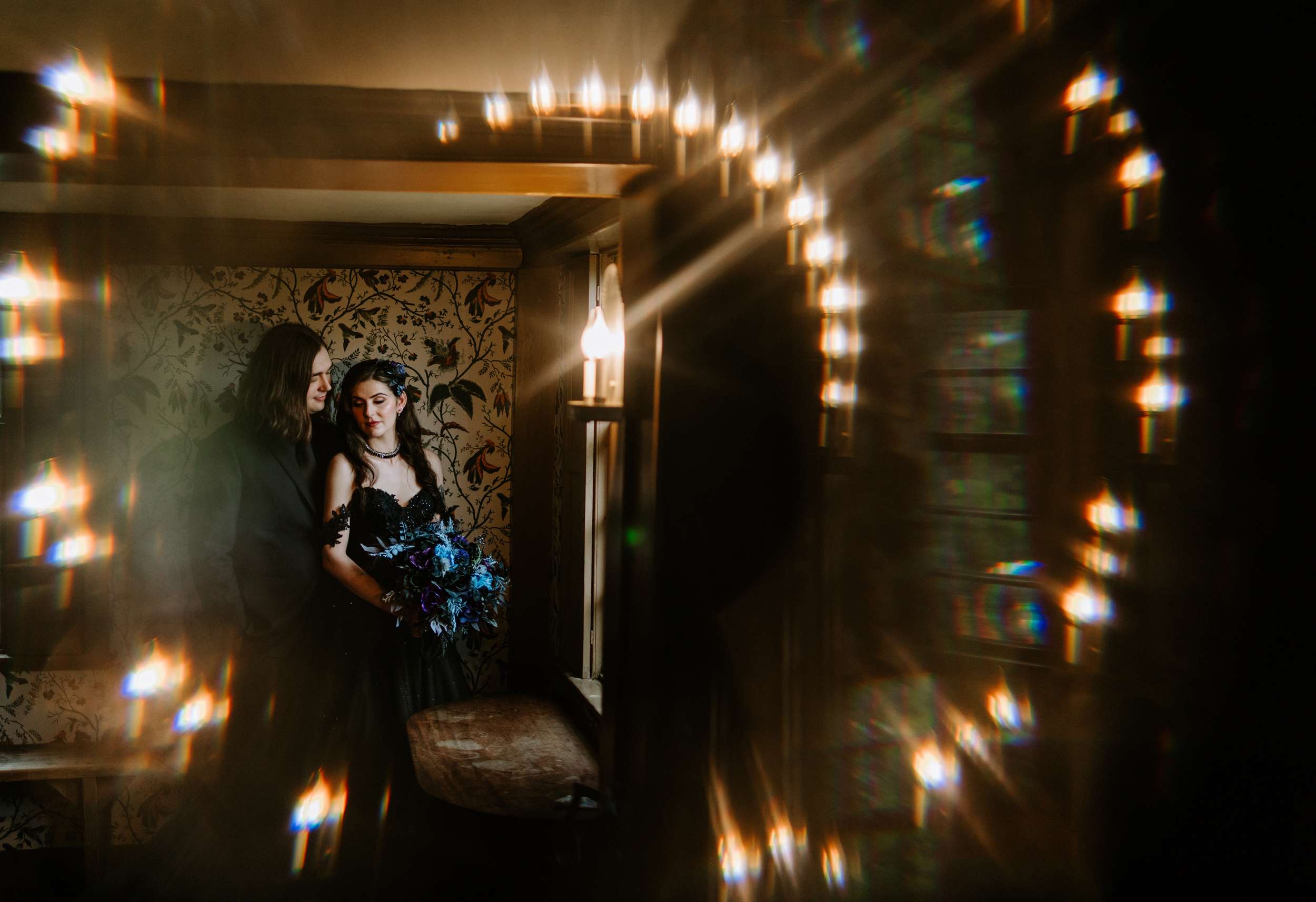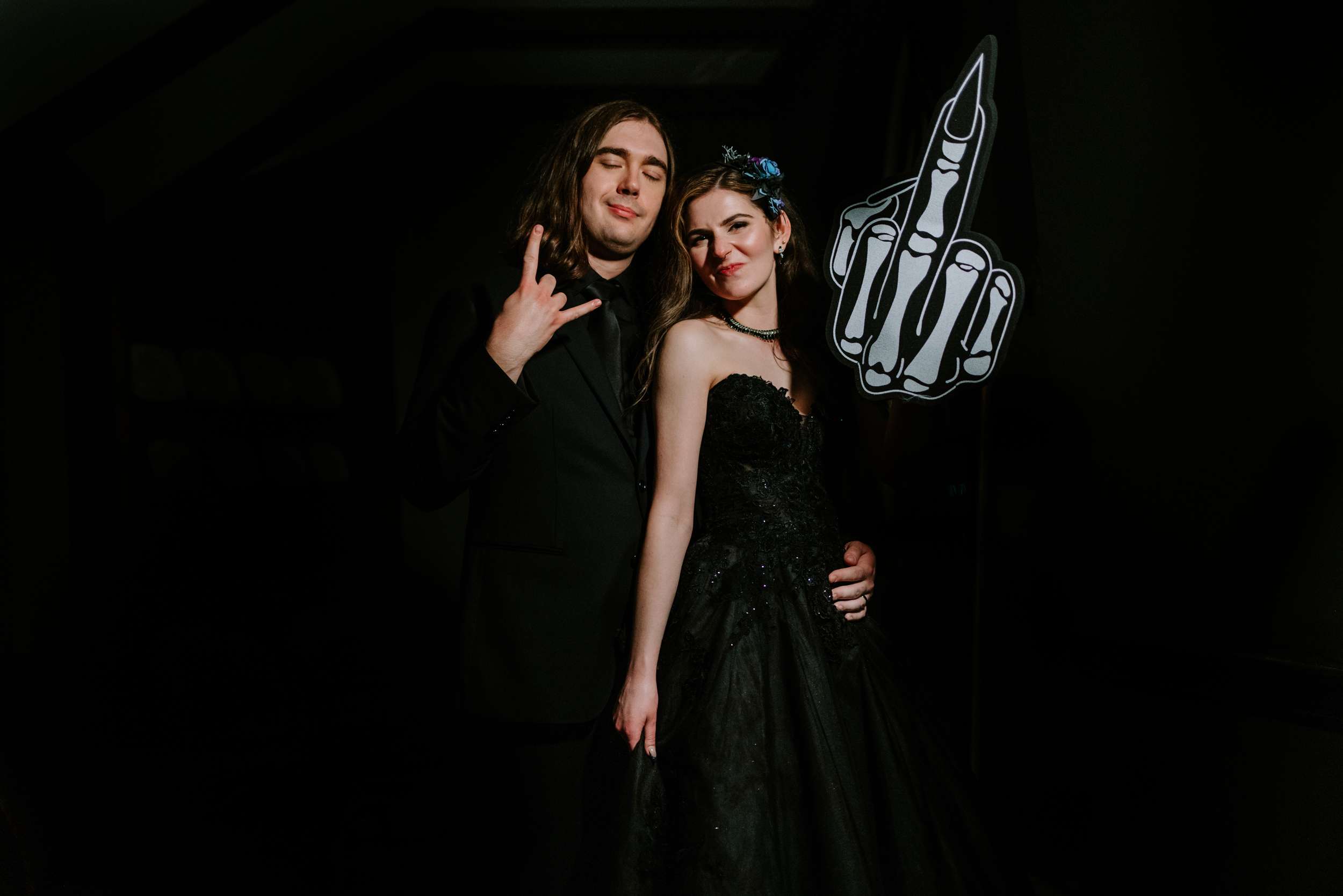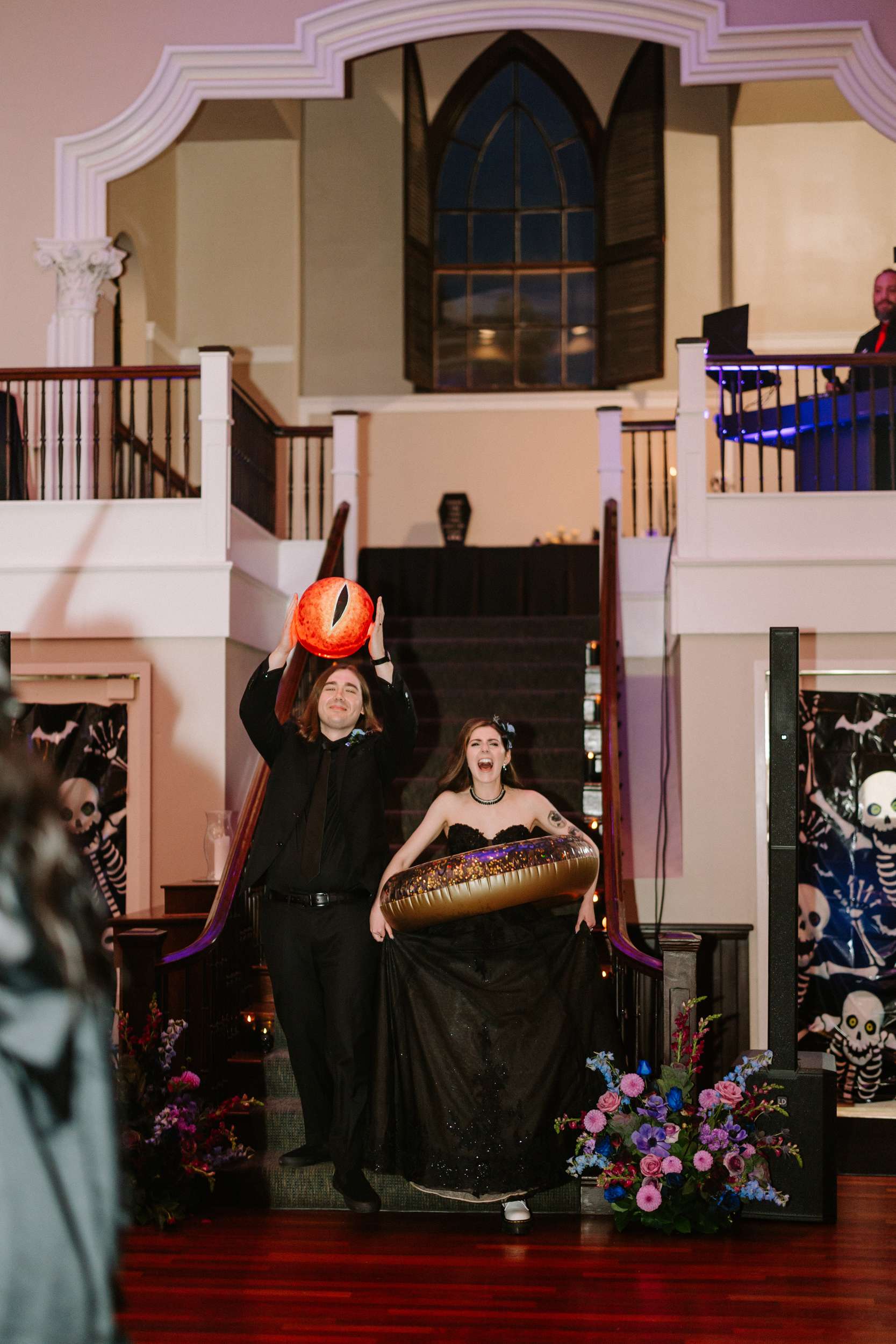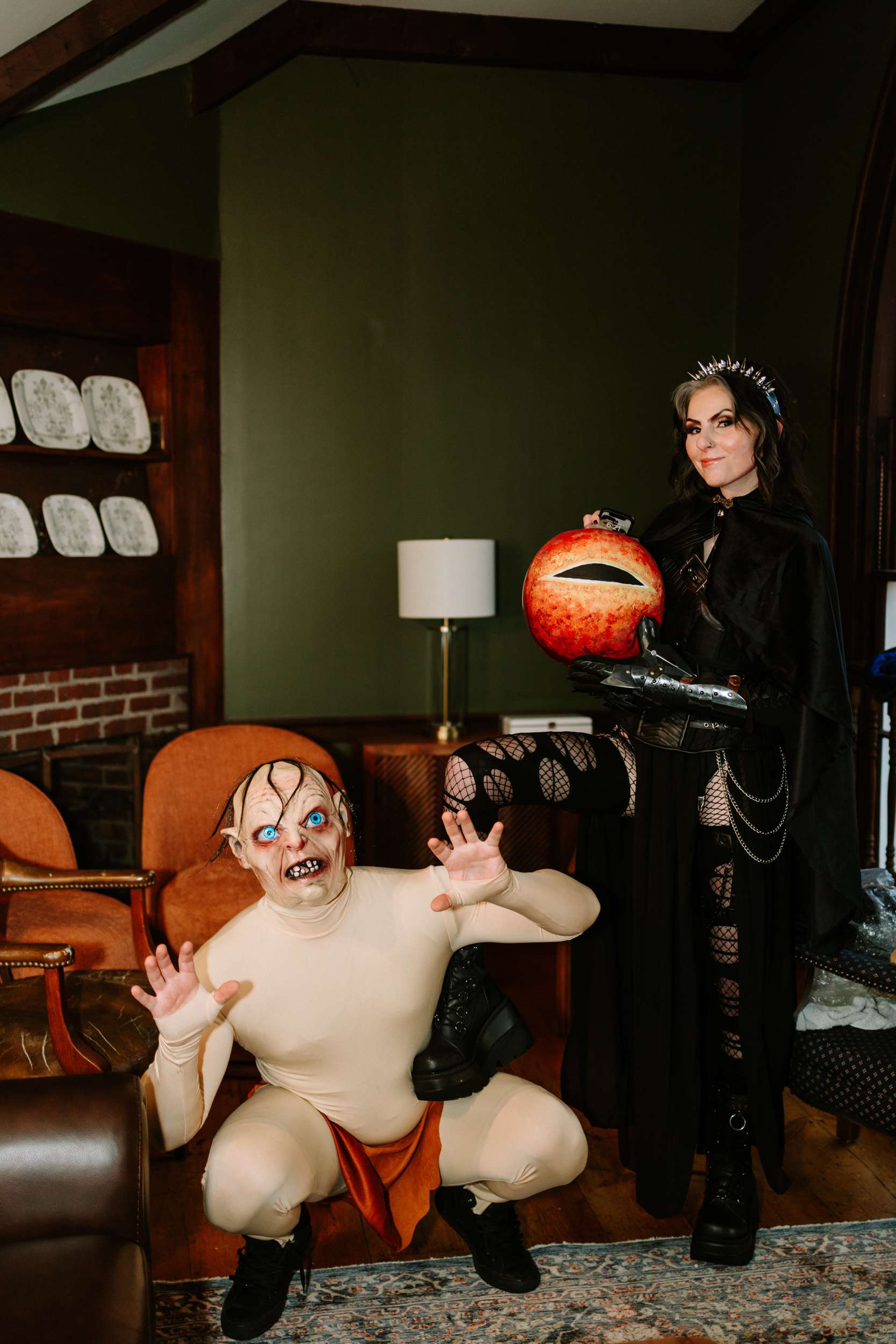 After the ceremony, guests had time before the reception to explore Salem and return to the second venue in their costumes. The wedding party arrived dressed as figures from The Lord of the Rings, complete with cut-outs of their cats in matching costumes. Emo music played all night and their their first dance was a stripped-back version of Still Into You. “We incorporated many of our favourite songs throughout the day. We made sure that the mosh pit was in full swing, like it would be at any good emo night!”