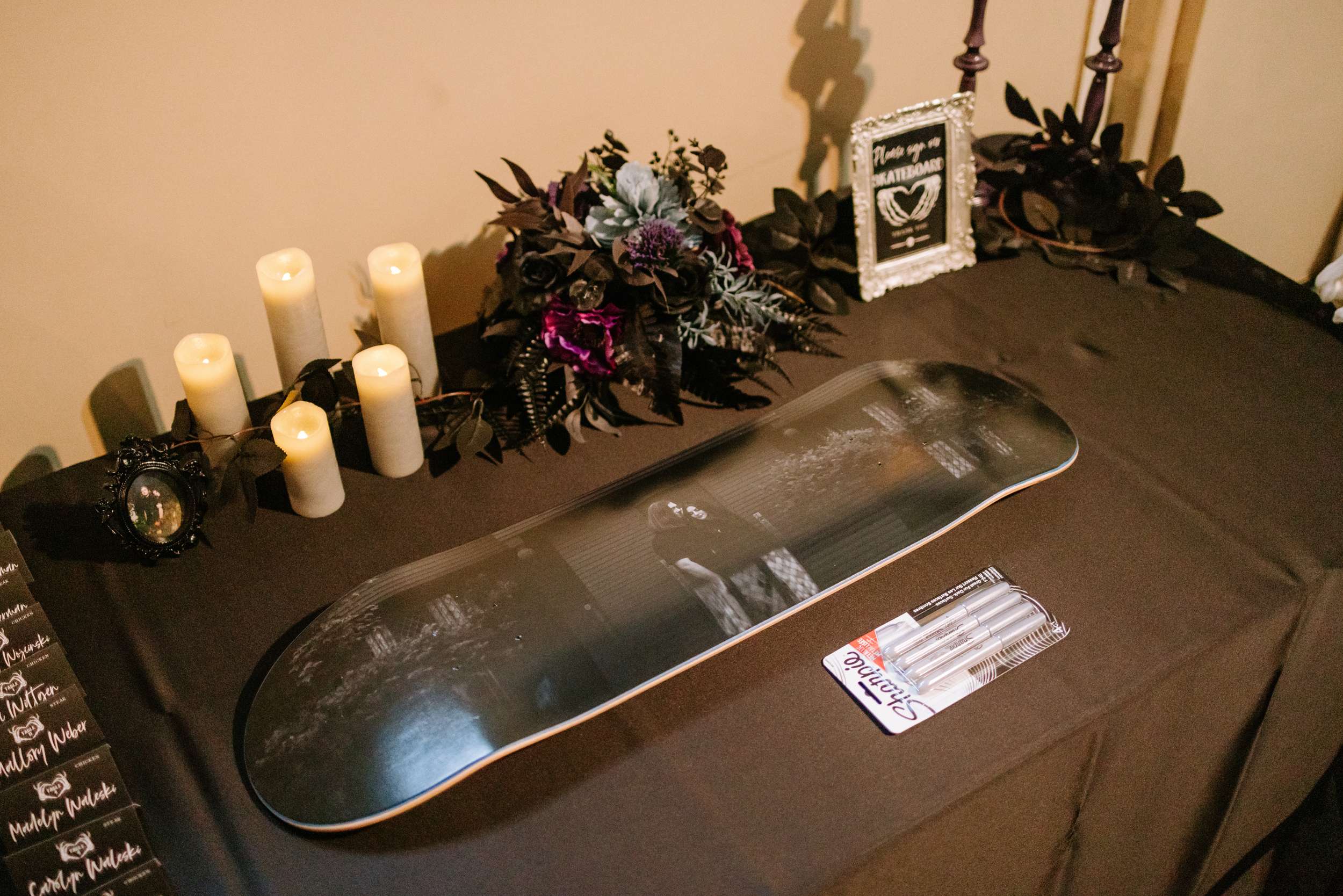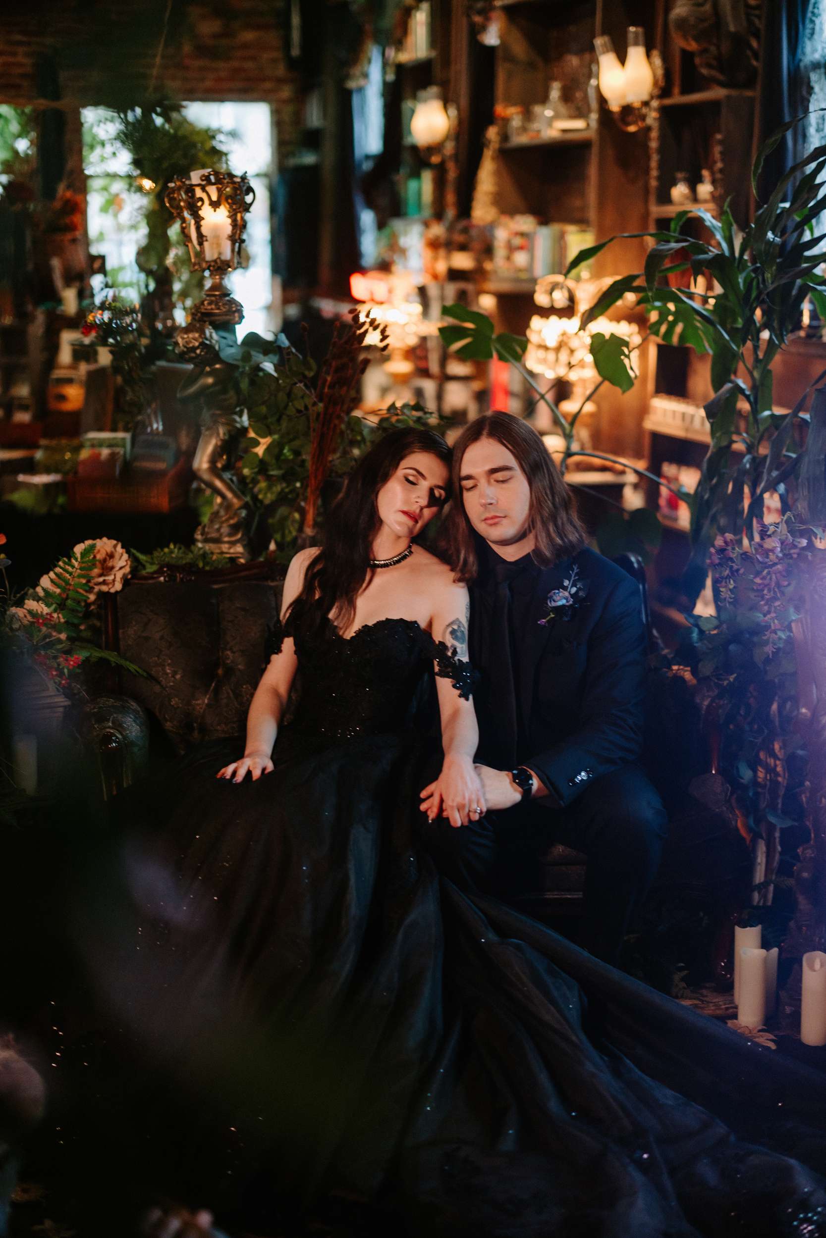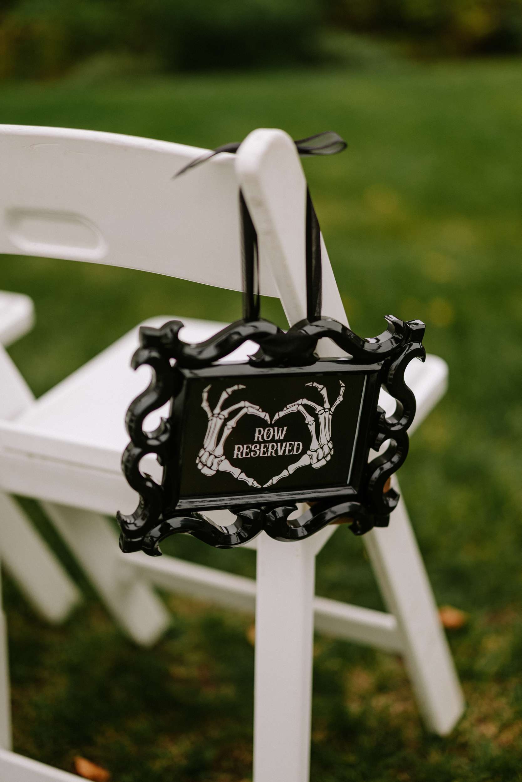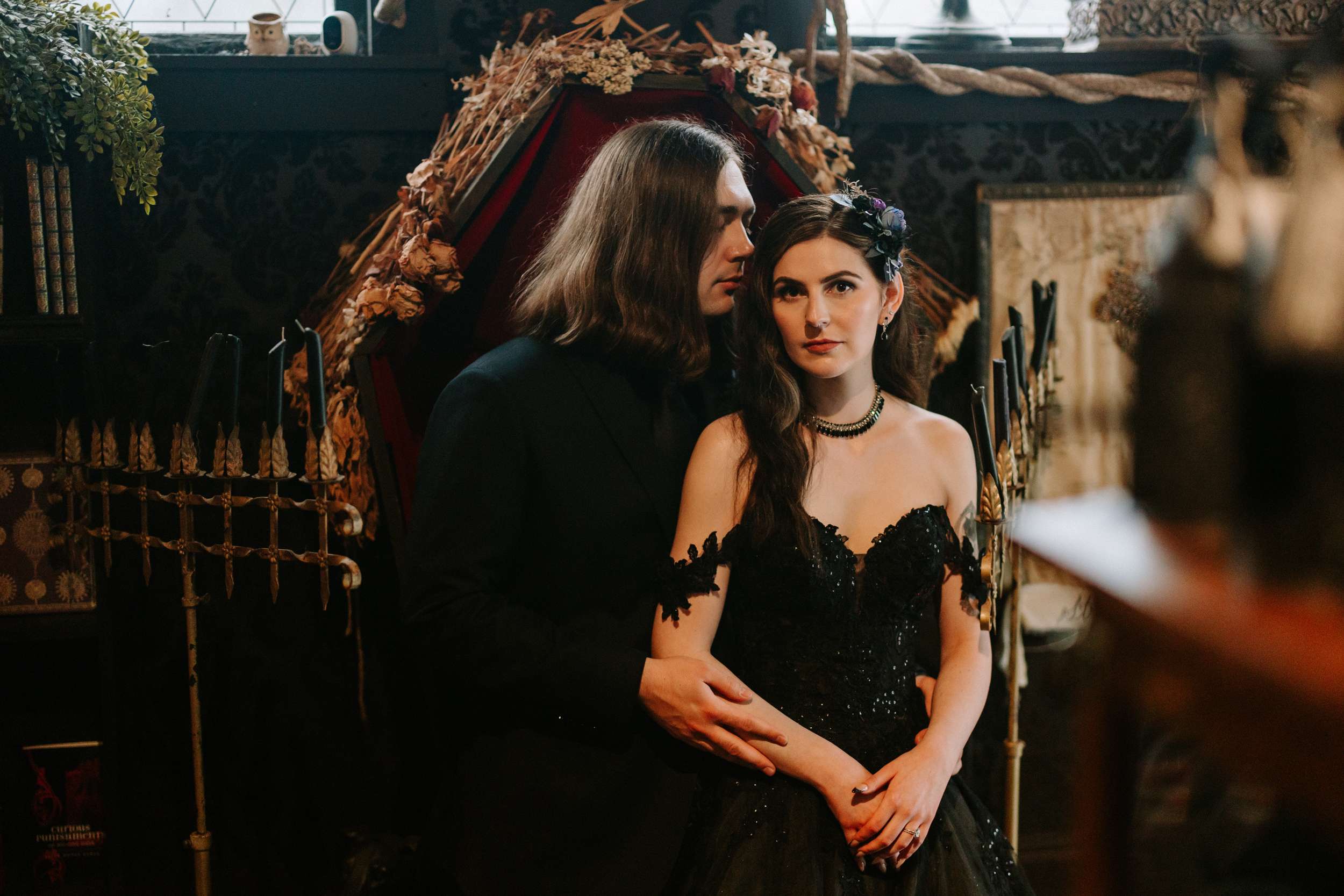 After the ceremony, guests had time before the reception to explore Salem and return to the second venue in their costumes. The wedding party arrived dressed as figures from The Lord of the Rings, complete with cut-outs of their cats in matching costumes. Emo music played all night and their their first dance was a stripped-back version of Still Into You. “We incorporated many of our favourite songs throughout the day. We made sure that the mosh pit was in full swing, like it would be at any good emo night!”