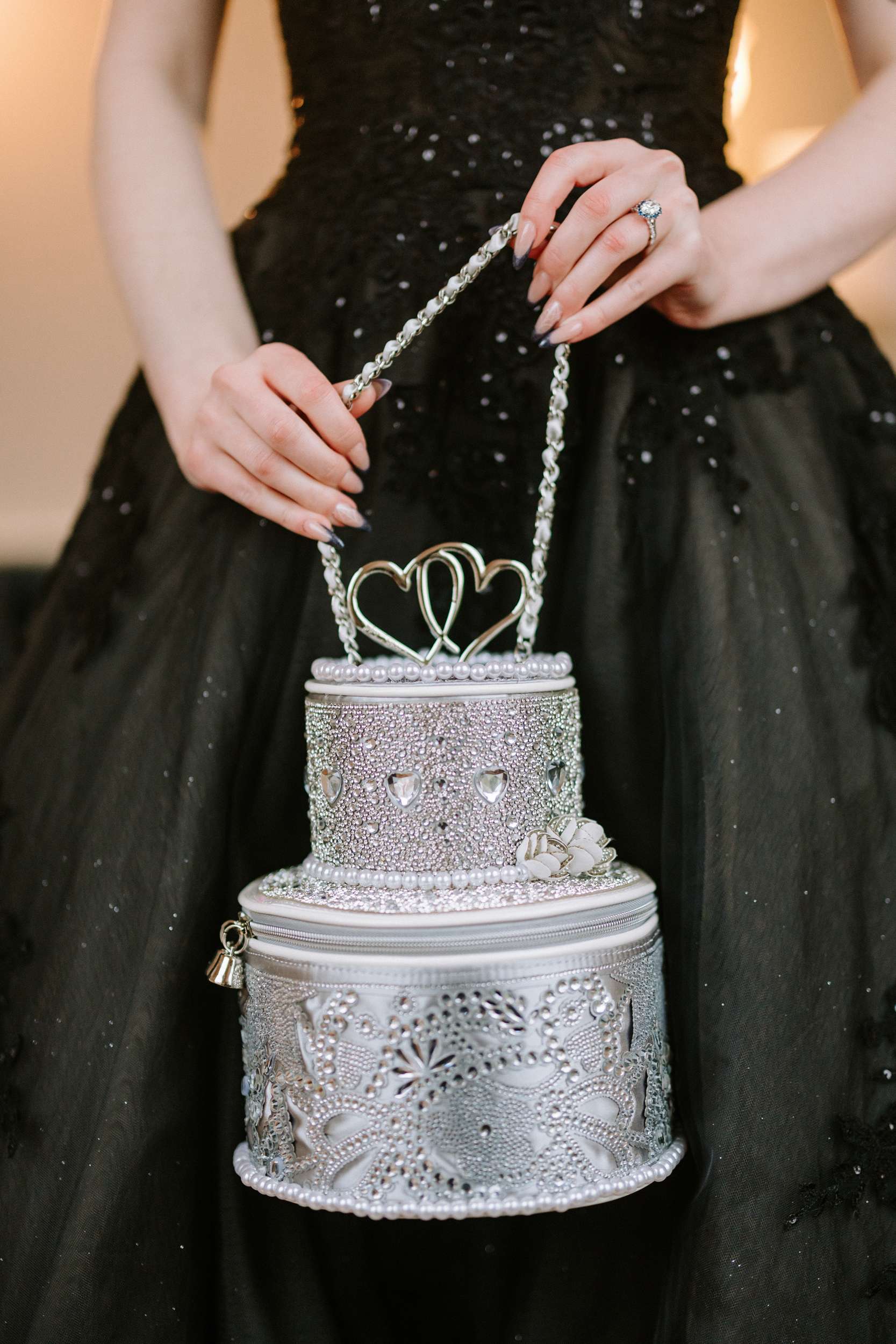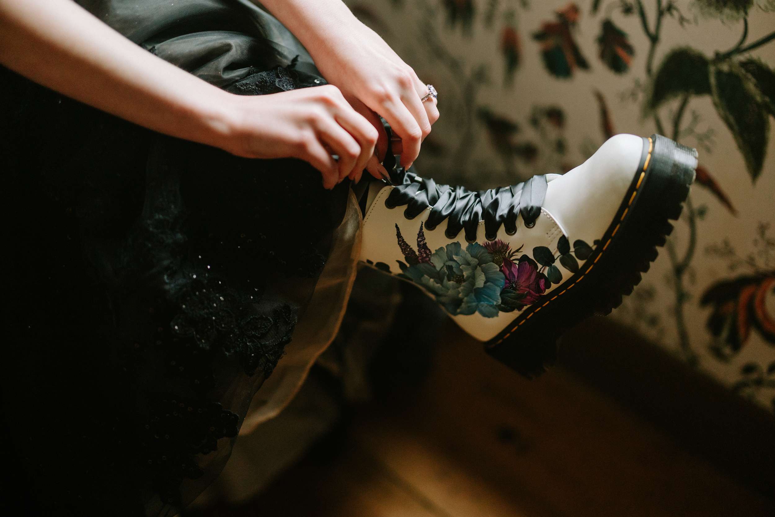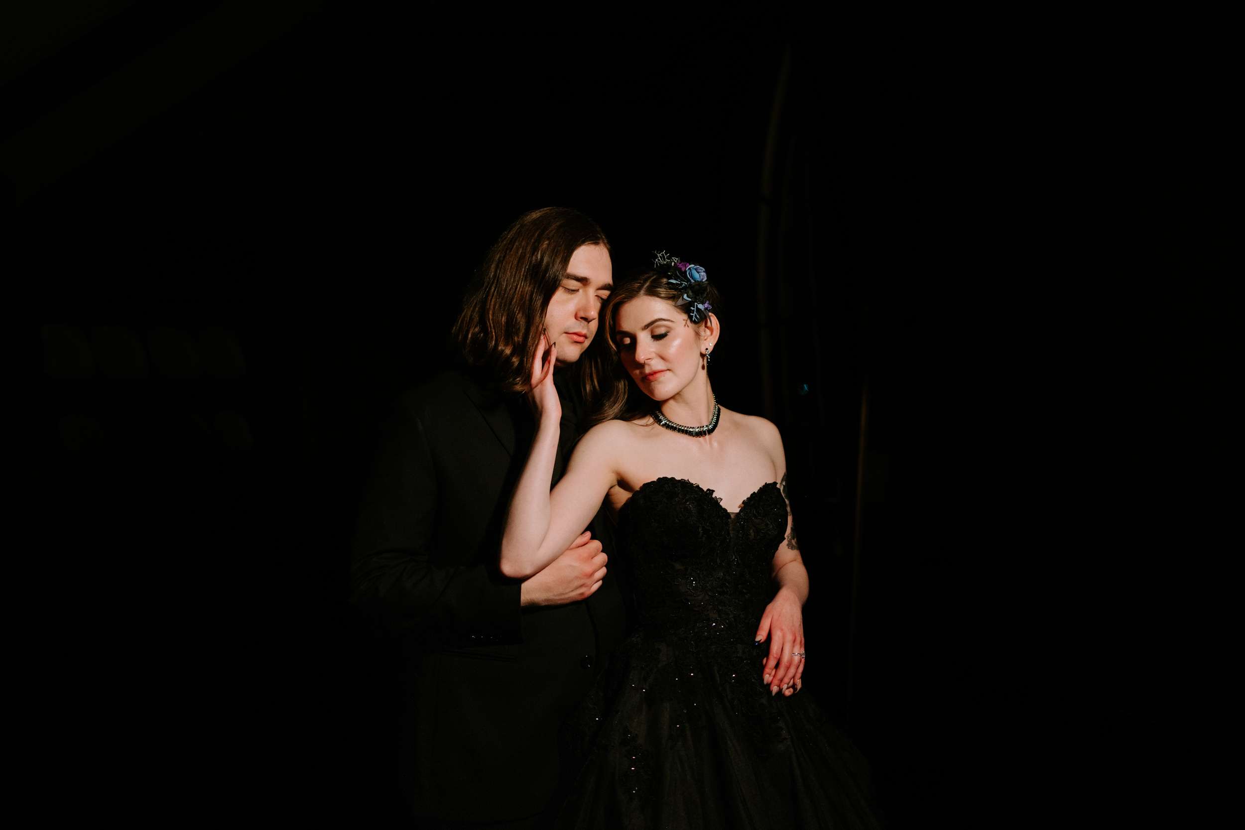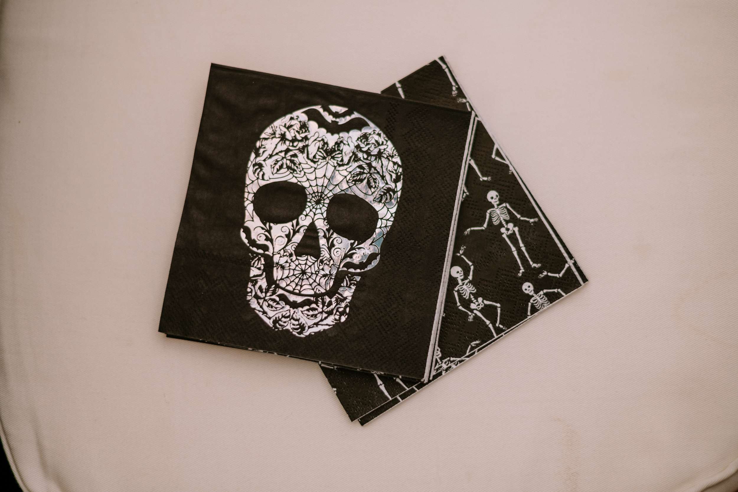 They went for a dark, romantic theme and there were black accents everywhere – the bride and groom both wore black, and the the cake and the florals had black elements to. There were plenty of spooky accents throughout the day. They drank from glasses with skeletons hands on, and had glass skulls, spiderweb covered florals, black candles, and skeletons on the tables.