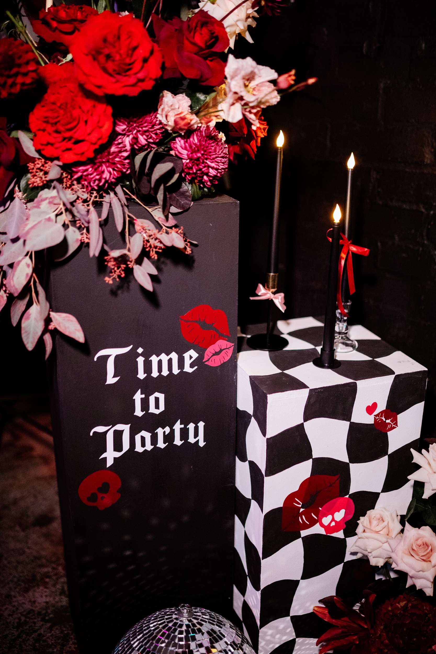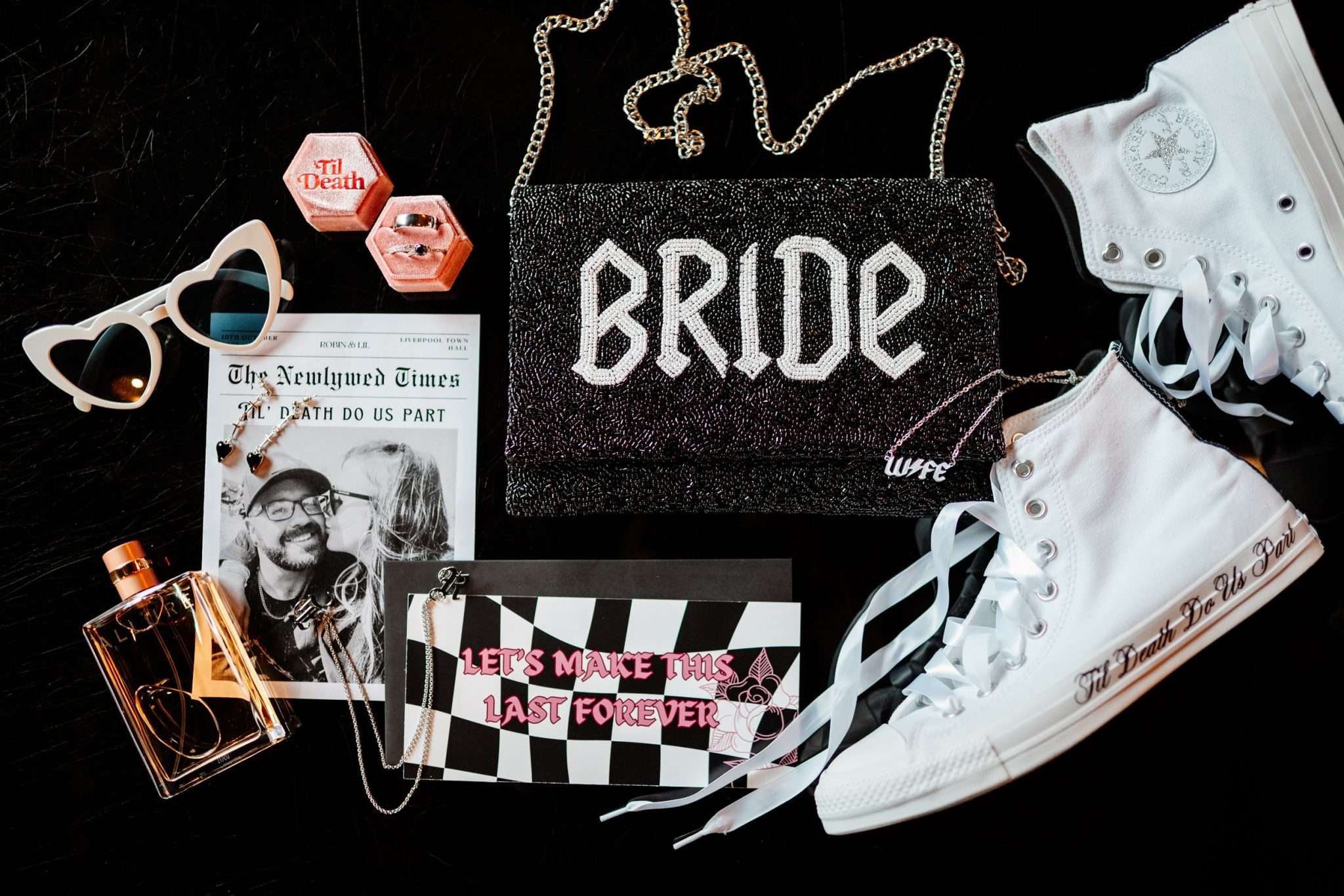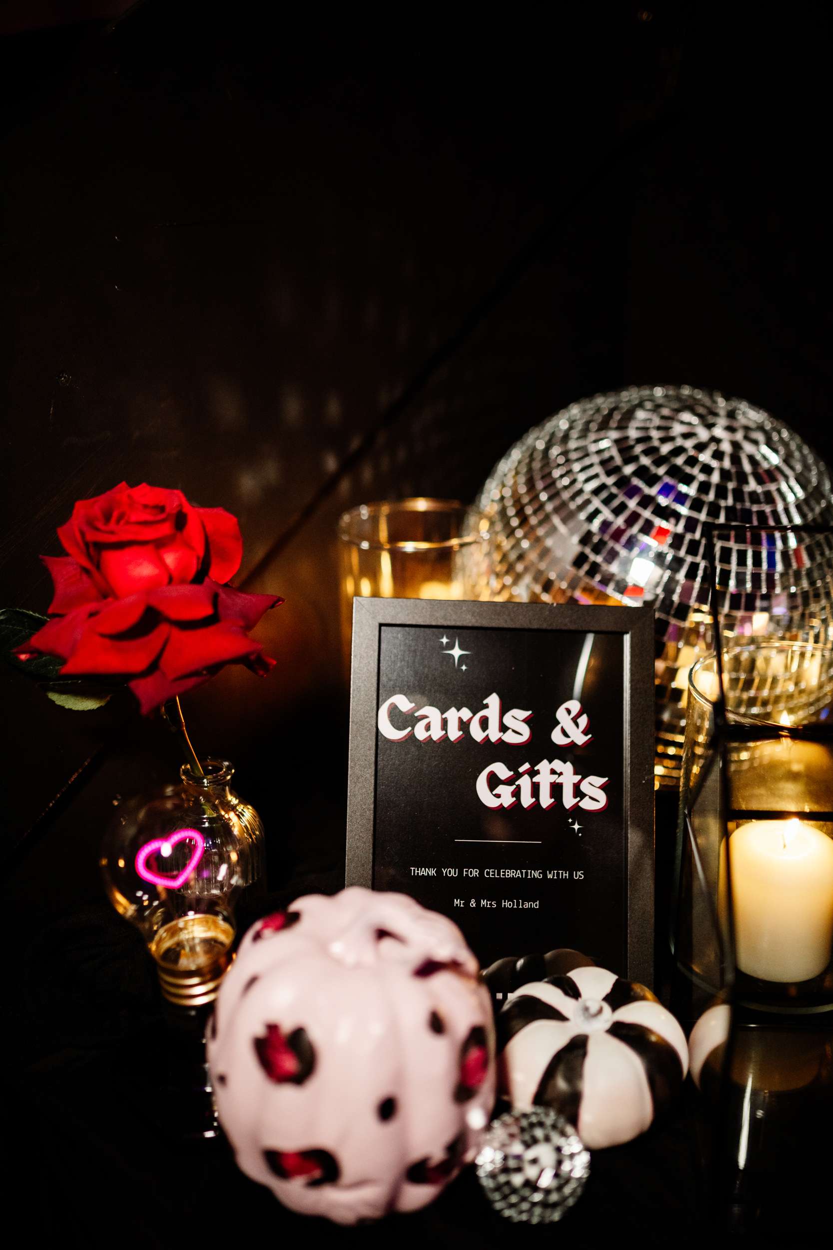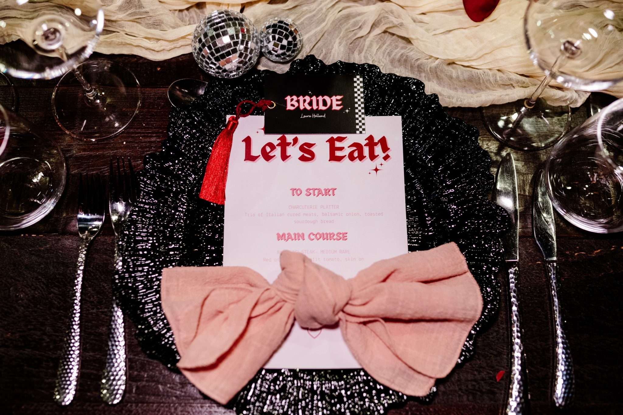 “I really wanted emo to be the main vibe of the day”, Laura said. “We really didn’t want to have a traditional, copy and paste wedding. We wanted our favourite colours, lots of checkerboard, gothic fonts, disco balls and moody vibes! I feel we managed to achieve this perfectly with the help from Rebecca at R&R Weddings and Events. I contacted our photographer, Amy, and asked if she could recommend a room dresser for us. I wanted someone who understood our vibe, but also had amazing ideas that we would love. Amy suggested Rebecca and when I found her Instagram, it looked just like my Pinterest board!”