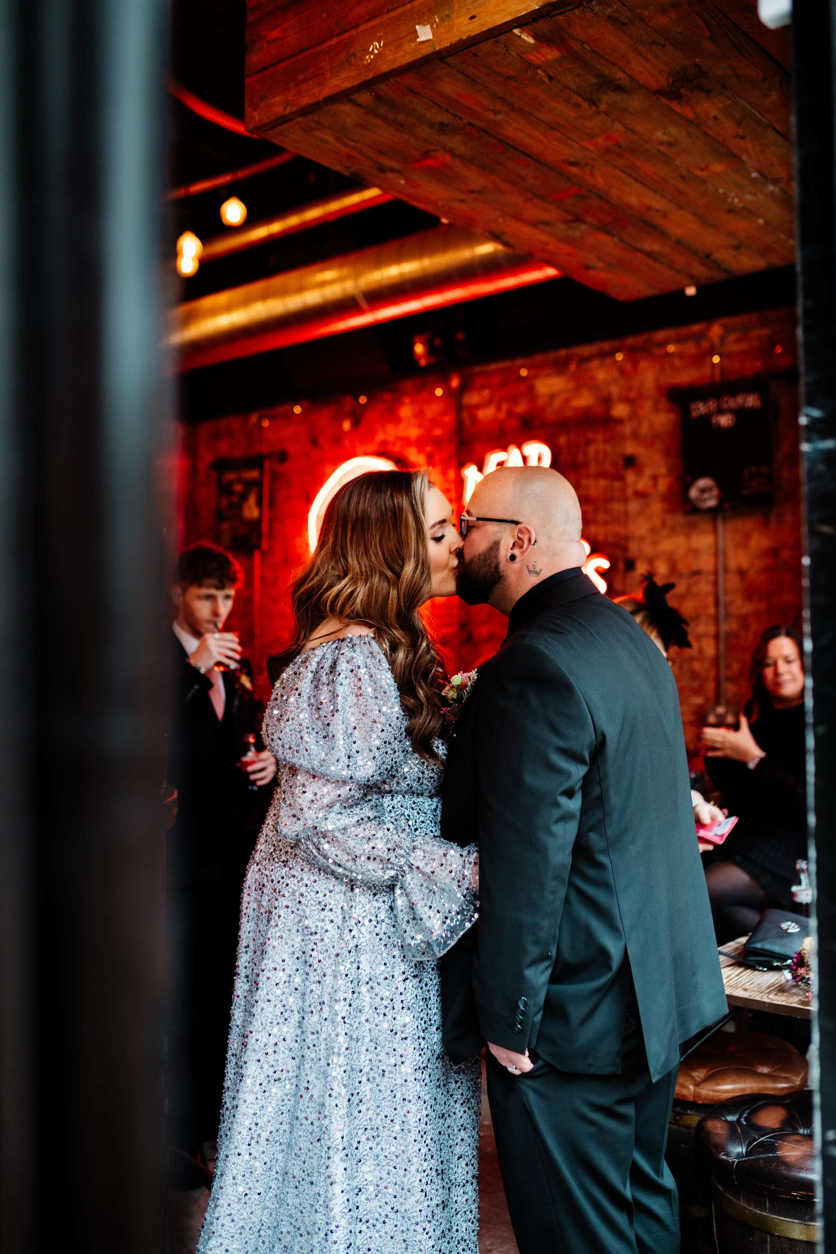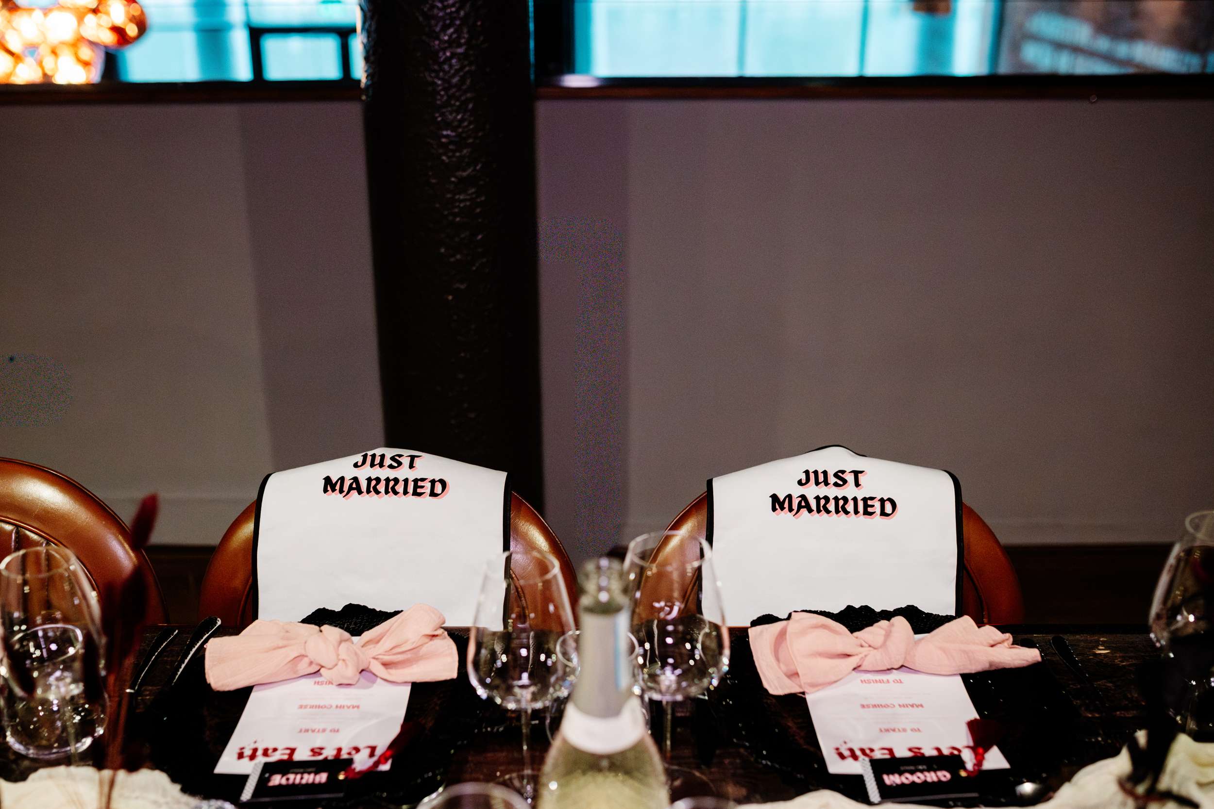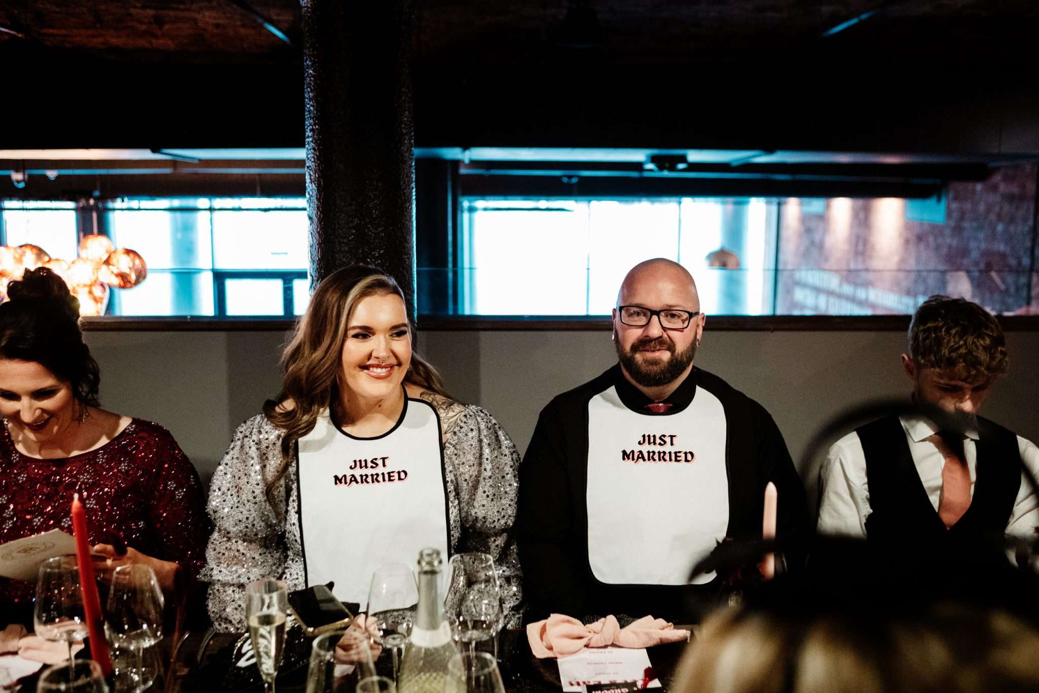 “Our evening reception was unreal! ” Laura said, “The room could be divided into two with the use of some curtains so guests arrived through the bar area where they gathered for a drinks reception first. We had Cranberry Aperol Spritz for welcome drinks which were stunning and fitted the autumn theme. During this time, Lily Kerbey sang two sets of nu-metal bangers acoustically, and our guests LOVED her. I once seen her describe her singing style as ‘singing a Slipknot song but your Nan thinks its Ed Sheeran’ and this was the perfect thing for us. I loved hearing our guests saying ‘wait, is she singing Korn?’ She was the most perfect addition to our drinks reception.”