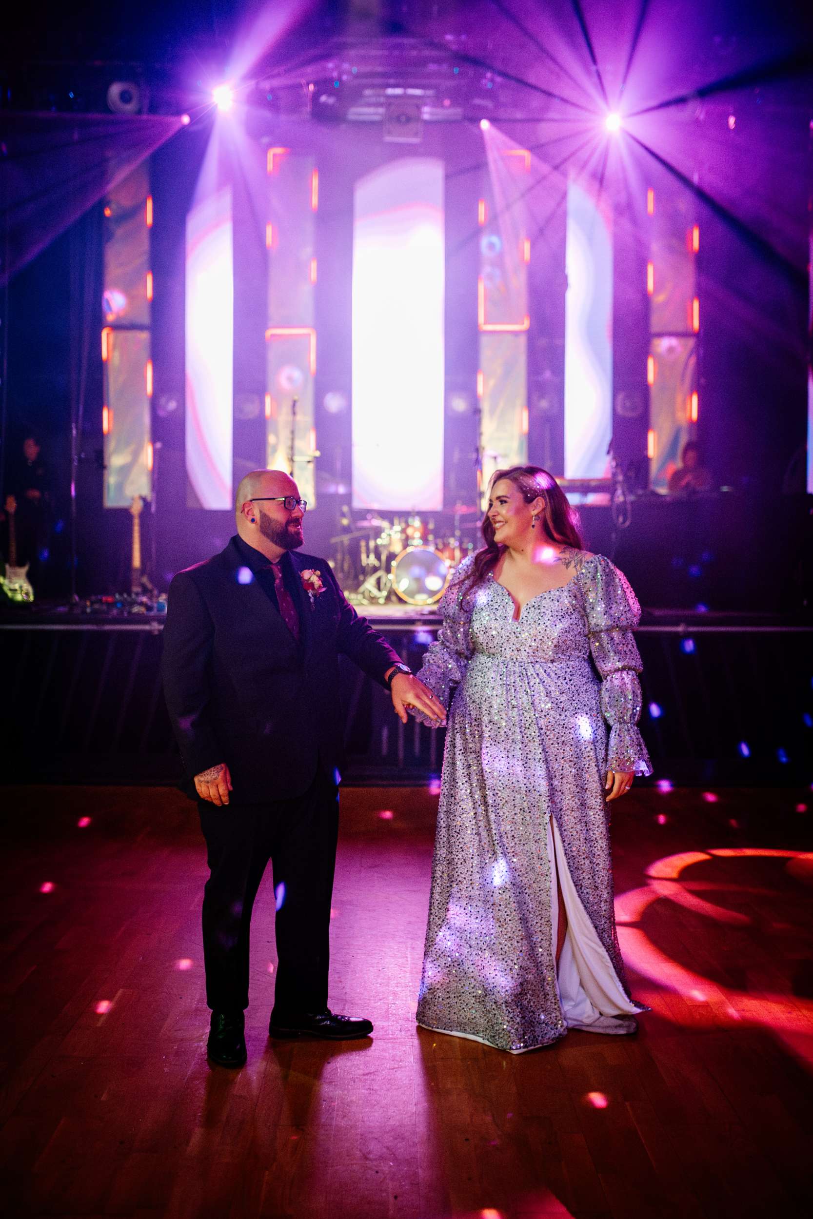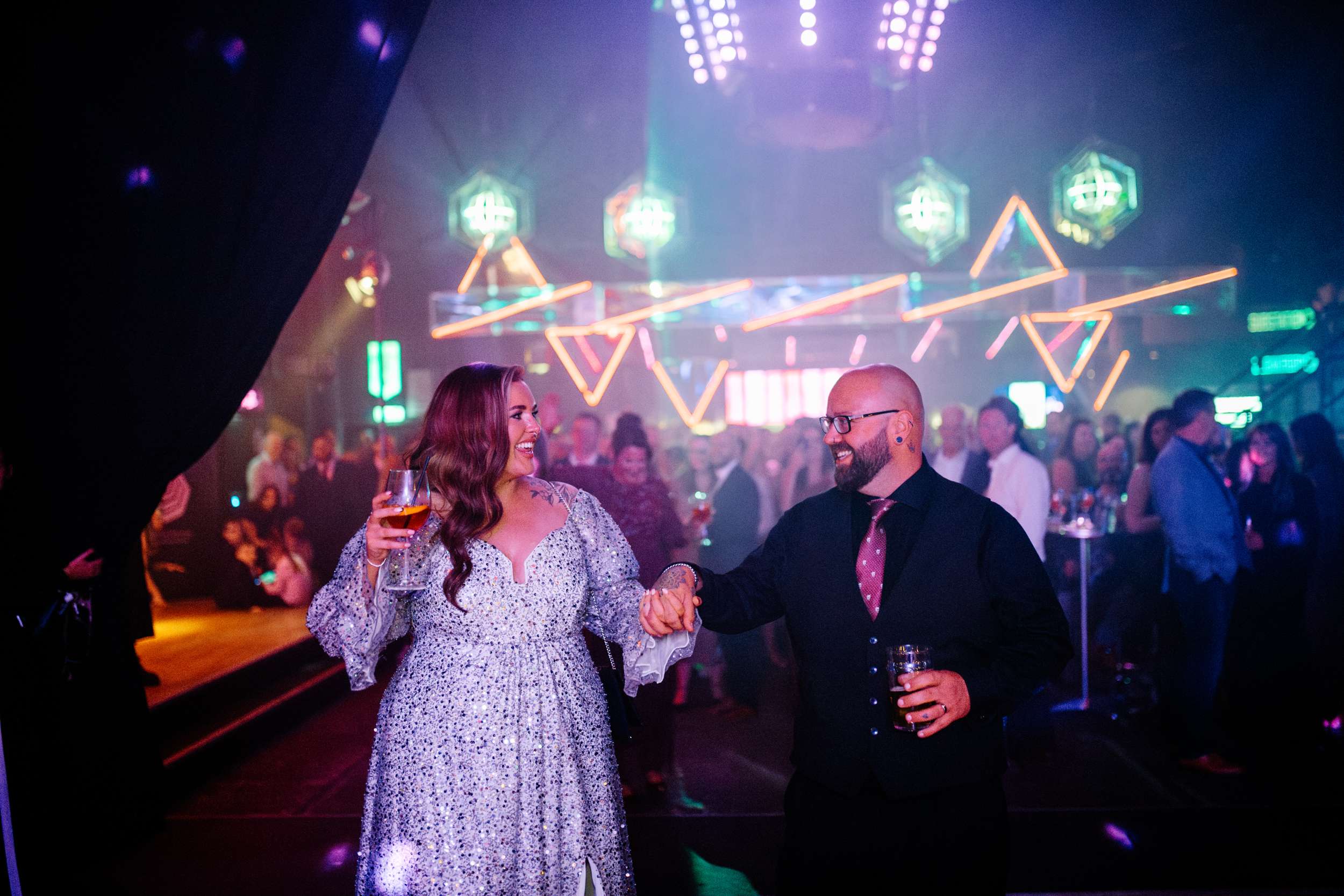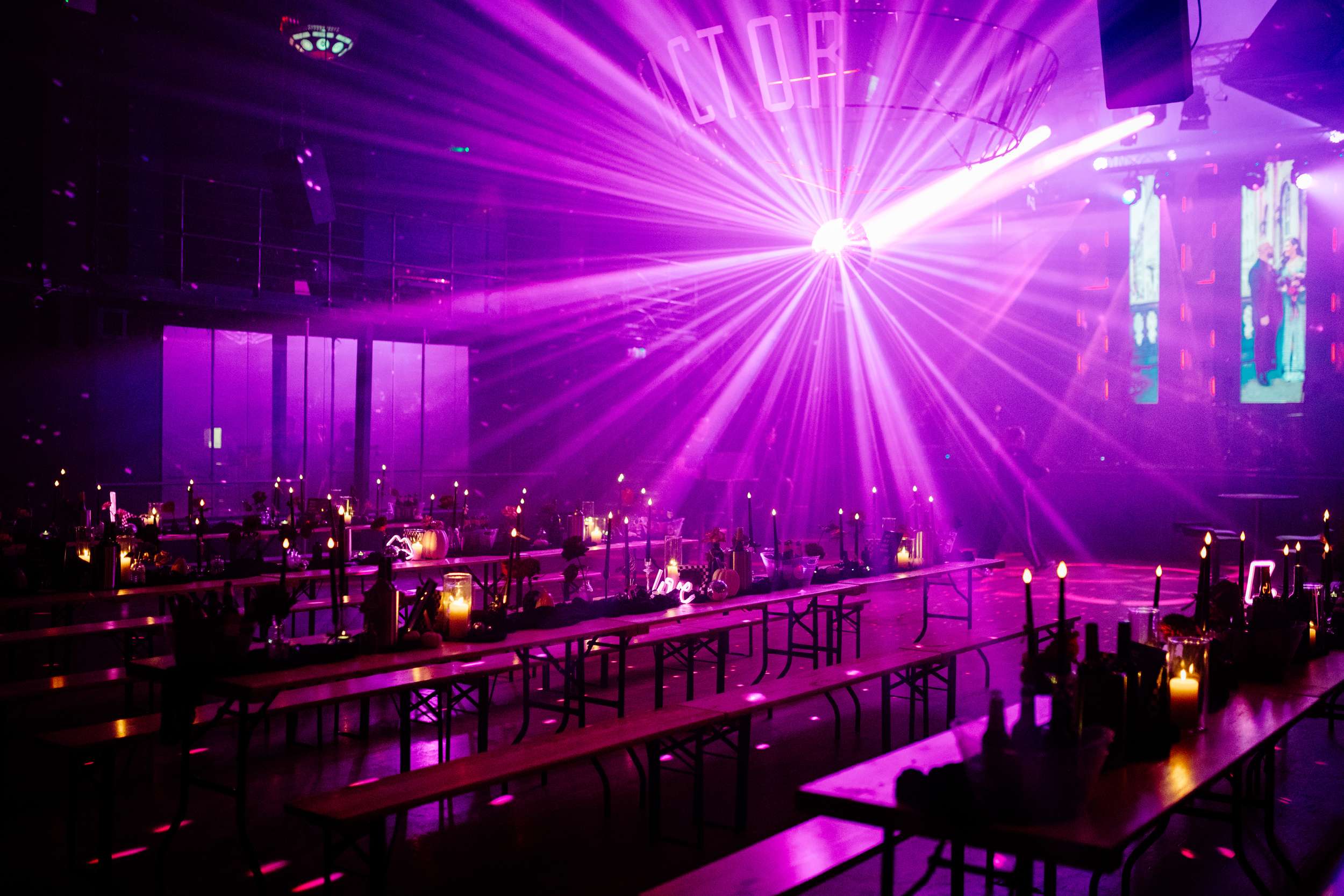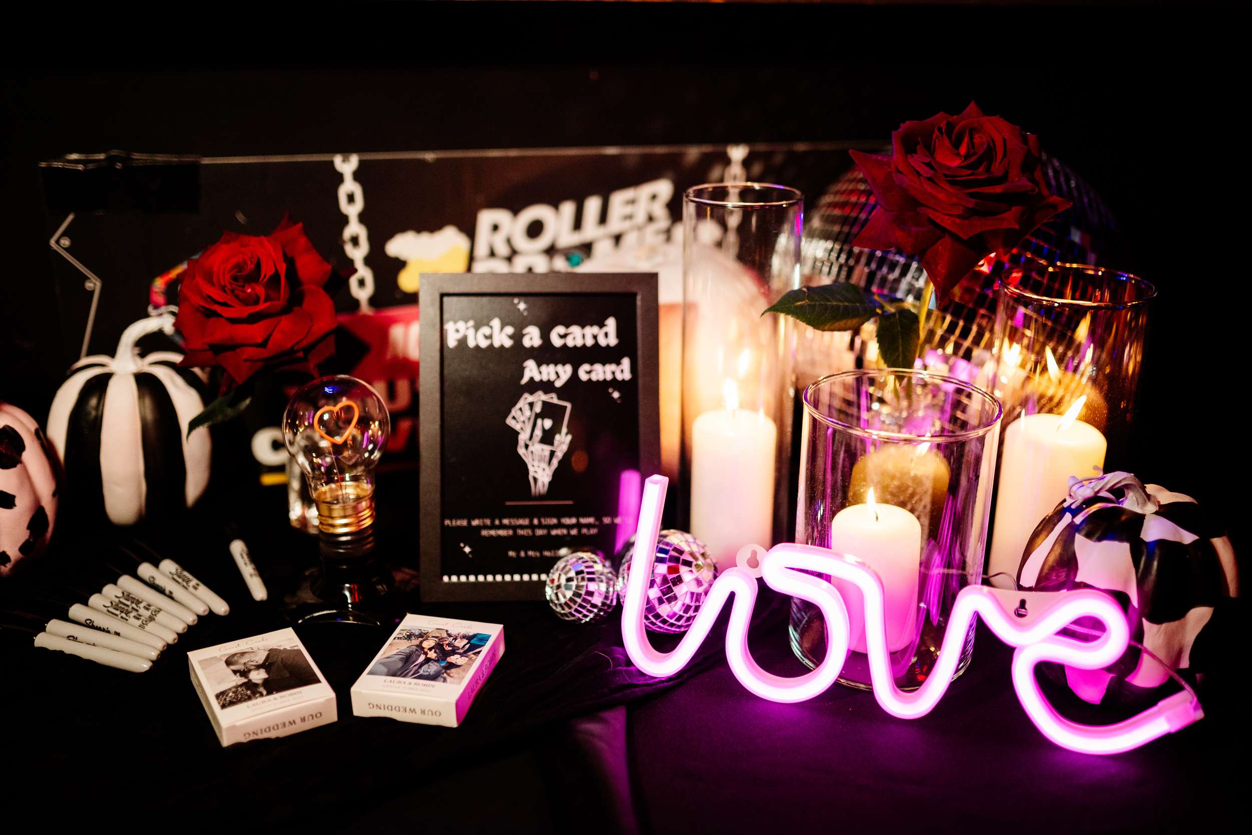 When Lily finished her set, the curtains were opened, revealing the rest of the space. “Our guests gasped, it looked truly amazing!” she continued. “We had four rows of trestle tables with benches for guests to sit at. They were decorated to perfection with black candles, neon lights, disco balls, white pumpkins, checkerboard pumpkins, flowers, leopard print, black table runners and personalised beer mats. We had buckets of booze on every table for people to help themselves. We had a extra large disco ball hanging from the ceiling. There were also four floor to ceiling screens on the stage on which a slideshow of our ceremony photos played all evening.”