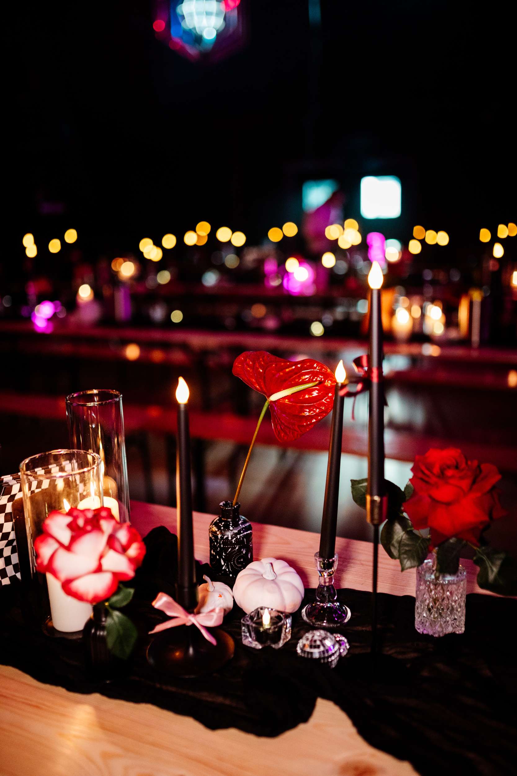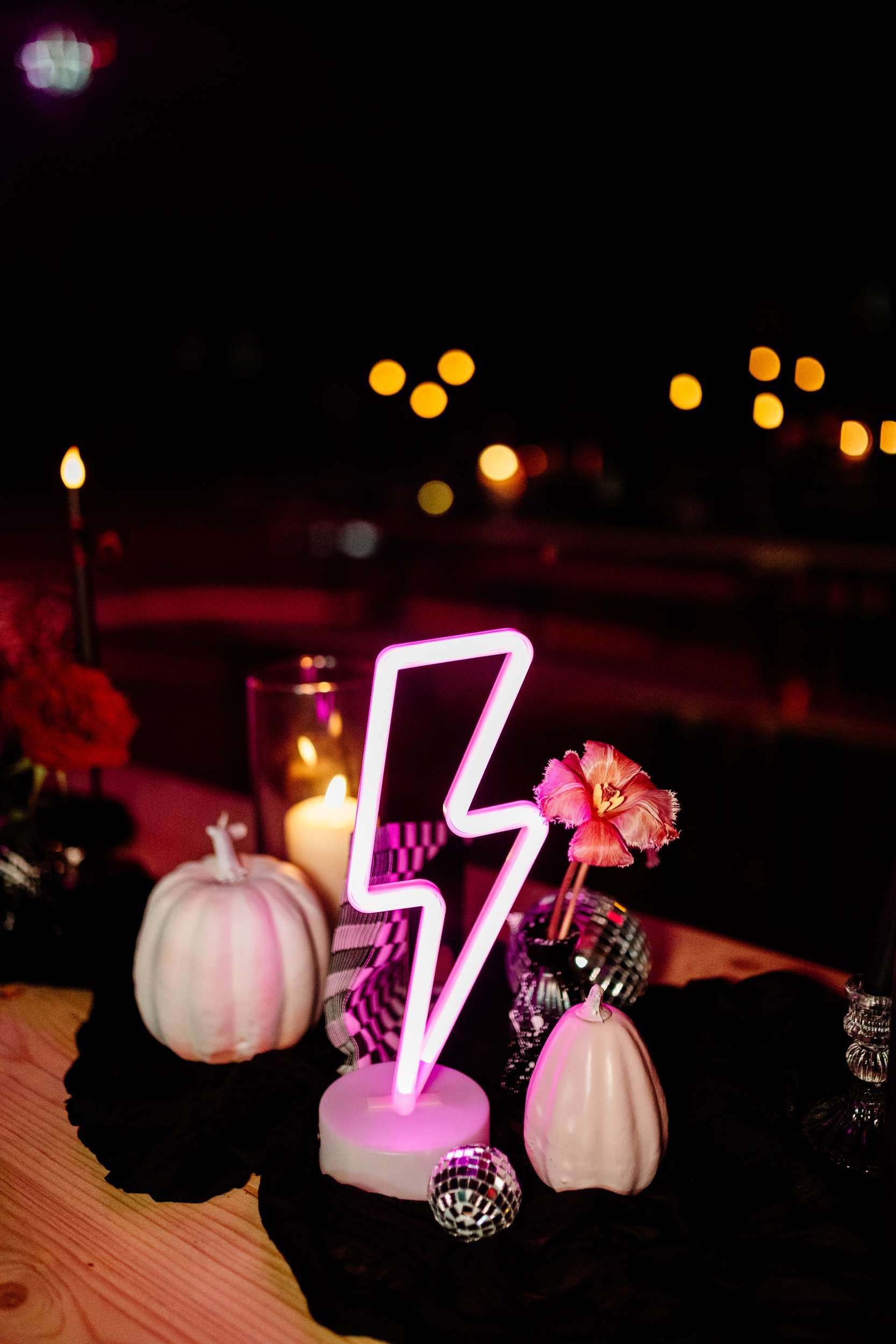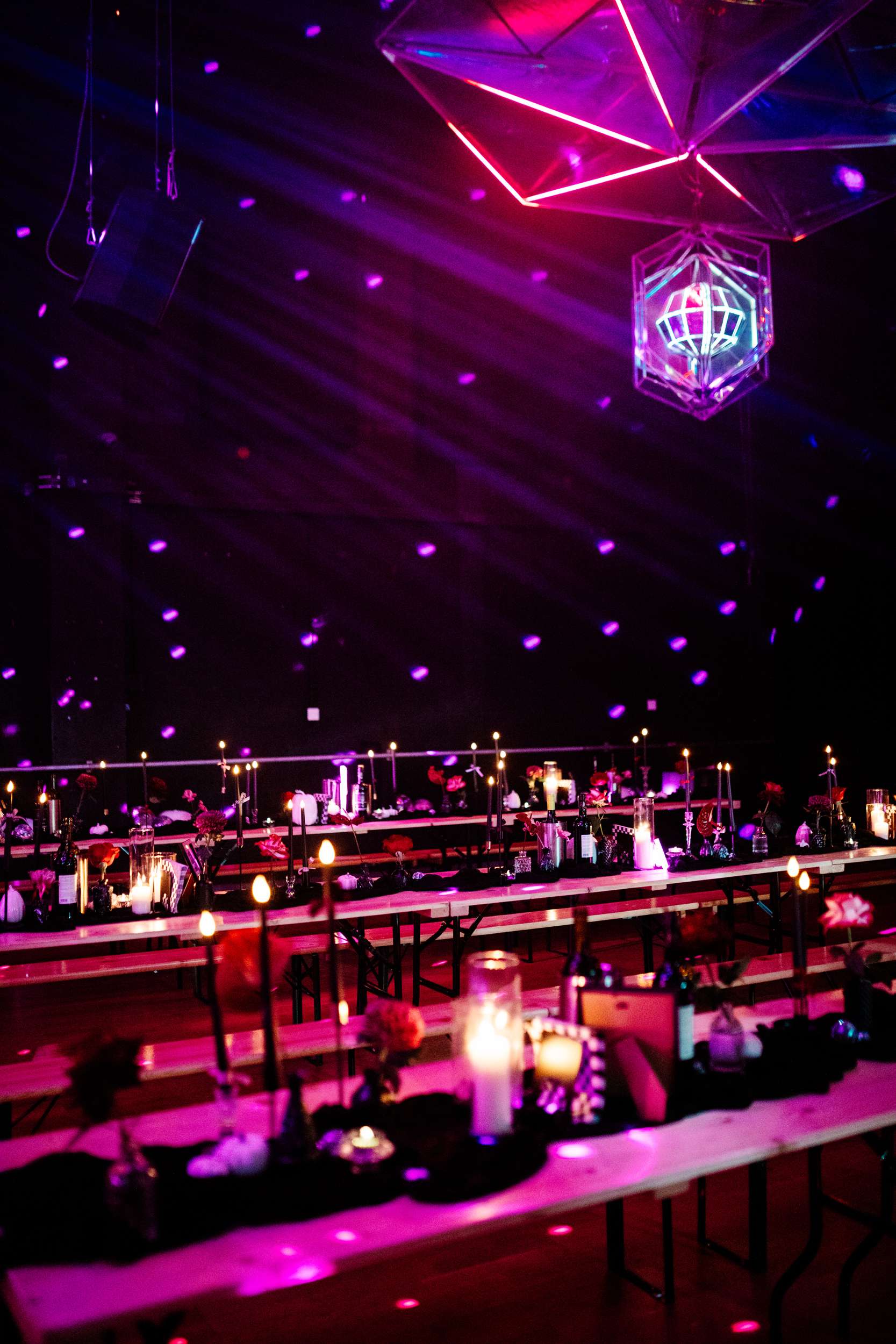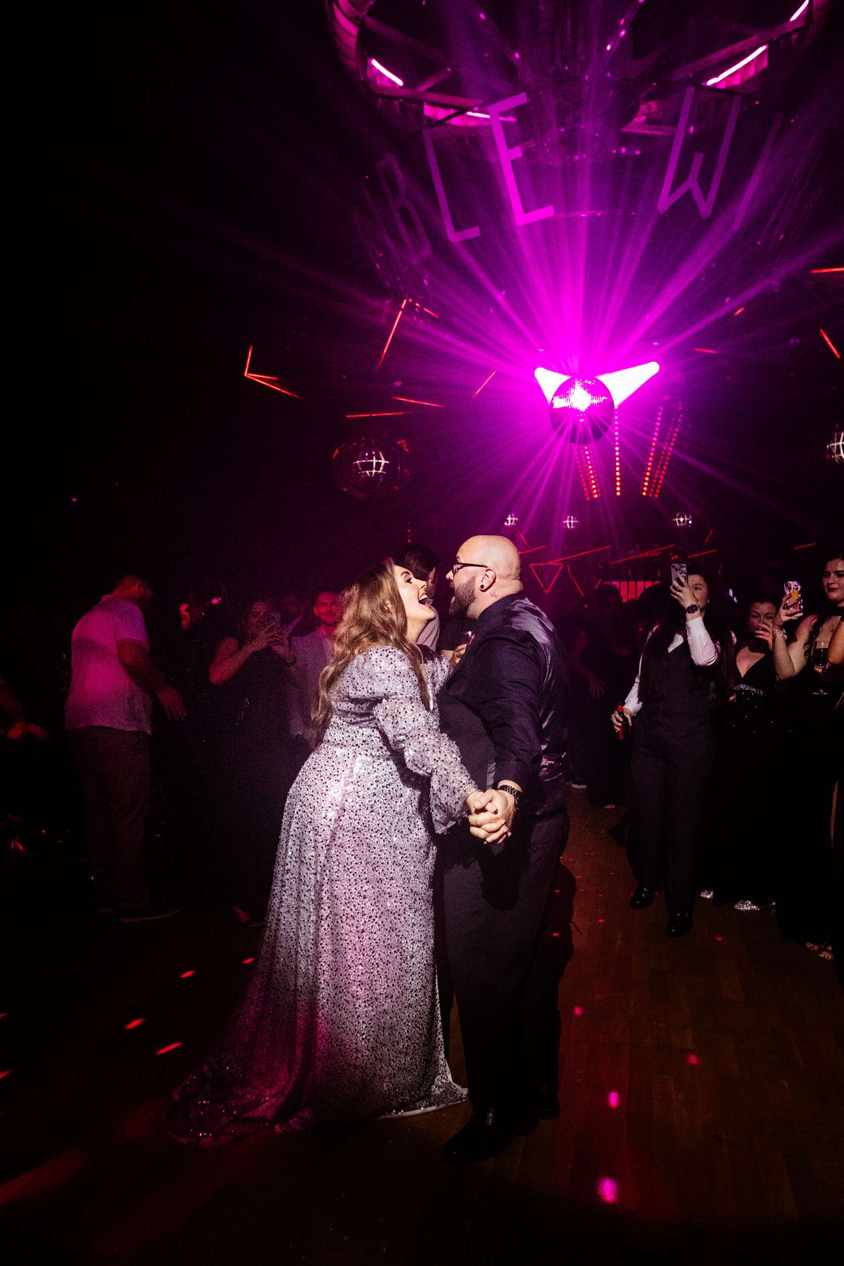 When Lily finished her set, the curtains were opened, revealing the rest of the space. “Our guests gasped, it looked truly amazing!” she continued. “We had four rows of trestle tables with benches for guests to sit at. They were decorated to perfection with black candles, neon lights, disco balls, white pumpkins, checkerboard pumpkins, flowers, leopard print, black table runners and personalised beer mats. We had buckets of booze on every table for people to help themselves. We had a extra large disco ball hanging from the ceiling. There were also four floor to ceiling screens on the stage on which a slideshow of our ceremony photos played all evening.”