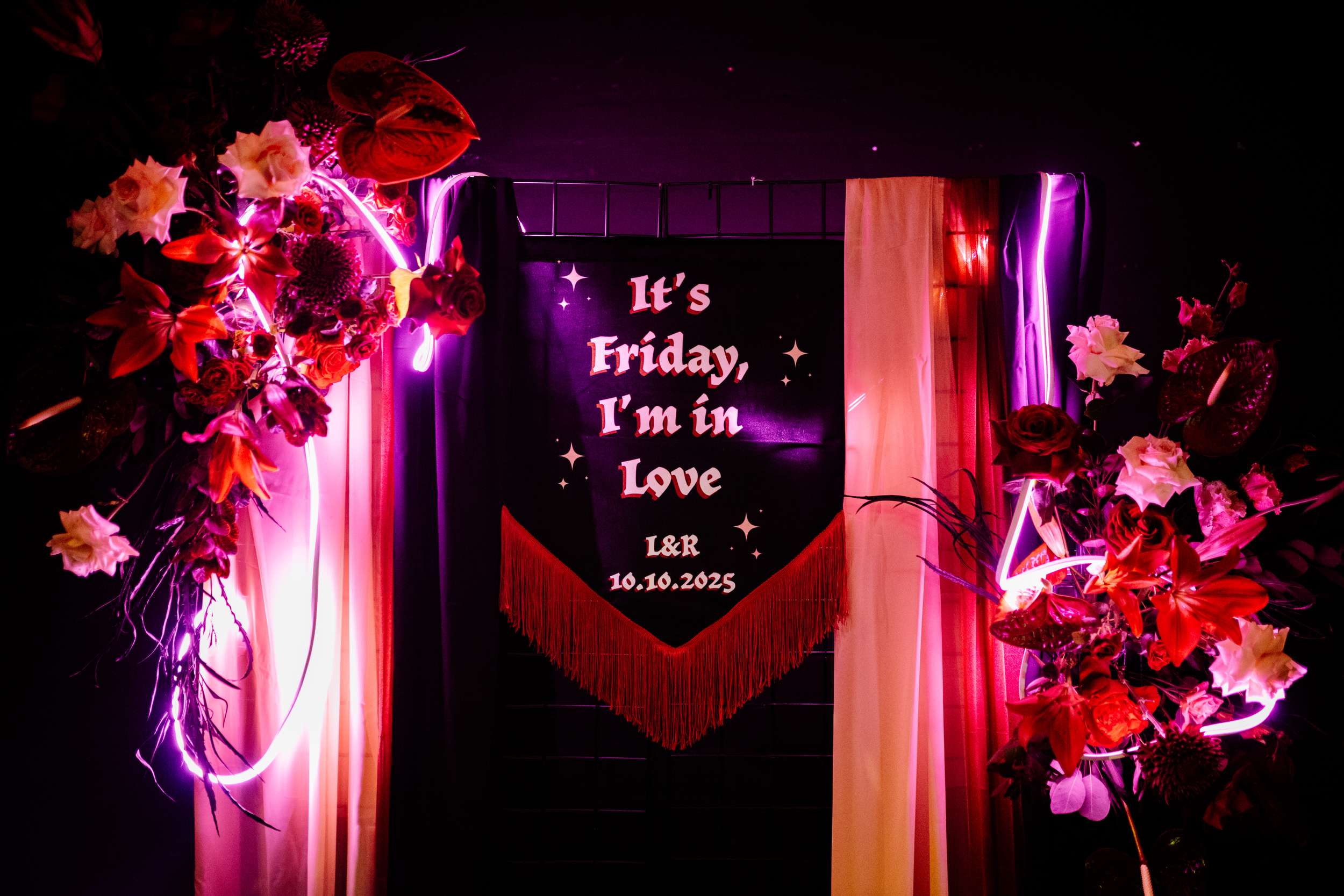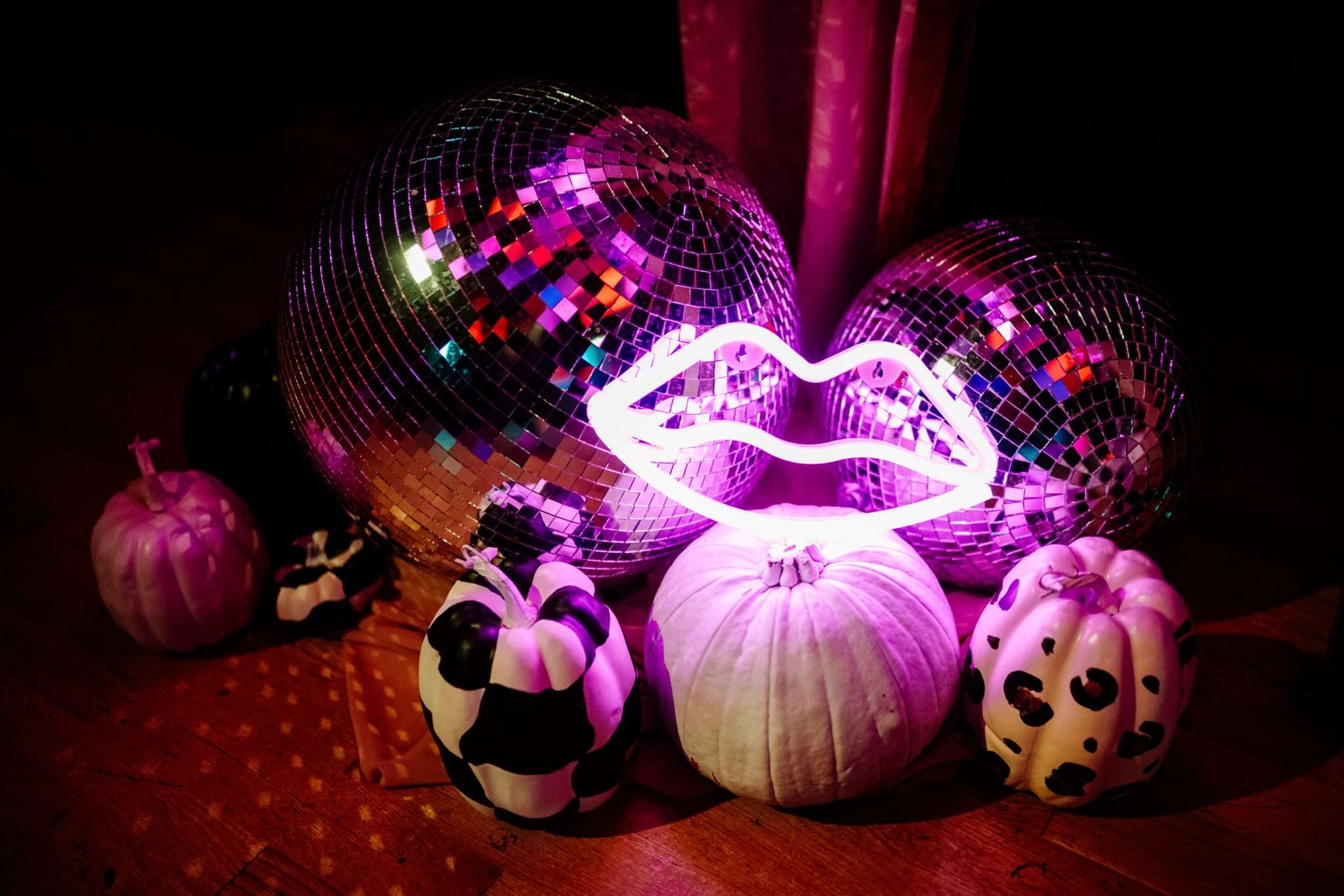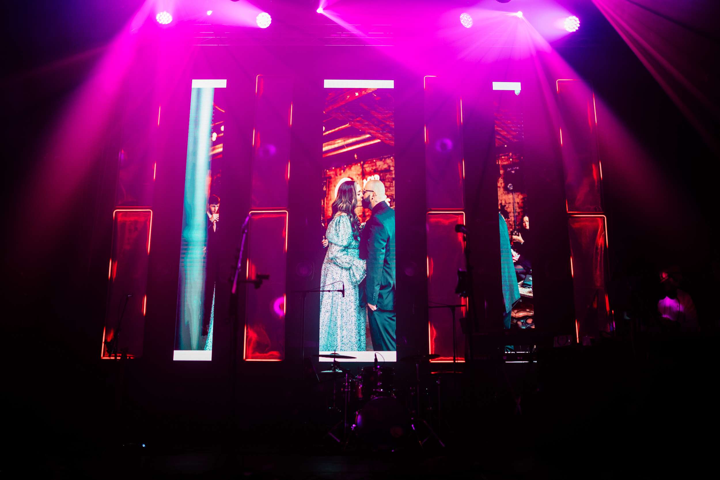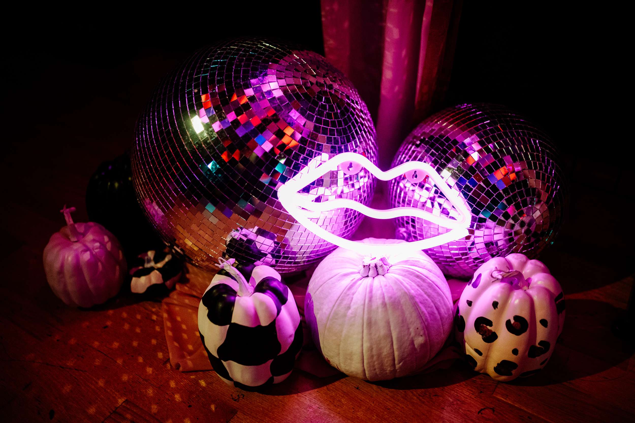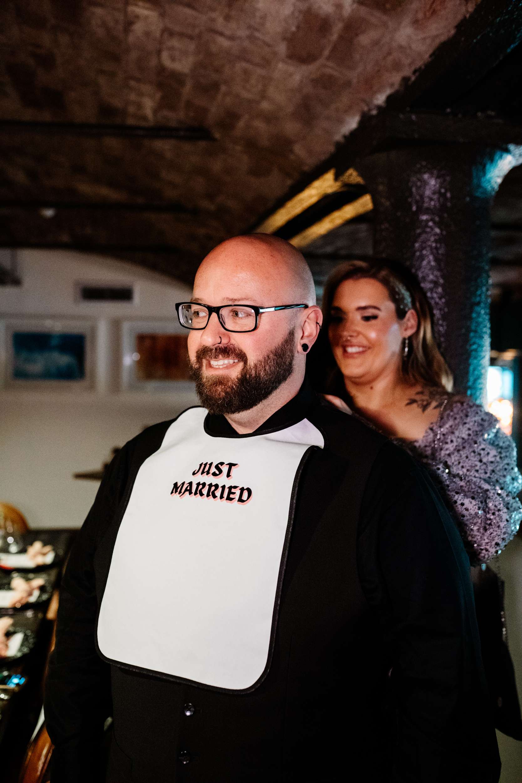 When Lily finished her set, the curtains were opened, revealing the rest of the space. “Our guests gasped, it looked truly amazing!” she continued. “We had four rows of trestle tables with benches for guests to sit at. They were decorated to perfection with black candles, neon lights, disco balls, white pumpkins, checkerboard pumpkins, flowers, leopard print, black table runners and personalised beer mats. We had buckets of booze on every table for people to help themselves. We had a extra large disco ball hanging from the ceiling. There were also four floor to ceiling screens on the stage on which a slideshow of our ceremony photos played all evening.”