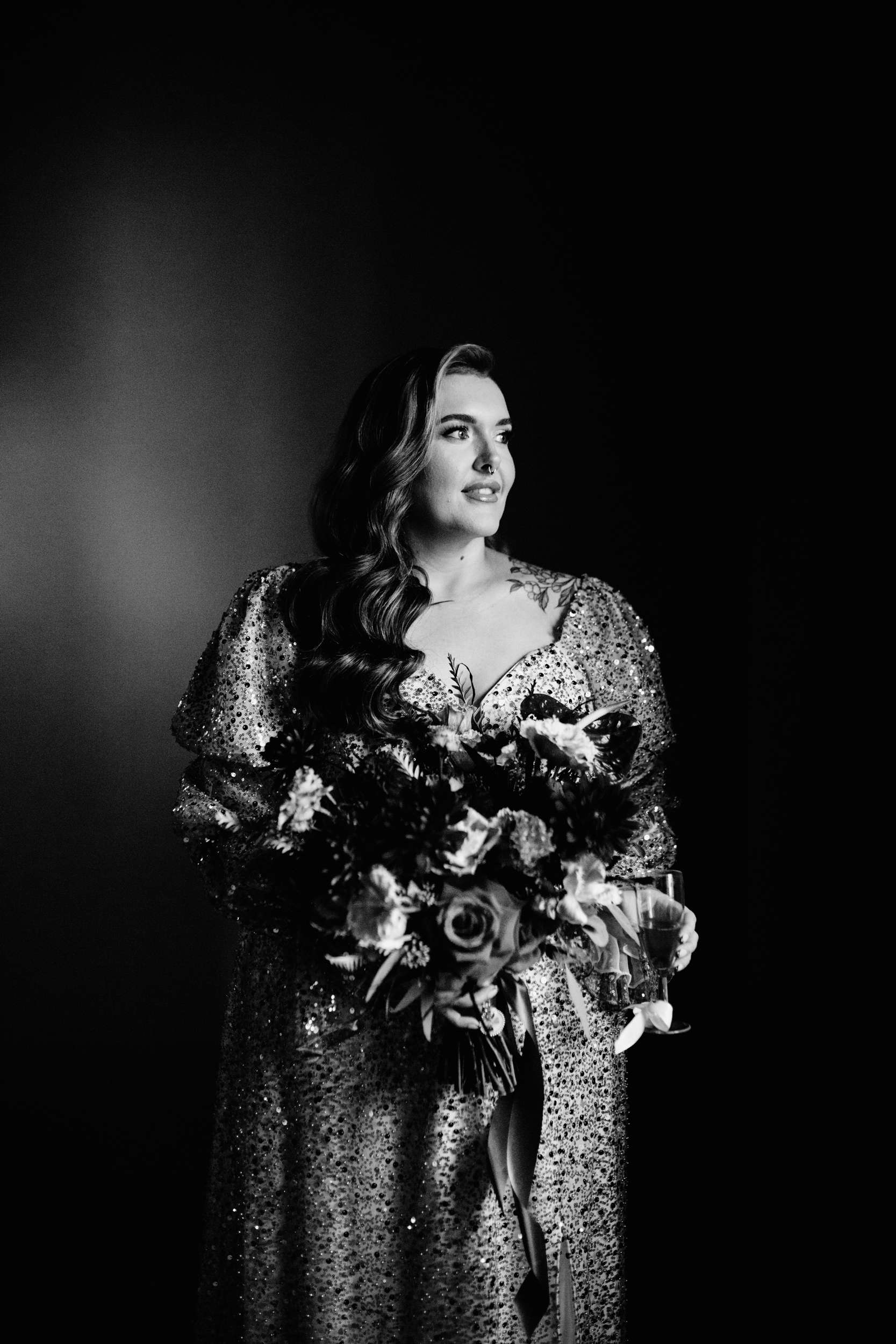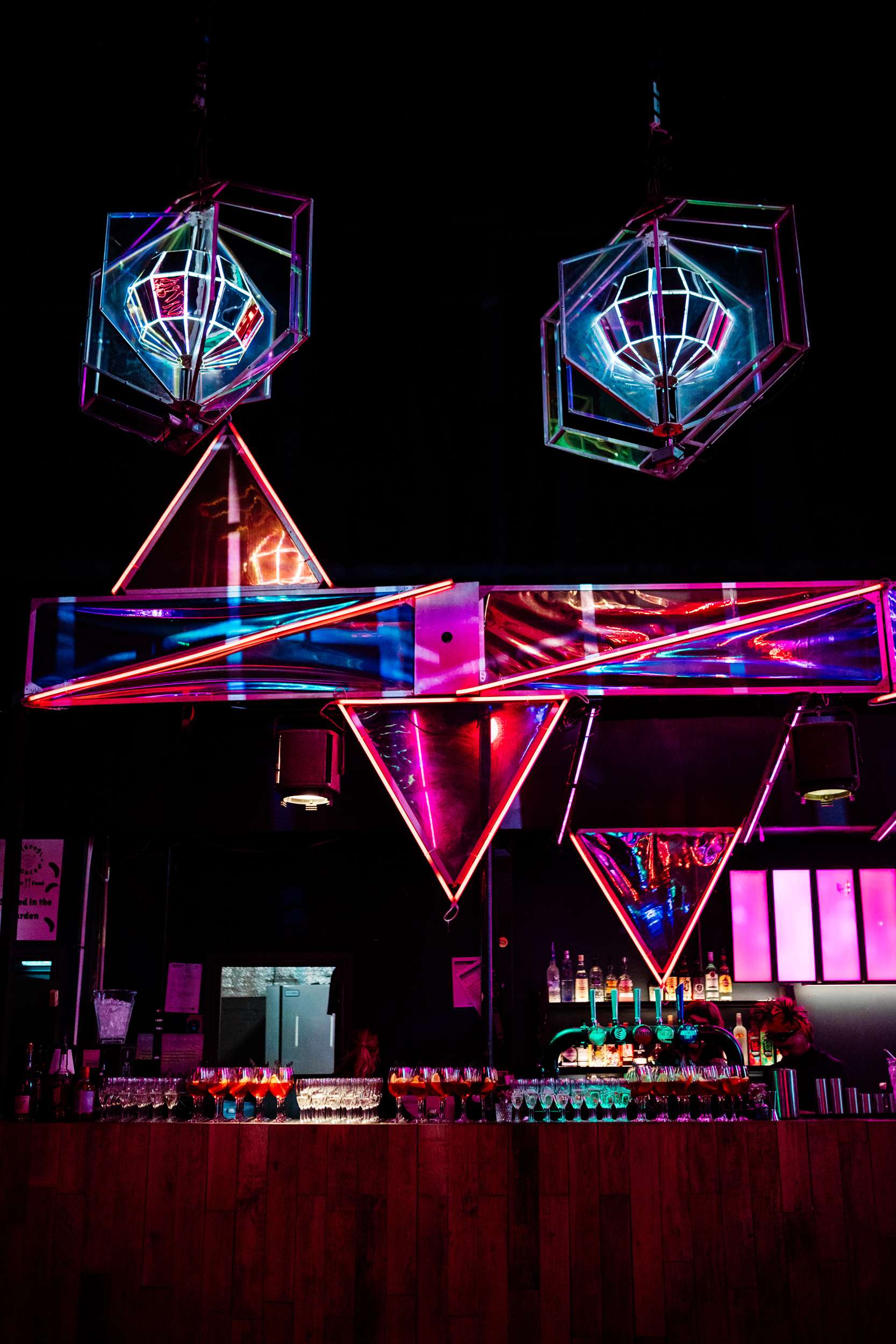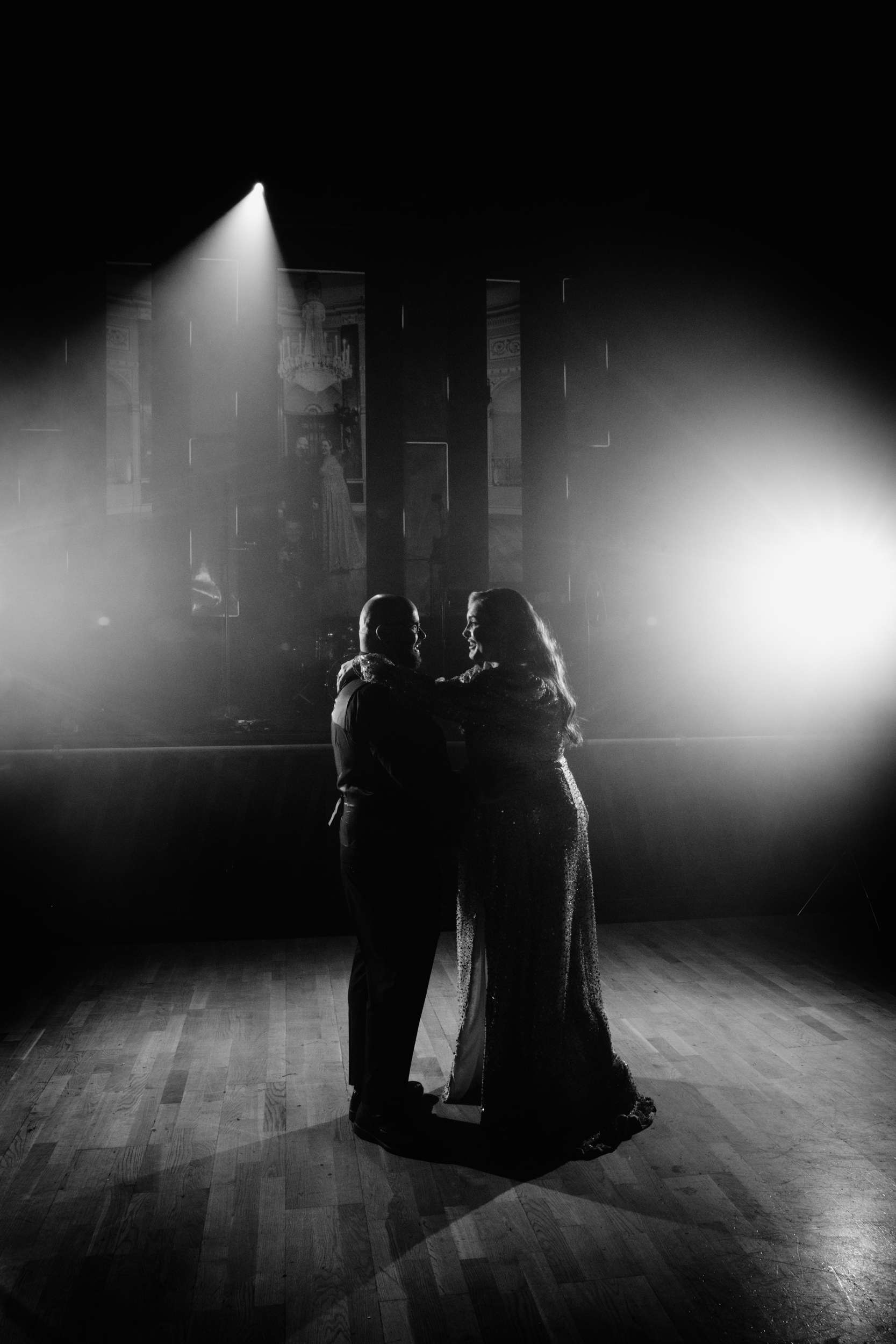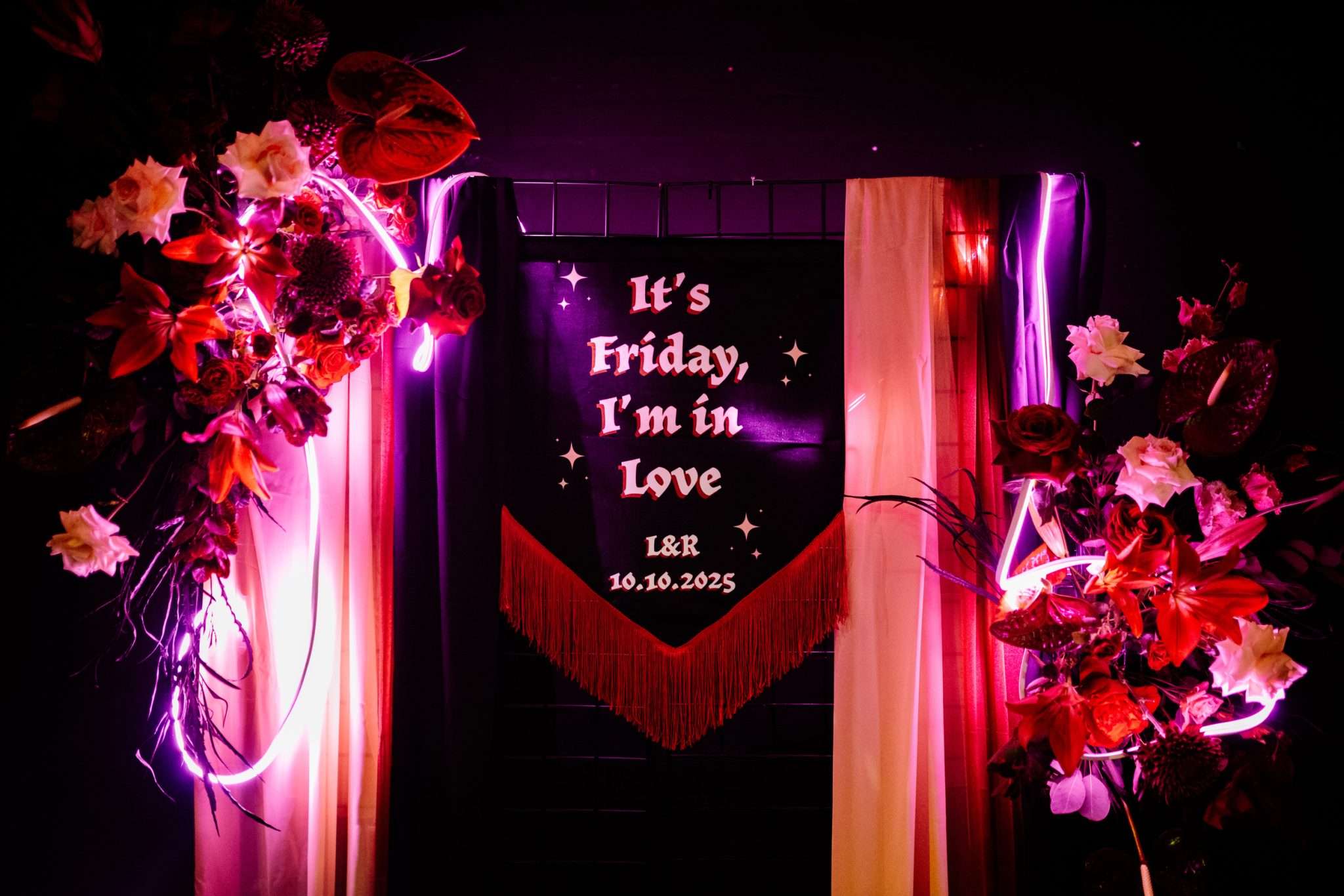 When Lily finished her set, the curtains were opened, revealing the rest of the space. “Our guests gasped, it looked truly amazing!” she continued. “We had four rows of trestle tables with benches for guests to sit at. They were decorated to perfection with black candles, neon lights, disco balls, white pumpkins, checkerboard pumpkins, flowers, leopard print, black table runners and personalised beer mats. We had buckets of booze on every table for people to help themselves. We had a extra large disco ball hanging from the ceiling. There were also four floor to ceiling screens on the stage on which a slideshow of our ceremony photos played all evening.”