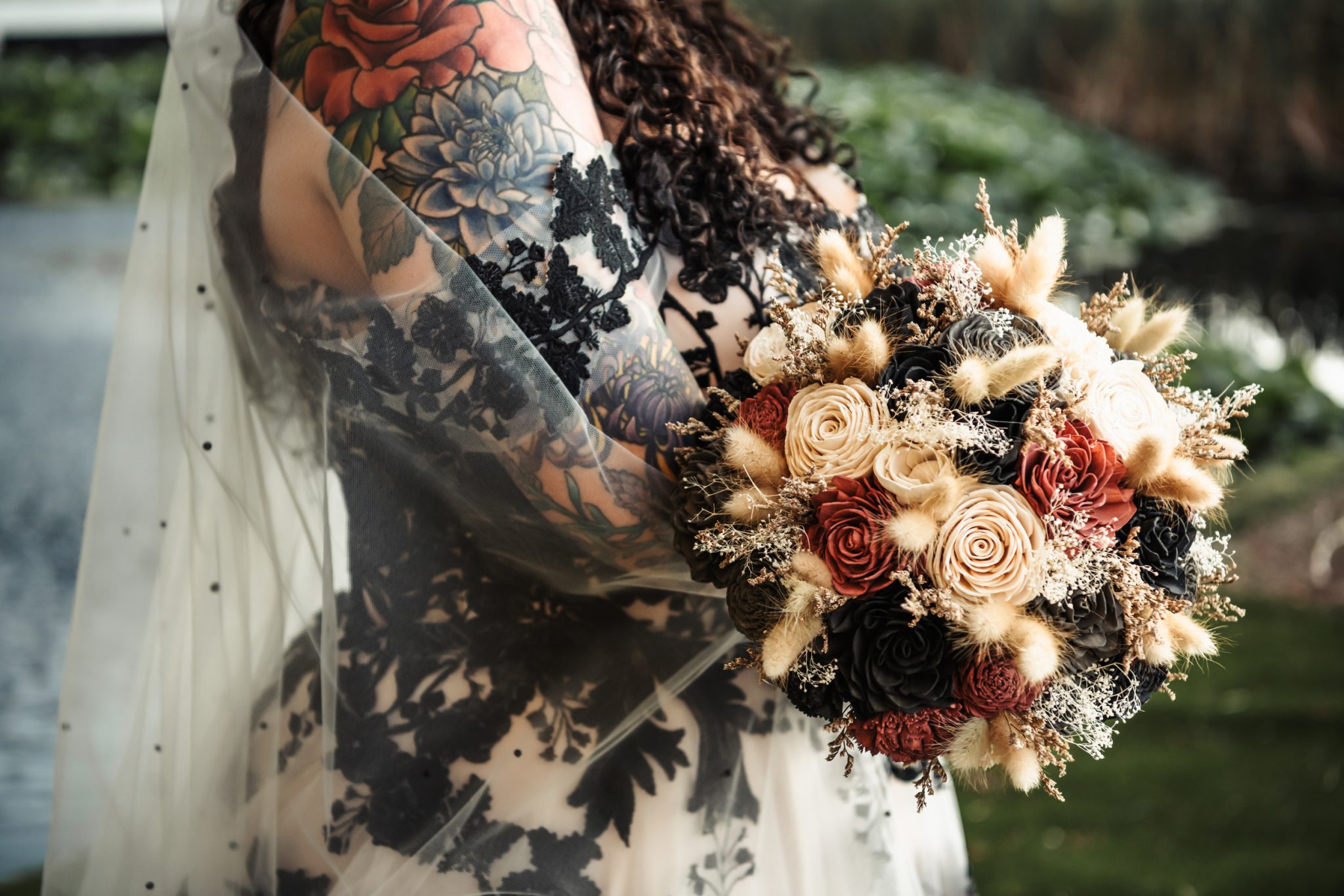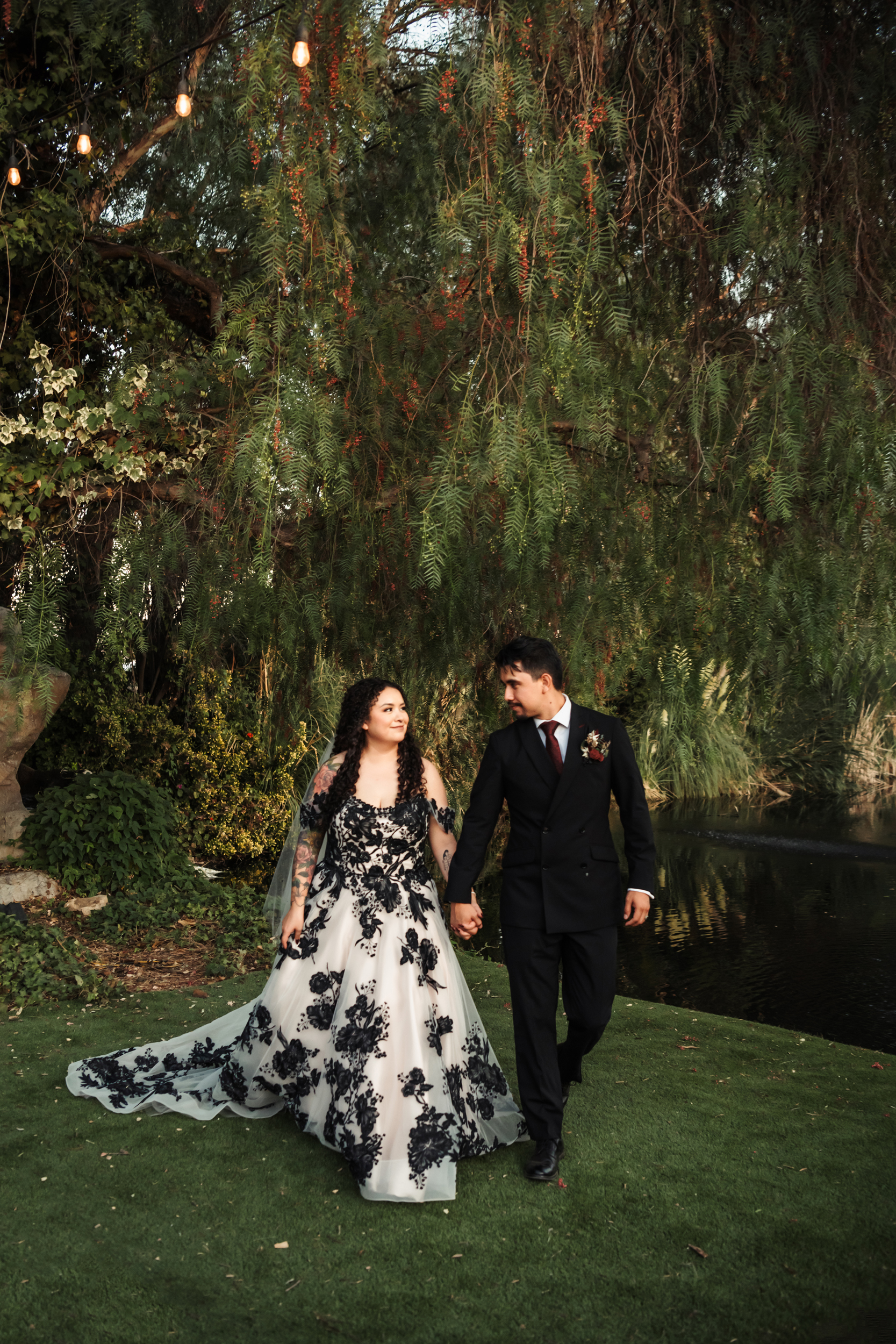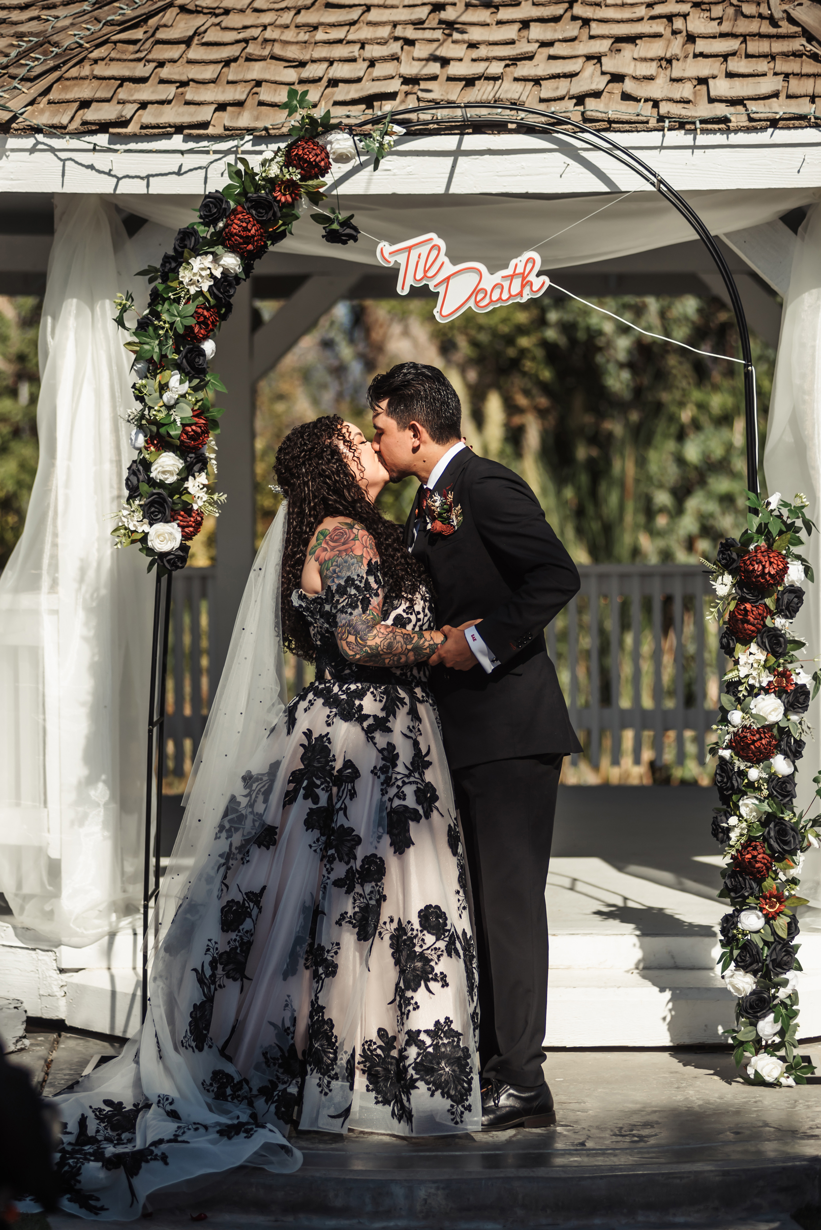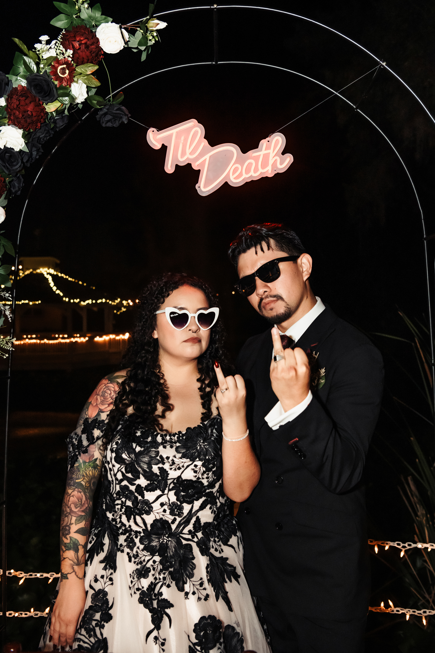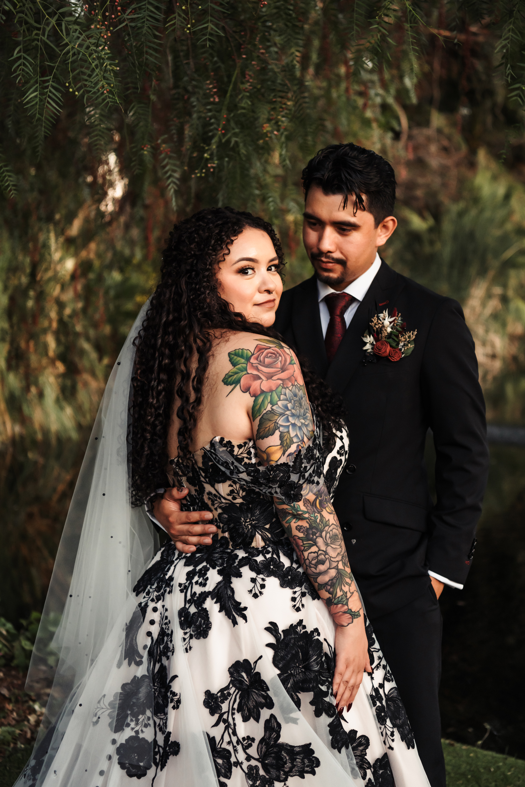 A traditional, all-white wedding was never on the cards for Stephanie and Ernesto. The couple based the day around Warped Tour, as well as all the other concerts they’ve been to over the years. The bride initially didn’t want to wear a white dress, but when she found one which was white, but with black lace accents, it just felt right. “We are elder emos and knew from the beginning that we wanted a rock festival theme,” she said.
