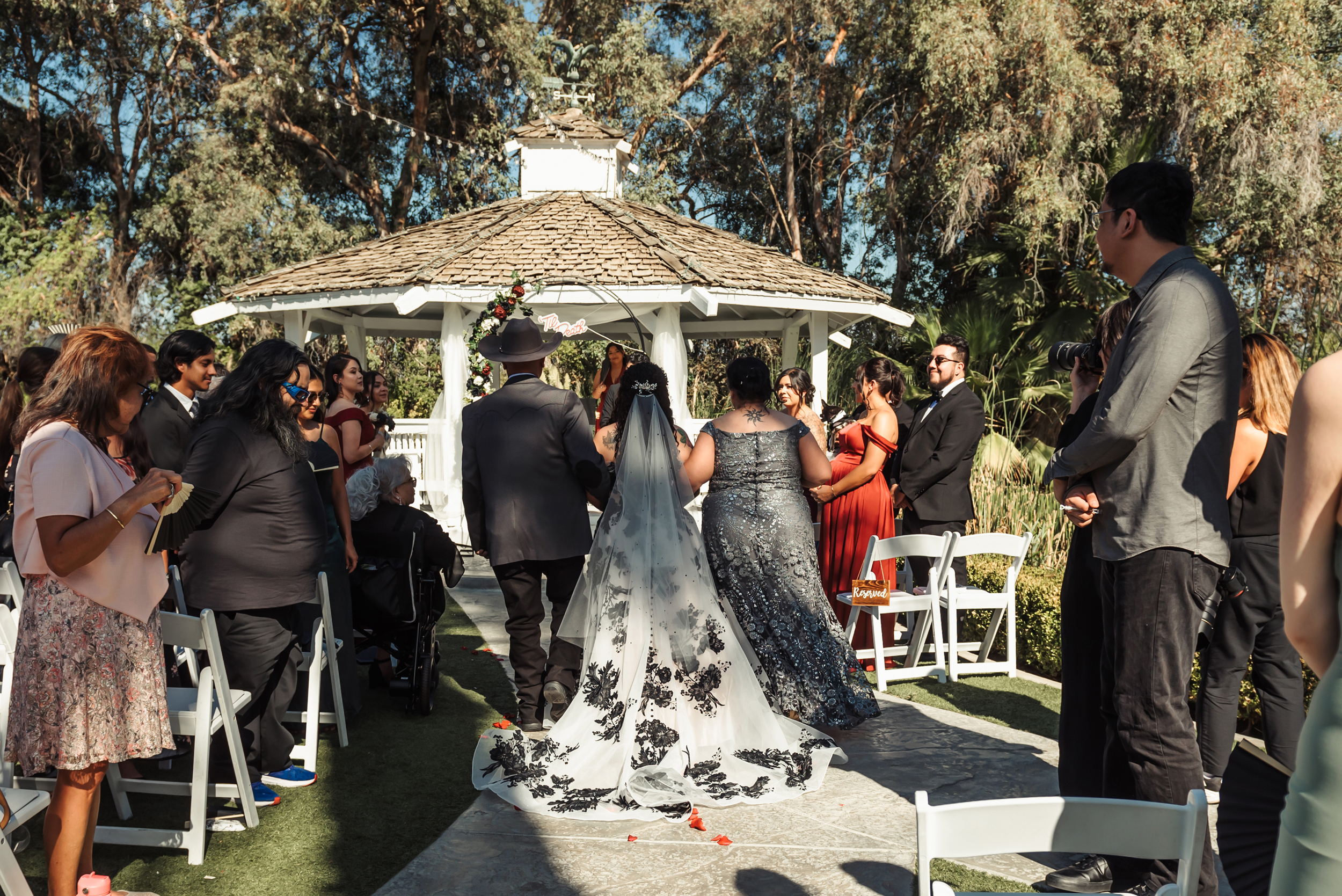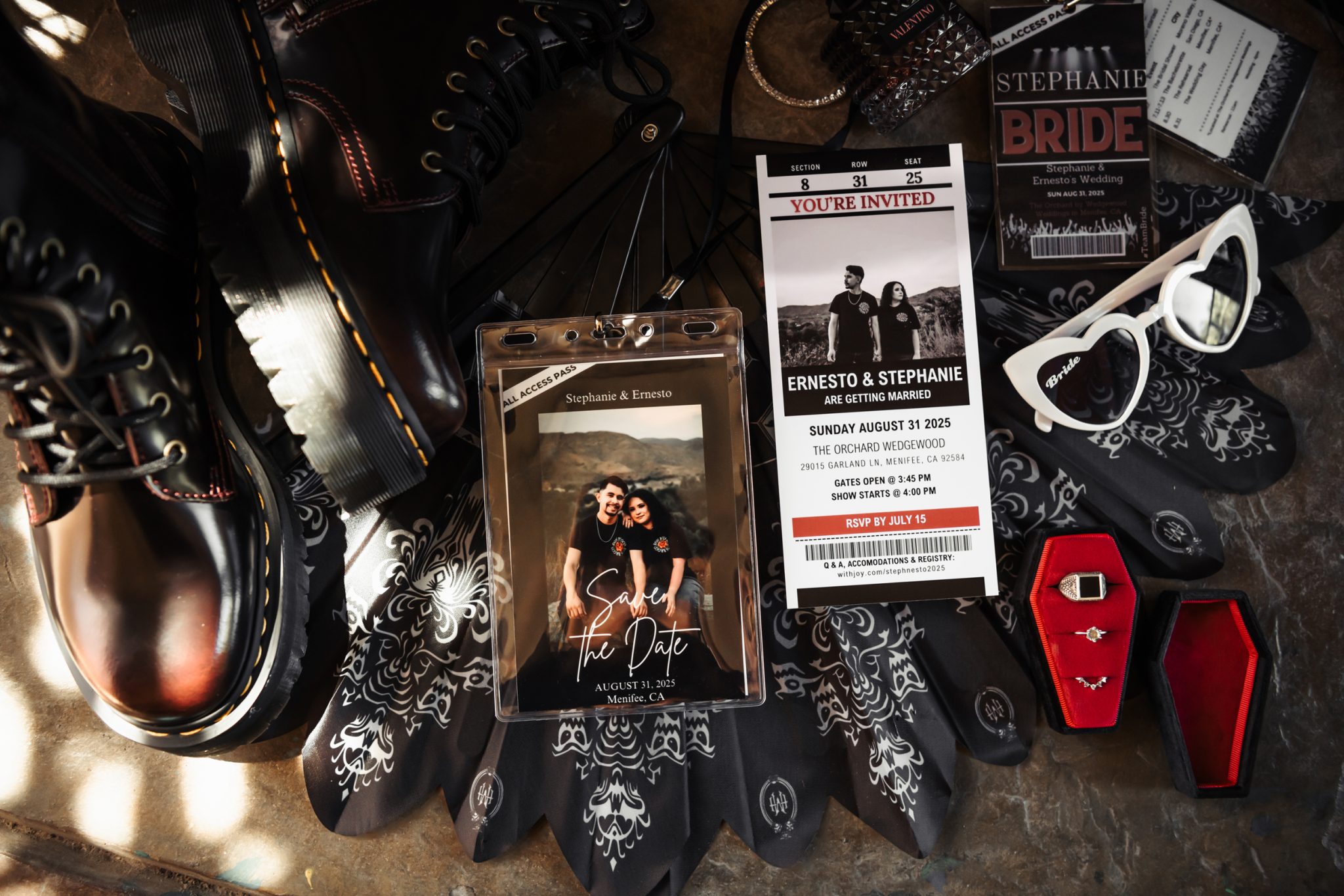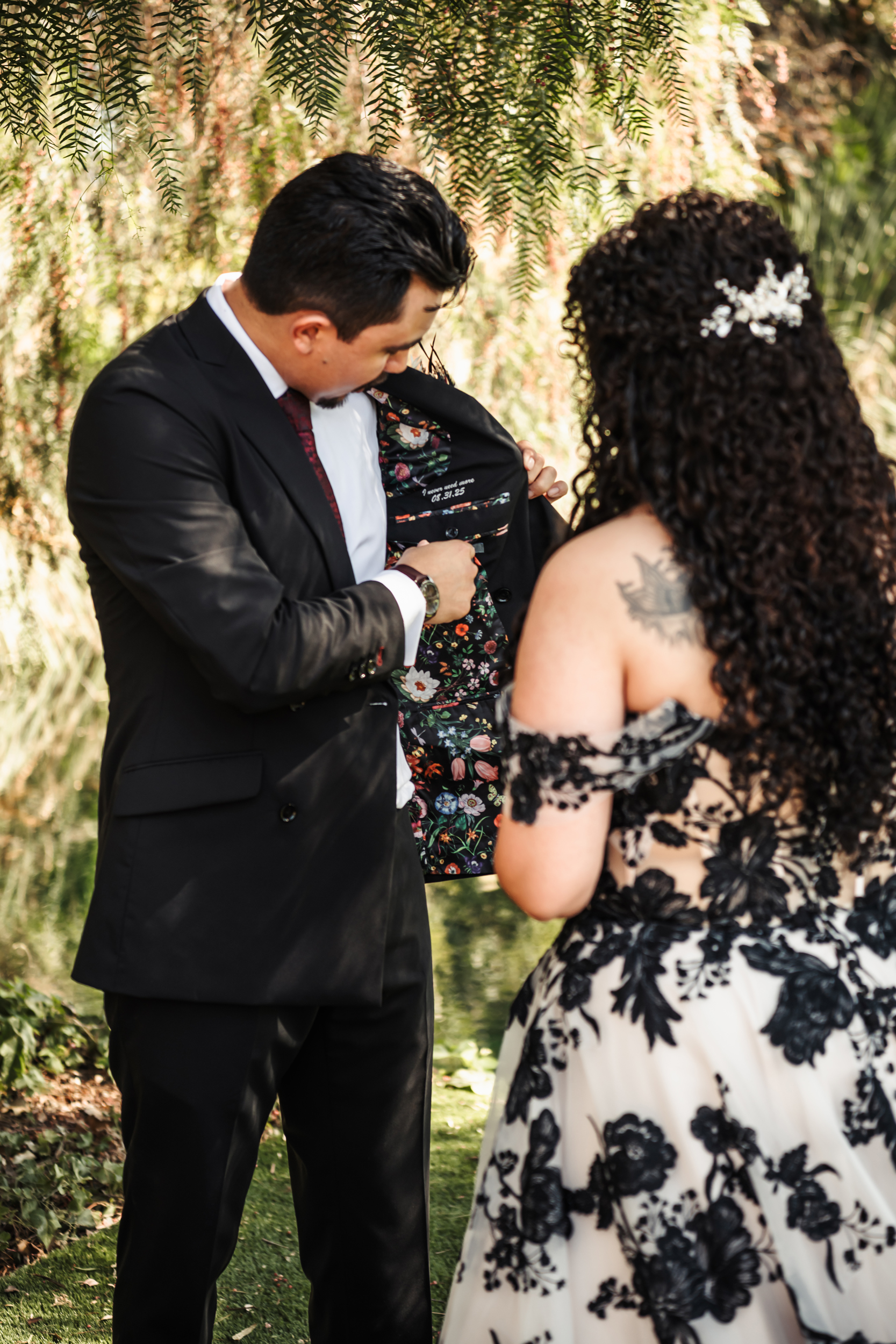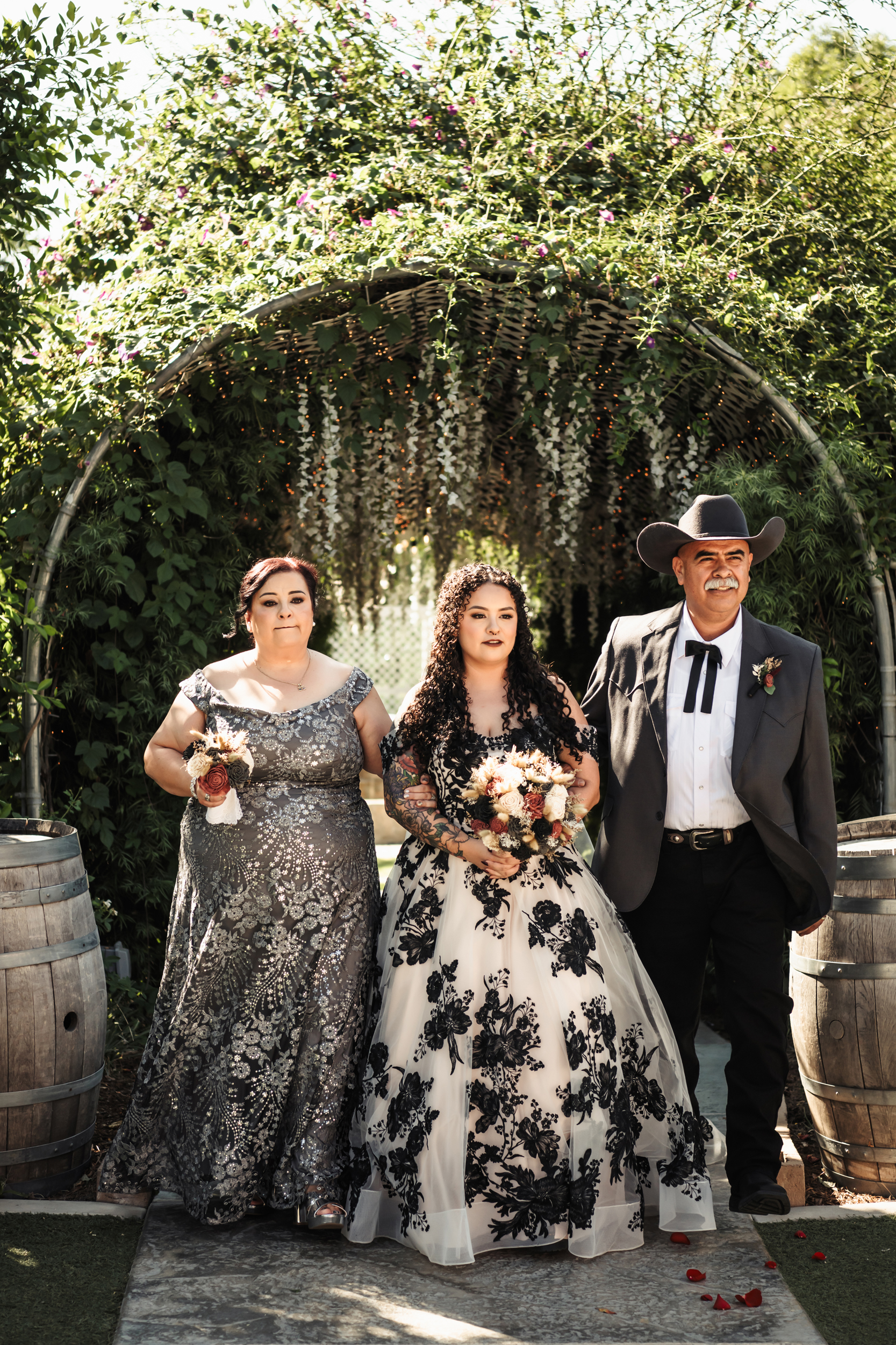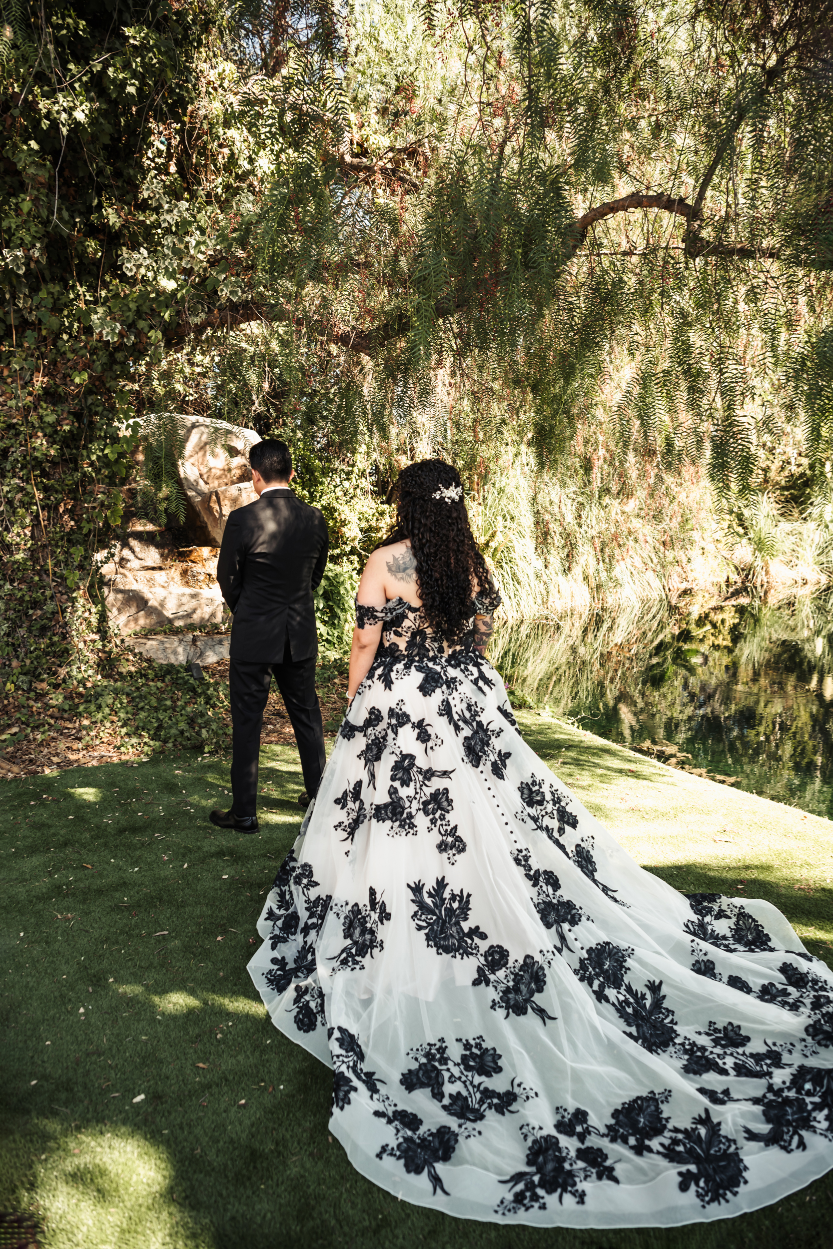 A traditional, all-white wedding was never on the cards for Stephanie and Ernesto. The couple based the day around Warped Tour, as well as all the other concerts they’ve been to over the years. The bride initially didn’t want to wear a white dress, but when she found one which was white, but with black lace accents, it just felt right. “We are elder emos and knew from the beginning that we wanted a rock festival theme,” she said.