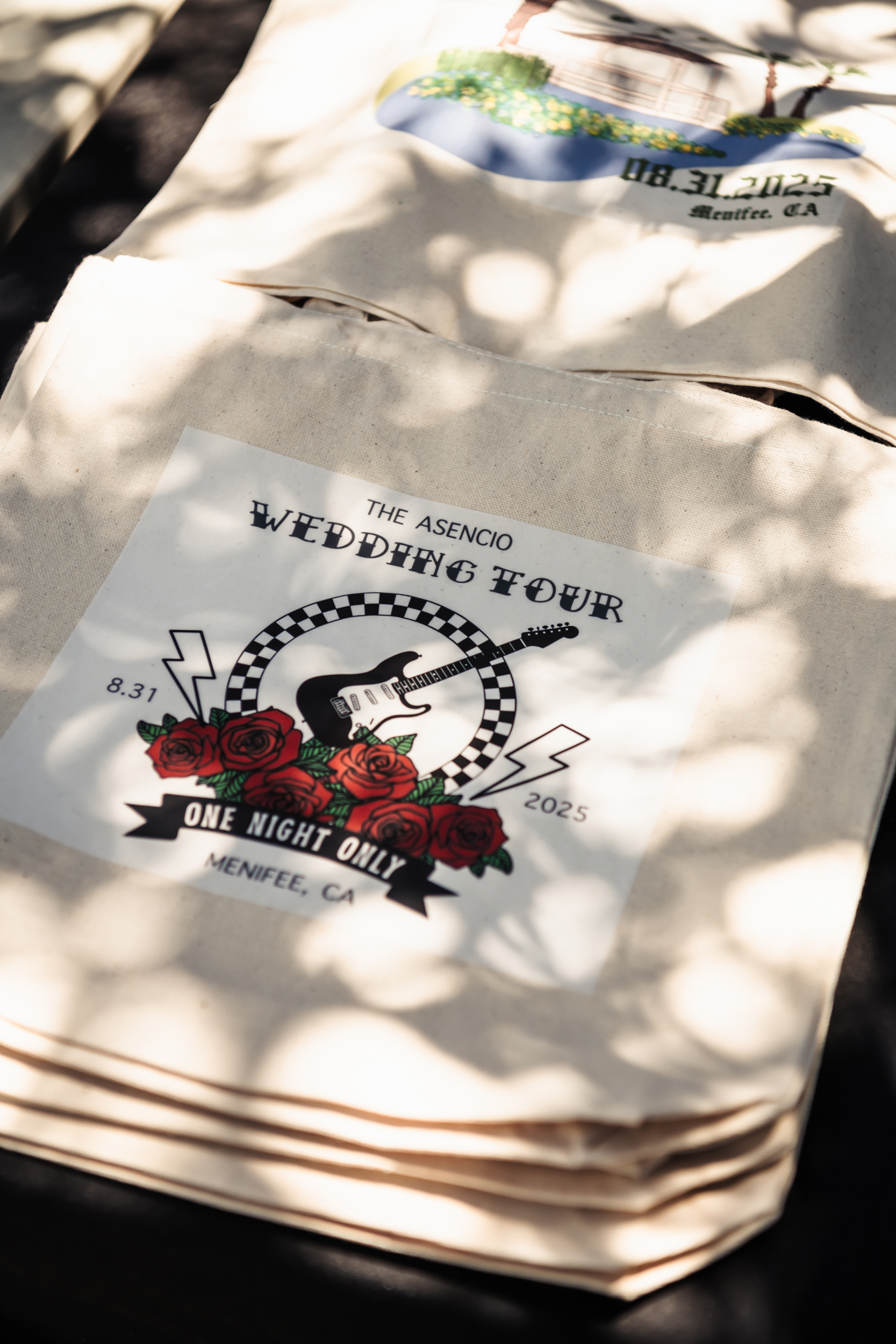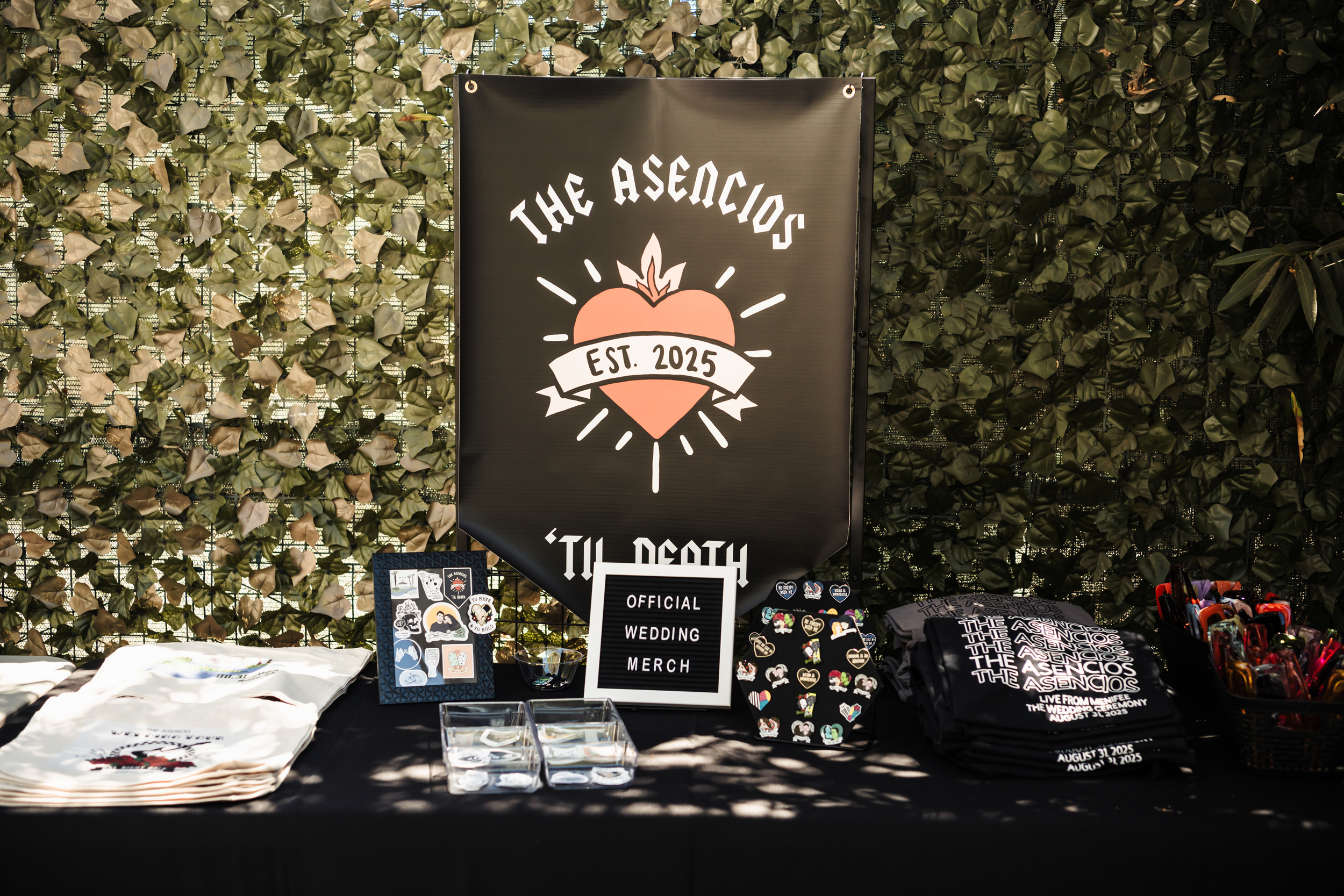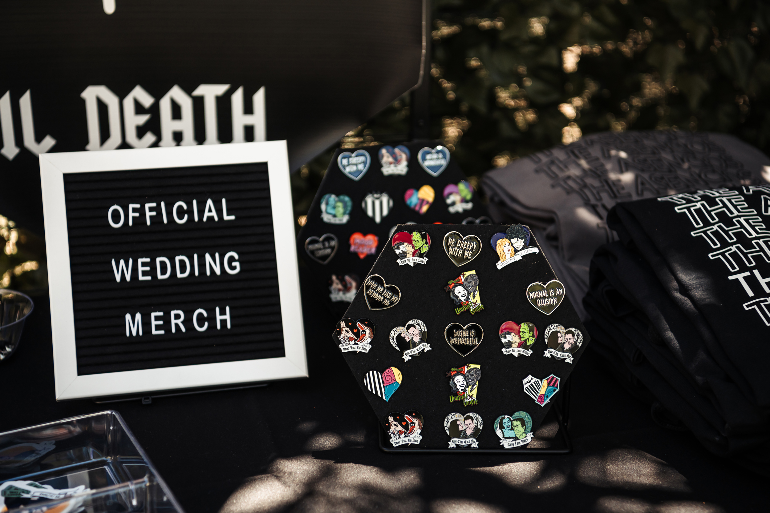 Instead of traditional favours, they set up a merch table stocked with t-shirts, tote bags, stickers, pins and sunglasses, all designed by Steph. “Whenever we’ve gone to concerts, we always get merch, specifically band shirts to take home, so we wanted our guests to be able to take home some of their own merch from our wedding.”