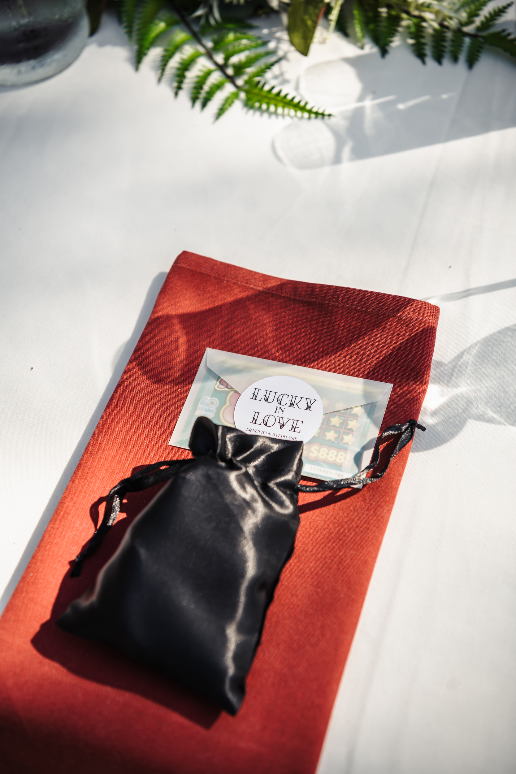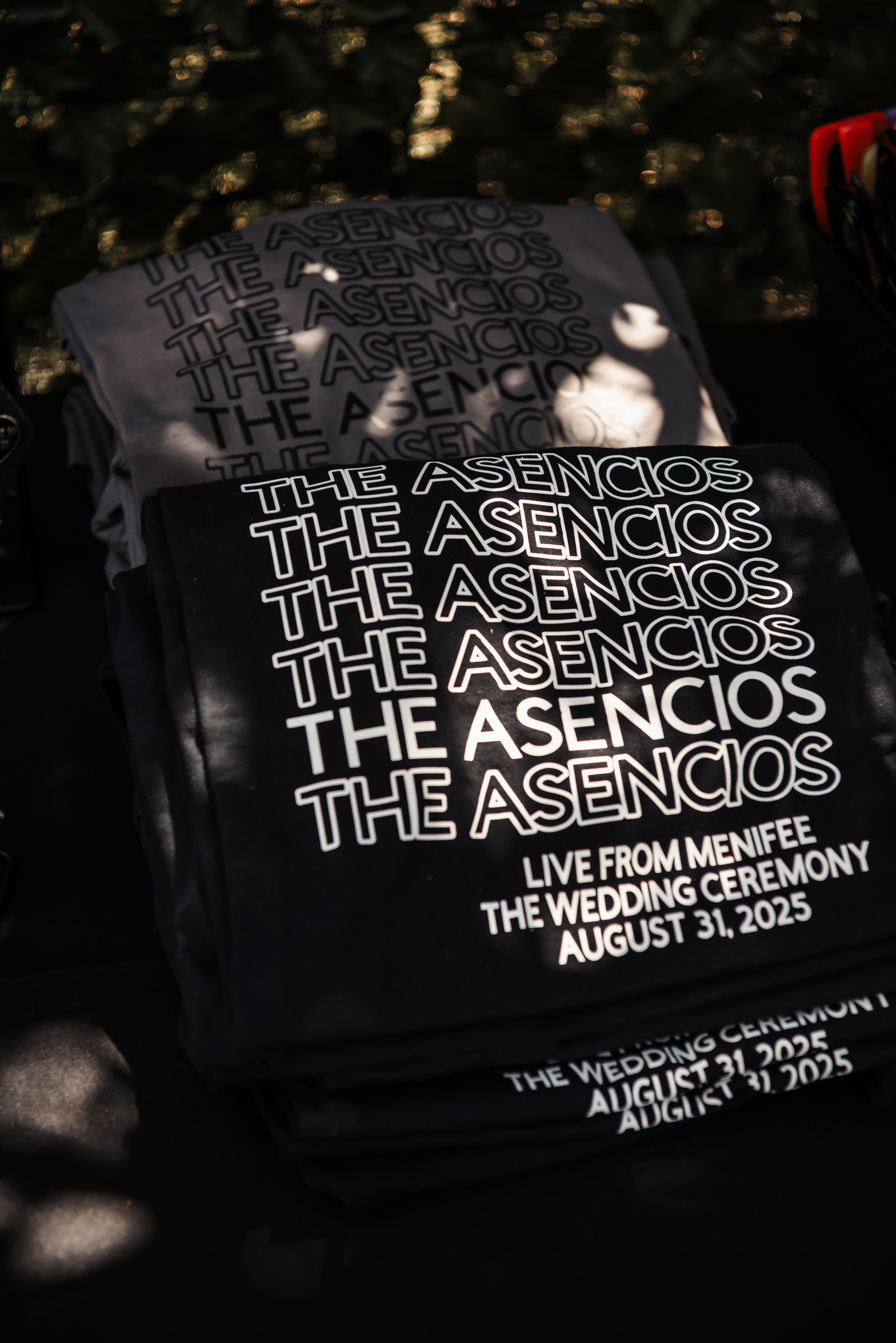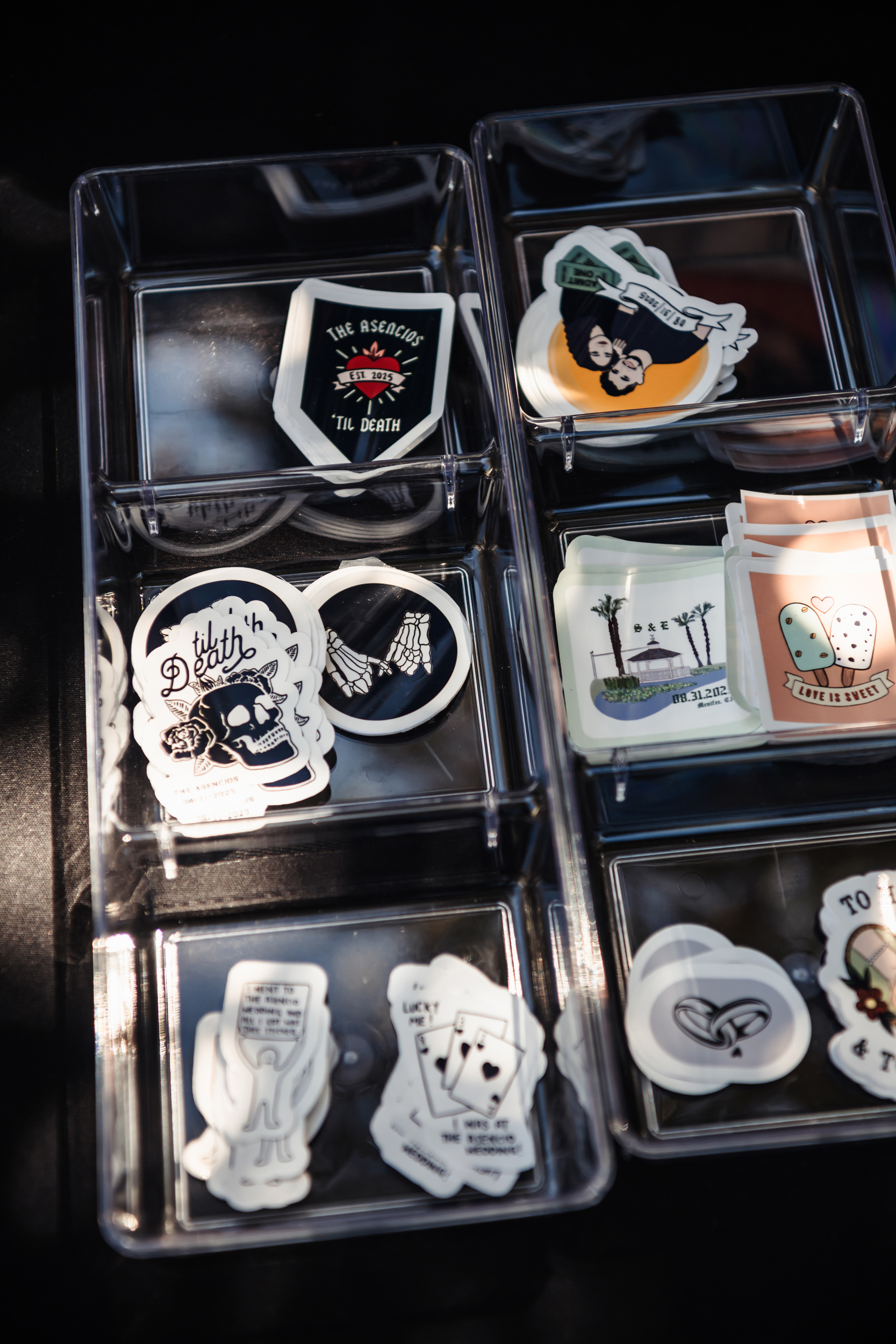 Instead of traditional favours, they set up a merch table stocked with t-shirts, tote bags, stickers, pins and sunglasses, all designed by Steph. “Whenever we’ve gone to concerts, we always get merch, specifically band shirts to take home, so we wanted our guests to be able to take home some of their own merch from our wedding.”