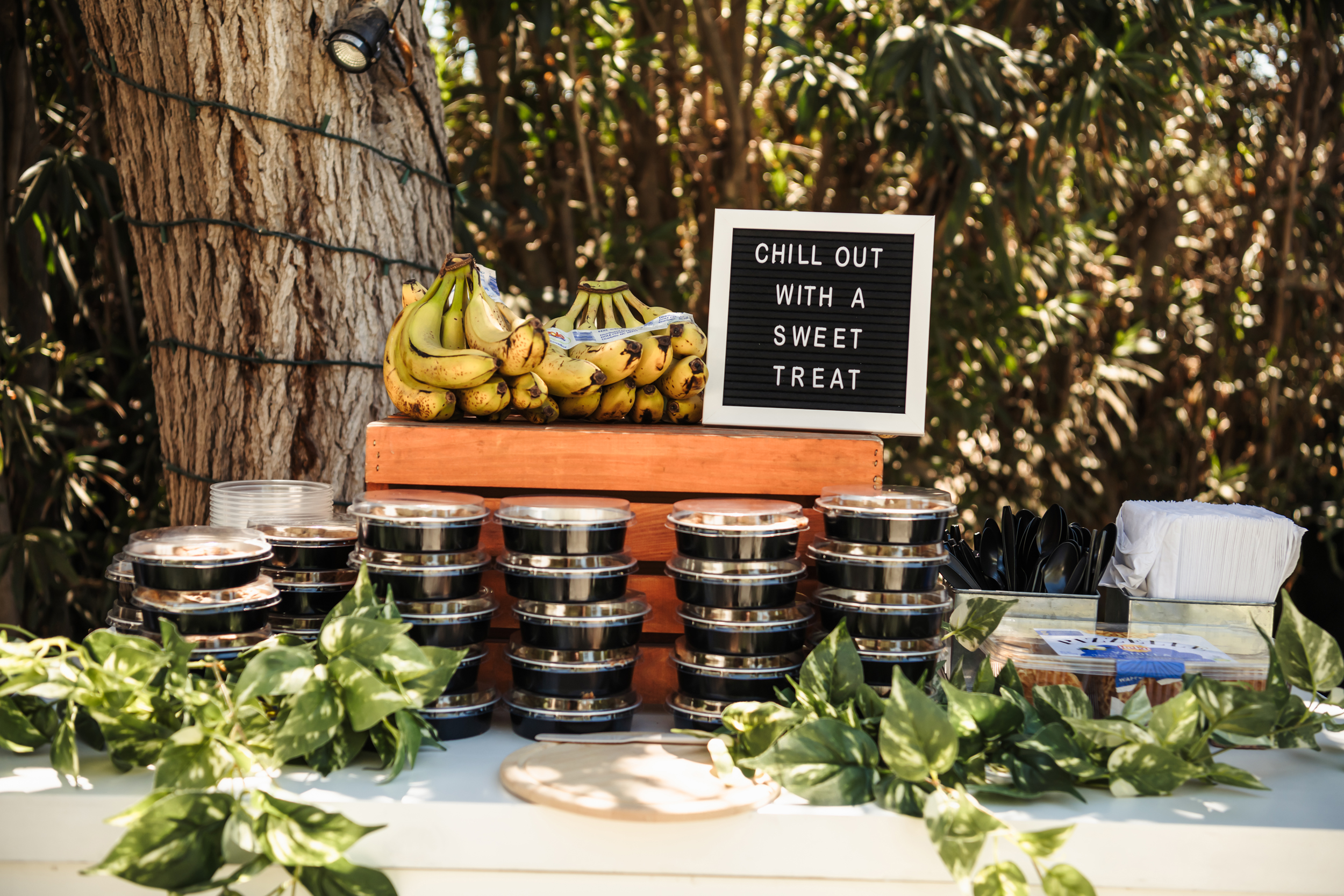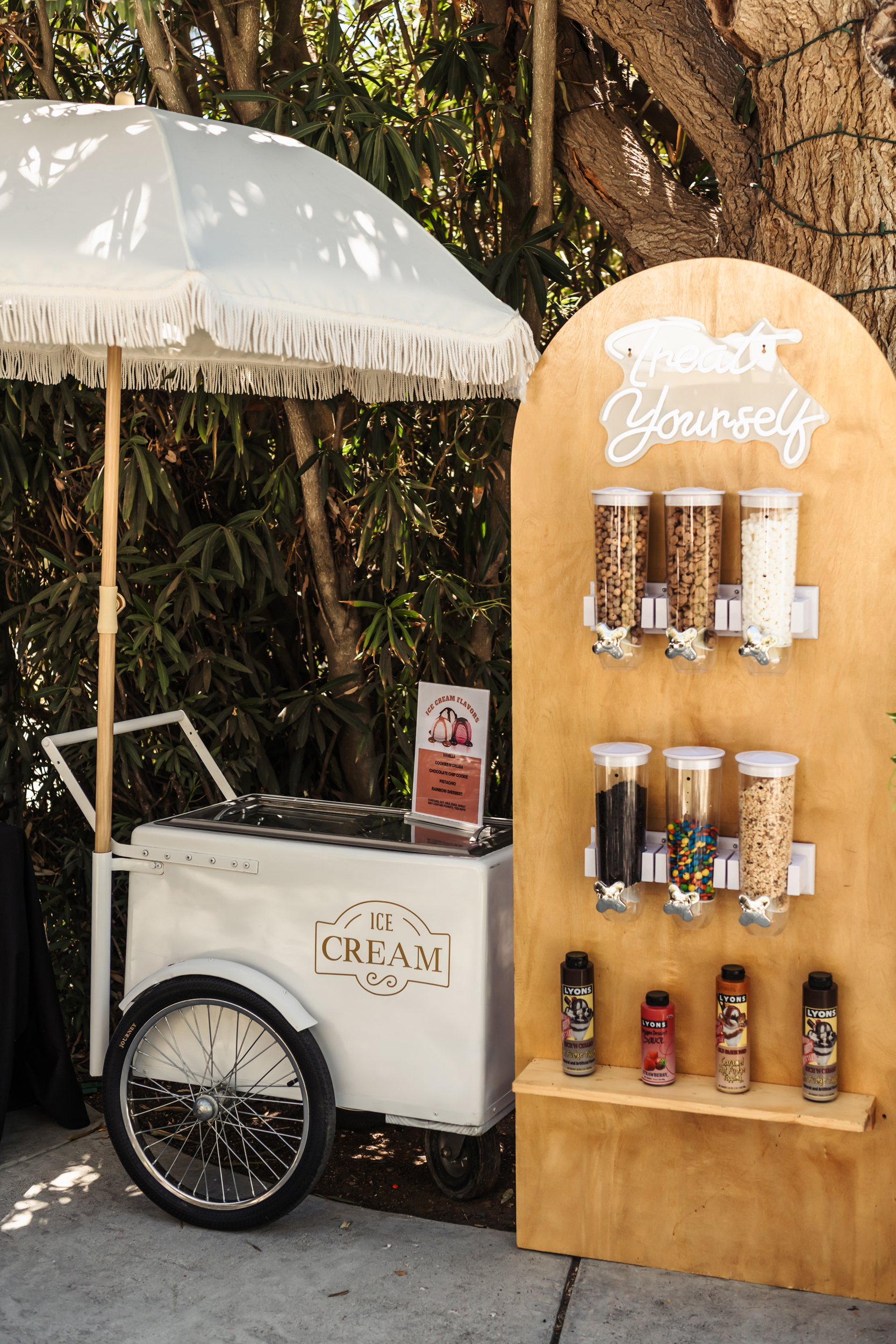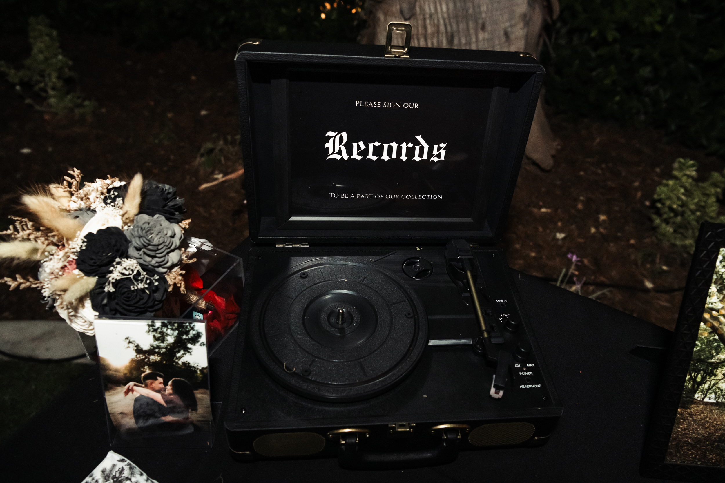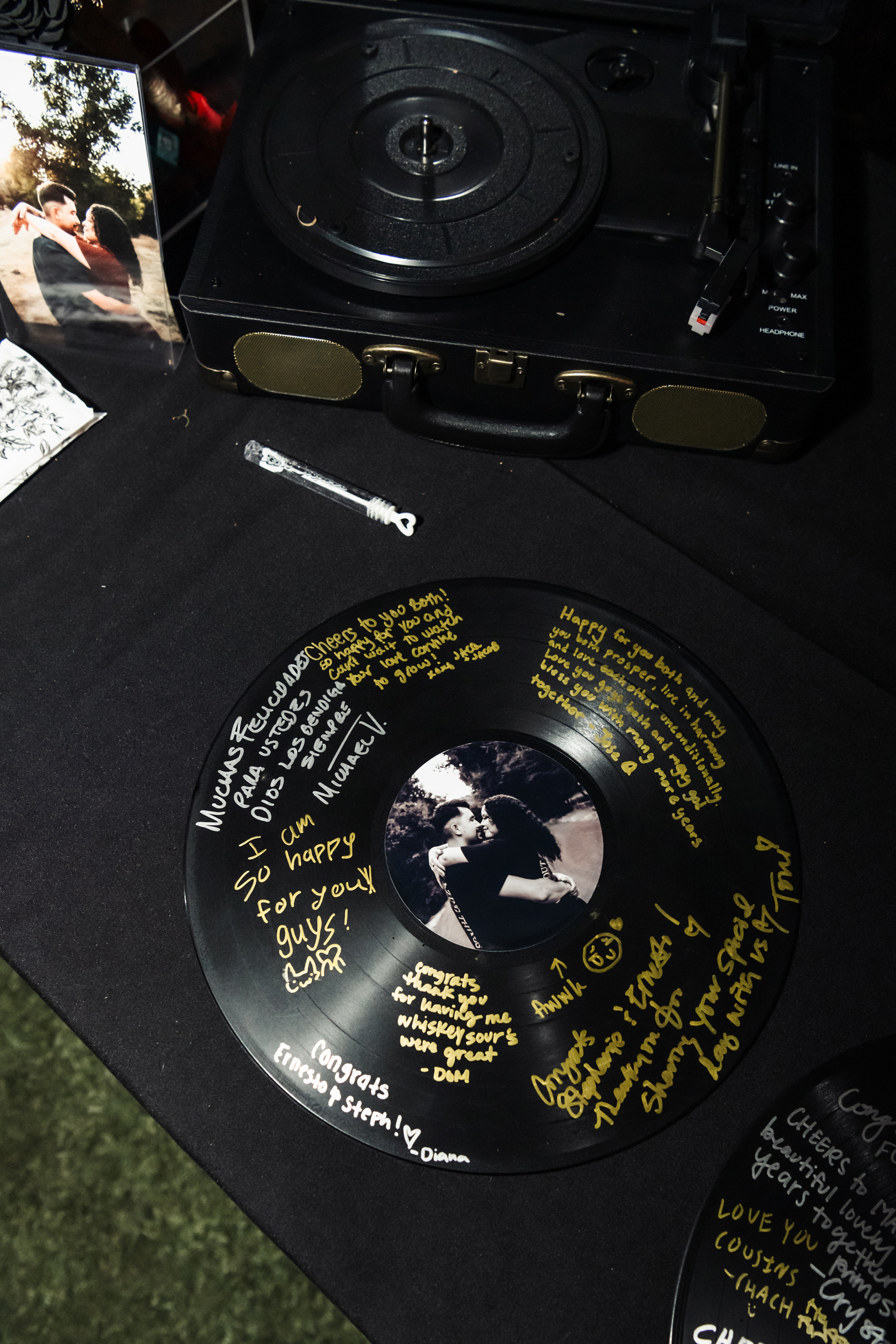 There was no bouquet toss or garter toss and instead of cake they had an ice cream cart where guests could choose their own toppings. The guest book was replaced with handmade records printed with their photos, which they then displayed in their home afterwards.