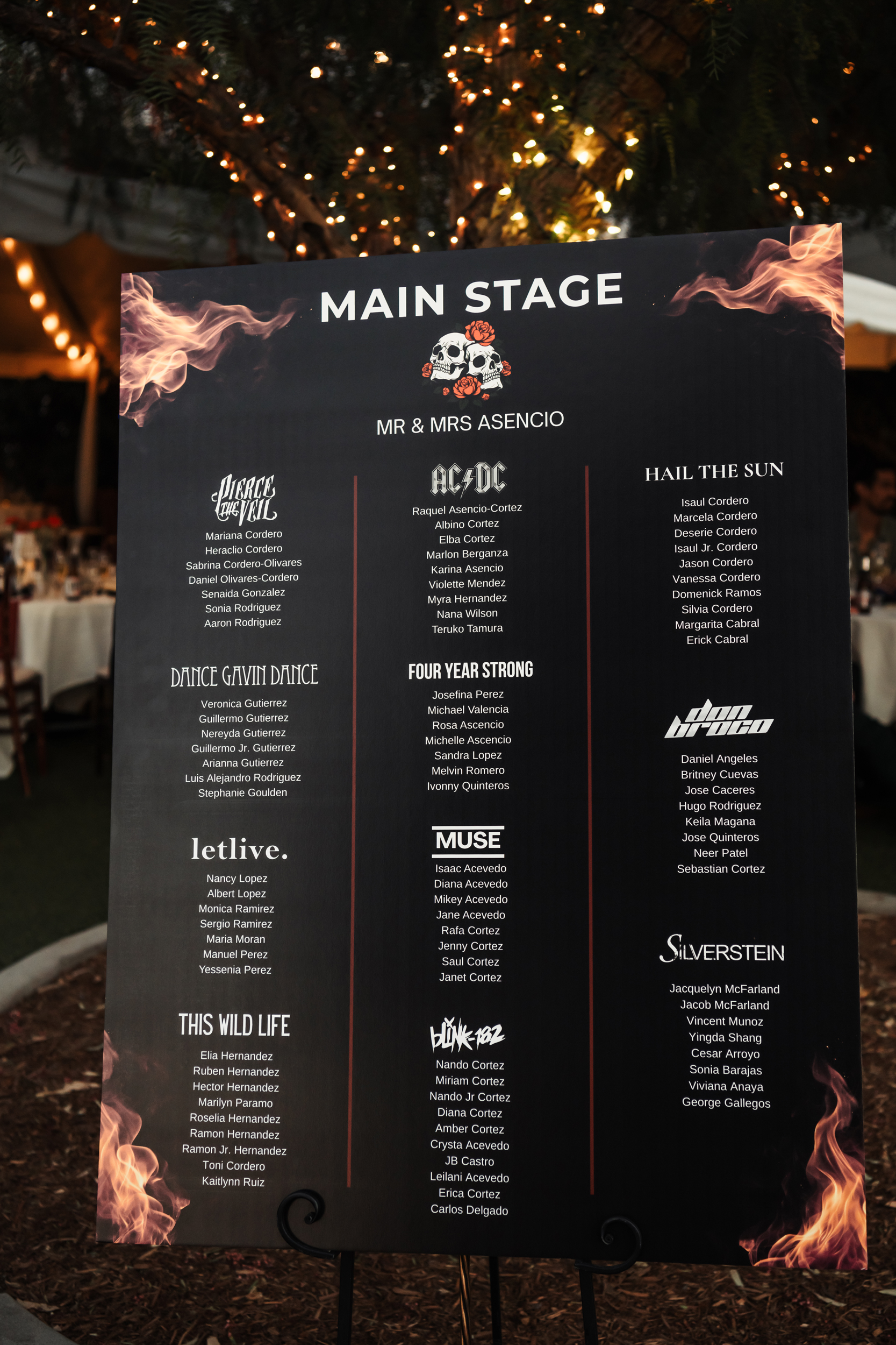 The seating chart followed the format of a festival line-up poster. Each table was named after a band they had seen together. Behind each name sat details of how many times they had seen that band live and a favourite song.