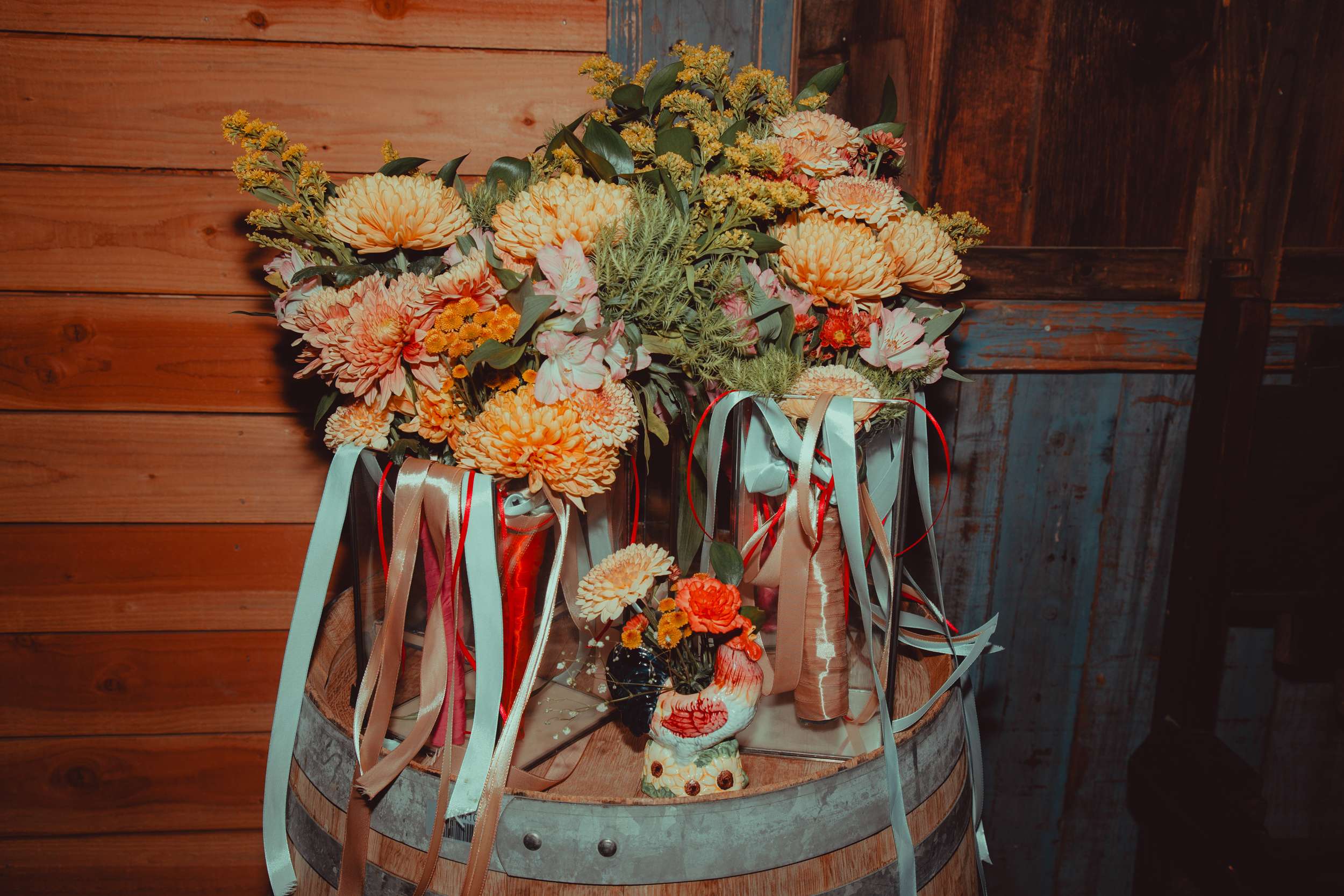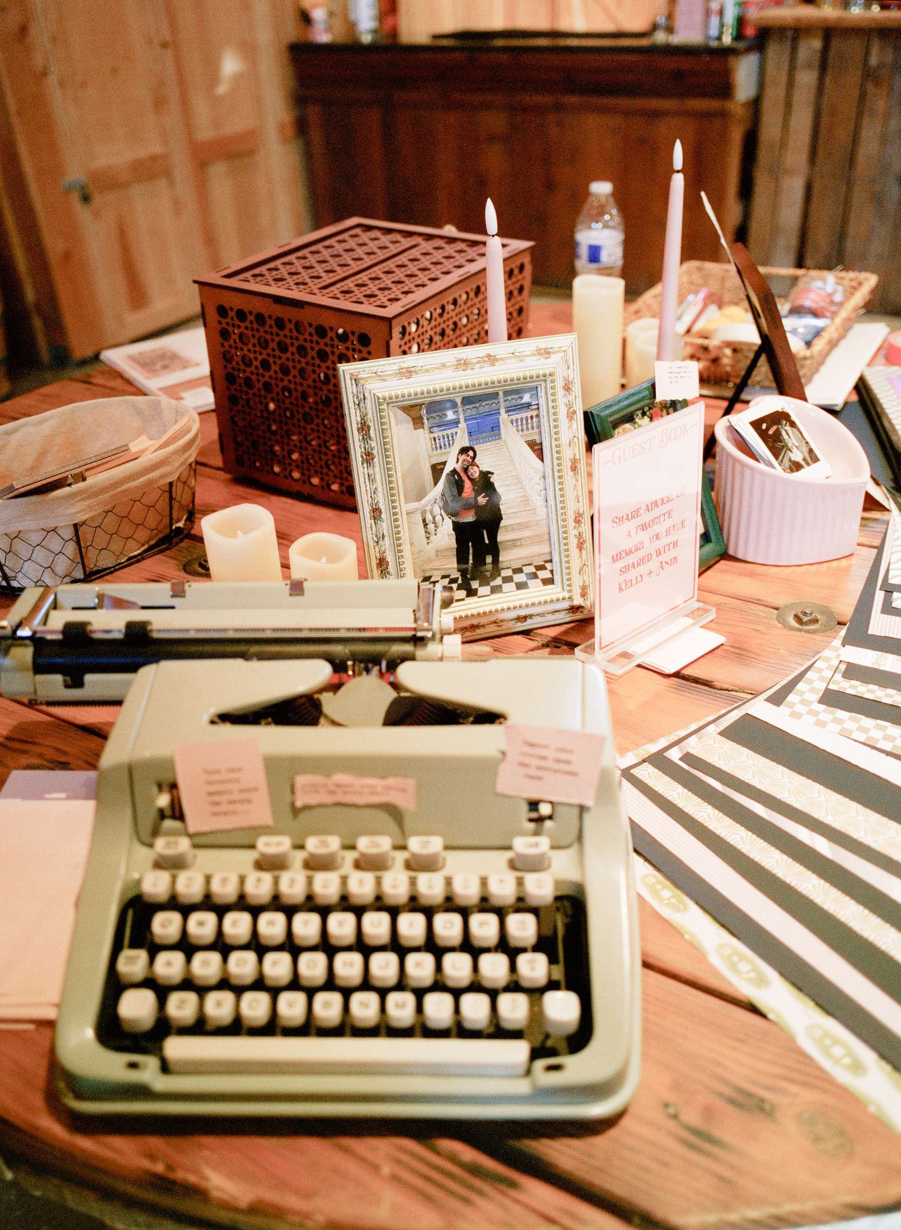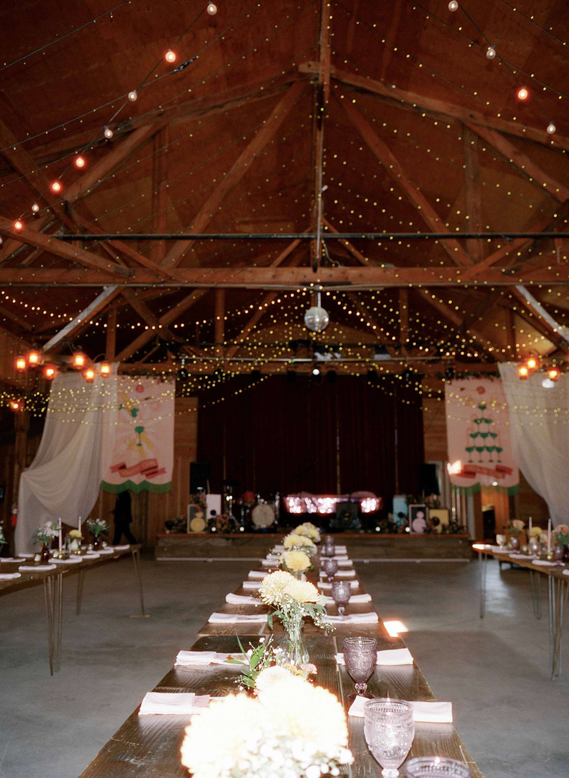 Andy created a ‘Tunnel of Love’ that told their story and ended with an instant photo setup. Kelly built a photo booth and they collected vintage ceramic animal vases for the tables. Two large tarot banners framed the stage, hand painted with the Two of Cups and Ten of Cups.