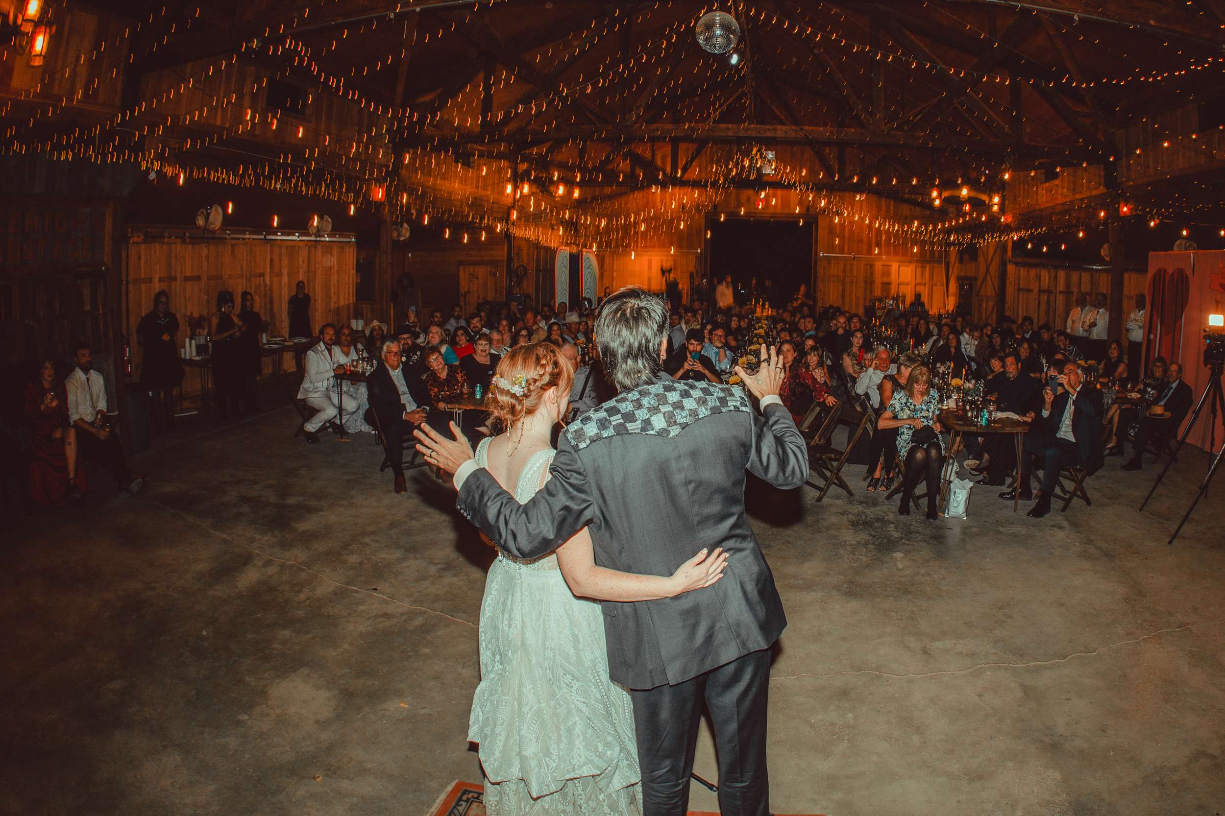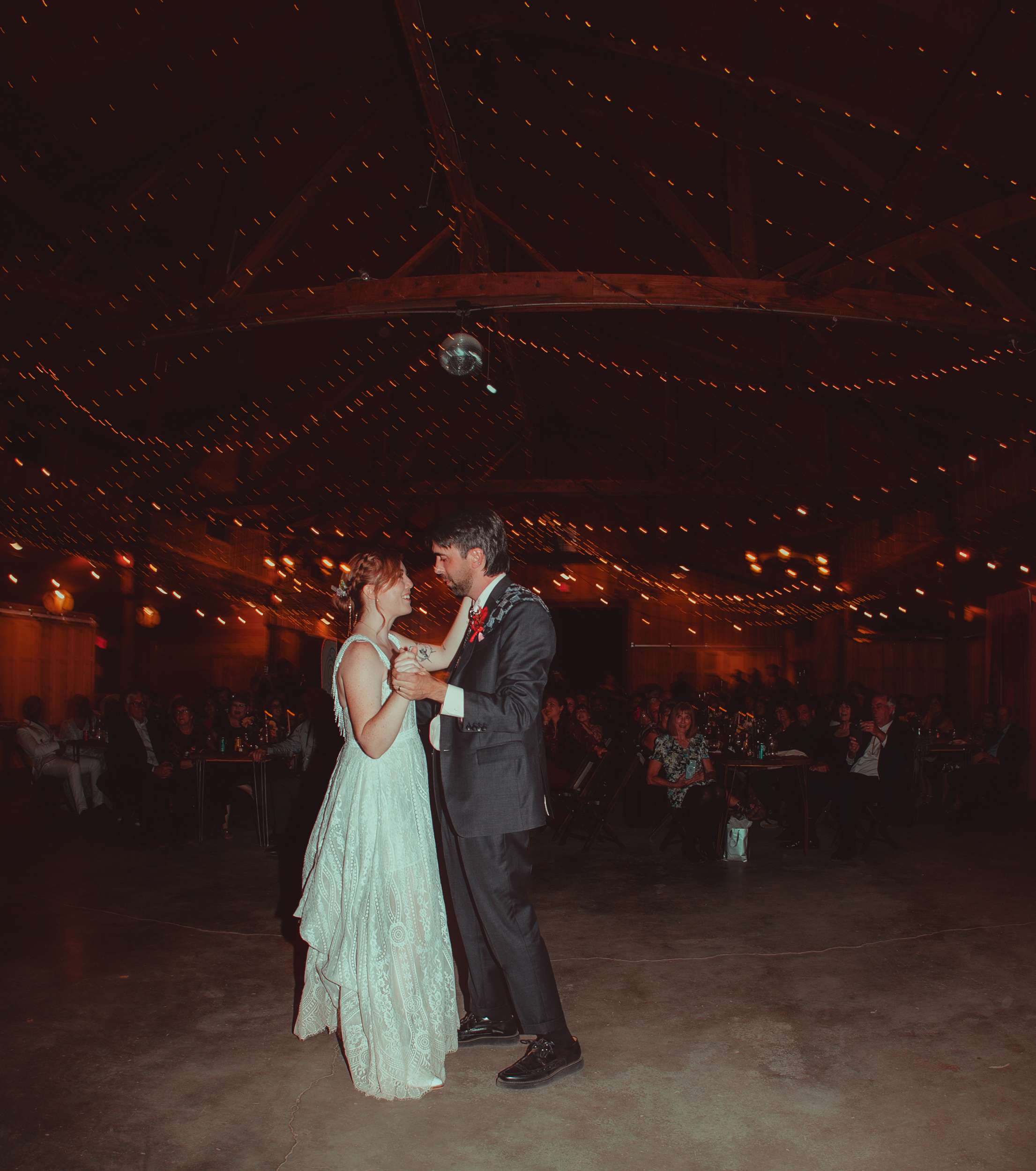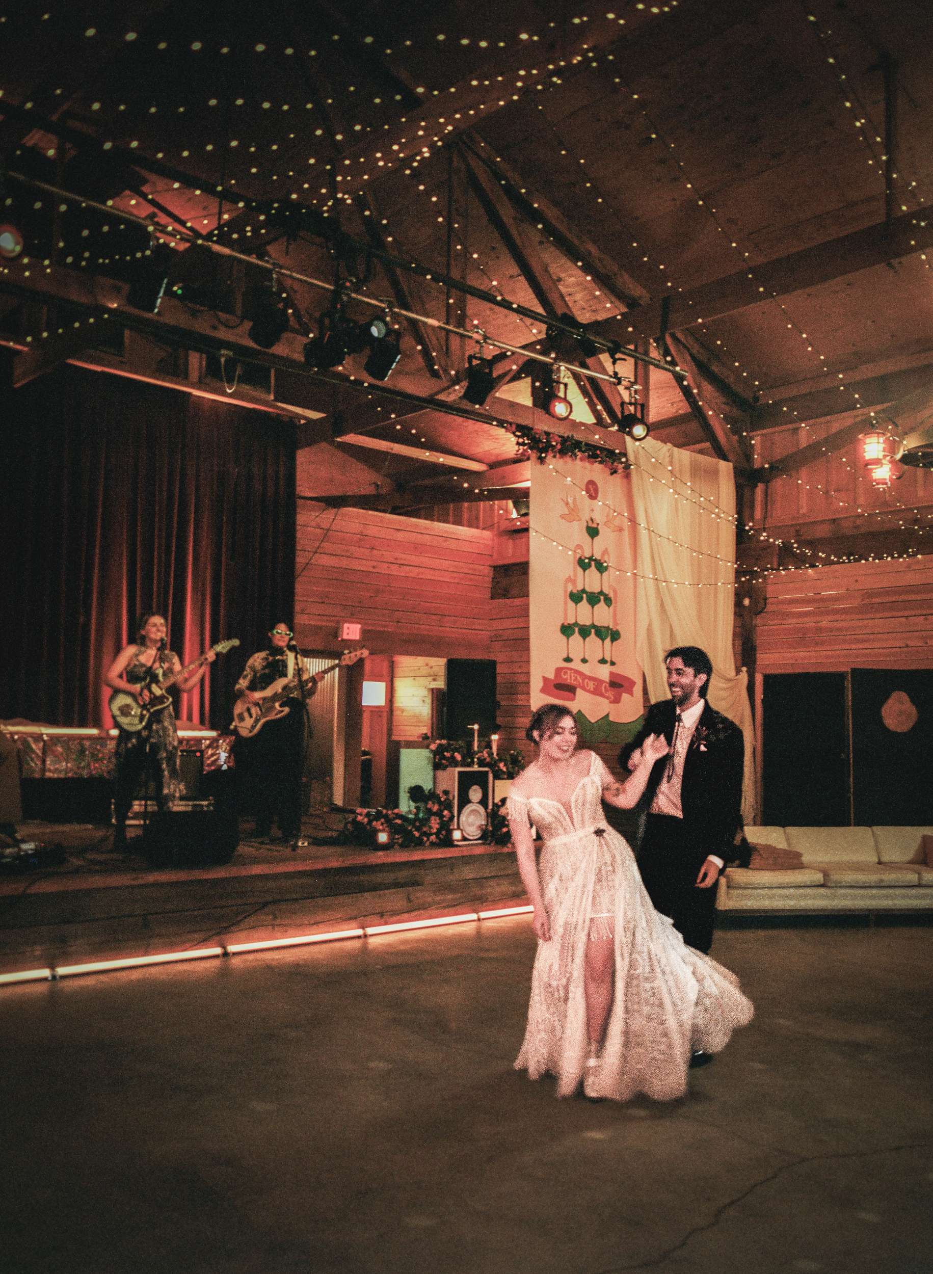 A live band played for the ceremony and cocktail hour and friends handled the DJ sets after that with a playlist that moved from disco to an EDM remix of Circle of Life. The night ended with everyone singing along to All I Want for Christmas Is You. “Our friends circled around us and it just felt really magical” Kelly said.