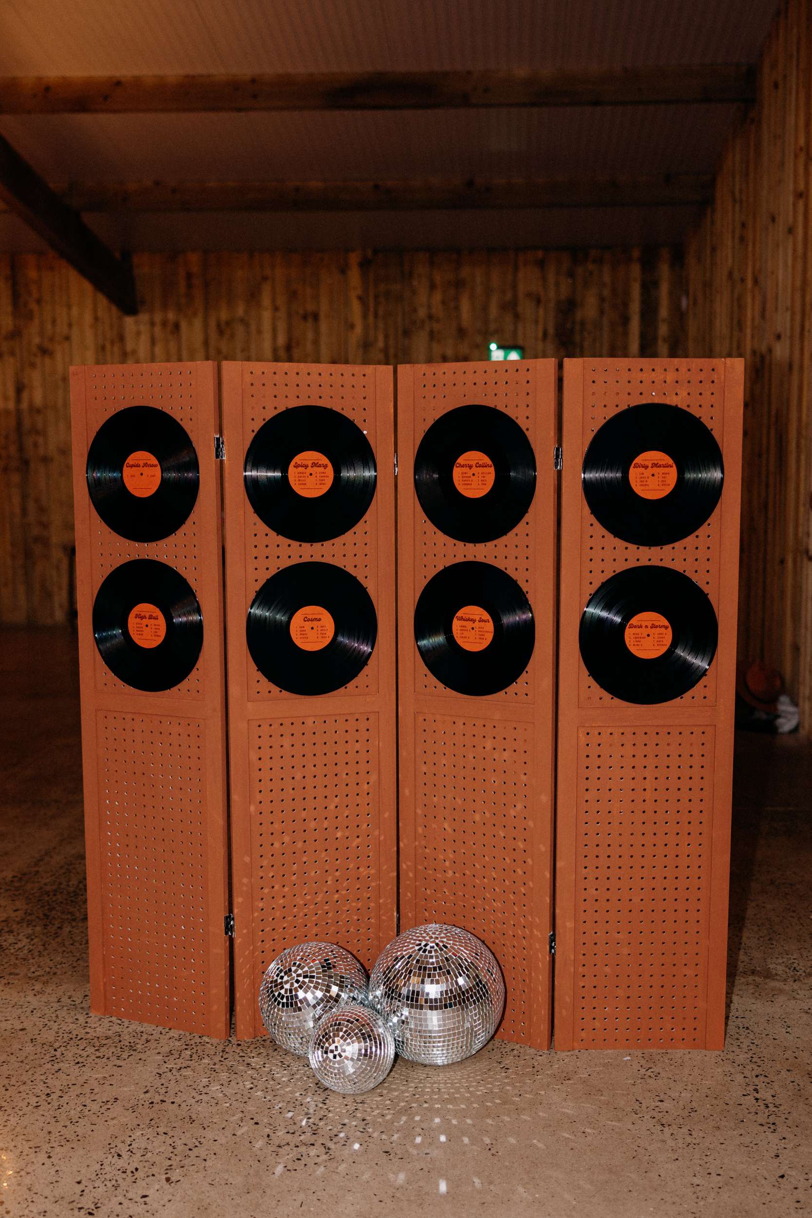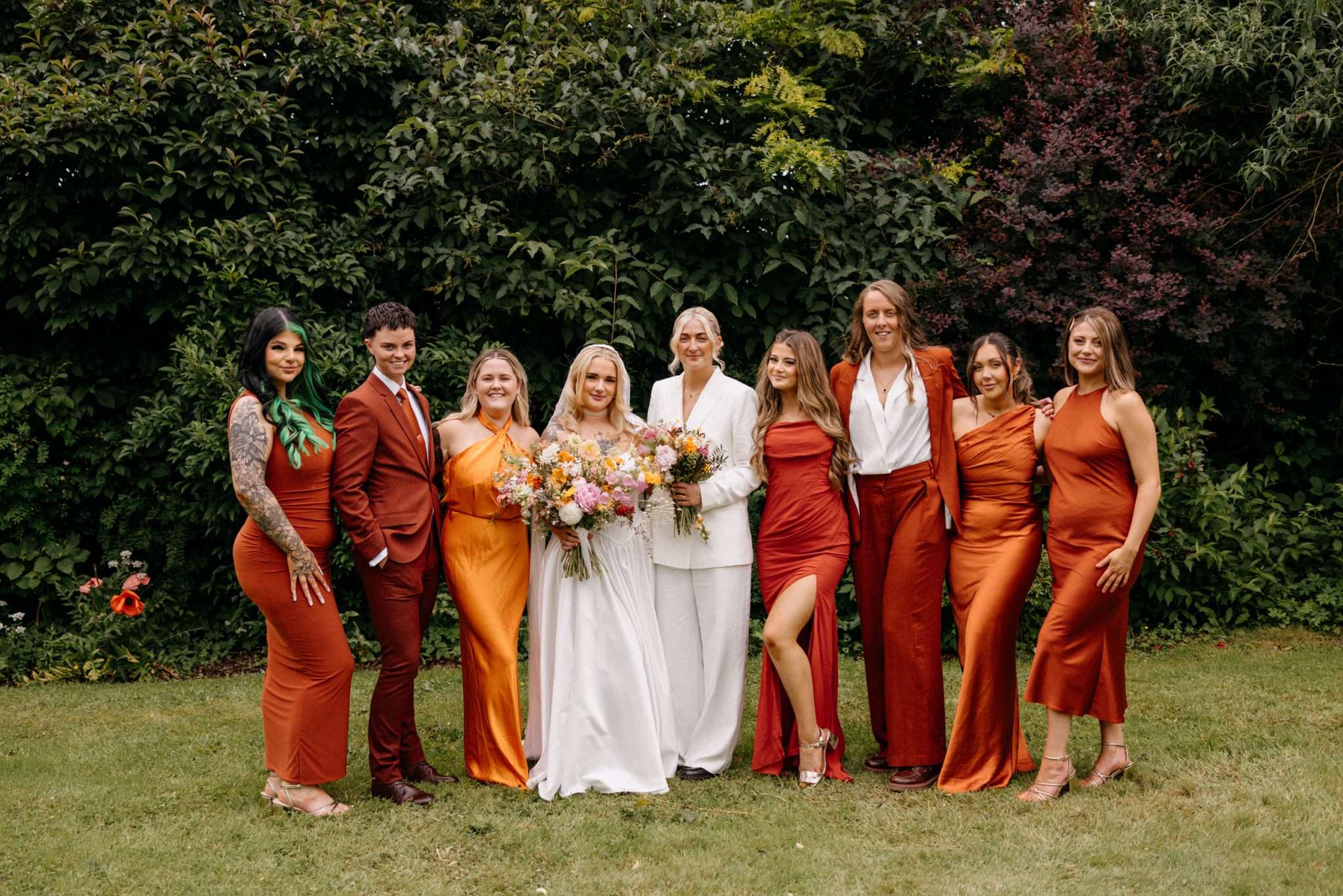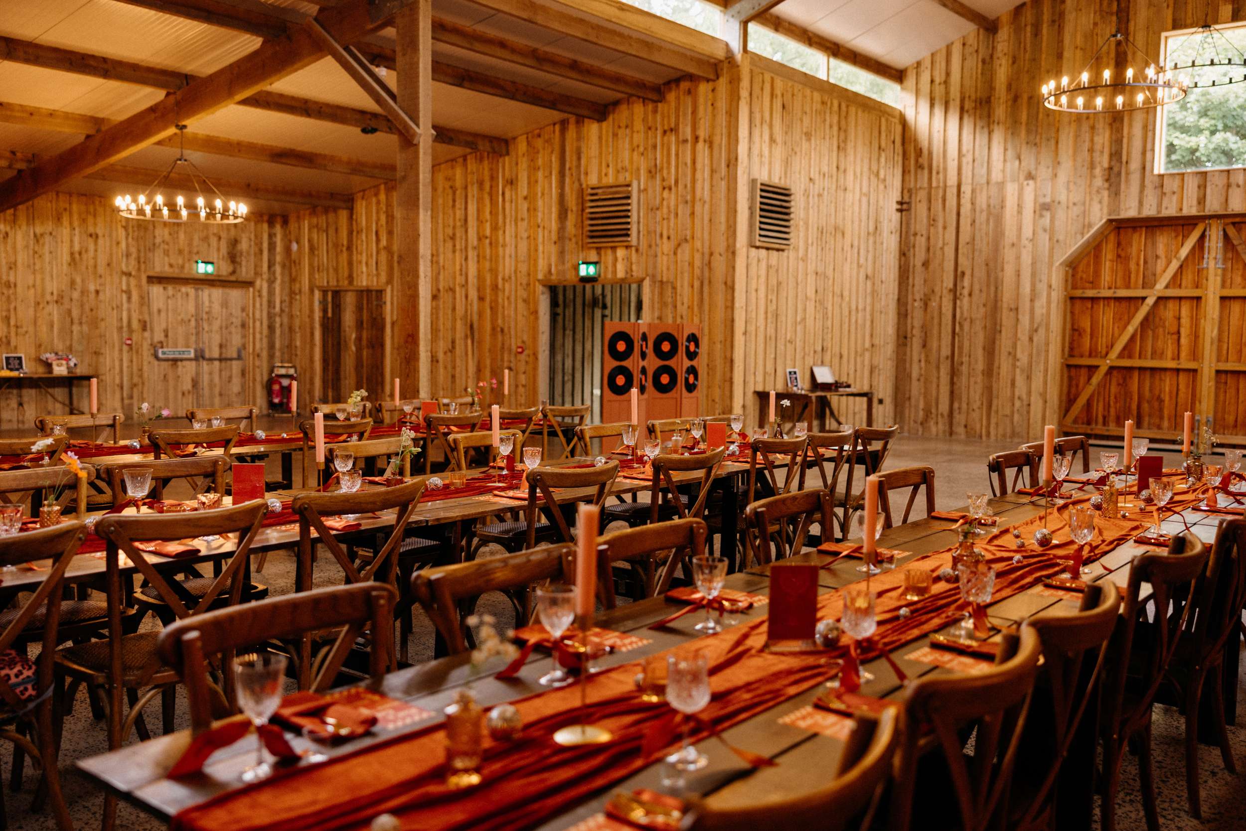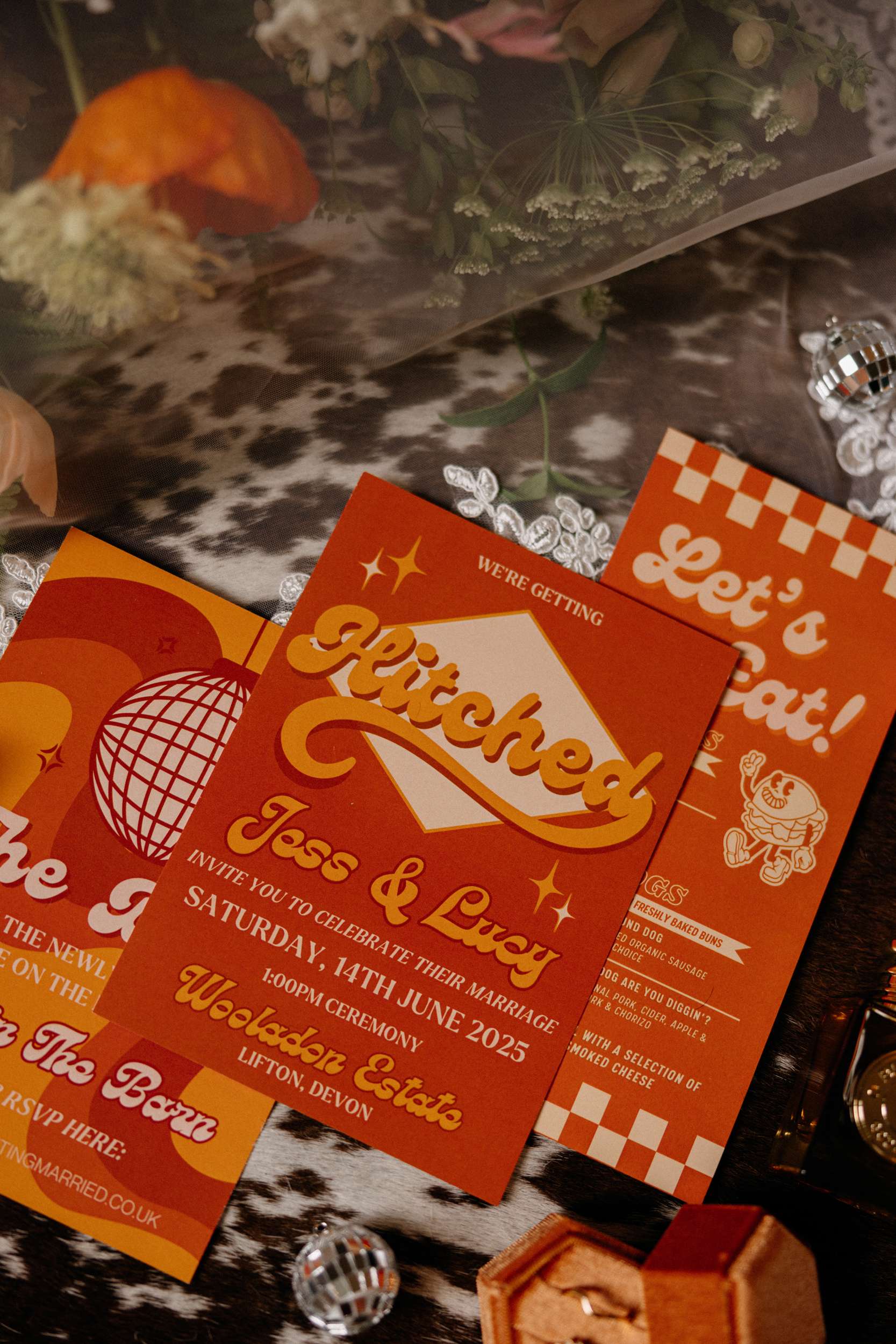 A 70s disco influence ran through everything at Lucy and Jess’ wedding. The main colour of the day was burnt orange and it showed up in the bridesmaid’s mix of dresses and suits, in the confetti, the bouquets, and across all the self-designed stationery. Disco balls were used alongside vinyl records, which doubled as a guest book and part of the seating plan.