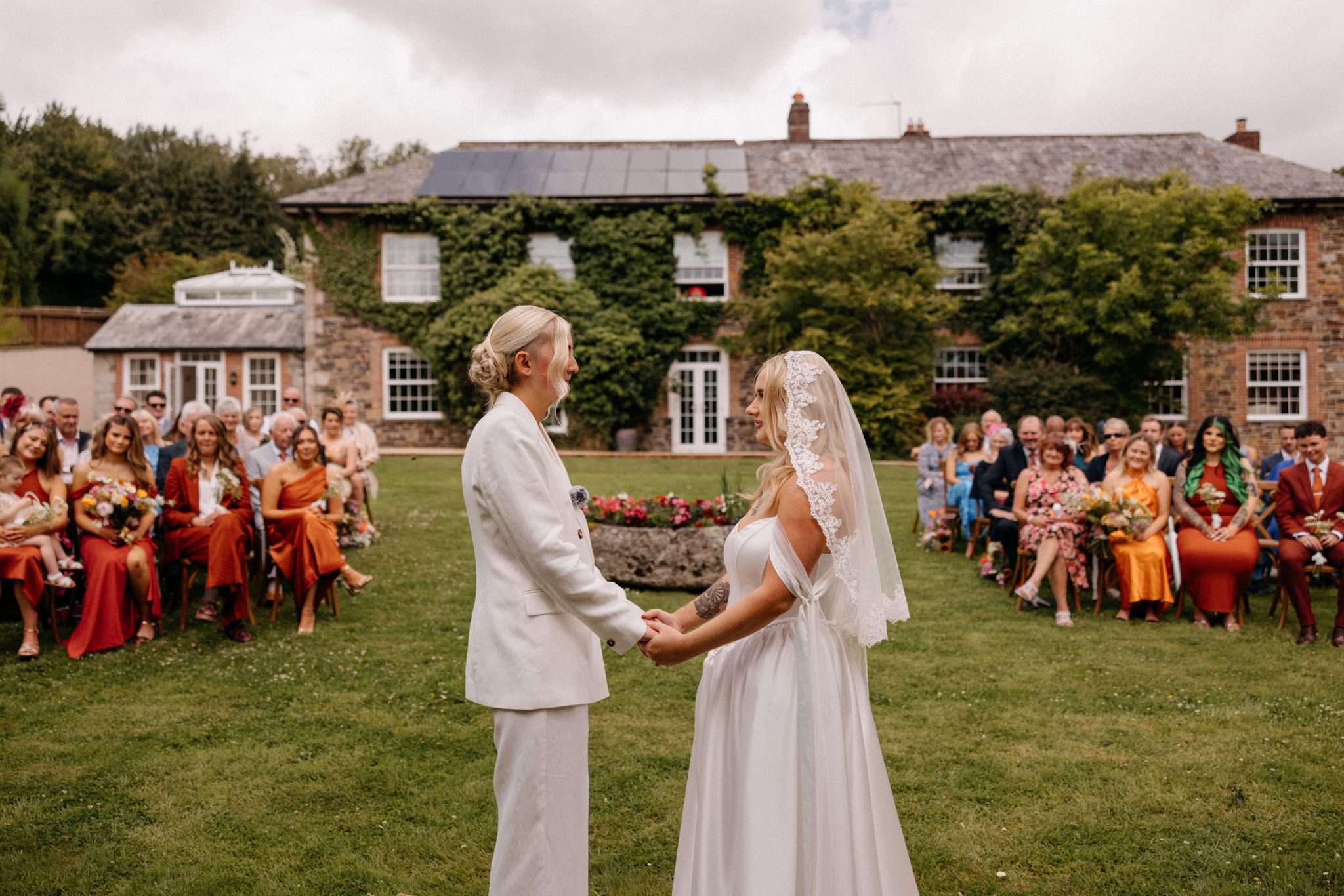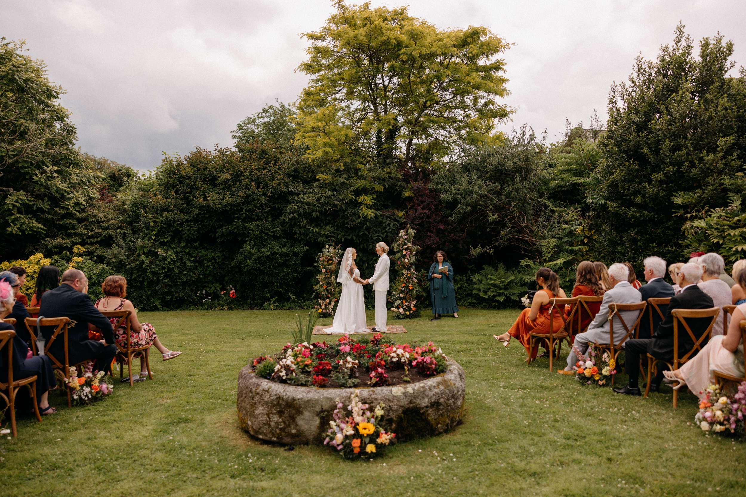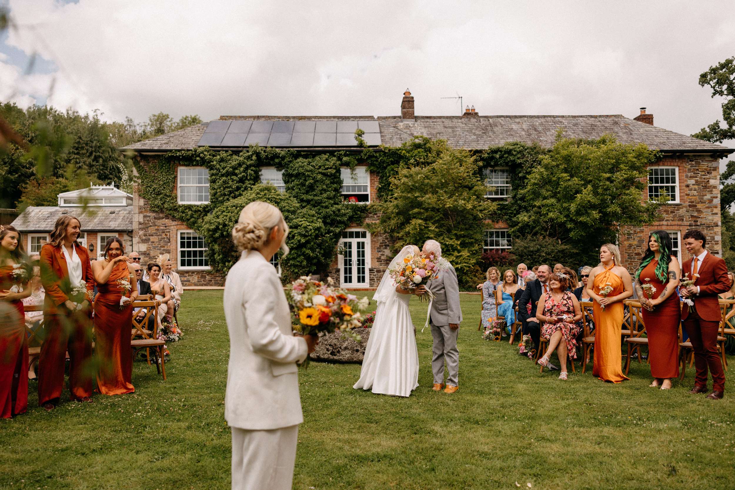 During the ceremony, held outside with the stunning Wooldadon Estate, their mums presented the rings. They wrote their own vows and worked closely with their celebrant to shape the tone. Bridesmaids walked first to A Thousand Years by Christina Perri, Lucy walked with her dad and Jess followed with her grandad. “We wanted things to feel personal rather than overly formal”, they continued. “Overall, we weren’t too focused on doing things the ‘right’ way, we just wanted the day to feel joyful, relaxed, colourful and completely true to us as a couple.”