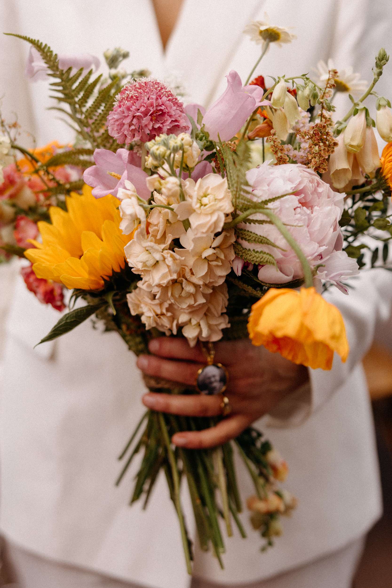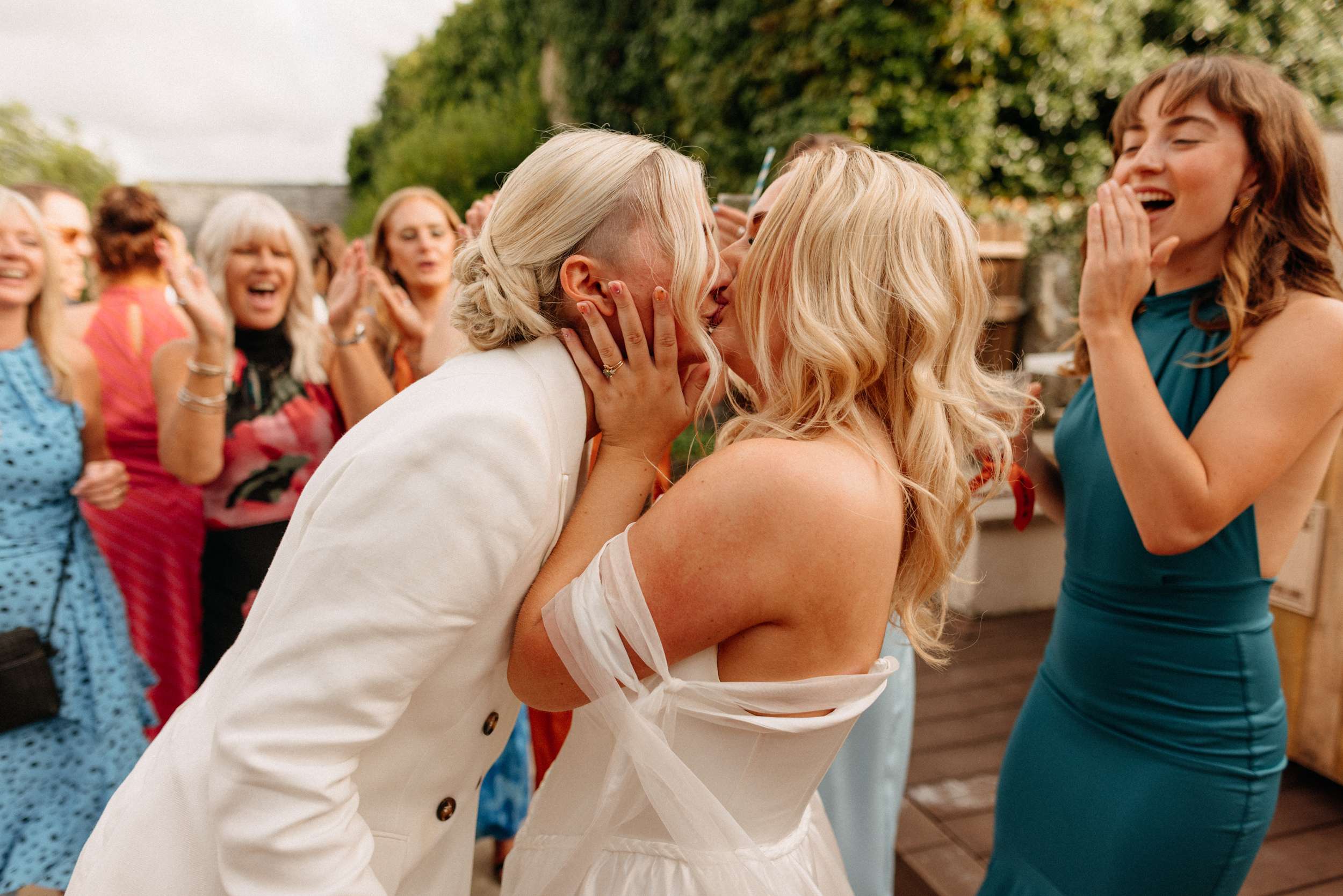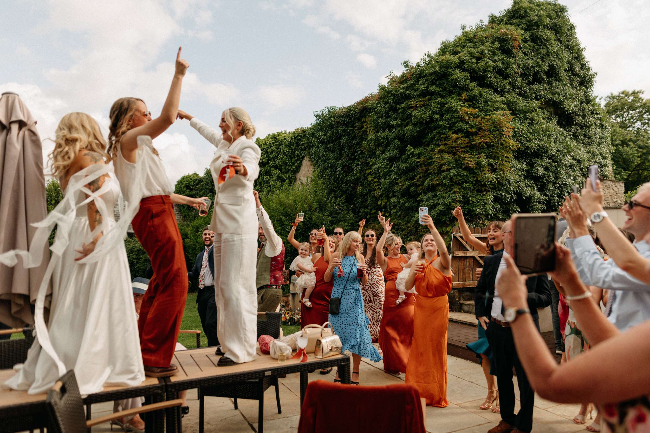 During the ceremony, held outside with the stunning Wooldadon Estate, their mums presented the rings. They wrote their own vows and worked closely with their celebrant to shape the tone. Bridesmaids walked first to A Thousand Years by Christina Perri, Lucy walked with her dad and Jess followed with her grandad. “We wanted things to feel personal rather than overly formal”, they continued. “Overall, we weren’t too focused on doing things the ‘right’ way, we just wanted the day to feel joyful, relaxed, colourful and completely true to us as a couple.”
