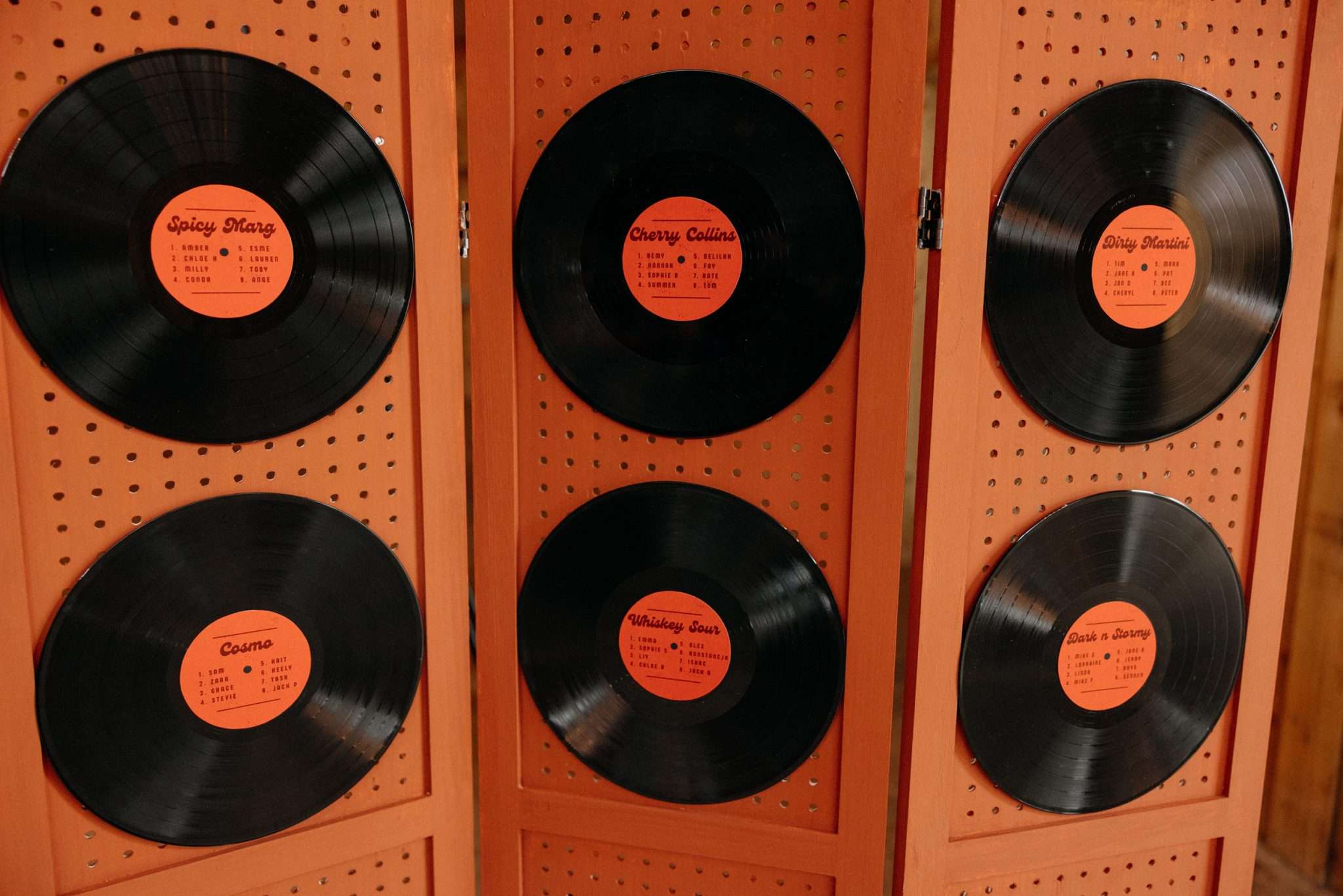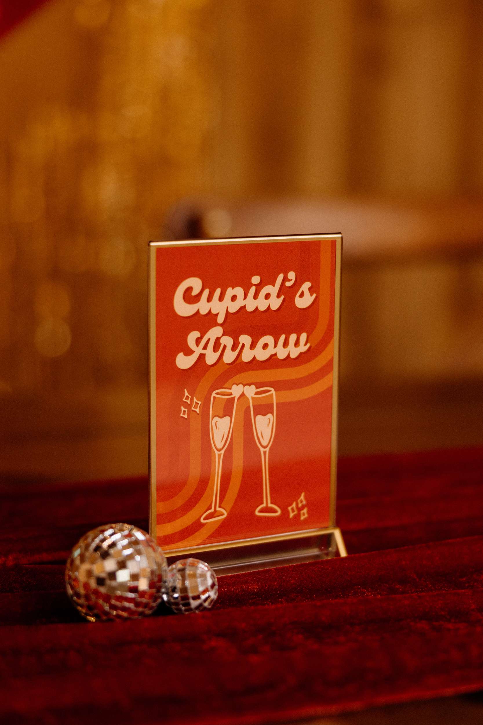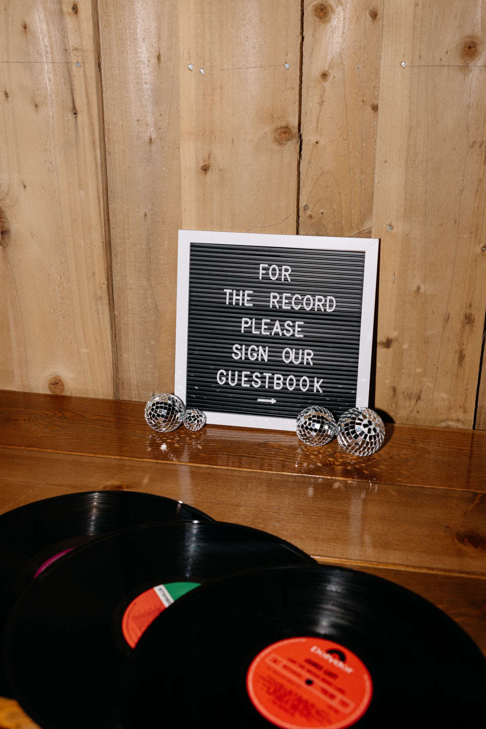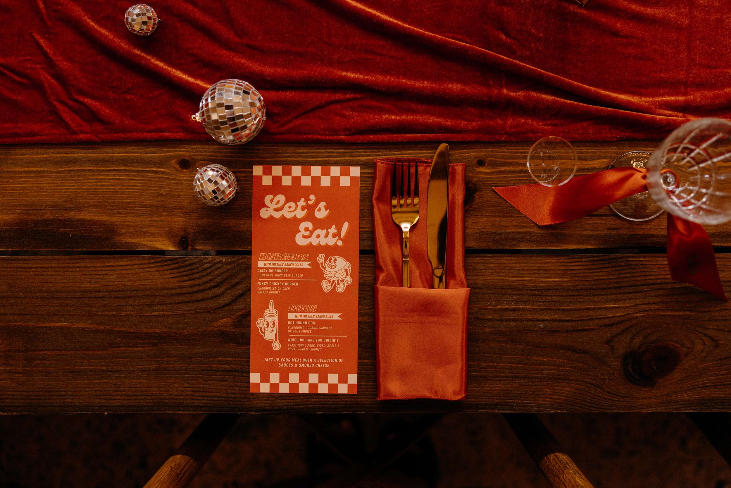 “We made a conscious effort to create a wedding that felt completely personal to us, rather than following tradition for tradition’s sake”, they told us. “A lot of the details reflected our personalities and relationship, from the 70s disco inspired styling and burnt orange colour palette to the vinyl record guest book, retro diner style stationery, and Polaroid photo booth with disco balls and a neon sign.”