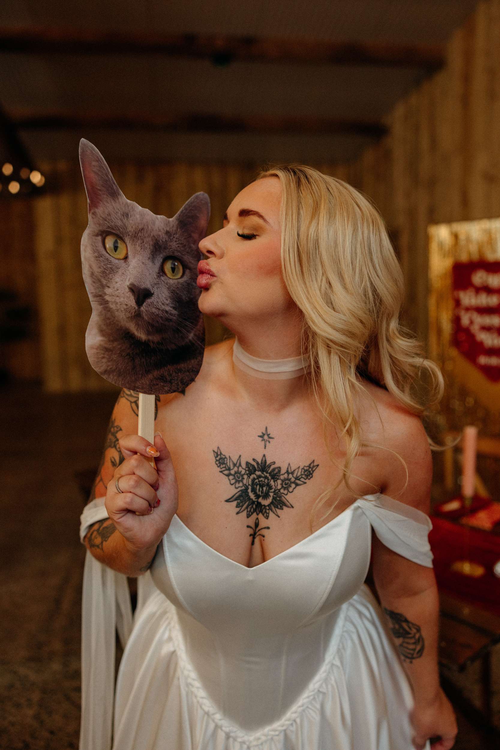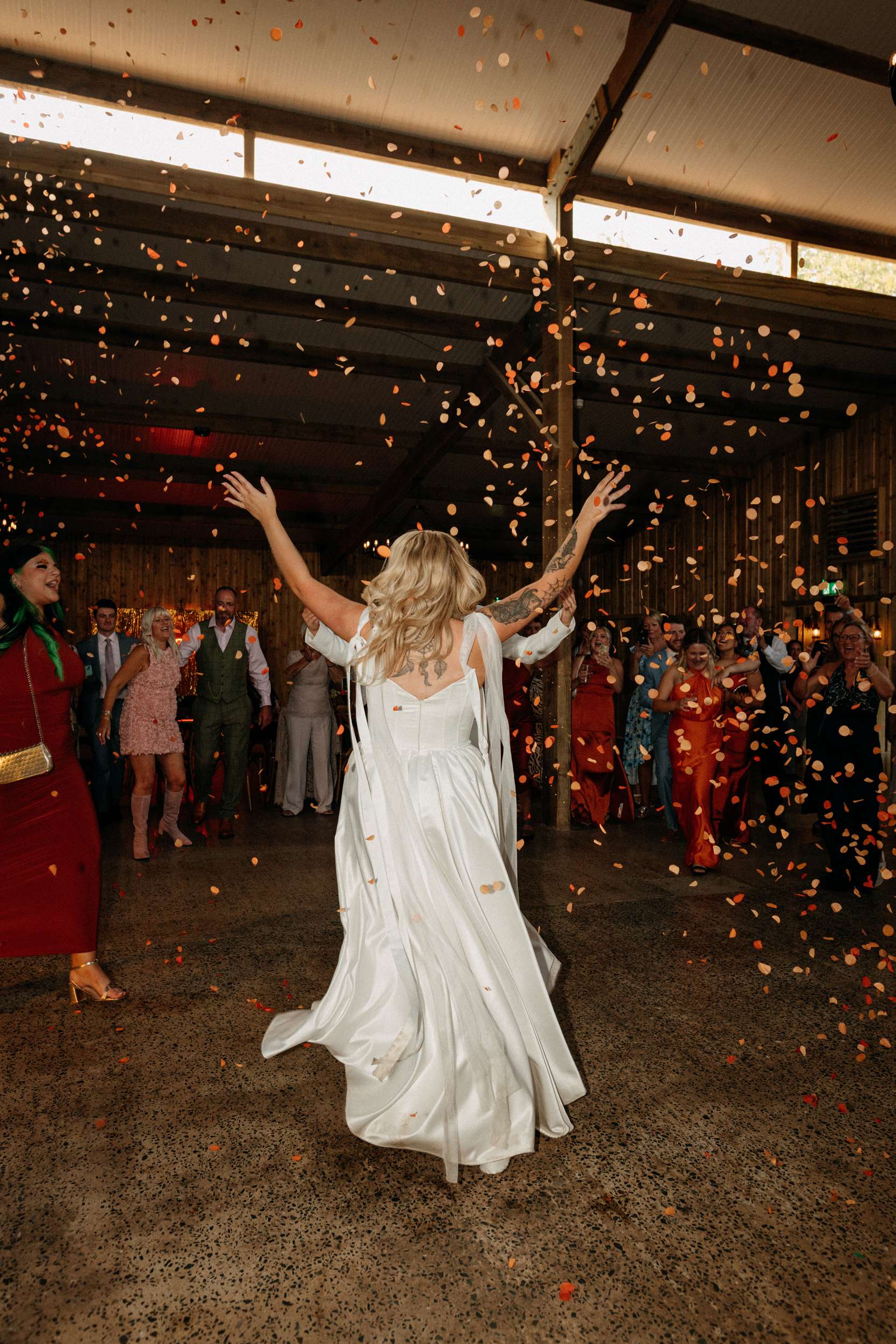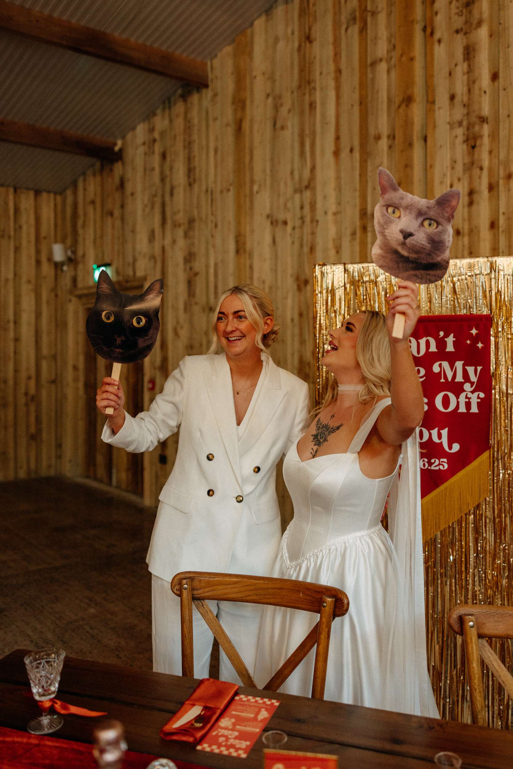The reception started outside with canapés and prosecco before moving into the barn. Before Lucy and Jess entered, the bridesmaids handed out limoncello shots while Girls Just Want to Have Fun played. Then came their entrance – they ran in holding cardboard cut-outs of their cats, Daisy and Peggy, to Crashed the Wedding by Busted. “It felt very us and brought a lot of laughter to the day.”