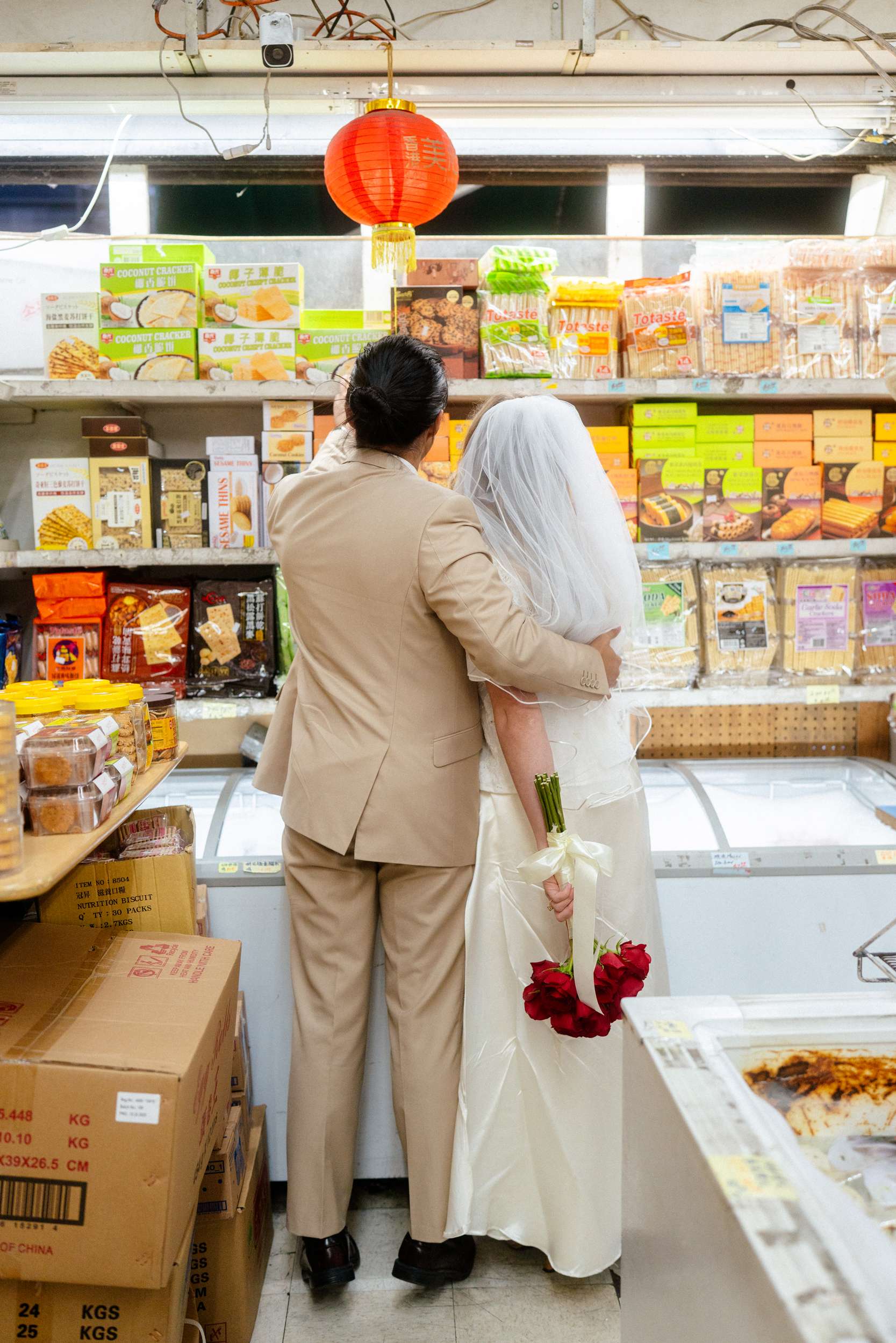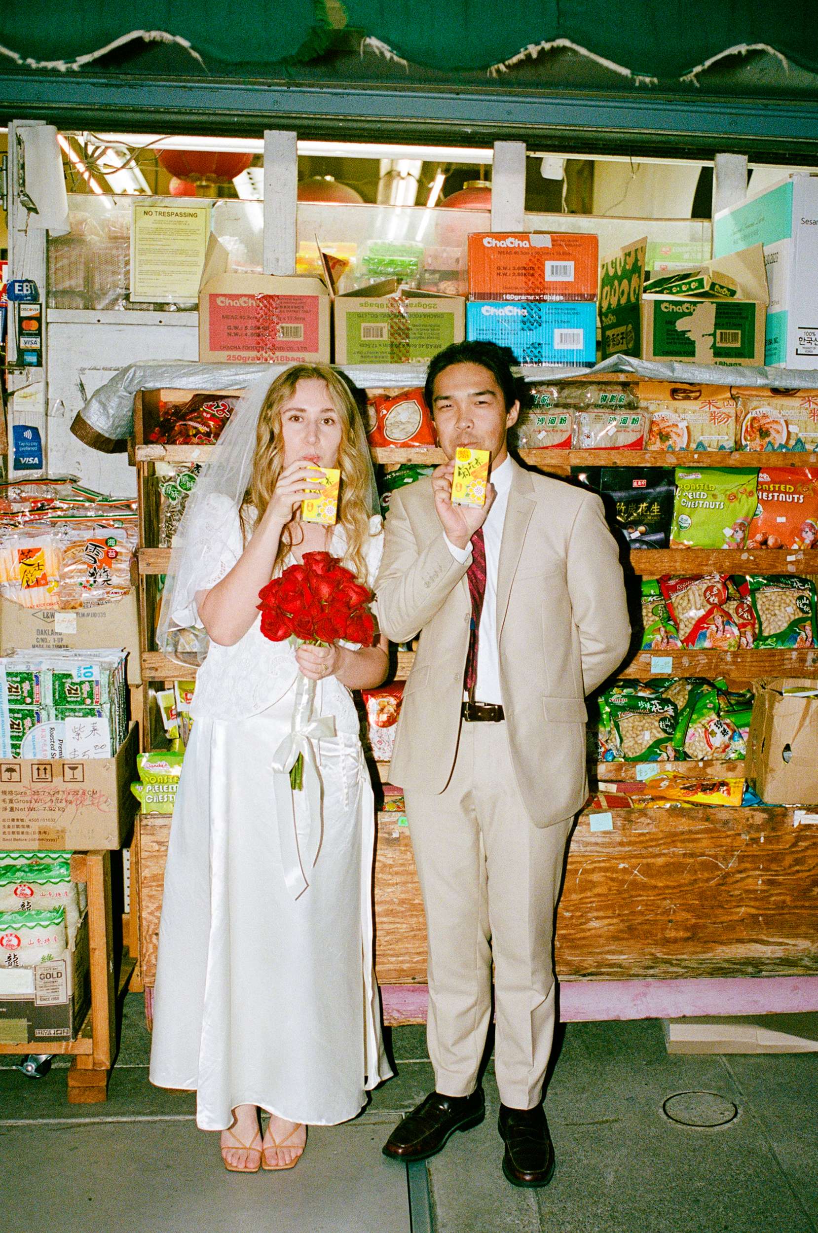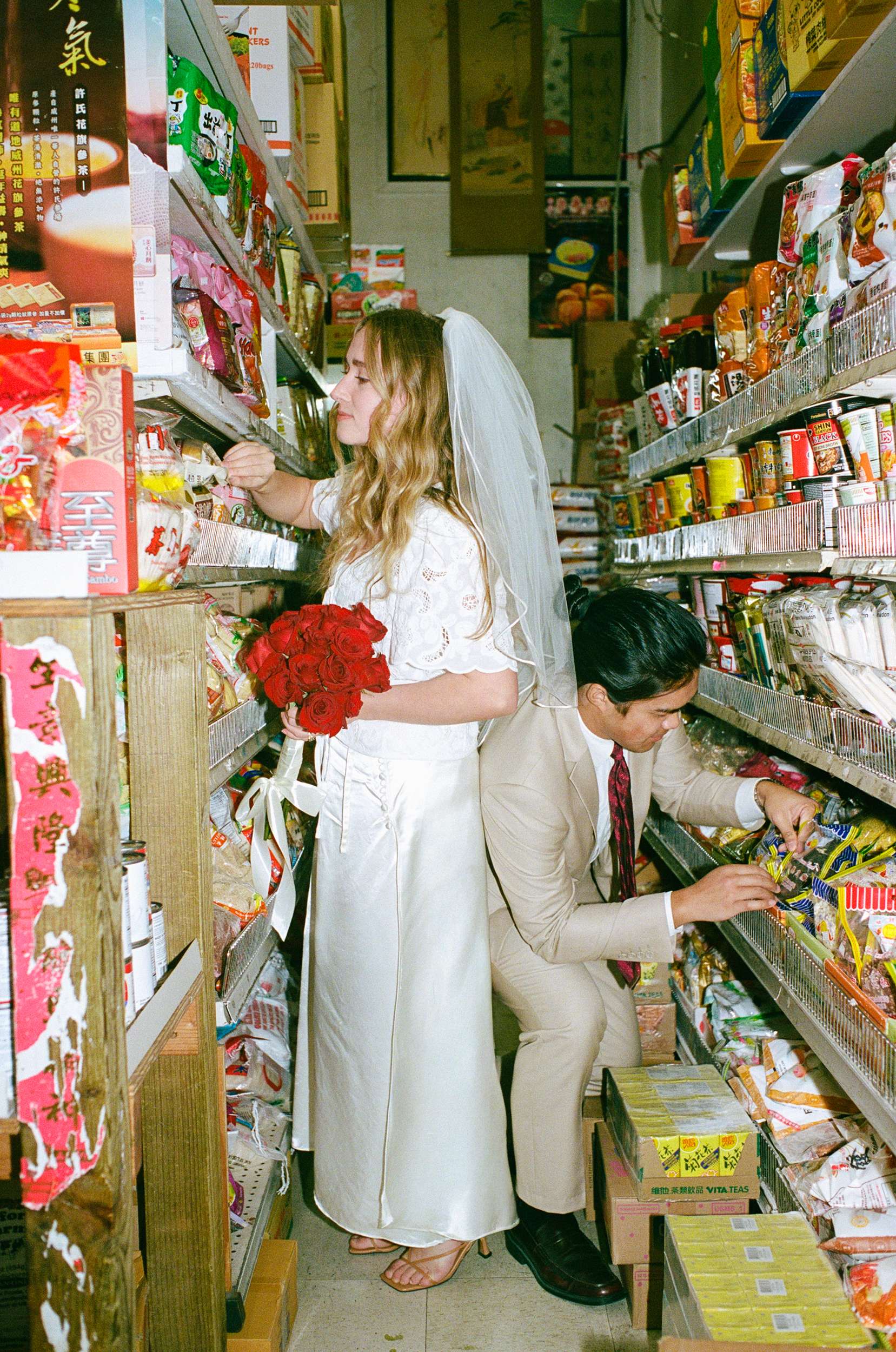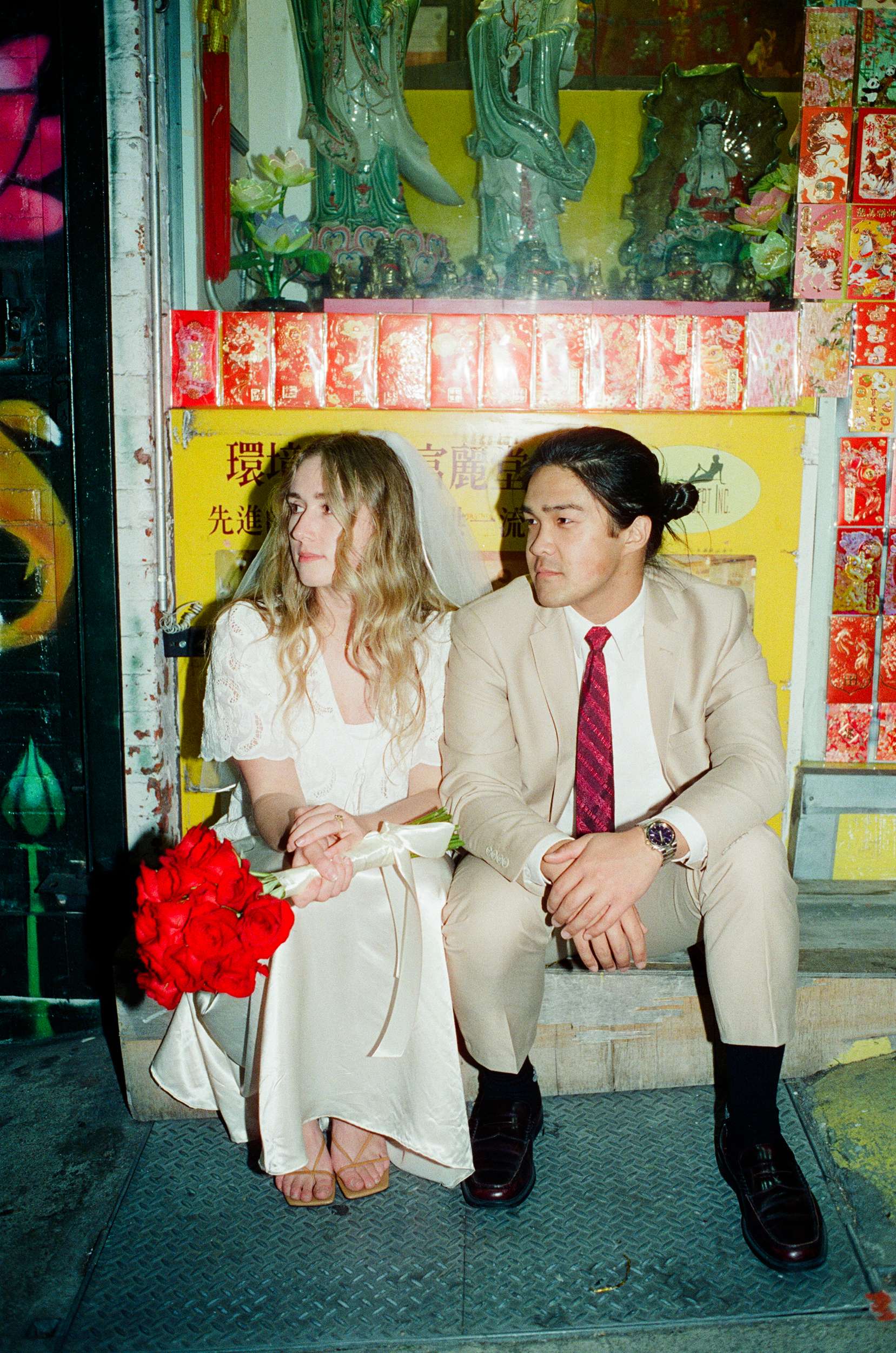 The shoot wasn’t about being flashy or putting on any kind of pretence. They spent less than $100 making it happen. “We were inspired by Wong Kar Wai, Vũ Thụy Khuê, and the historic landscape of Chinatown”, photographer Annalee told us. “There is something unique about a couple in wedding attire doing casual things around the city together at night. It feels special in its own way. The couple are doing things they normally love to do together, such as shop for snacks, run around the city, eat noodles, and wait for the bus, but in wedding attire. They really wanted these photos to feel like themselves.”
