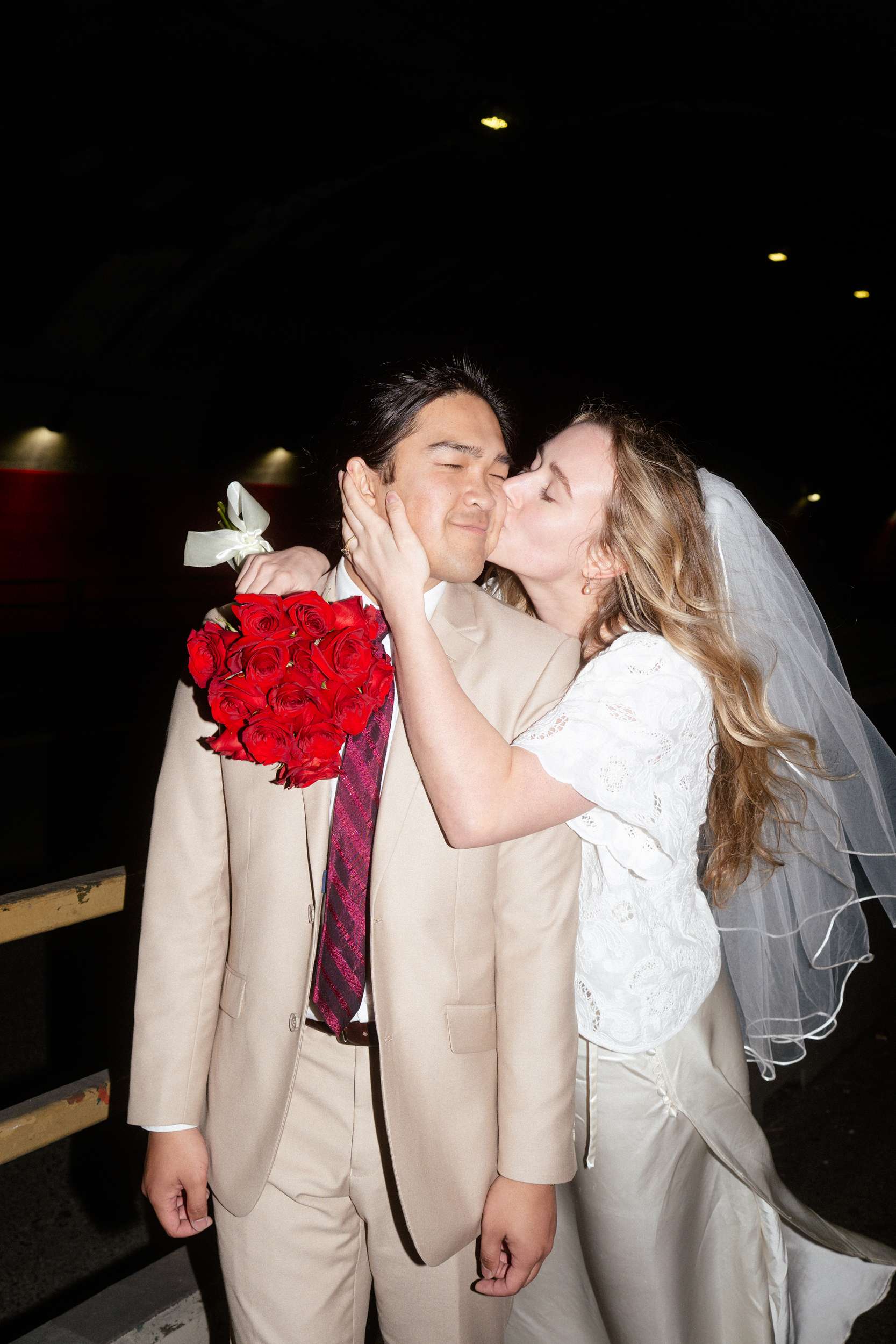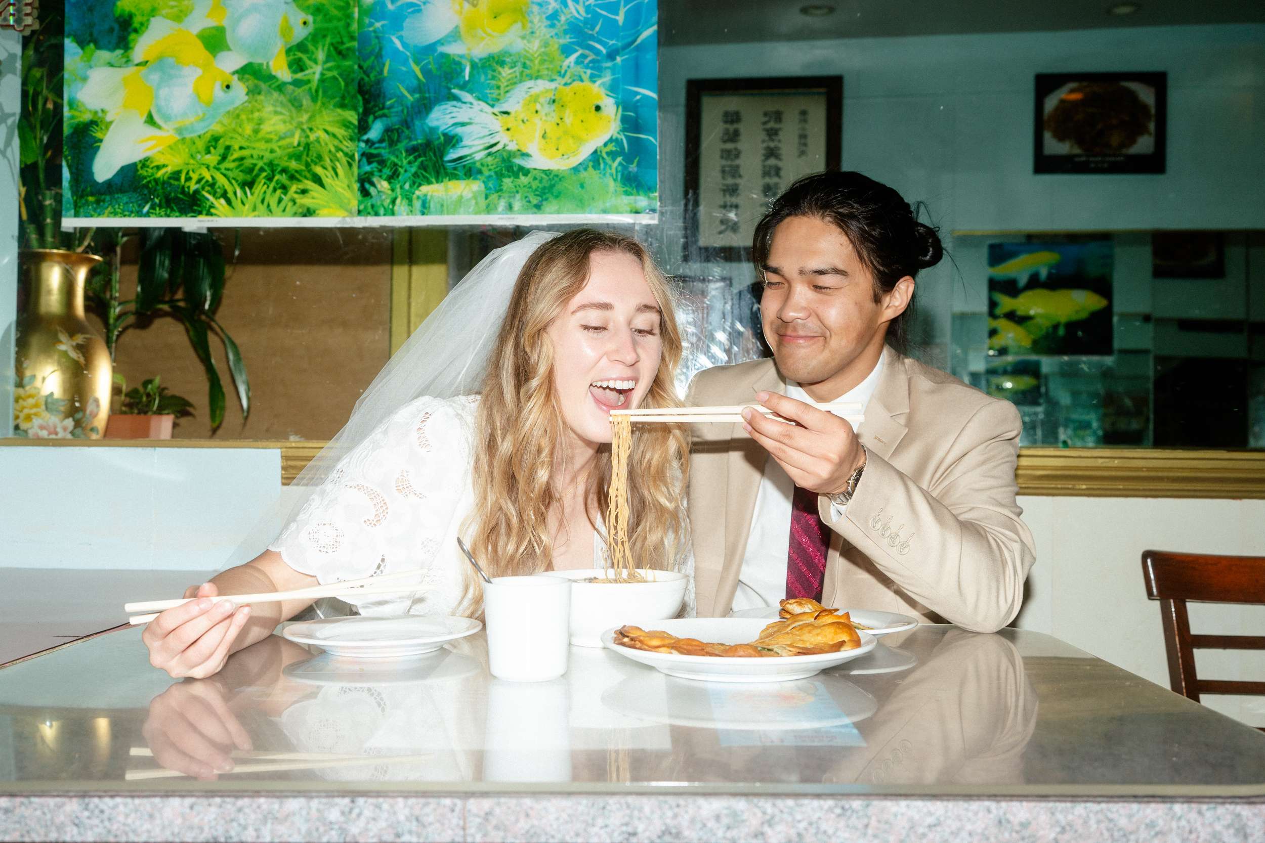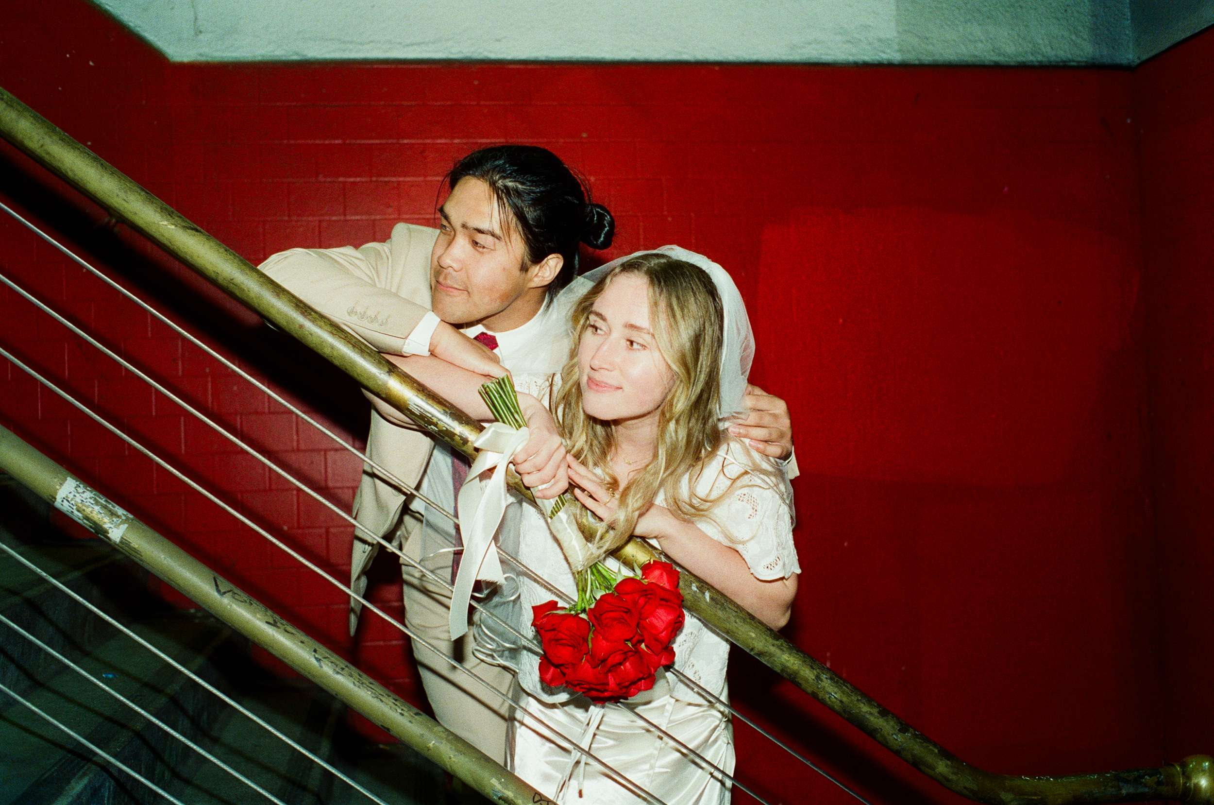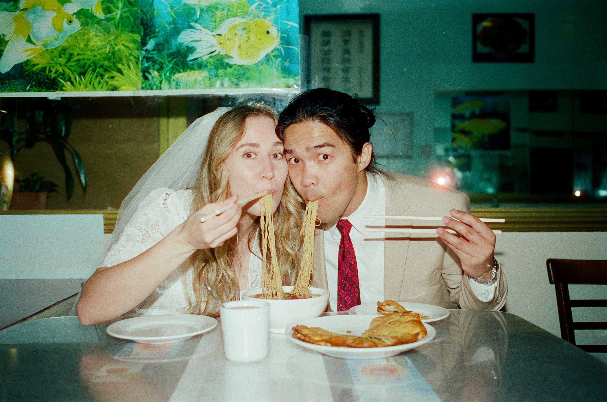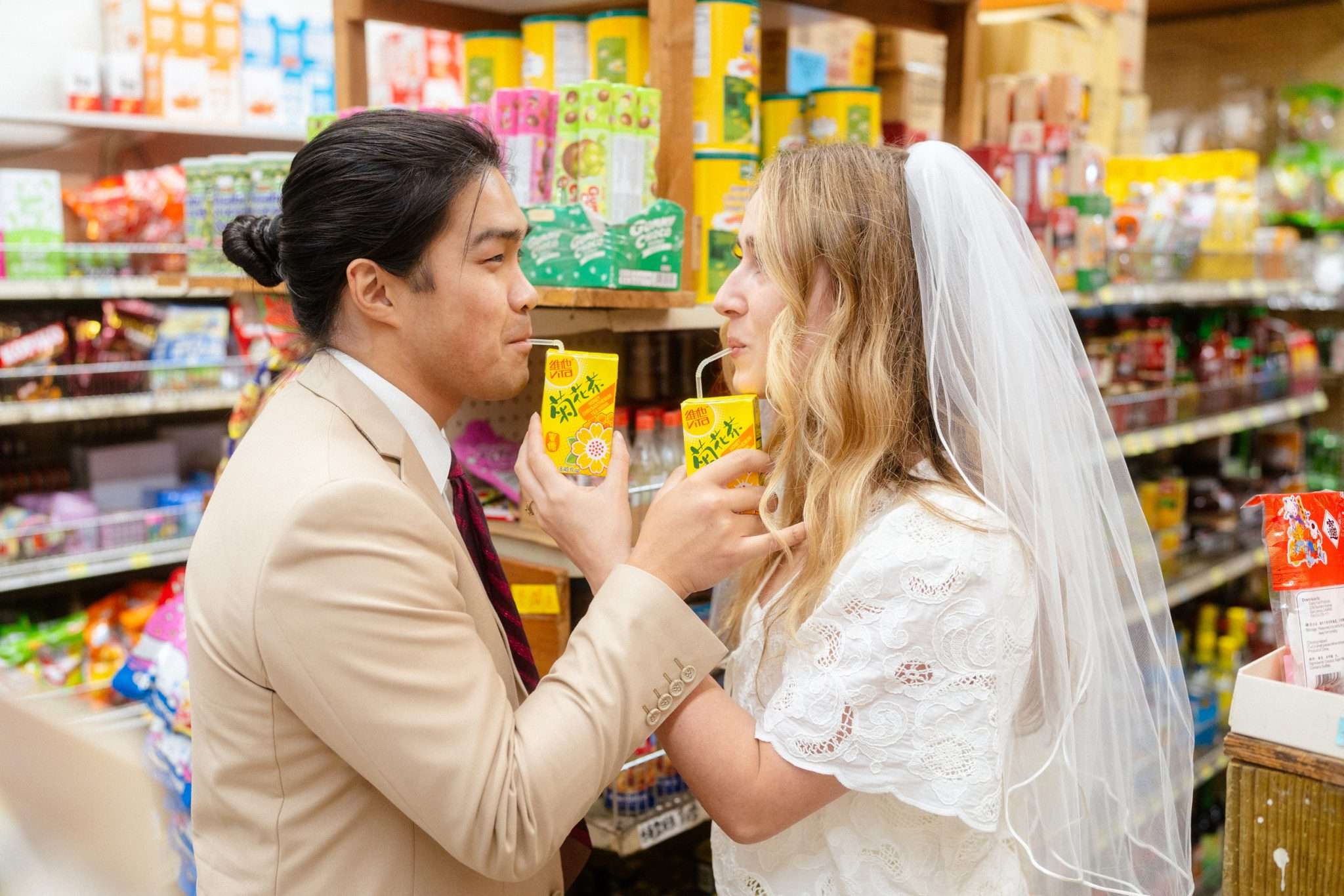 The shoot wasn’t about being flashy or putting on any kind of pretence. They spent less than $100 making it happen. “We were inspired by Wong Kar Wai, Vũ Thụy Khuê, and the historic landscape of Chinatown”, photographer Annalee told us. “There is something unique about a couple in wedding attire doing casual things around the city together at night. It feels special in its own way. The couple are doing things they normally love to do together, such as shop for snacks, run around the city, eat noodles, and wait for the bus, but in wedding attire. They really wanted these photos to feel like themselves.”