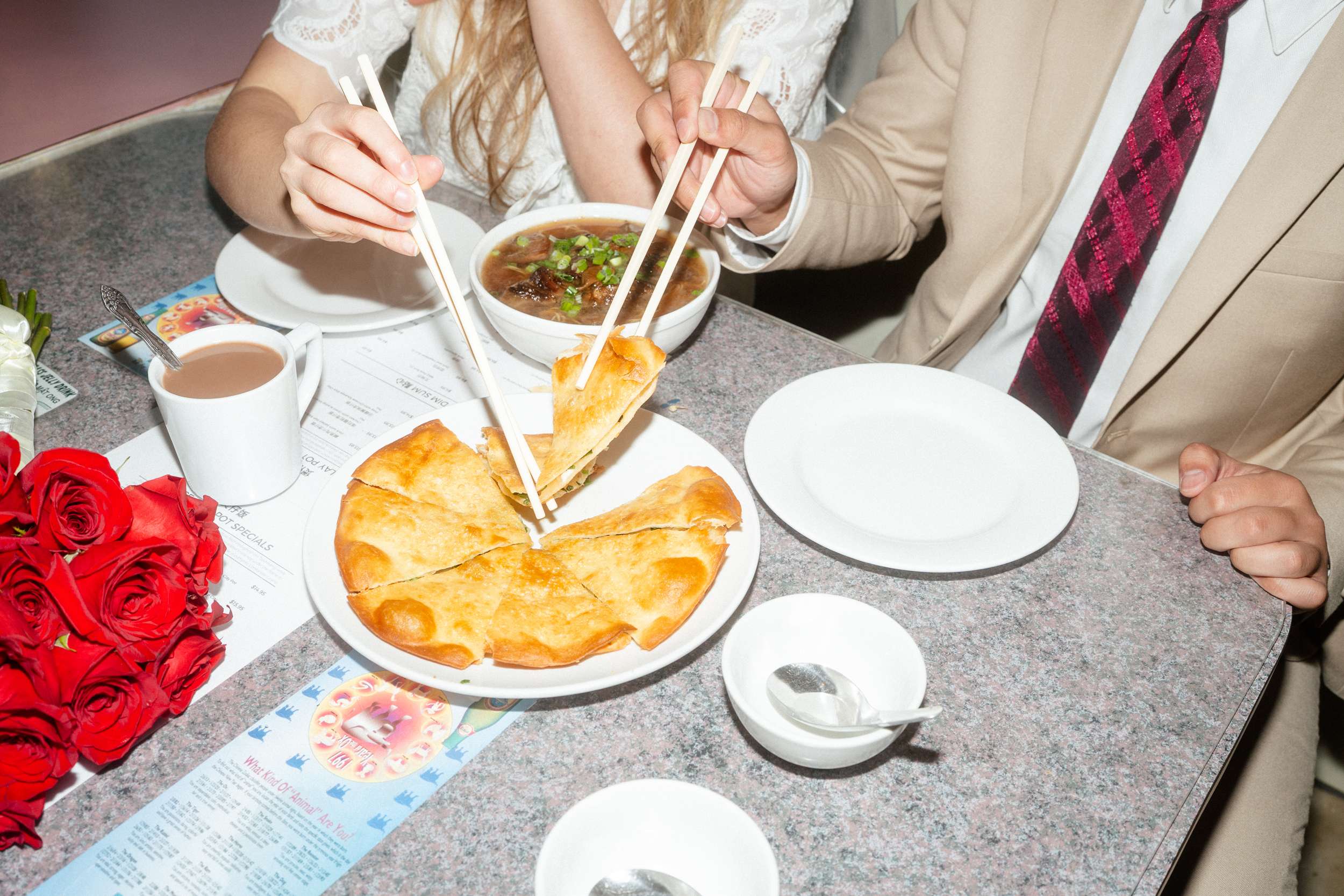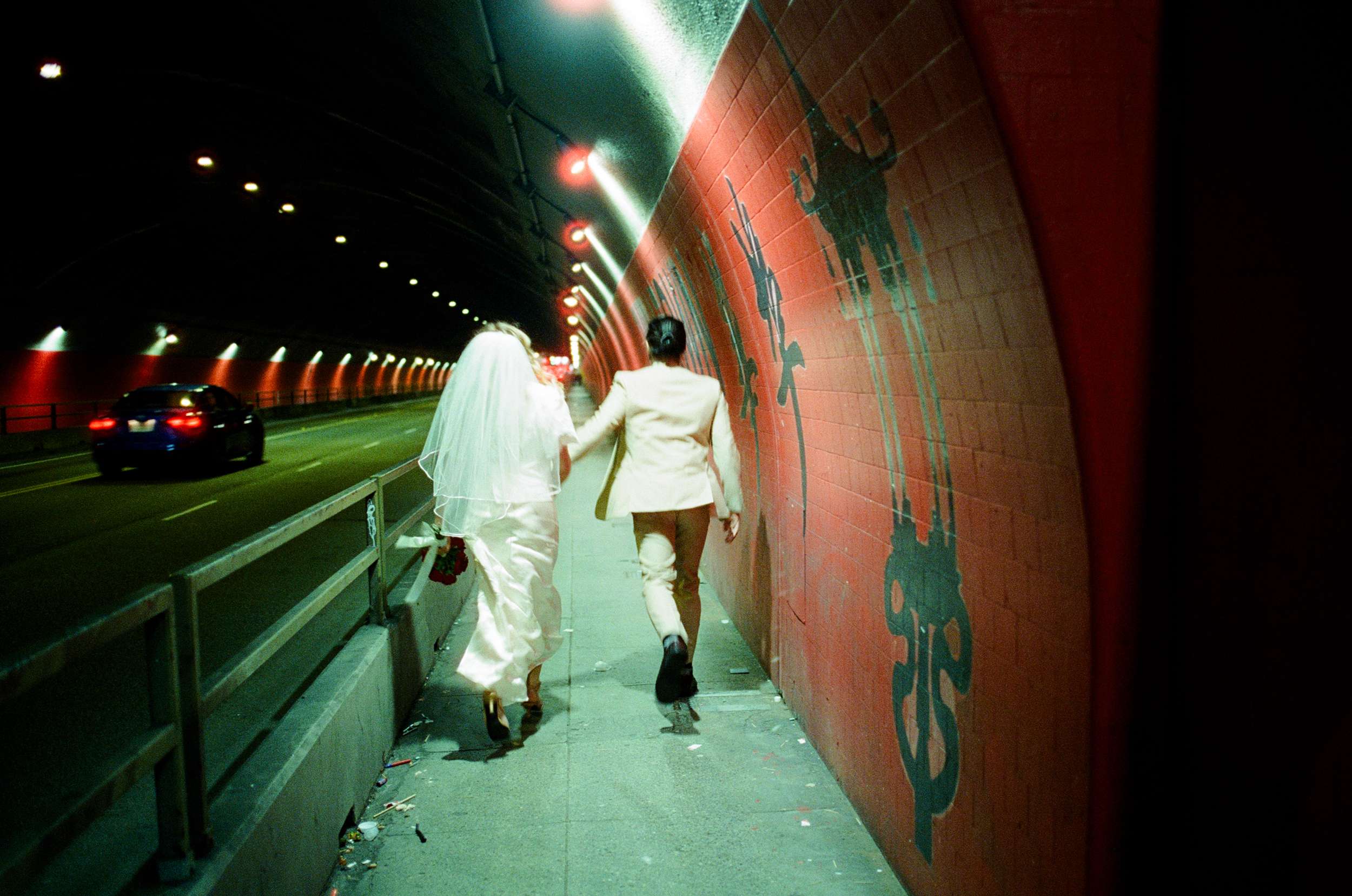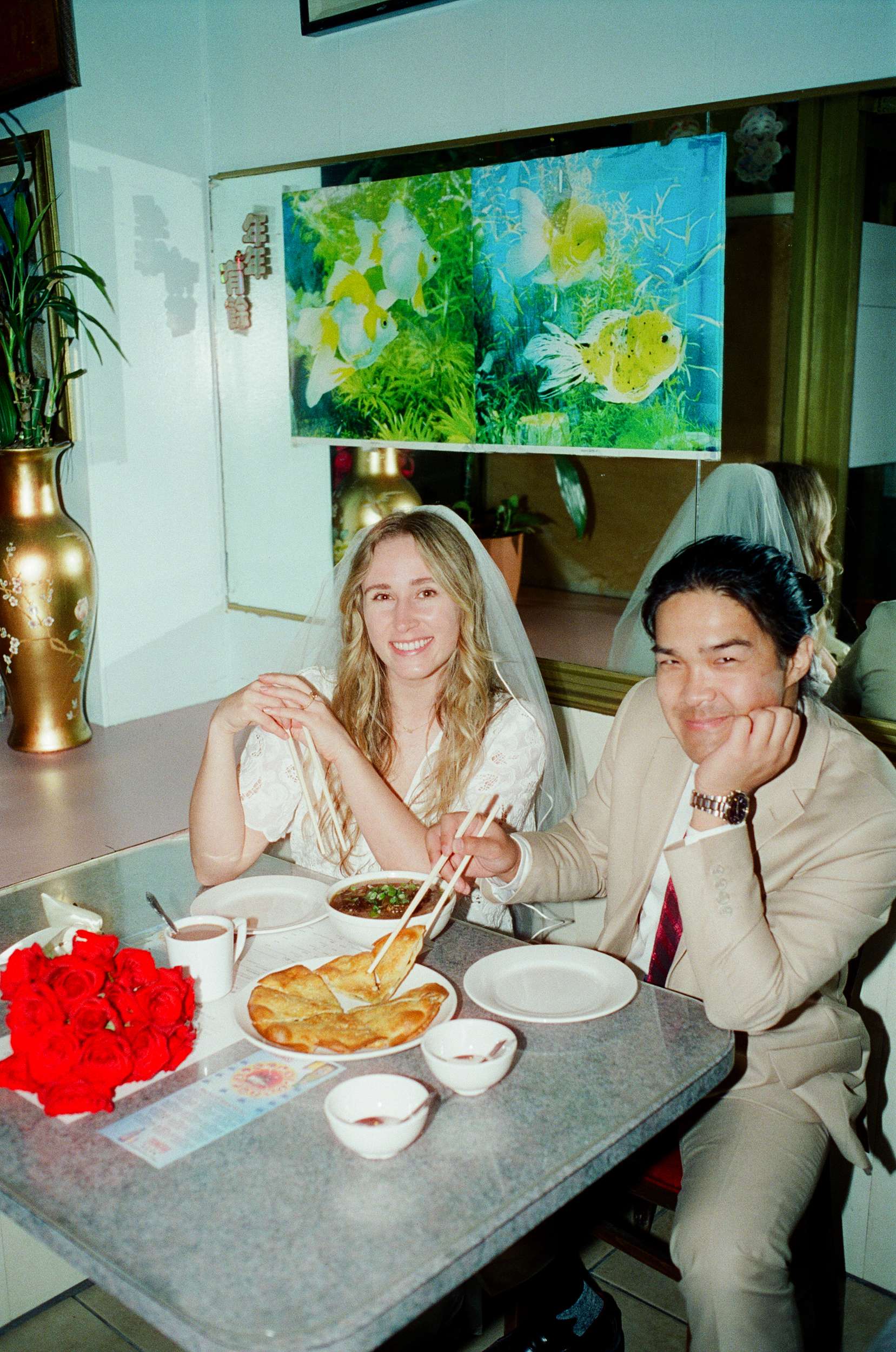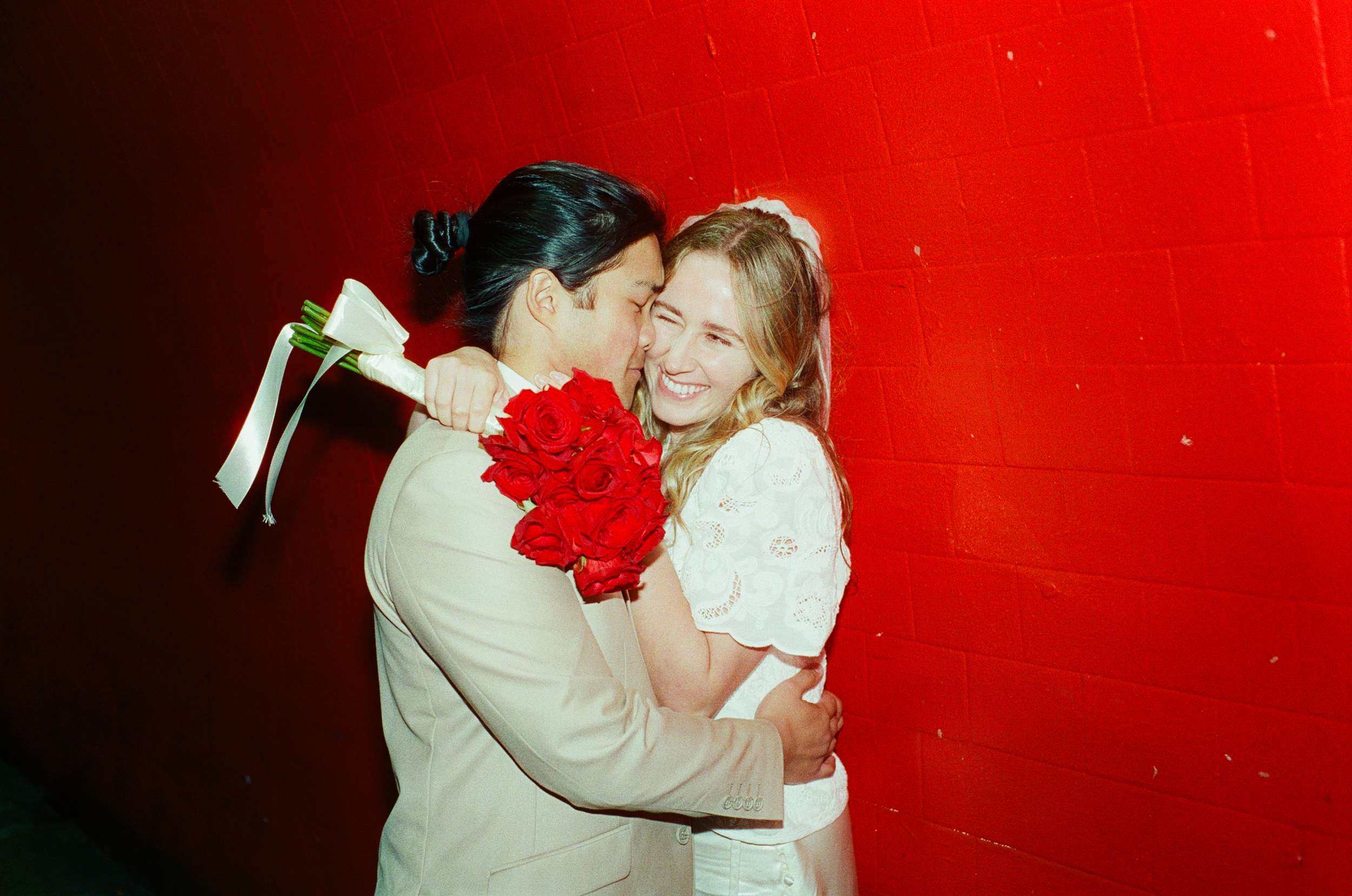 The shoot wasn’t about being flashy or putting on any kind of pretence. They spent less than $100 making it happen. “We were inspired by Wong Kar Wai, Vũ Thụy Khuê, and the historic landscape of Chinatown”, photographer Annalee told us. “There is something unique about a couple in wedding attire doing casual things around the city together at night. It feels special in its own way. The couple are doing things they normally love to do together, such as shop for snacks, run around the city, eat noodles, and wait for the bus, but in wedding attire. They really wanted these photos to feel like themselves.”